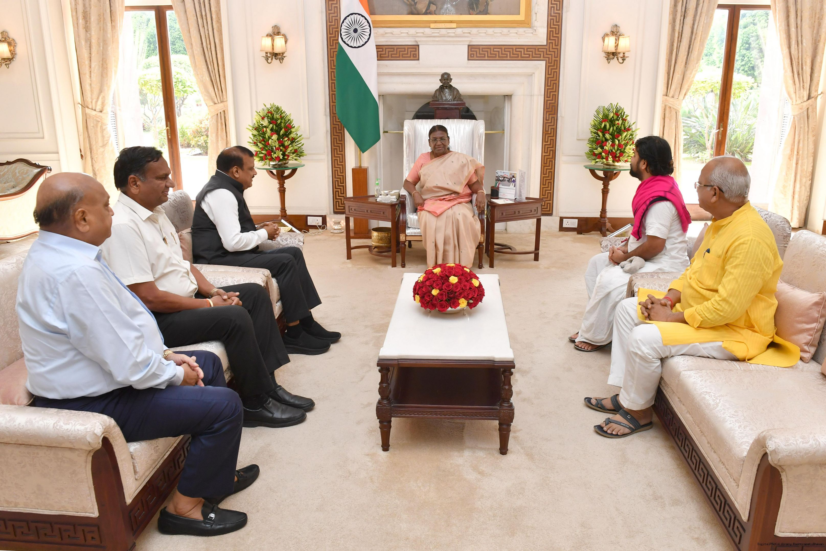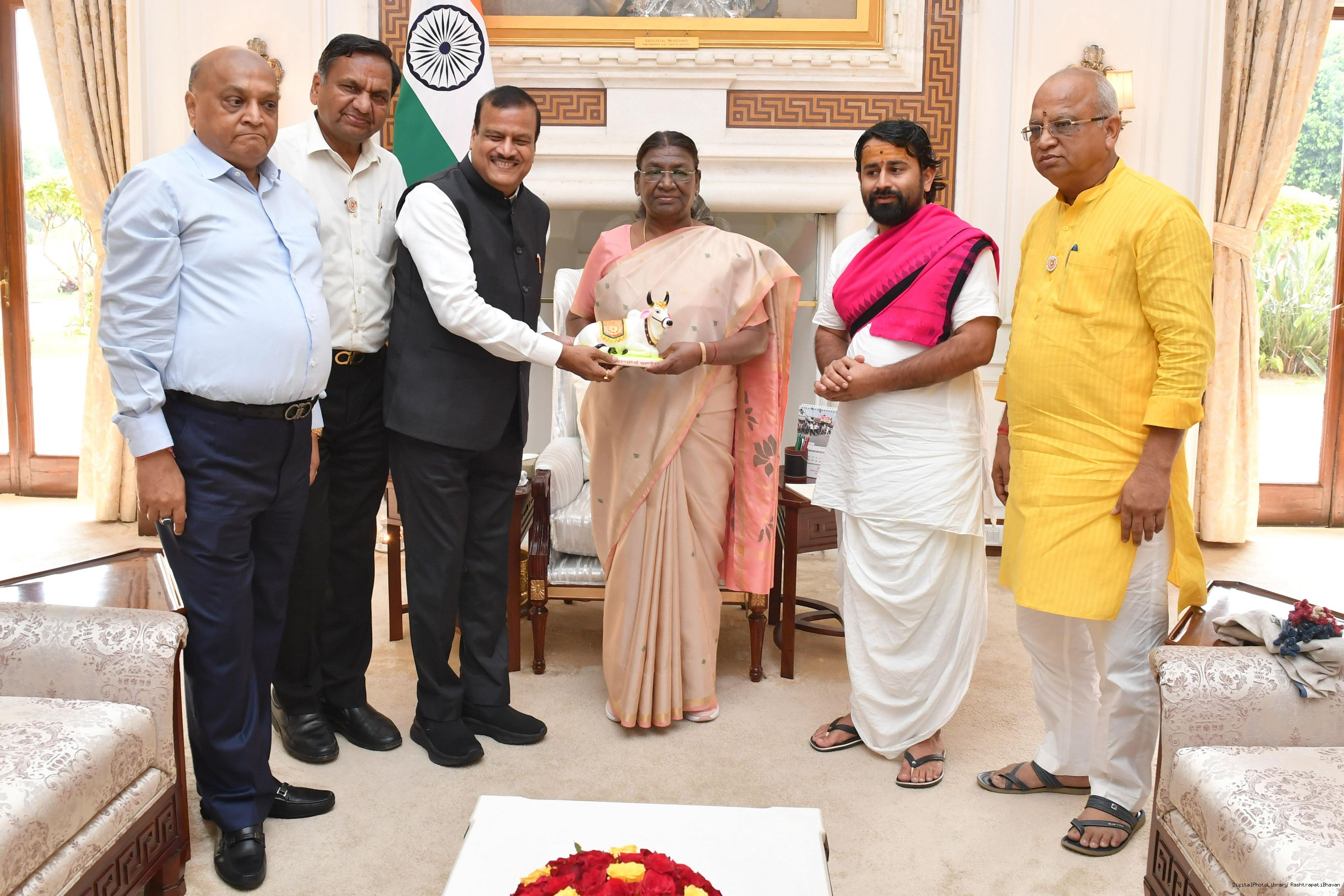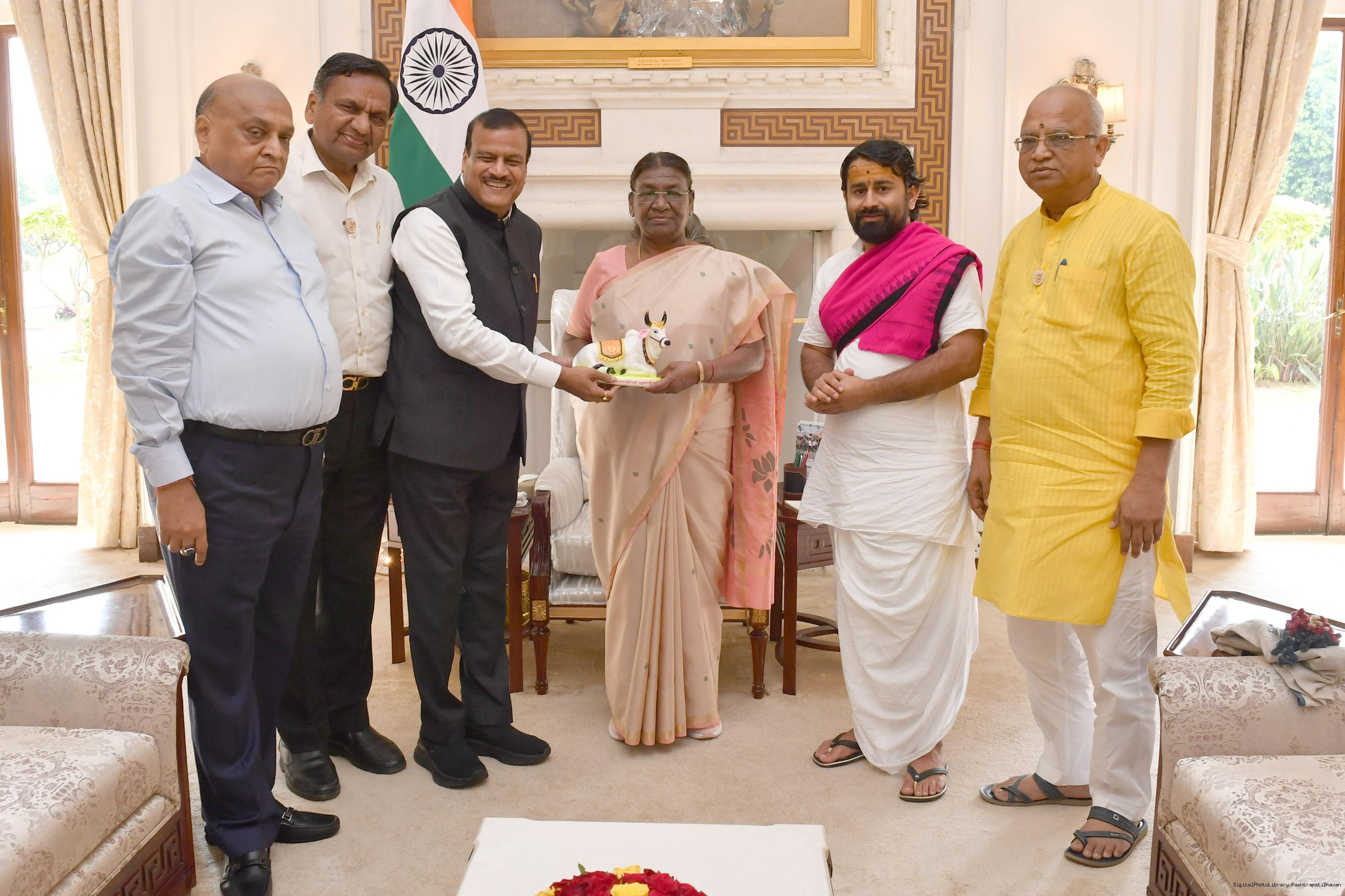 | Caption: | Shri Rajkumar Agarwal, President, Shri Godham Mahateerath Pathmeda Lok Punyarth Nyas along with others meeting with the President of India, Smt. Droupadi Murmu at Rashtrapati Bhavan on July 21, 2023. |