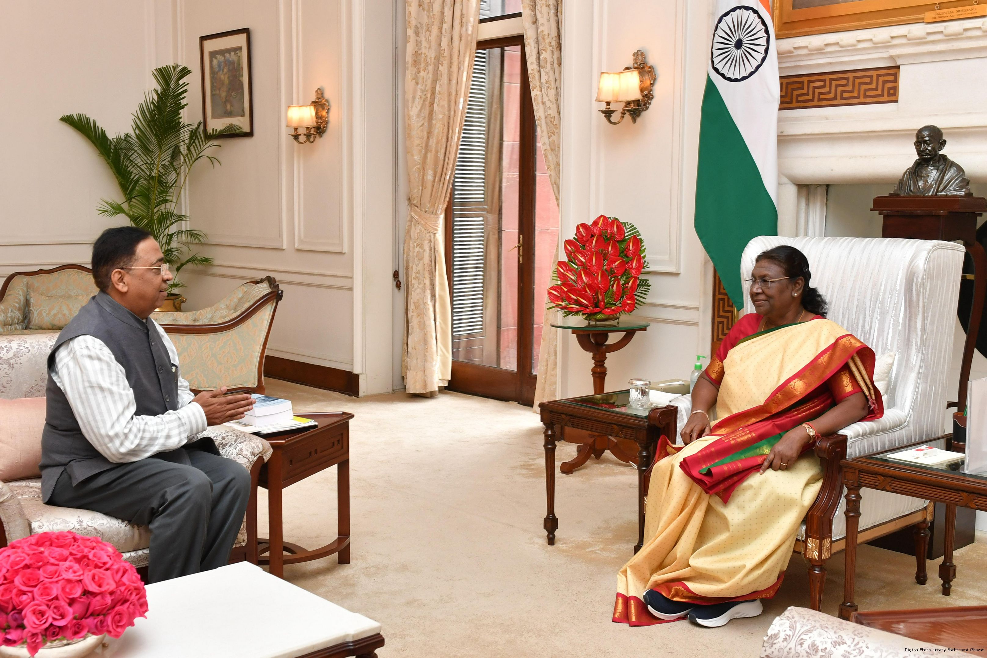 | Caption: | Prof. Parimal H. Vyas, Provost, Auro University, Surat Gujrat meeting with the President of India, Smt. Droupadi Murmu at Rashtrapati Bhavan on July 28, 2023. |