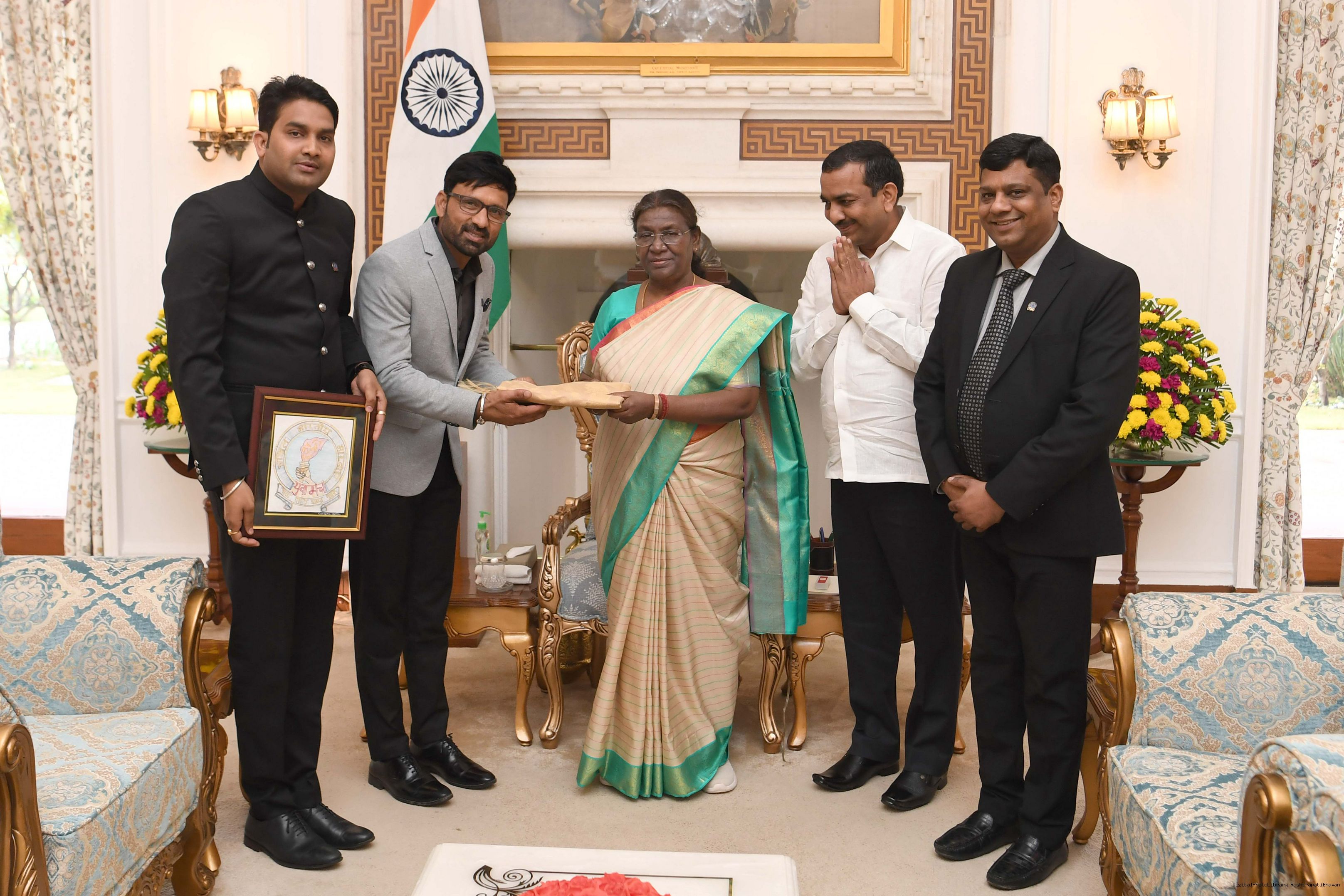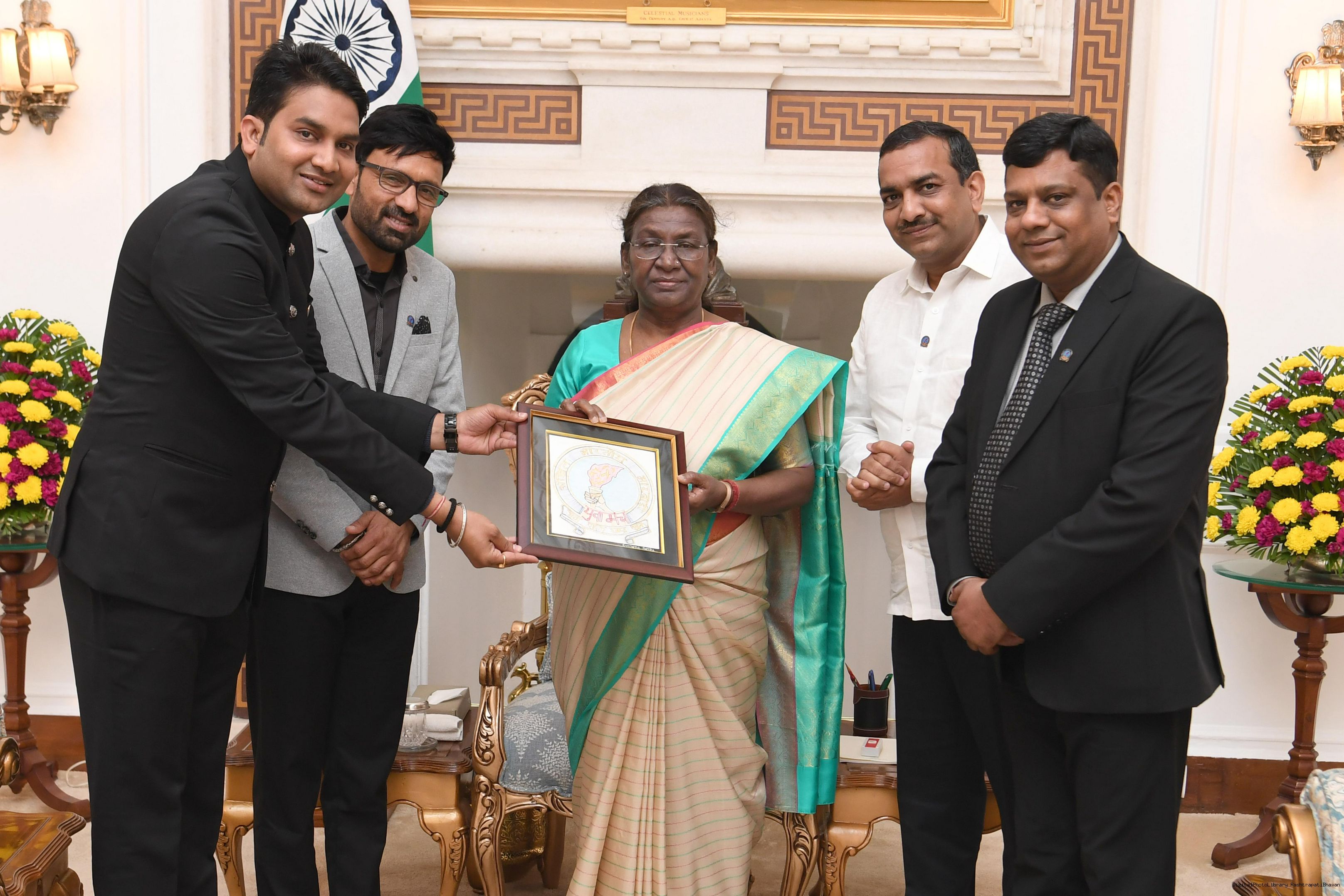 | Caption: | Shri Hemant Shah, Chairman, AII India Marwari Yuva Manch, Baripada (Odisha) along with others meeting with the President of India Smt Droupadi Murmu at Rashtrapati Bhavan on February 01, 2024. |