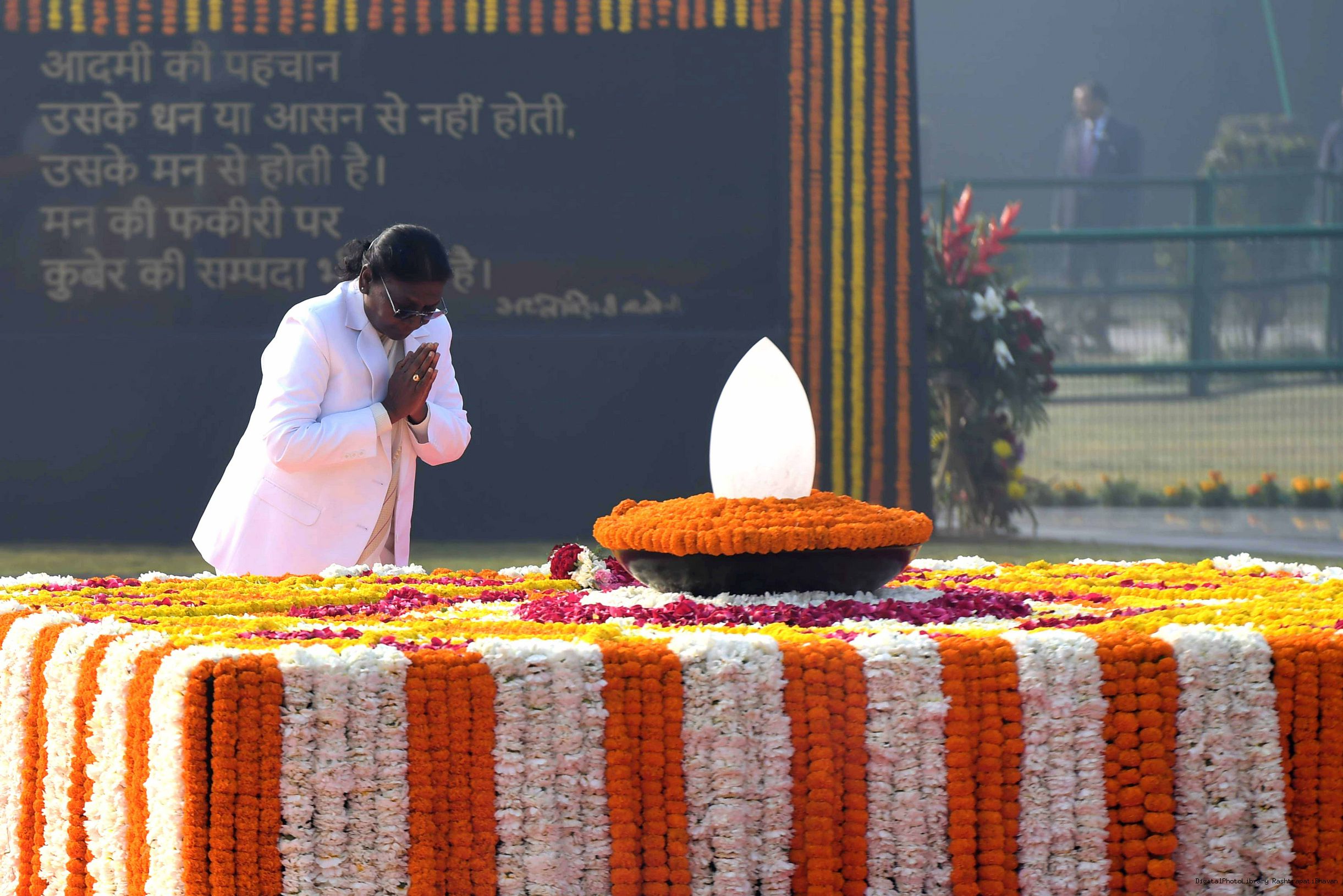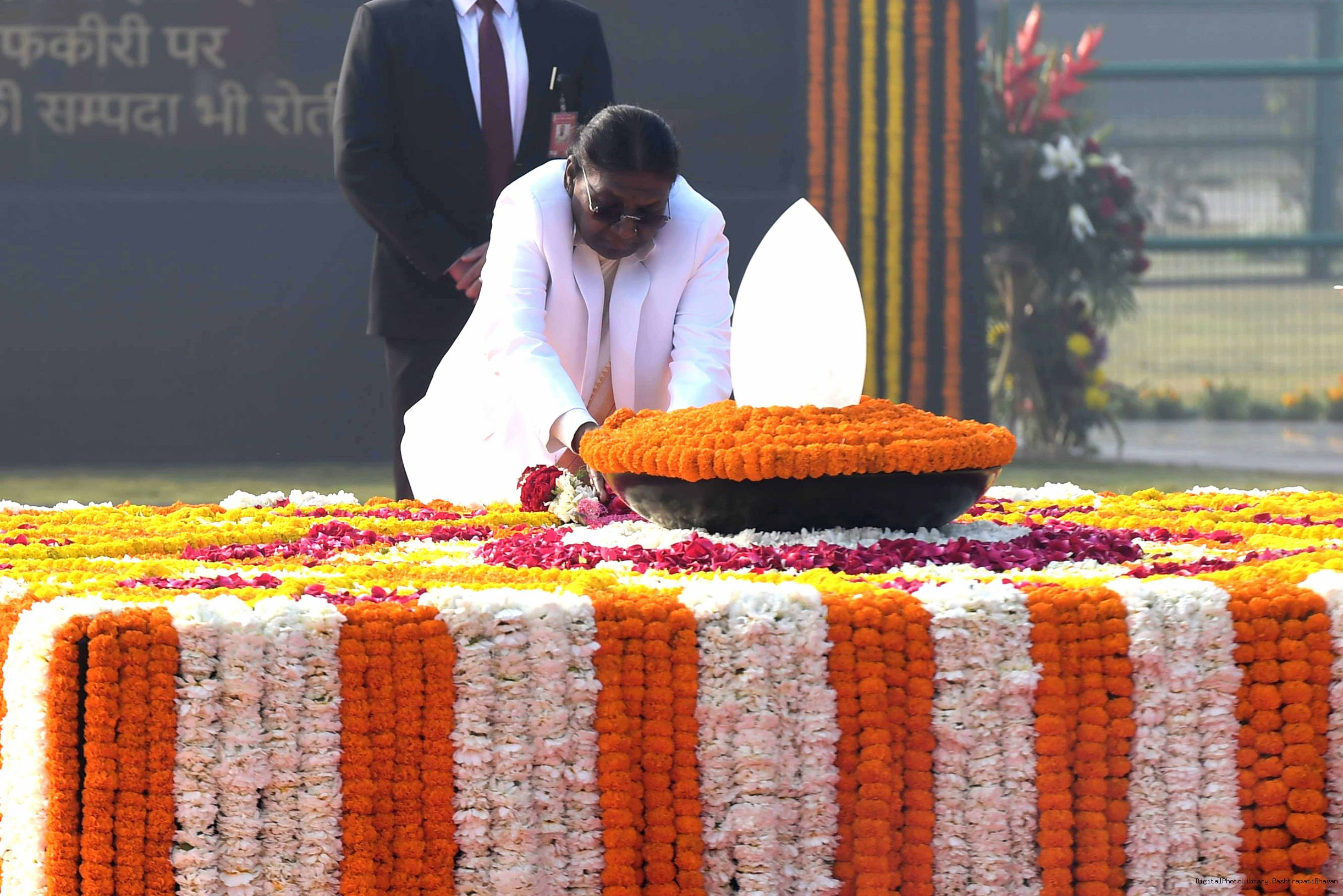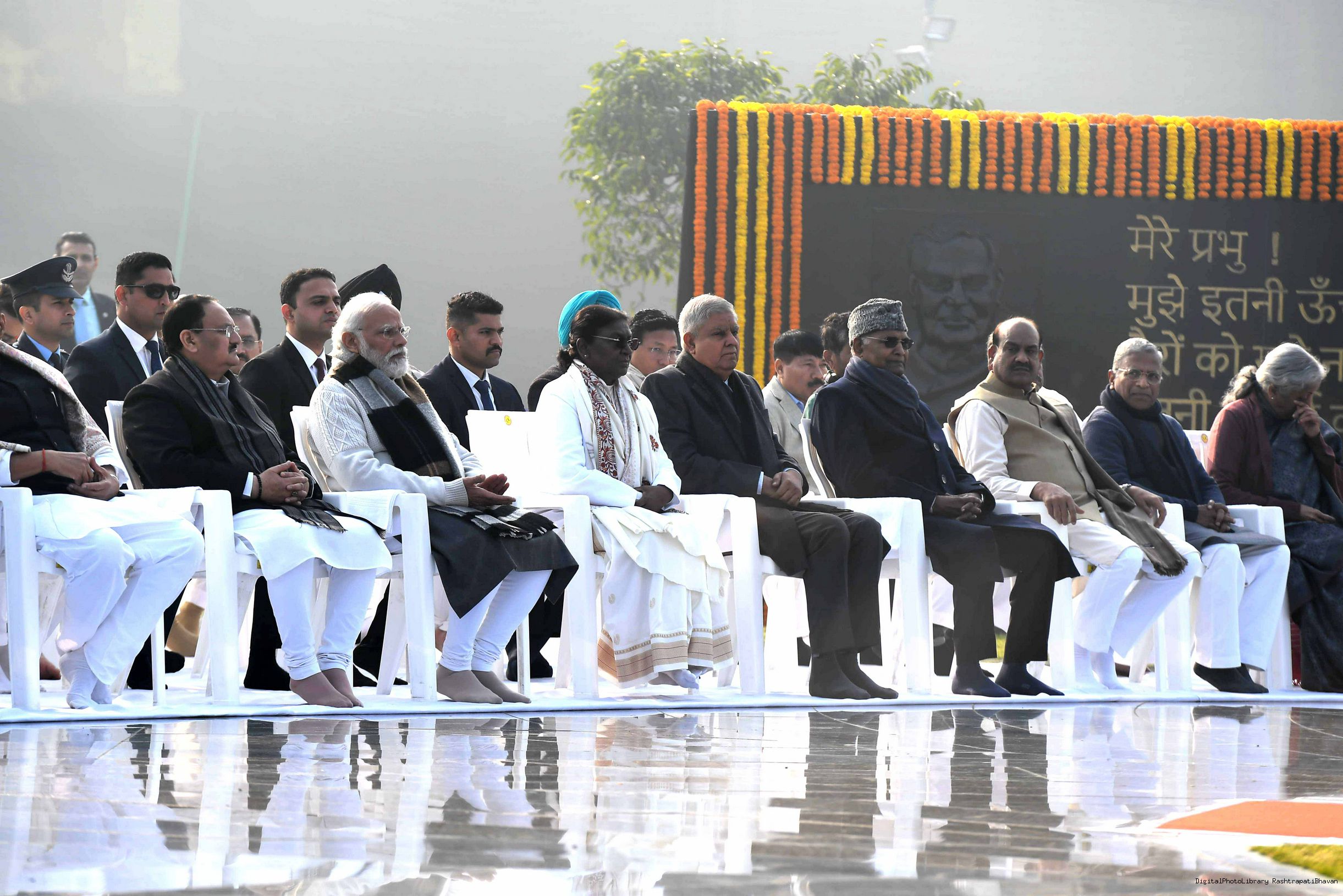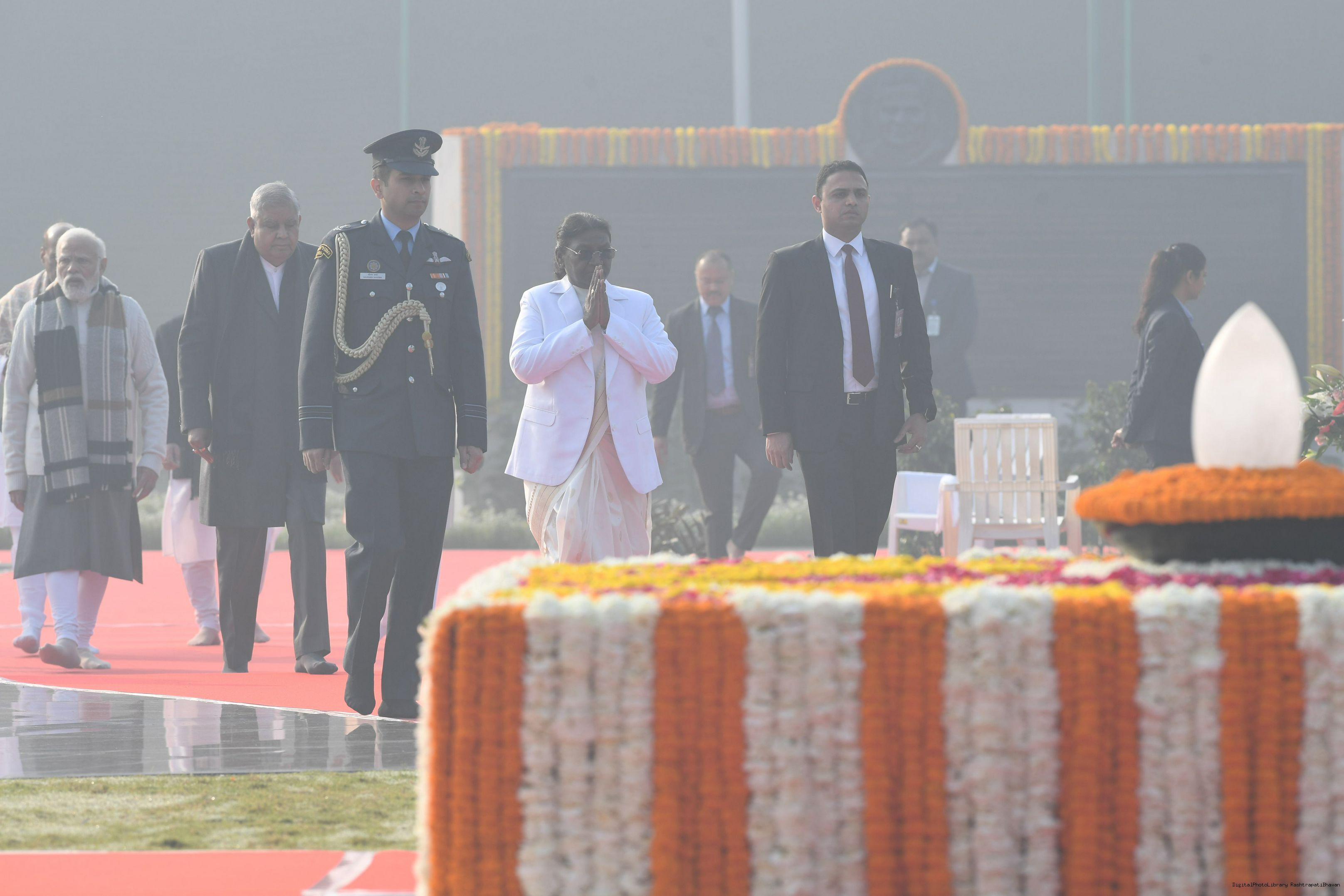 | Caption: | The President of India Smt. Droupadi Murmu paid floral tributes to former Prime Minister of India Shri Atal Bihari Vajpayee on his birth anniversary at the samadhi of Atal Ji, 'Sadaiv Atal' in New Delhi on December 25, 2023. |