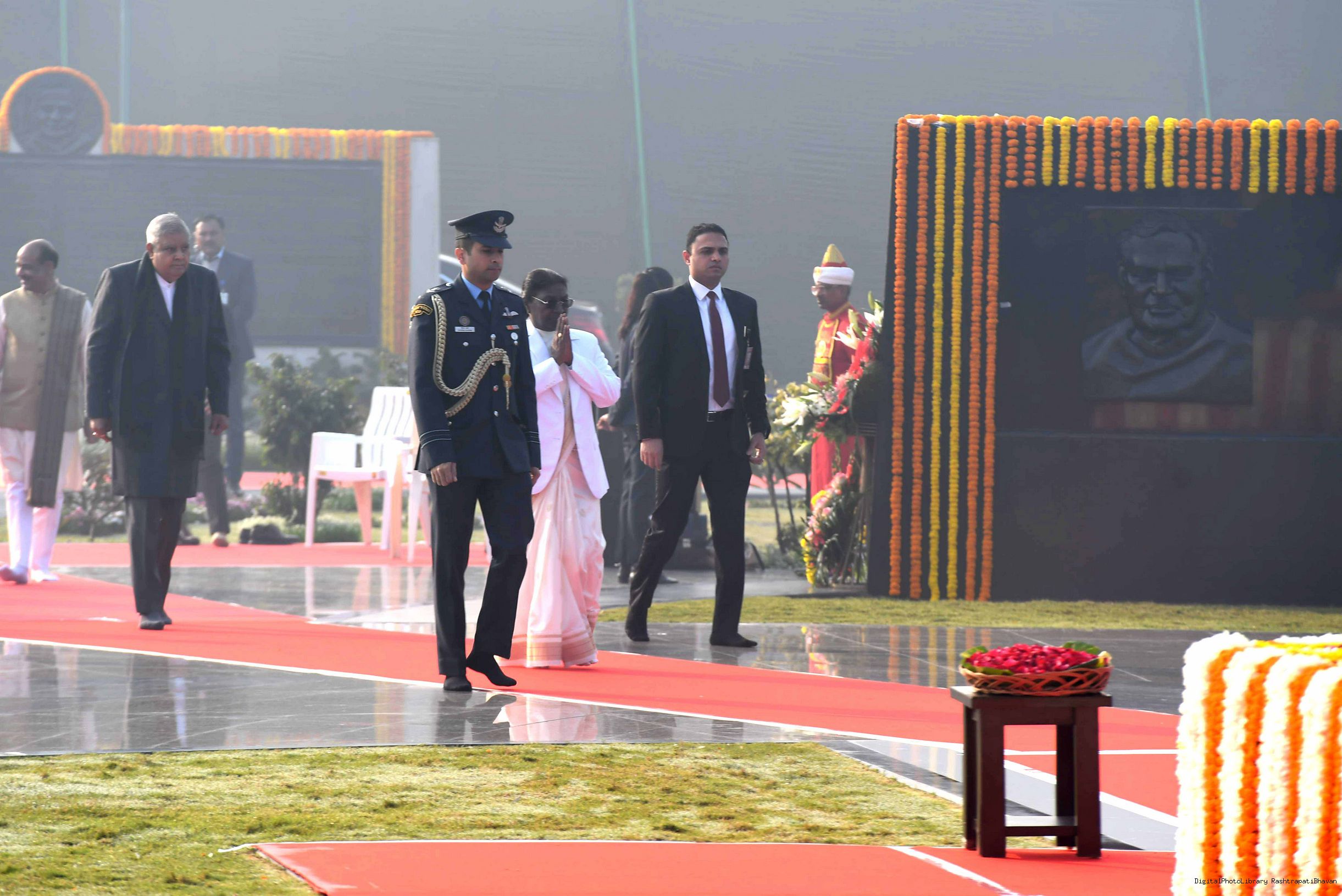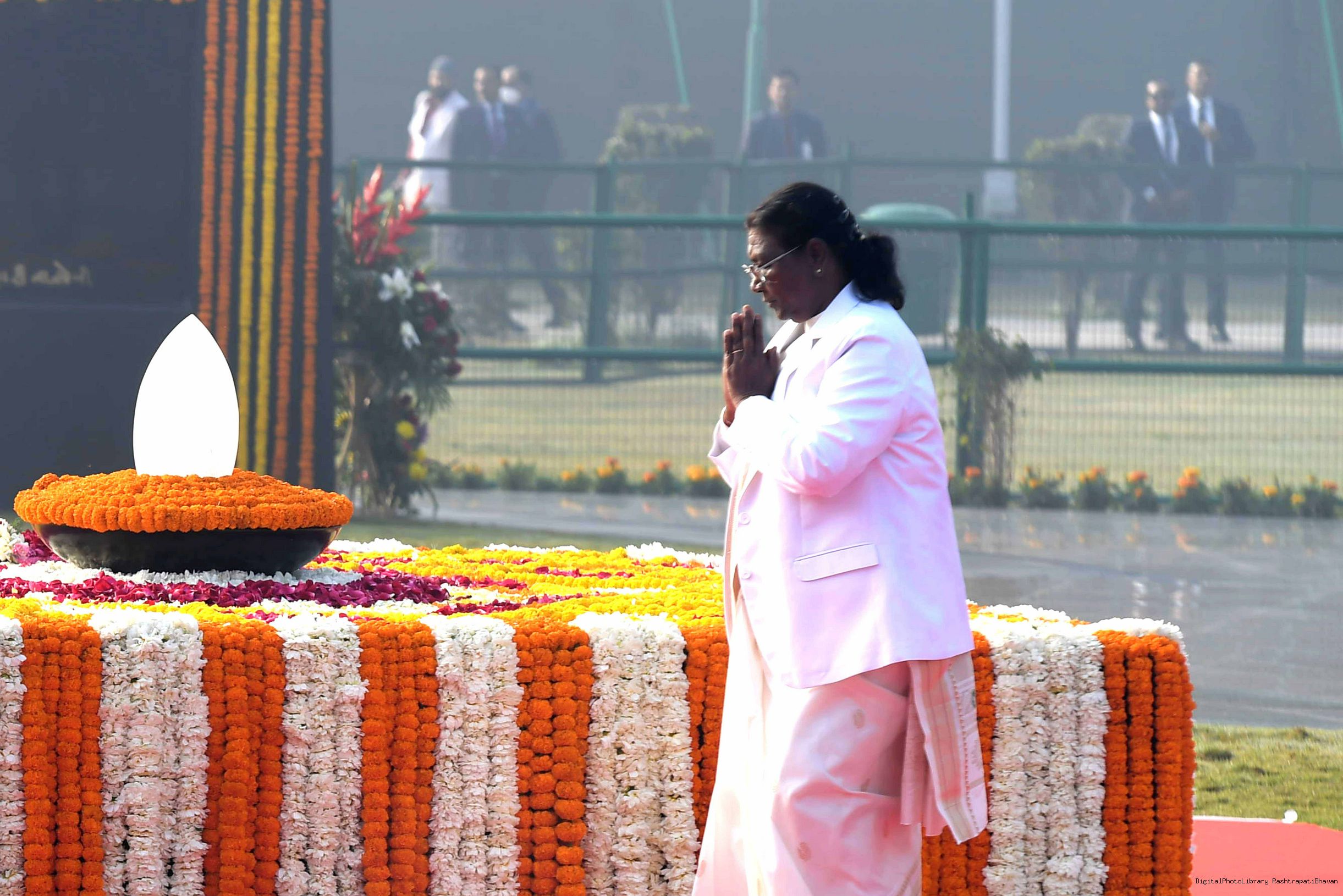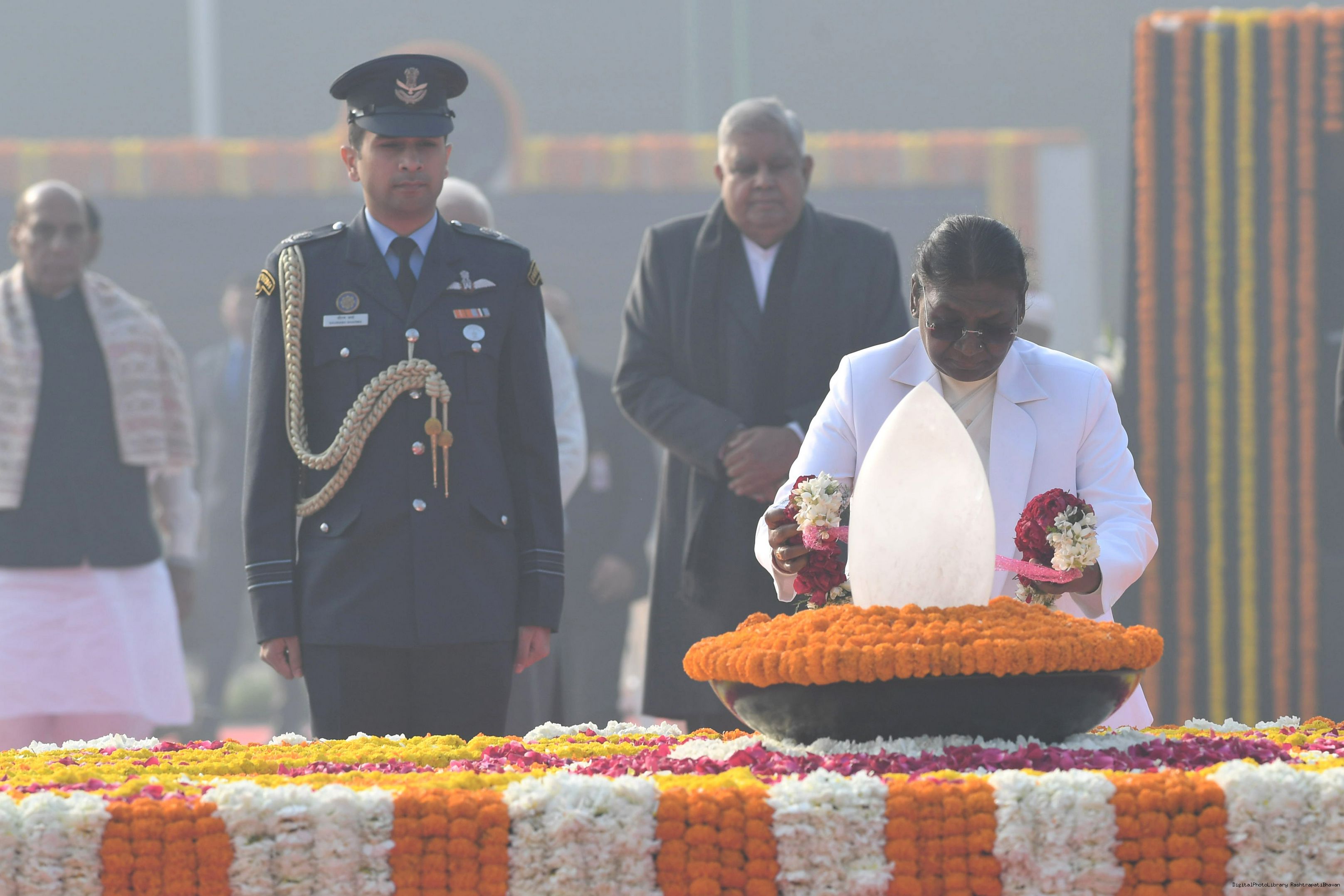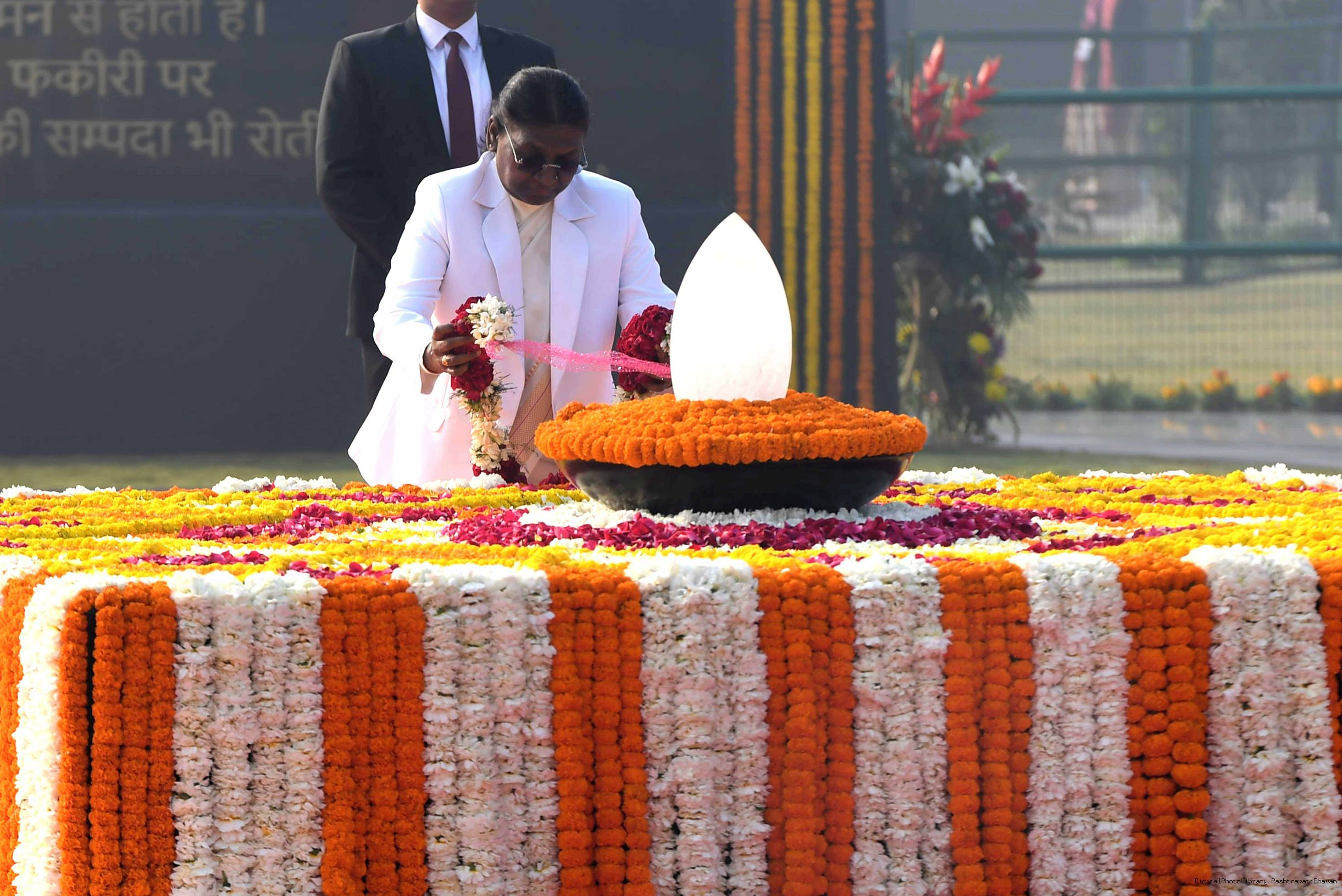| Caption: | The President of India Smt. Droupadi Murmu paid floral tributes to former Prime Minister of India Shri Atal Bihari Vajpayee on his birth anniversary at the samadhi of Atal Ji, 'Sadaiv Atal' in New Delhi on December 25, 2023. |
