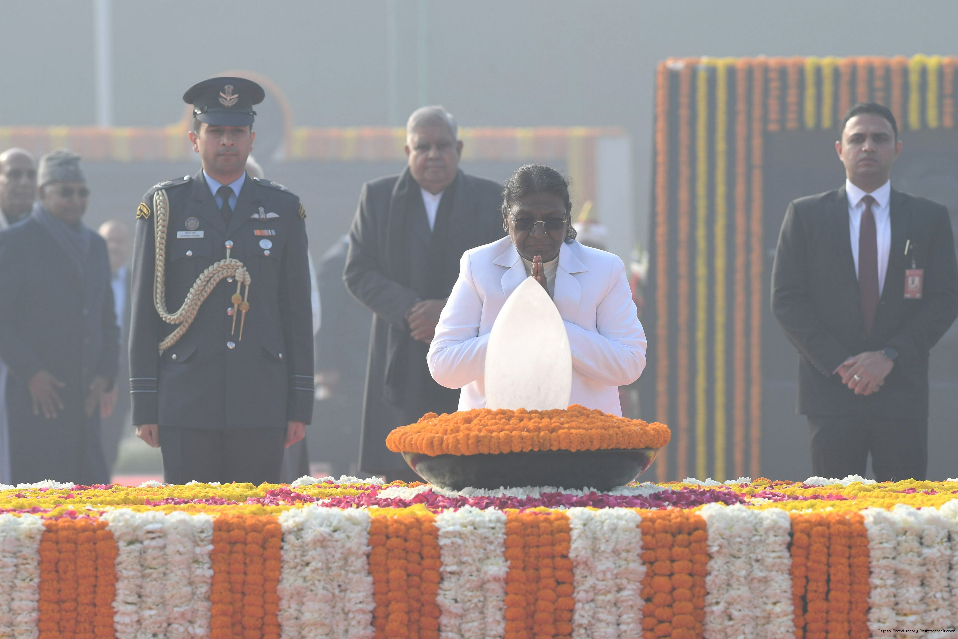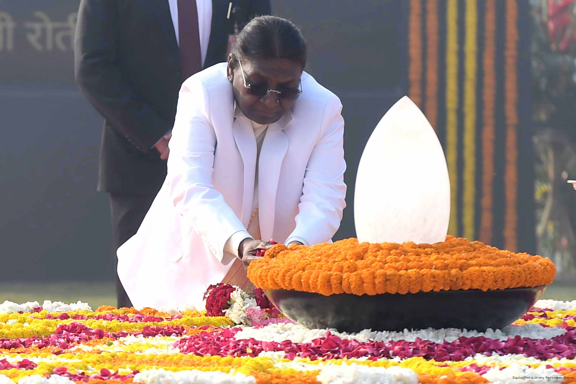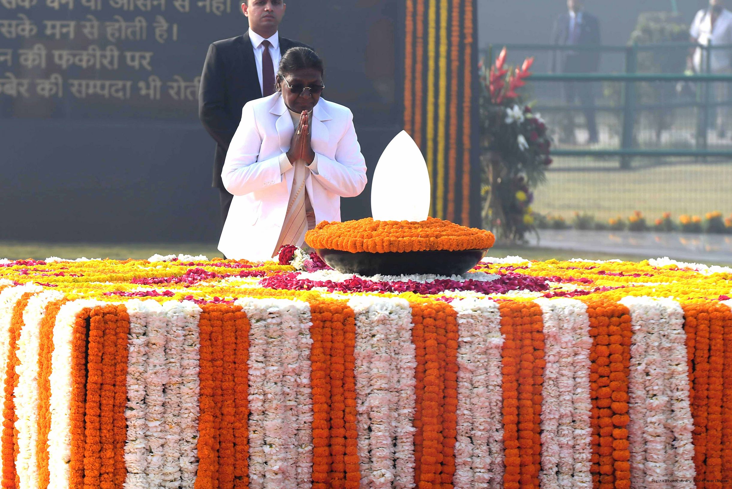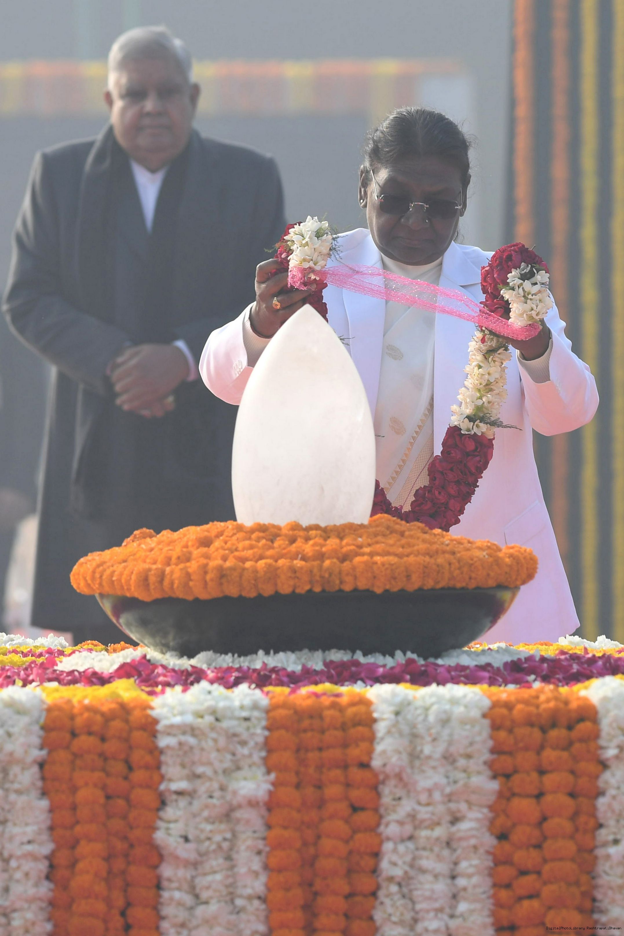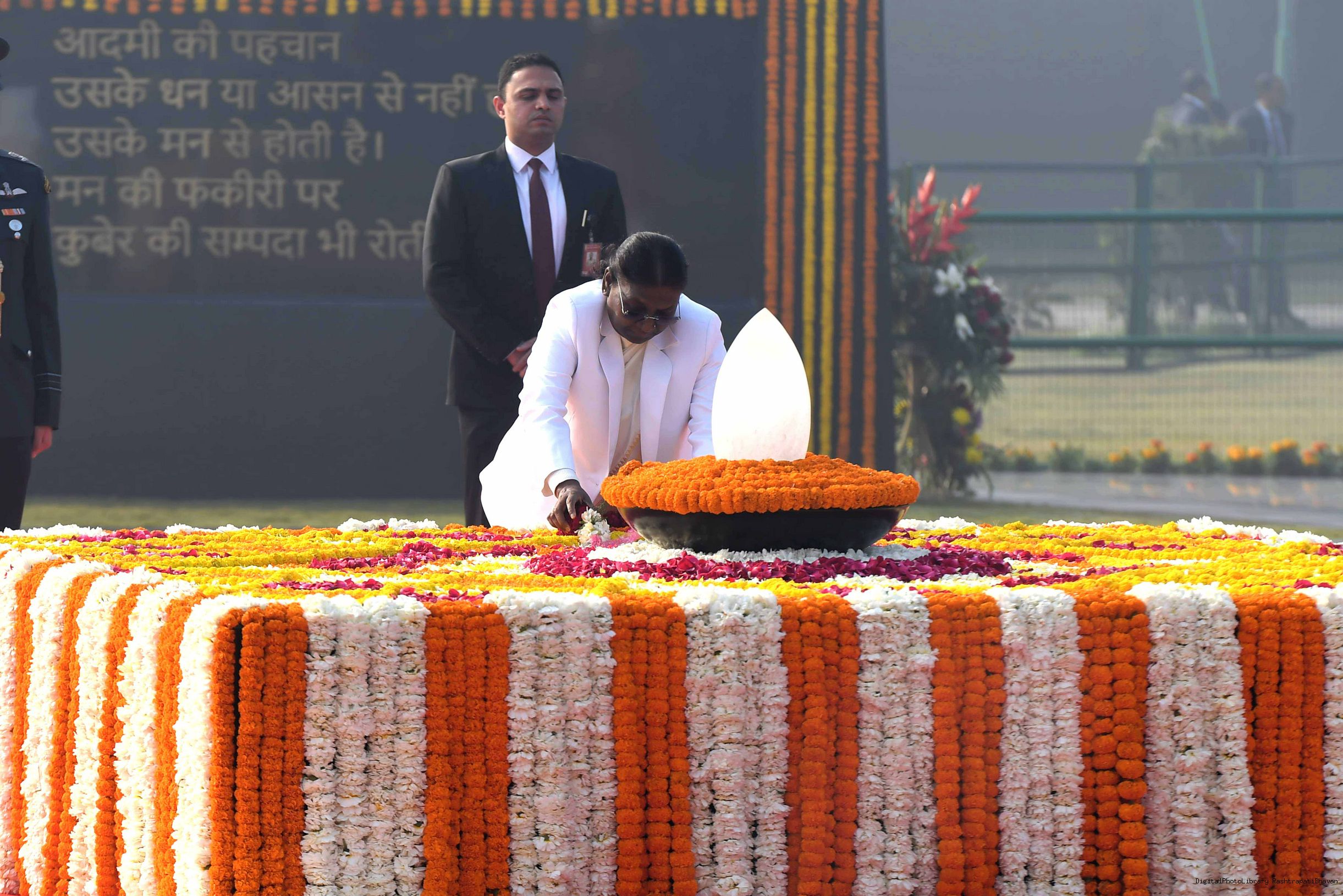 | Caption: | The President of India Smt. Droupadi Murmu paid floral tributes to former Prime Minister of India Shri Atal Bihari Vajpayee on his birth anniversary at the samadhi of Atal Ji, 'Sadaiv Atal' in New Delhi on December 25, 2023. |