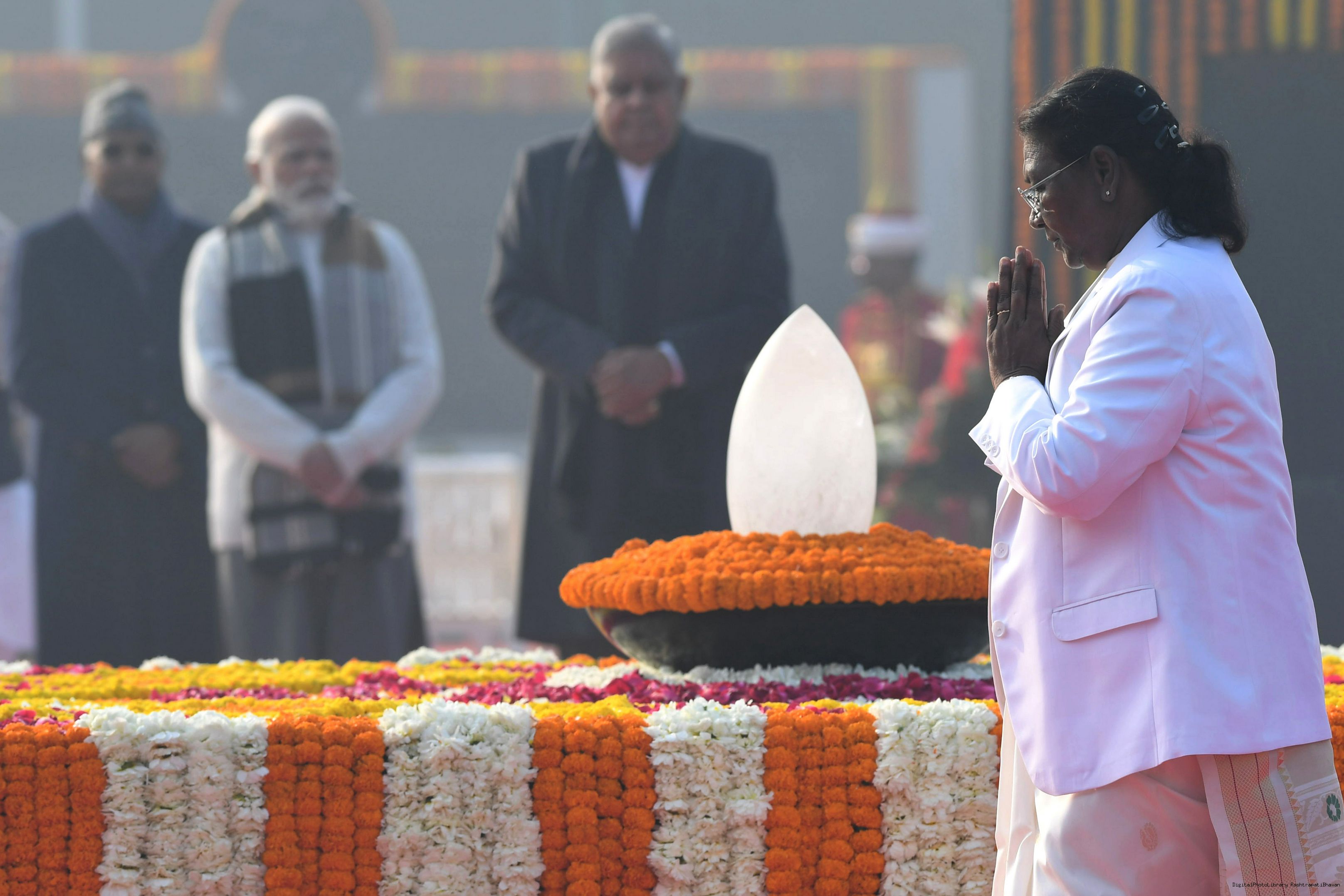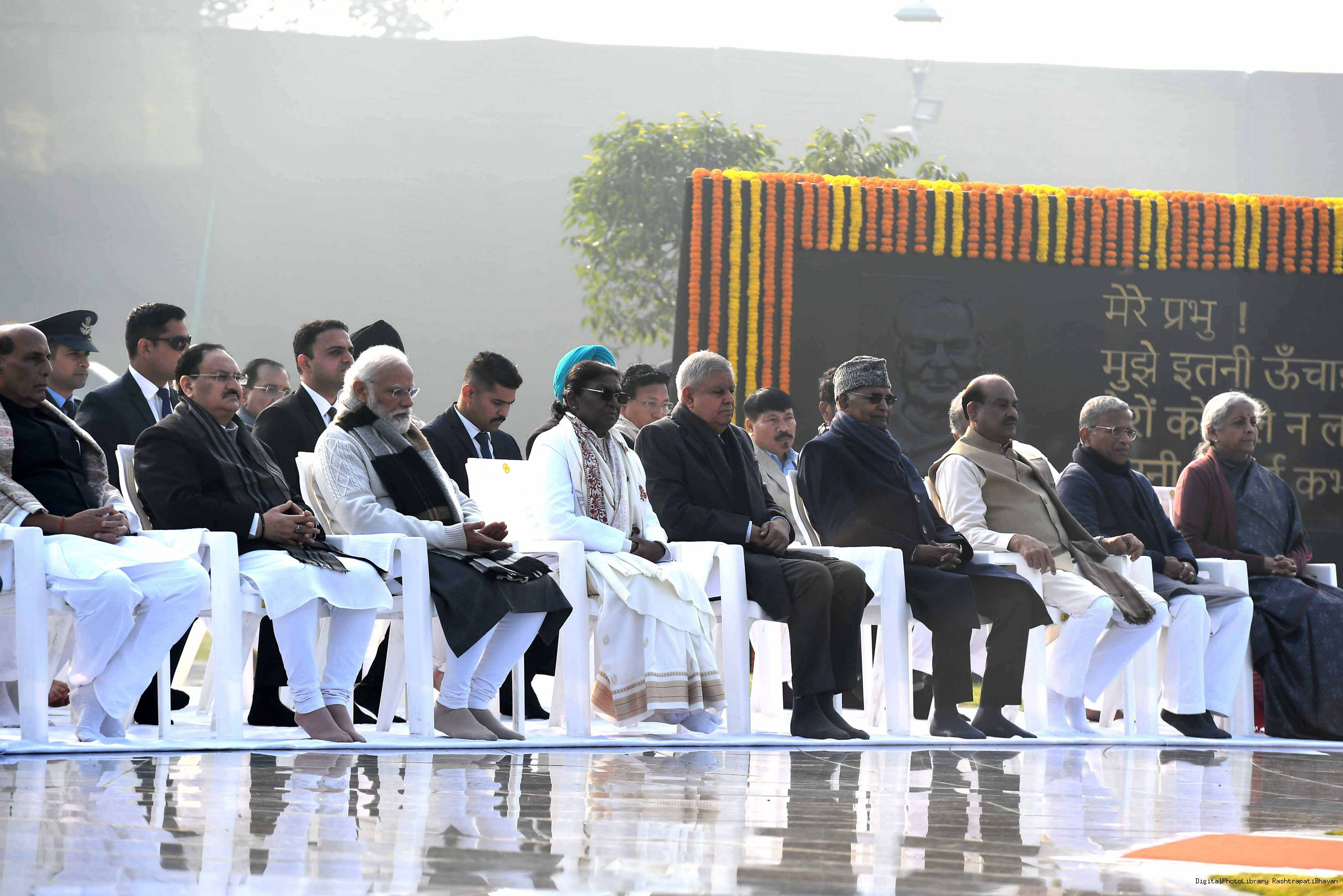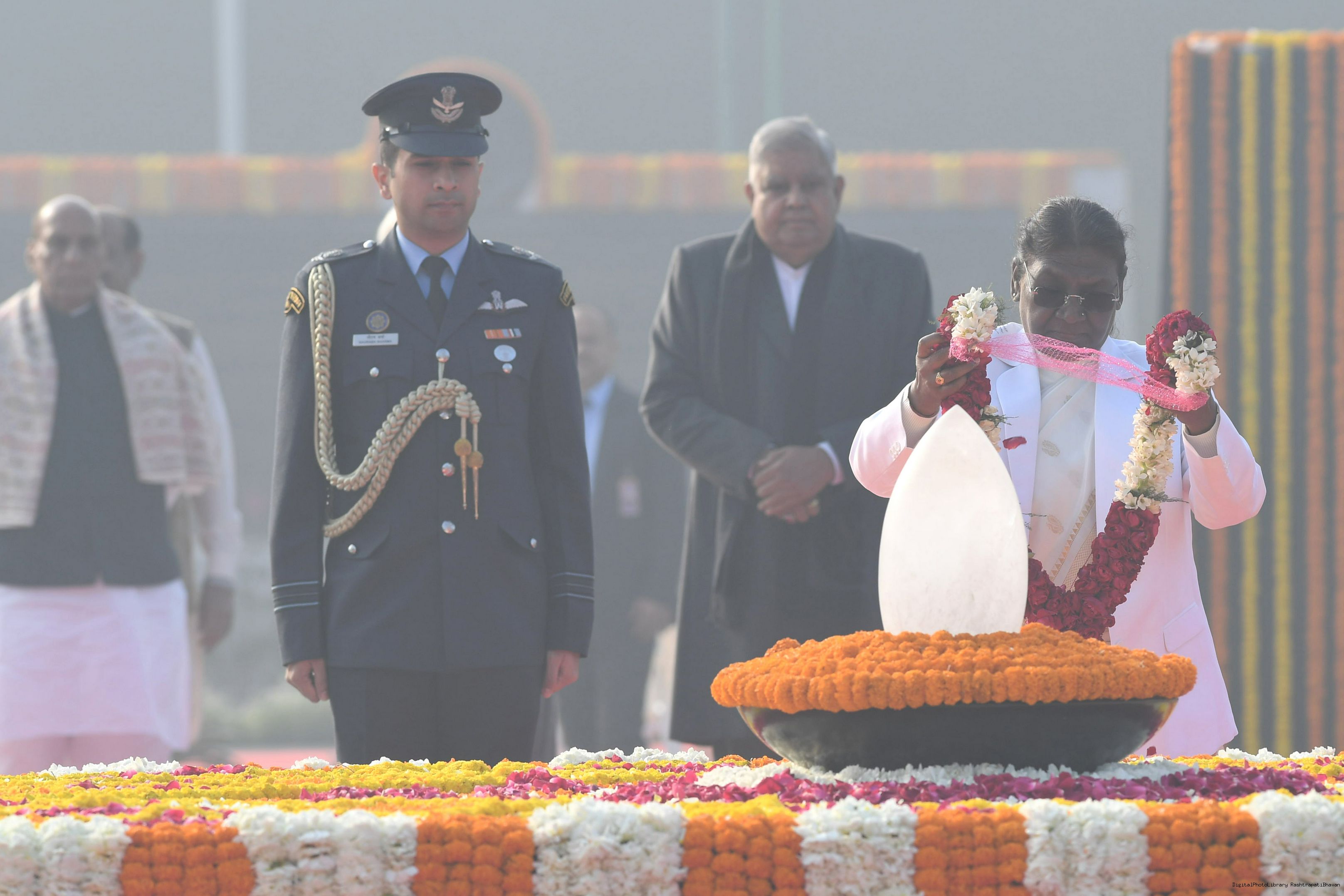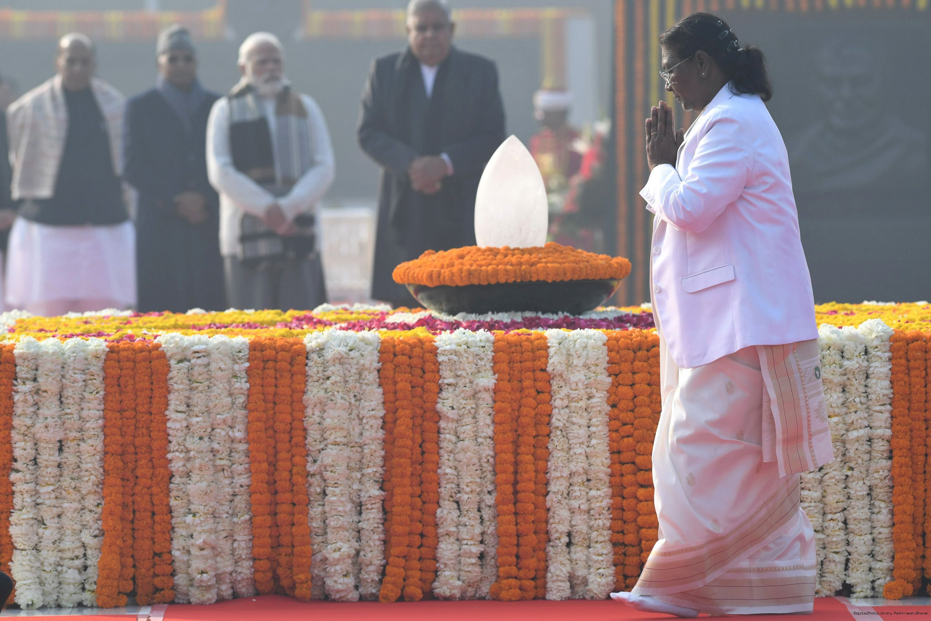 | Caption: | The President of India Smt. Droupadi Murmu paid floral tributes to former Prime Minister of India Shri Atal Bihari Vajpayee on his birth anniversary at the samadhi of Atal Ji, 'Sadaiv Atal' in New Delhi on December 25, 2023. |