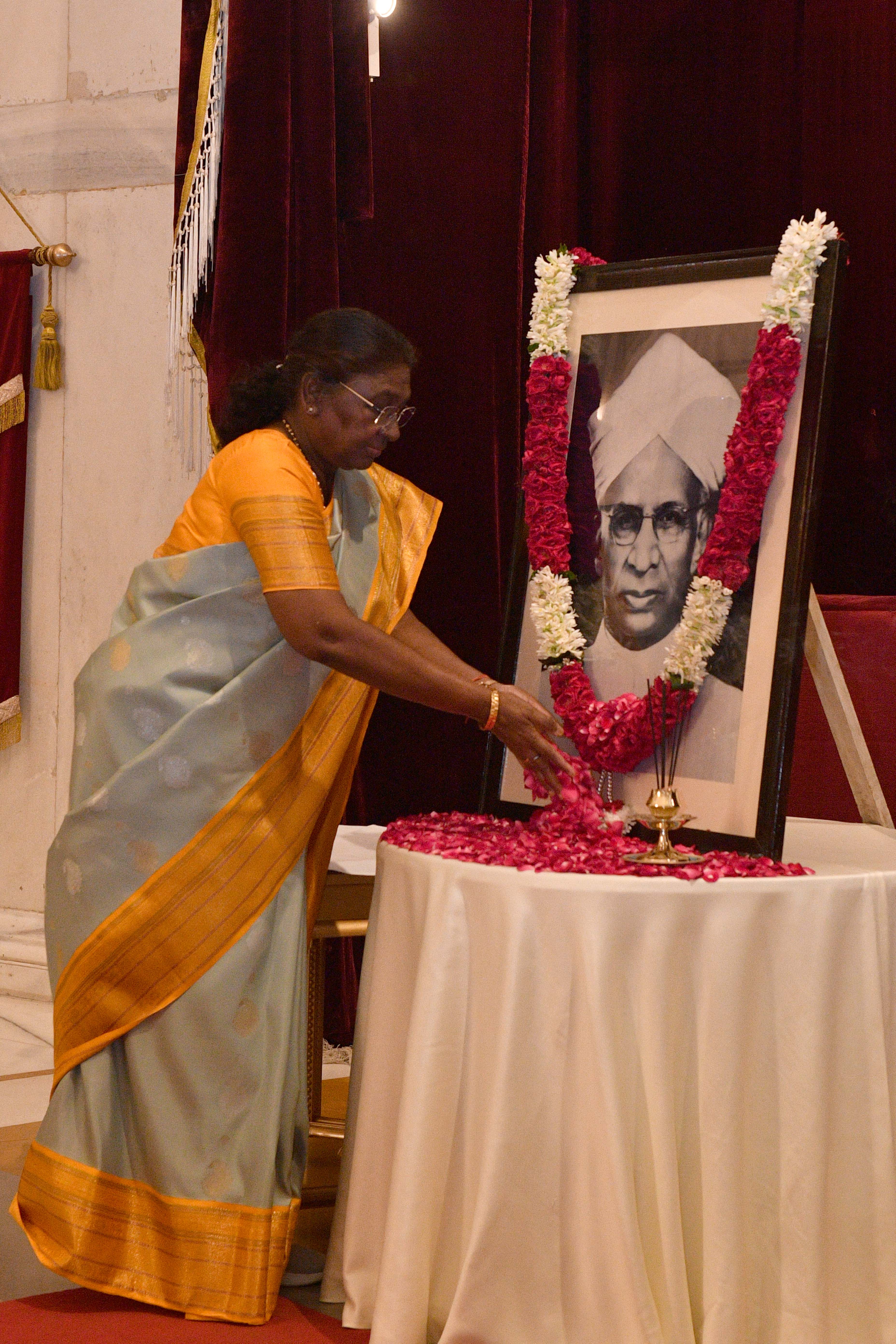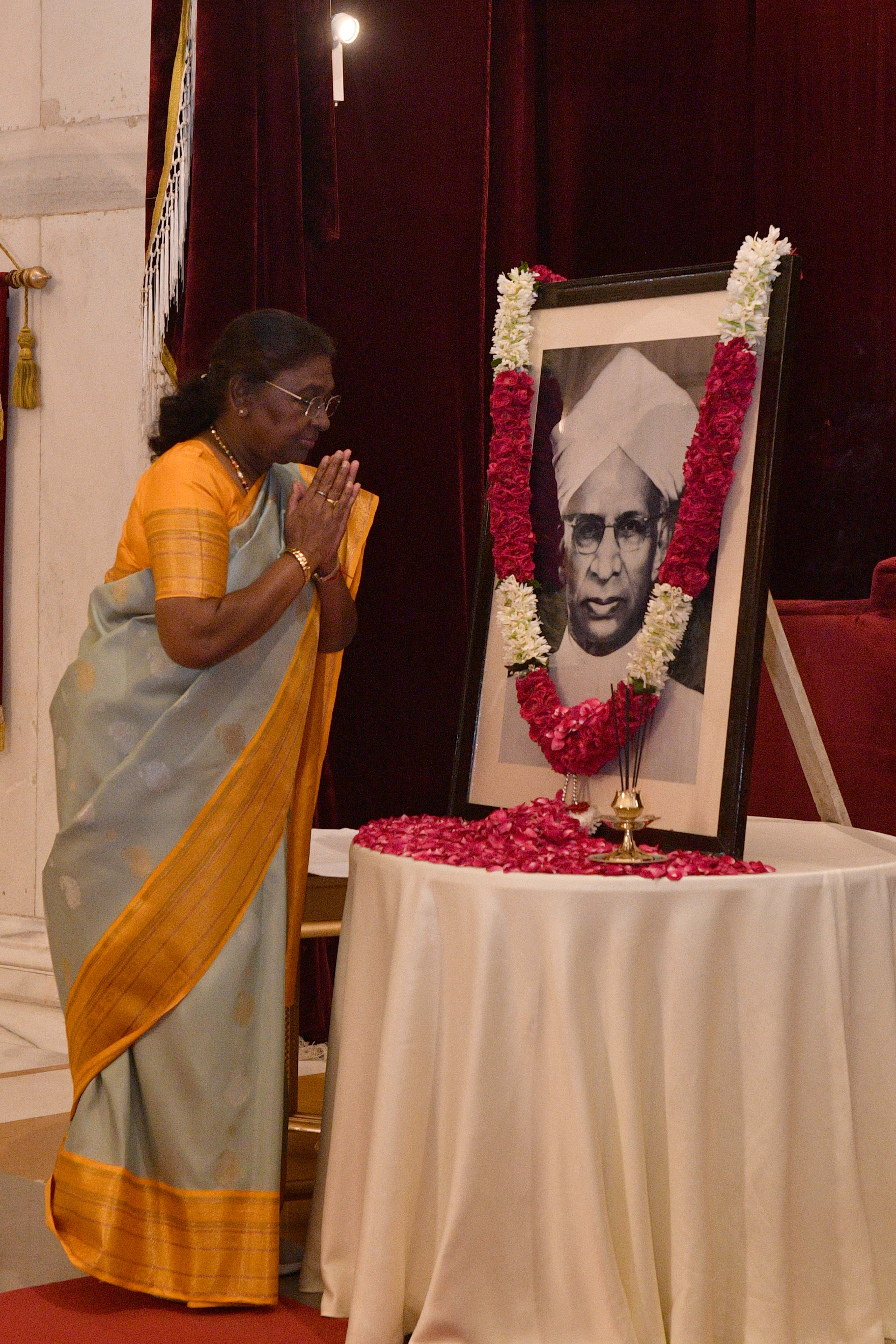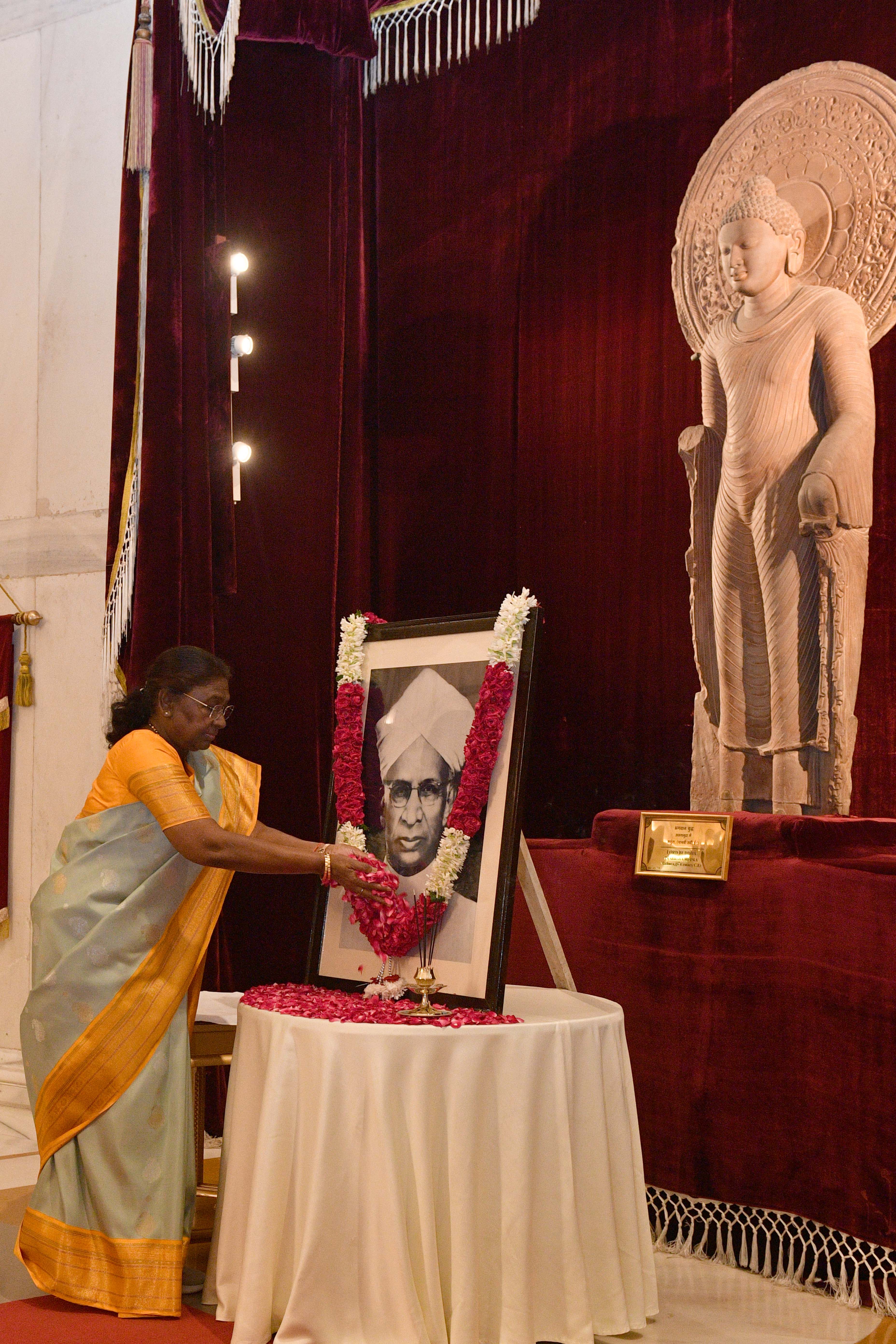 | Caption: | The President of India, Smt Droupadi Murmu paid floral tributes to Dr Sarvepalli Radhakrishnan, former President of India on his birth anniversary at Rashtrapati Bhavan on September 5, 2024. |