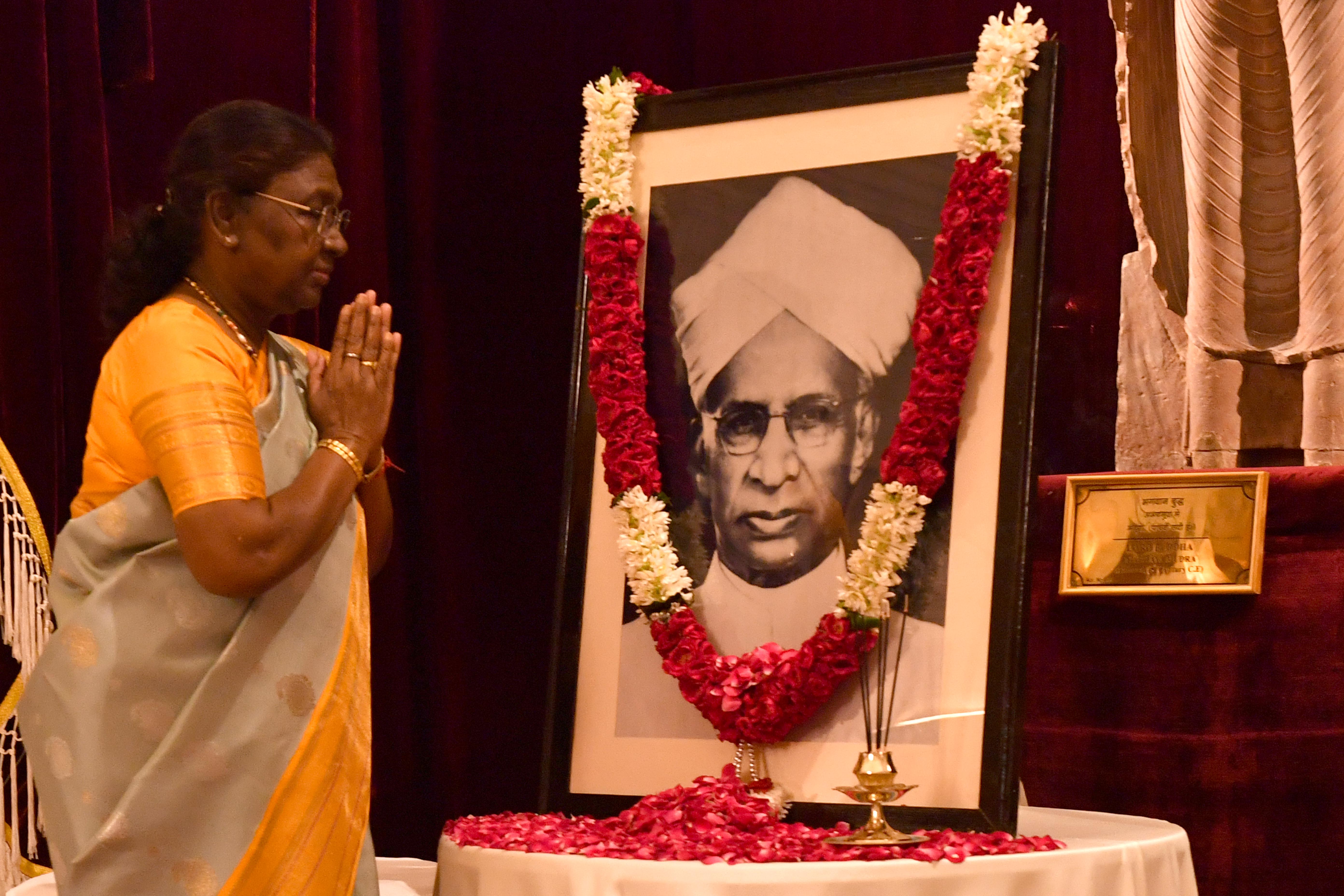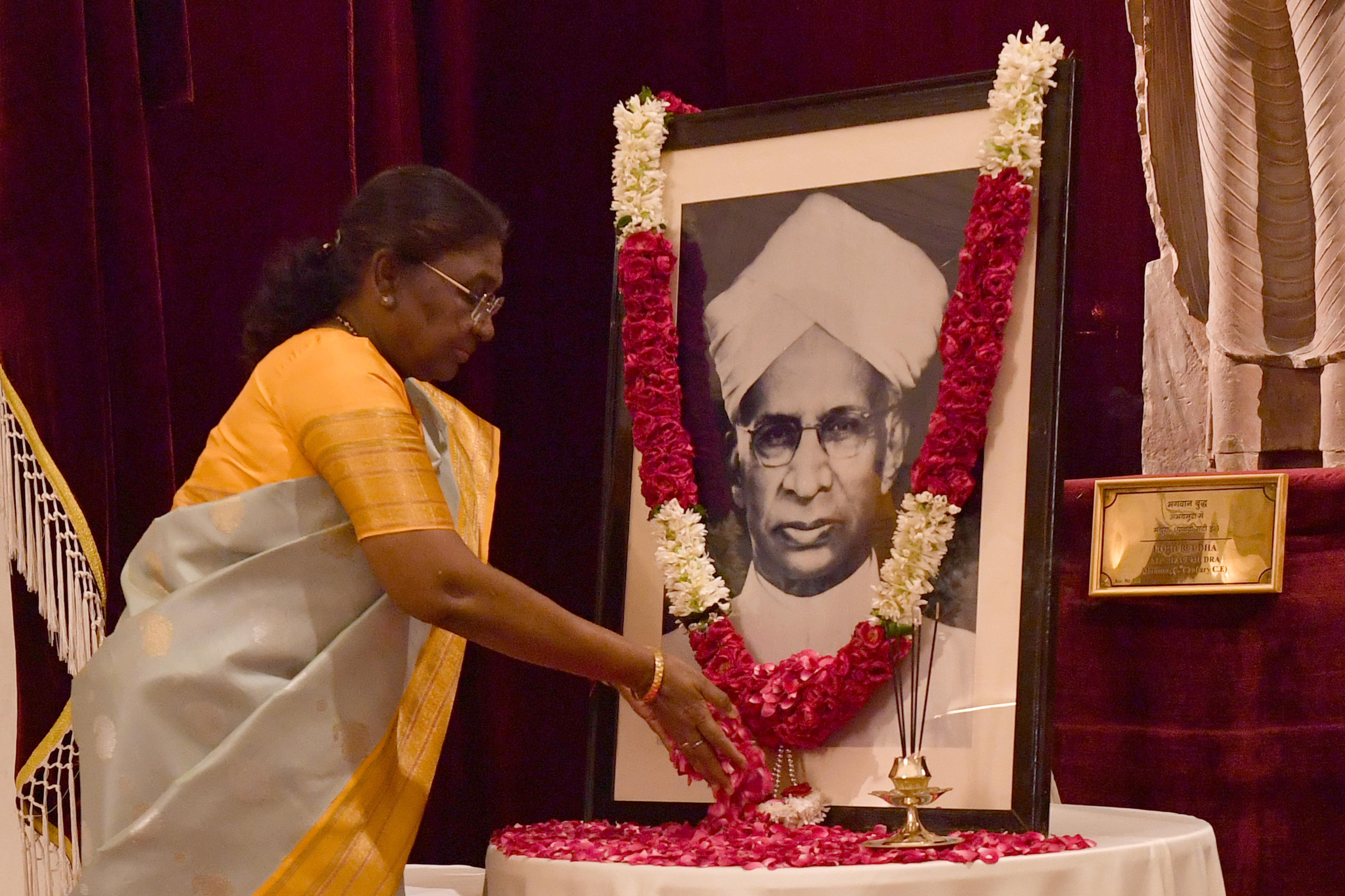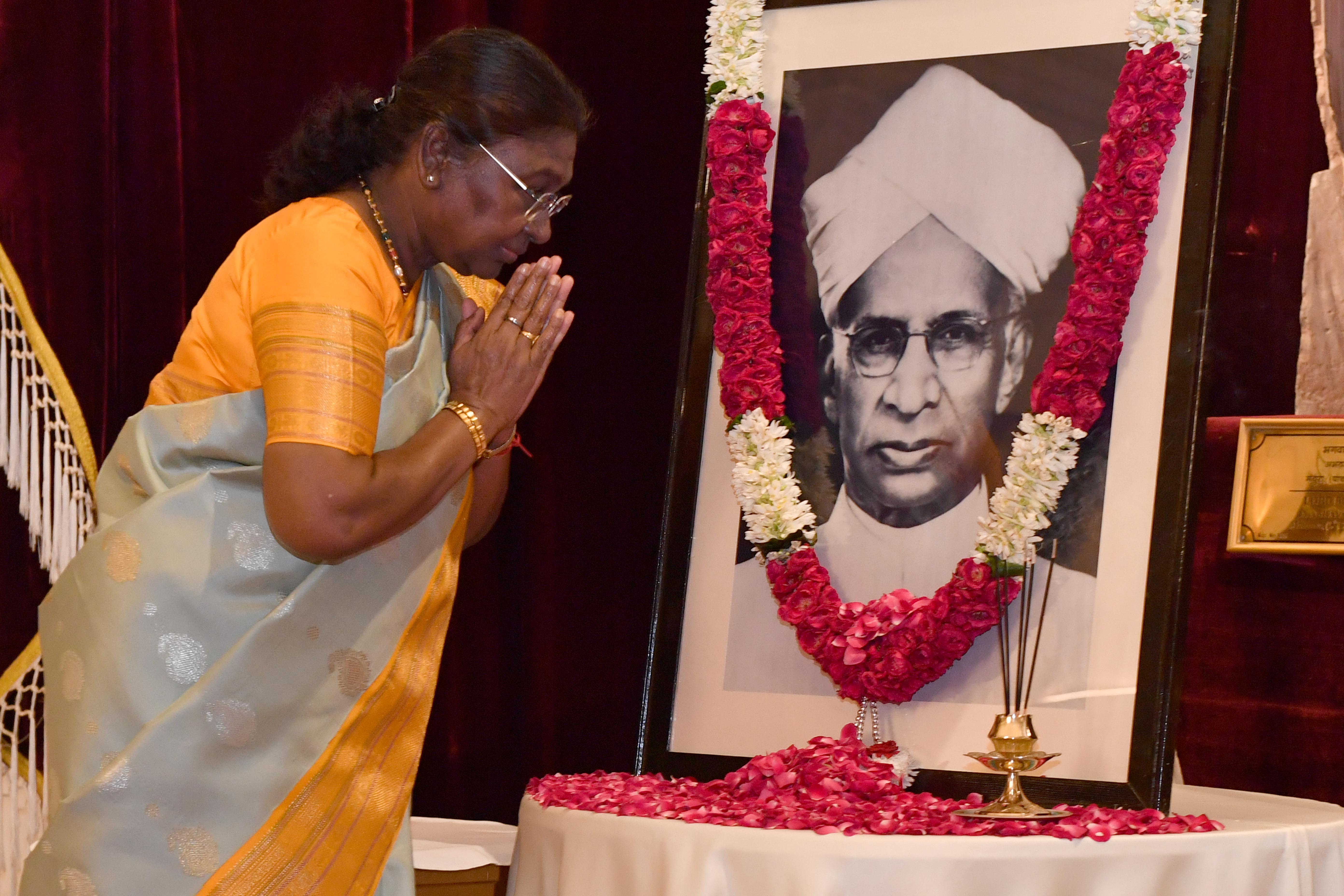 | Caption: | The President of India, Smt Droupadi Murmu paid floral tributes to Dr Sarvepalli Radhakrishnan, former President of India on his birth anniversary at Rashtrapati Bhavan on September 5, 2024. |