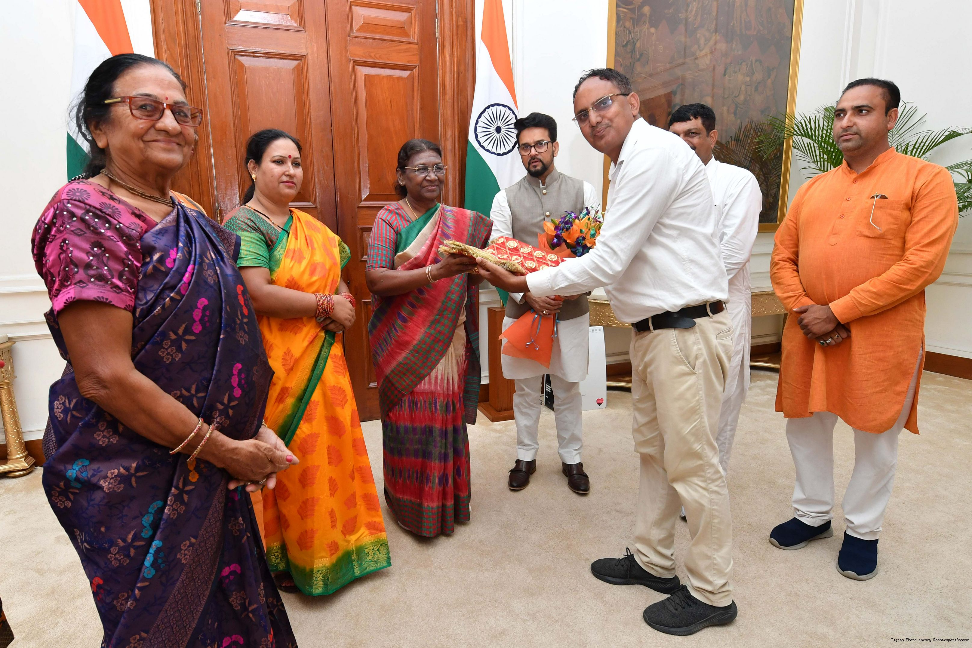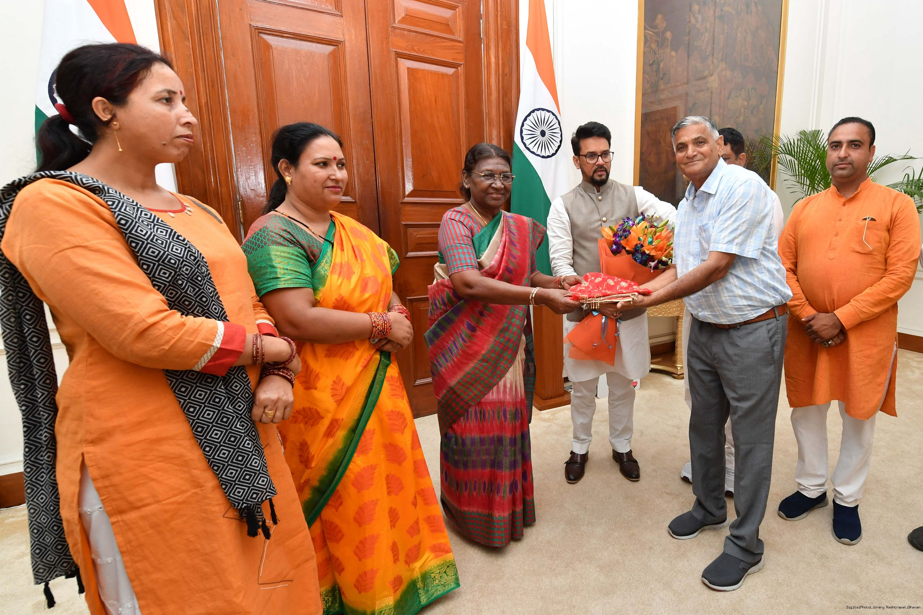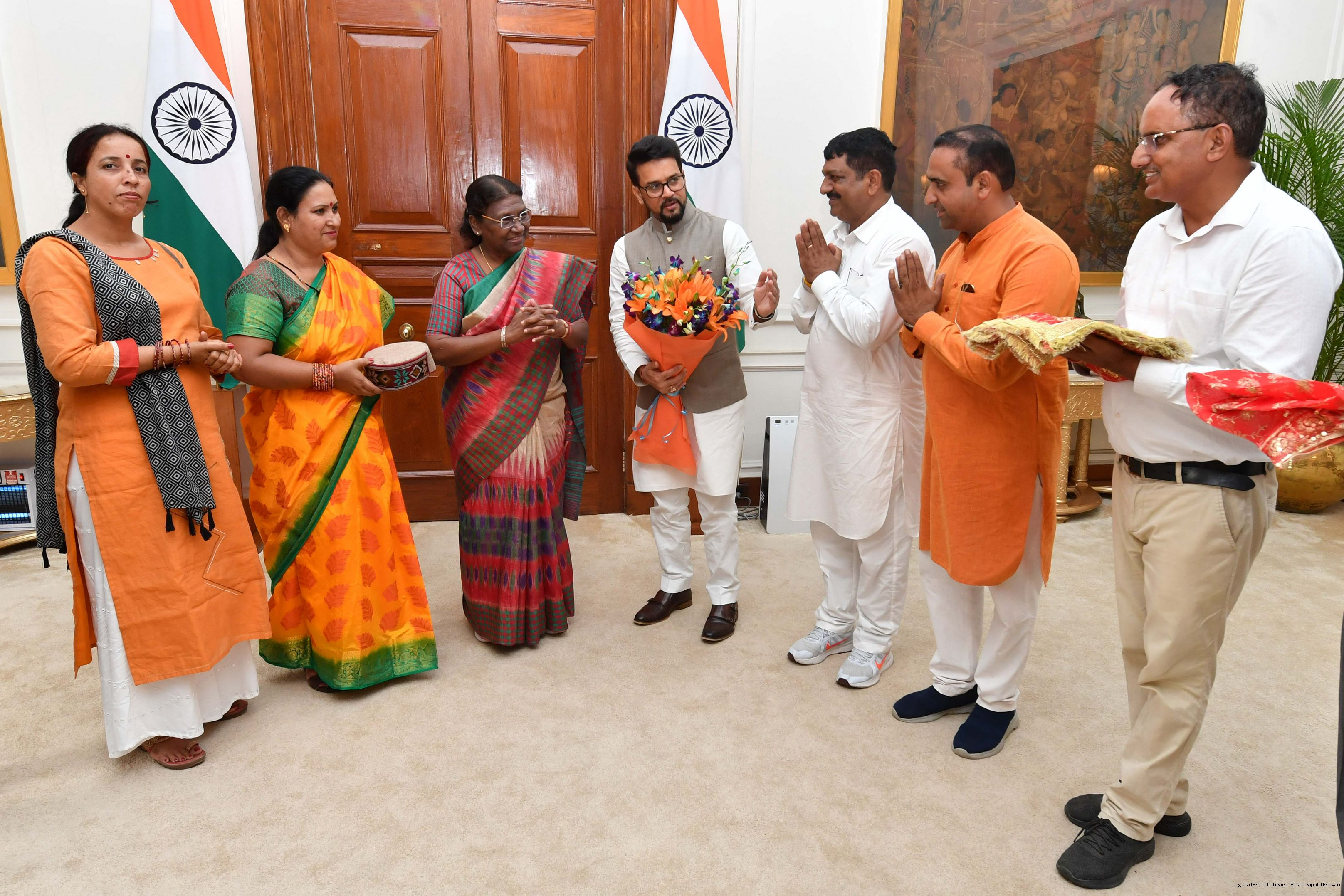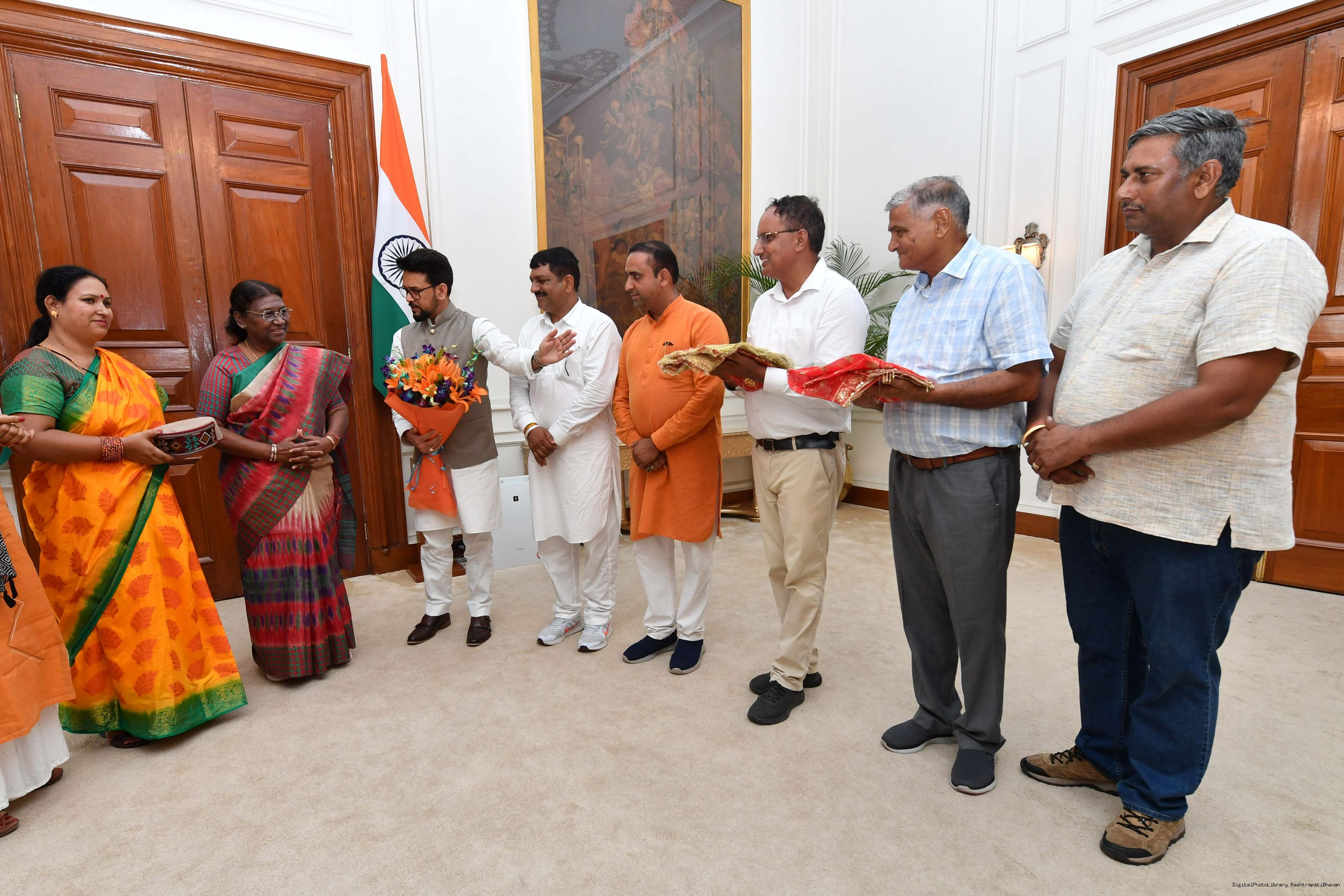 | Caption: | Shri Anurag Singh Thakur, Minister of Information and Broacasting and Youth Affairs Sports along with others meeting with the President of India, Smt. Droupadi Murmu at Rashtrapati Bhavan on August 04, 2023. |