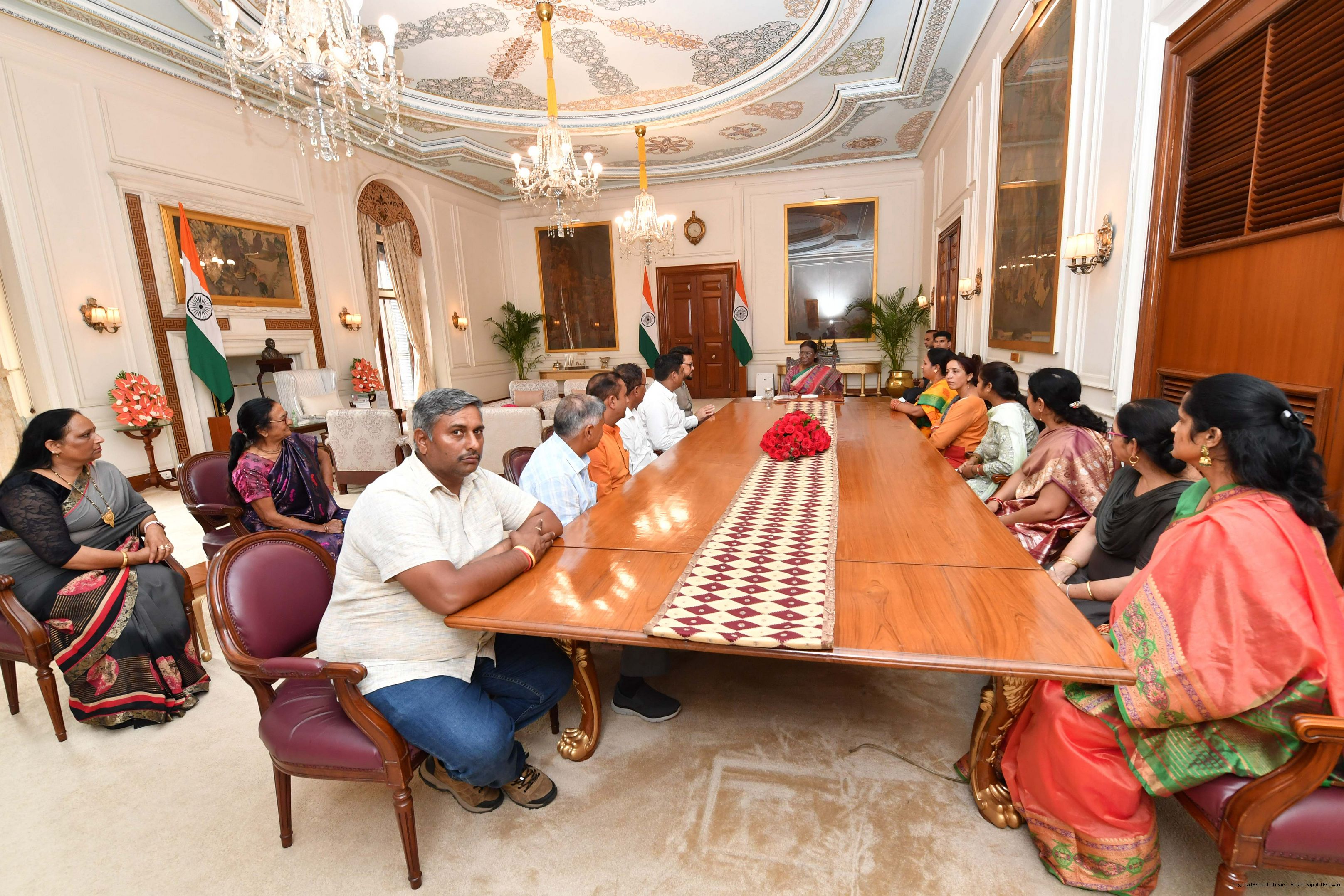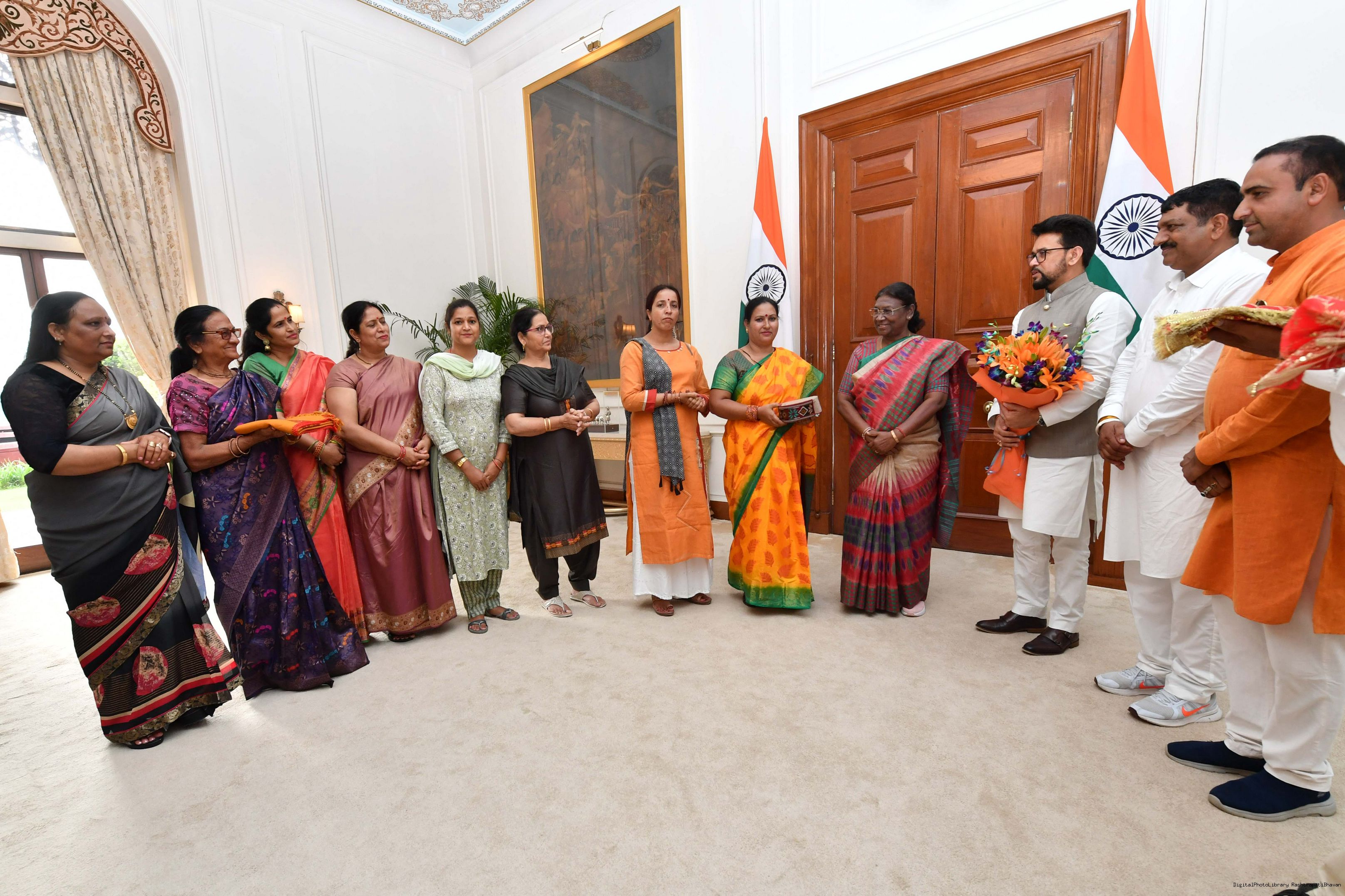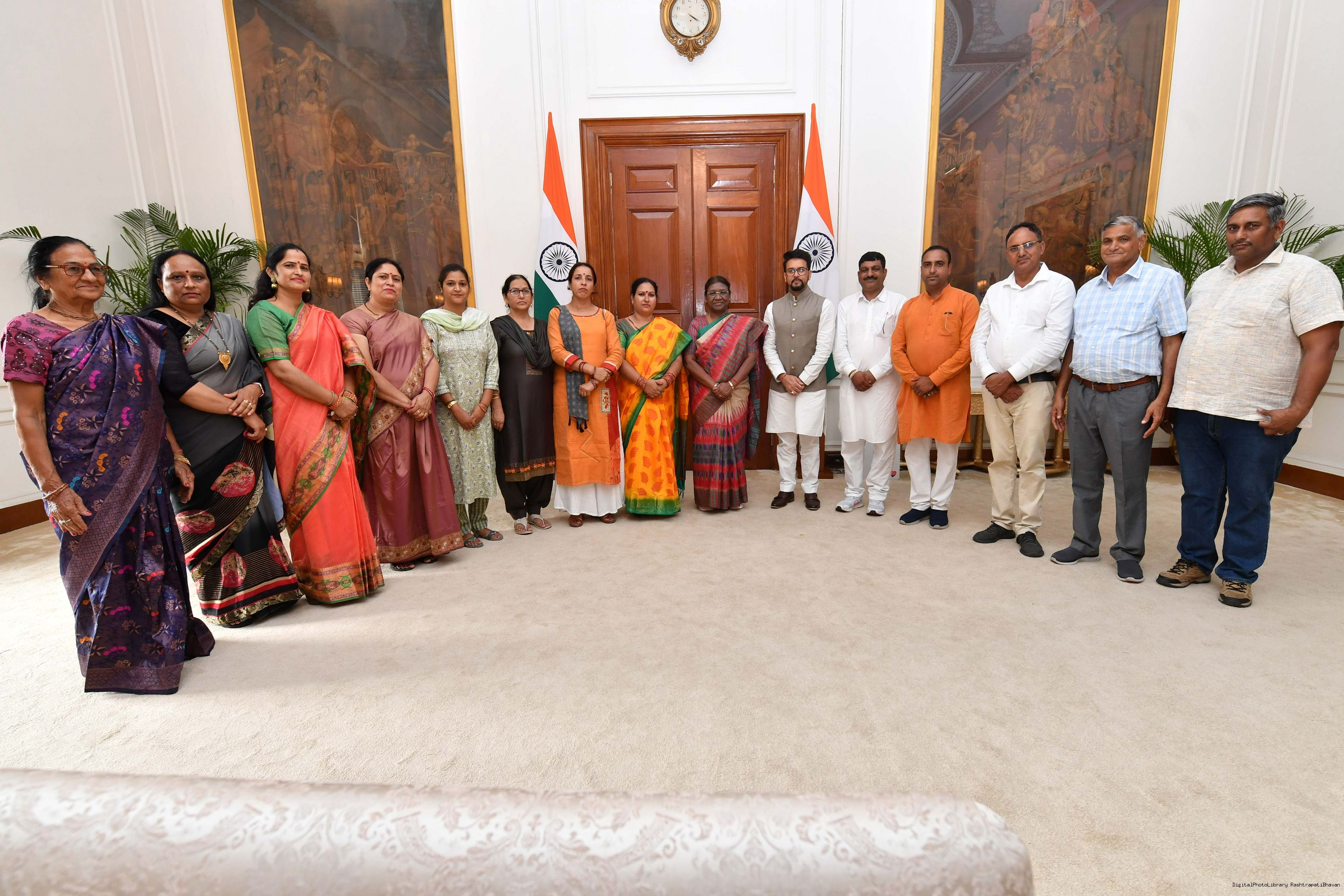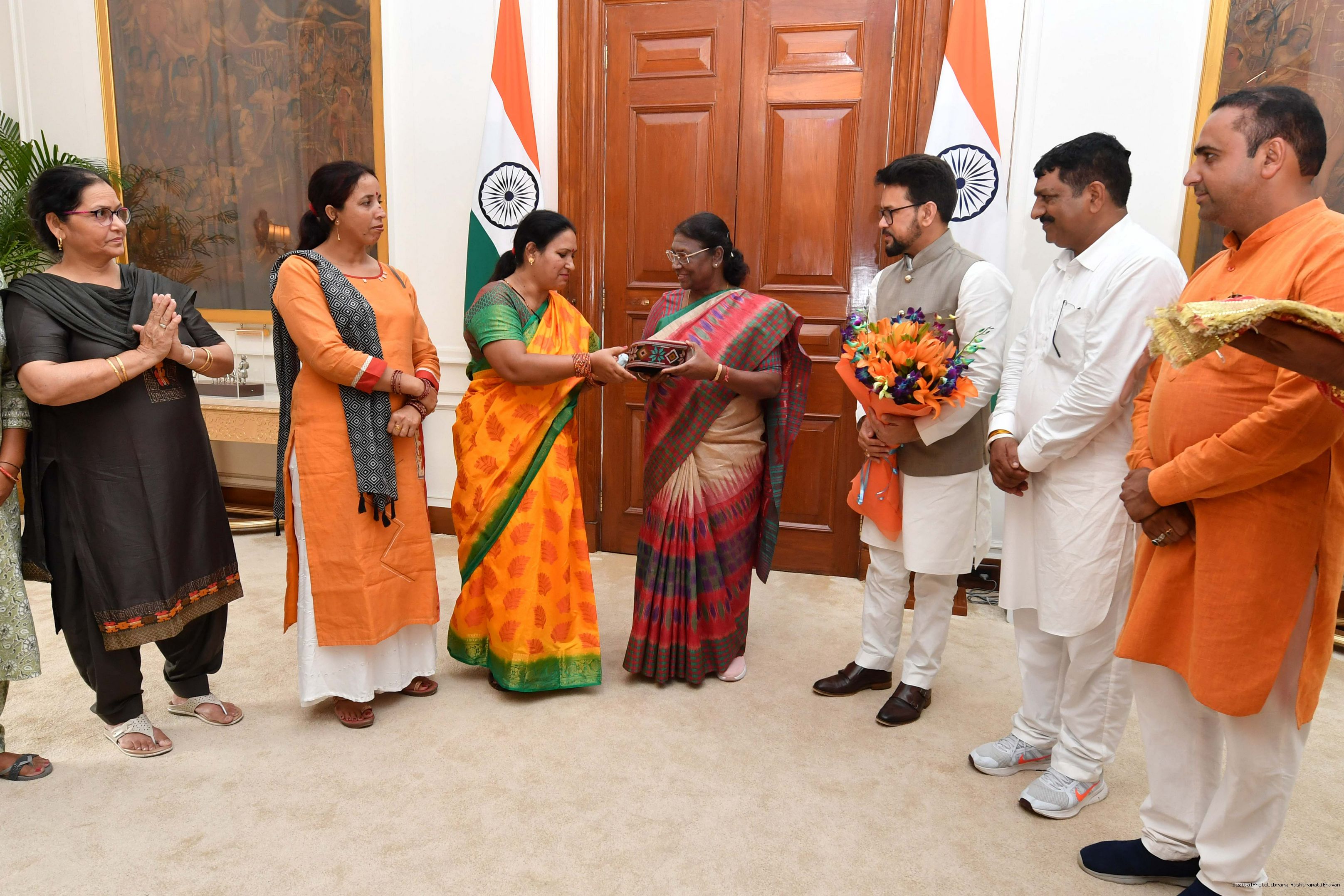 | Caption: | Shri Anurag Singh Thakur, Minister of Information and Broacasting and Youth Affairs Sports along with others meeting with the President of India, Smt. Droupadi Murmu at Rashtrapati Bhavan on August 04, 2023. |