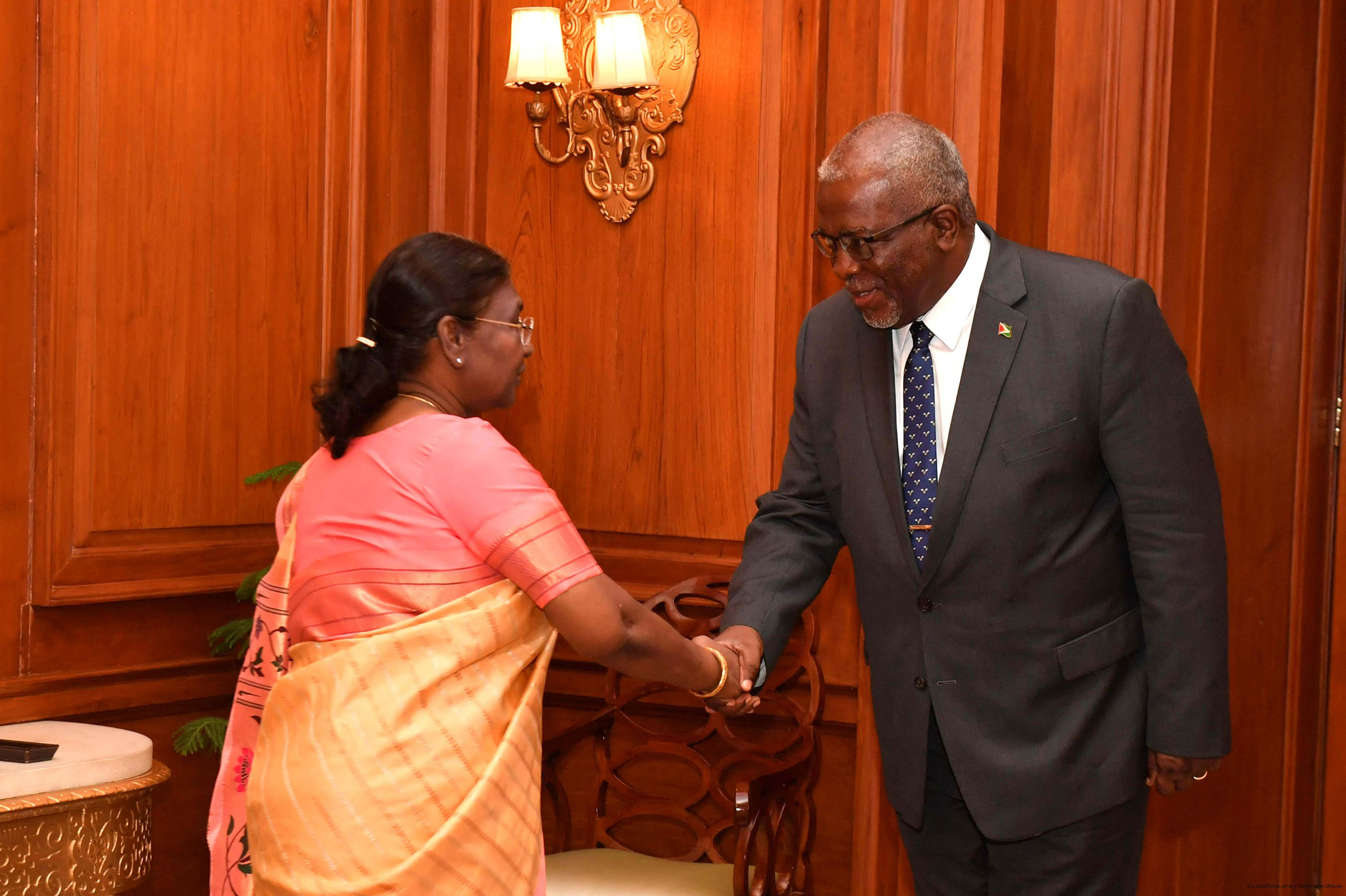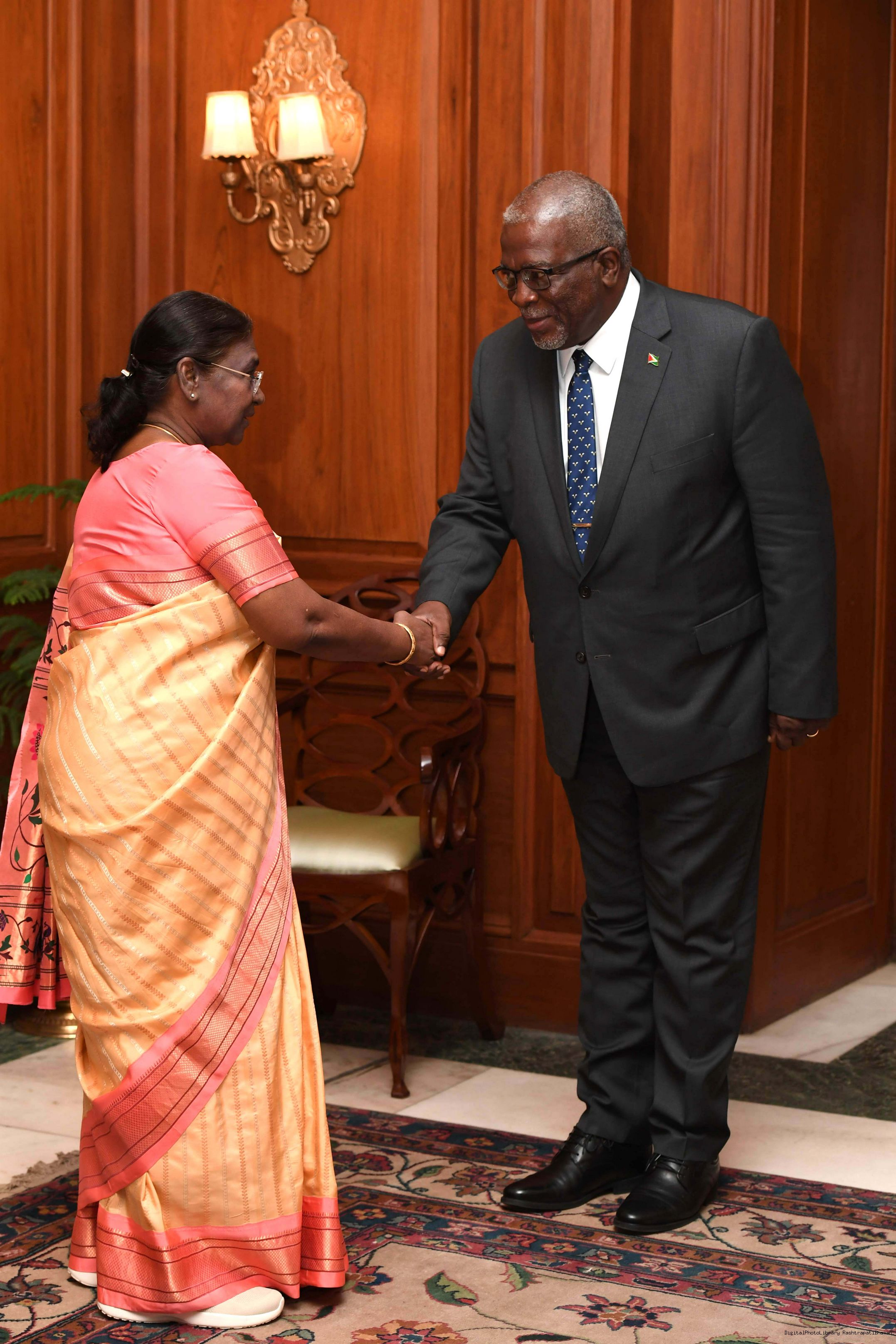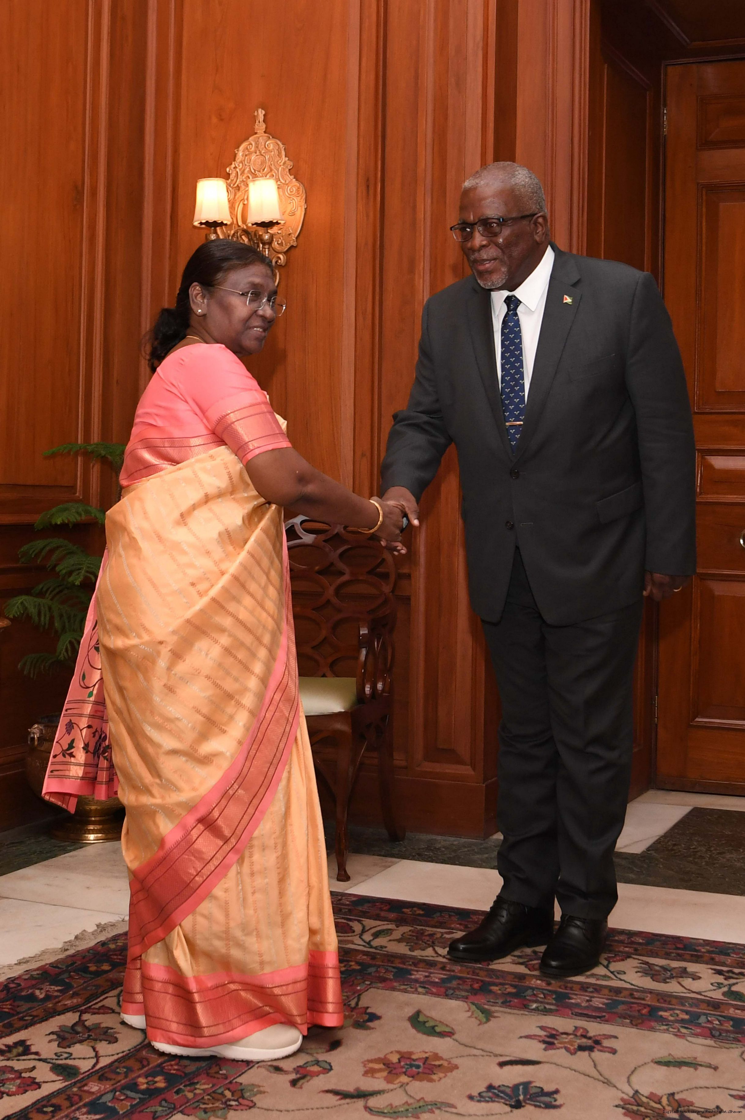 | Caption: | H.E Brigadier Mark Phillips (Retd), Prime Minister of the Co-operative Republic of Guyana called on the President of India Smt Droupadi Murmu at Rashtrapati Bhavan on February 07, 2024. |