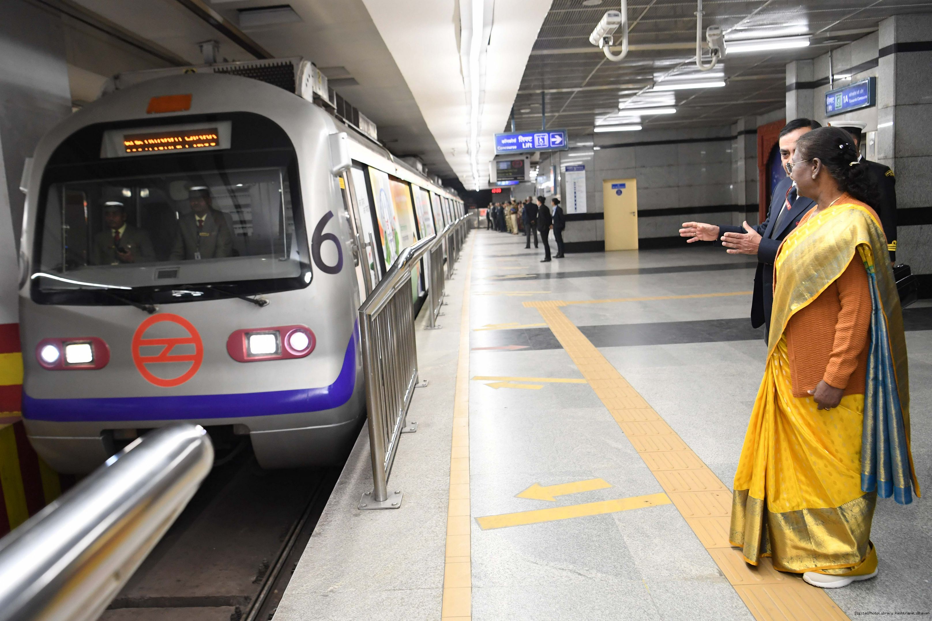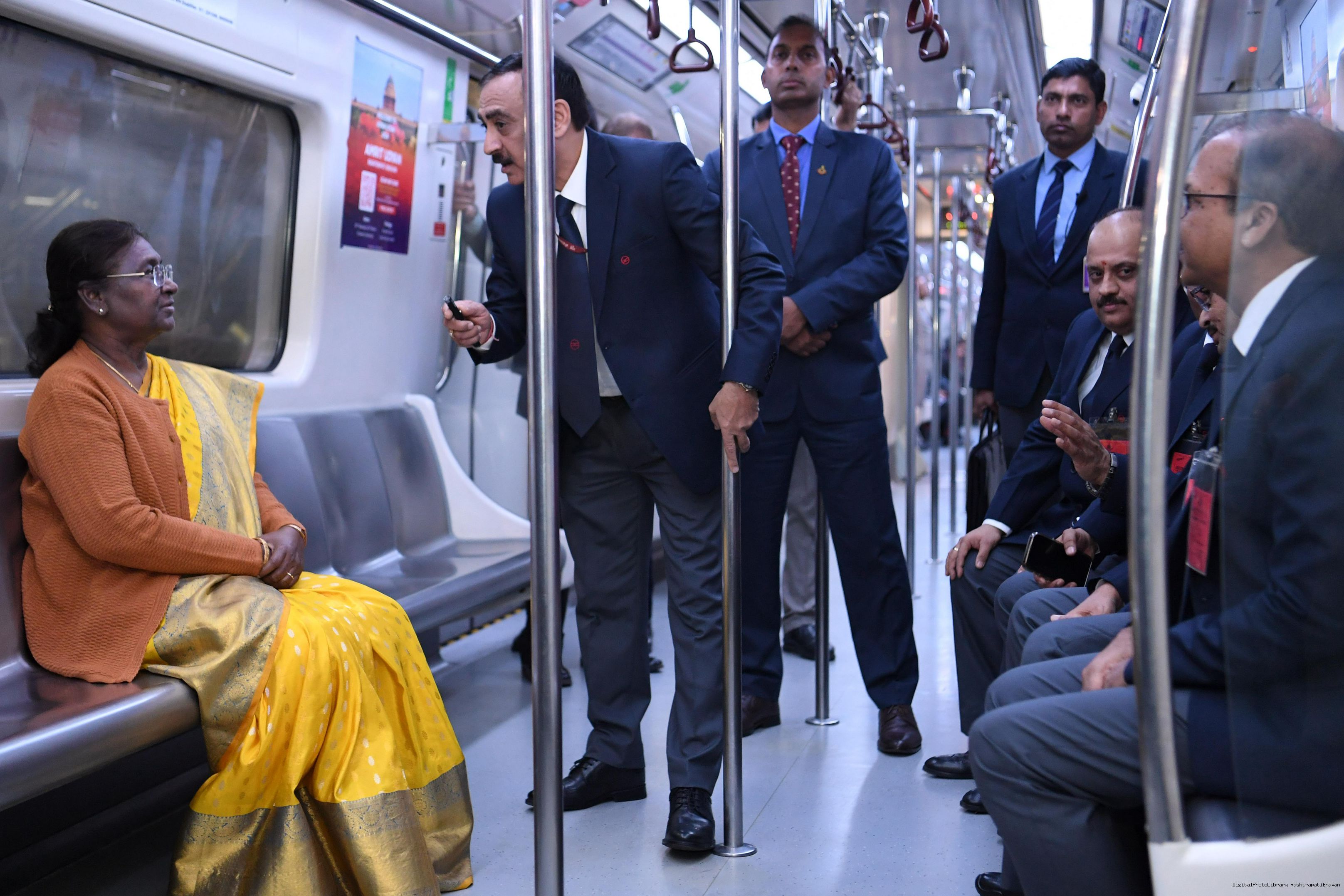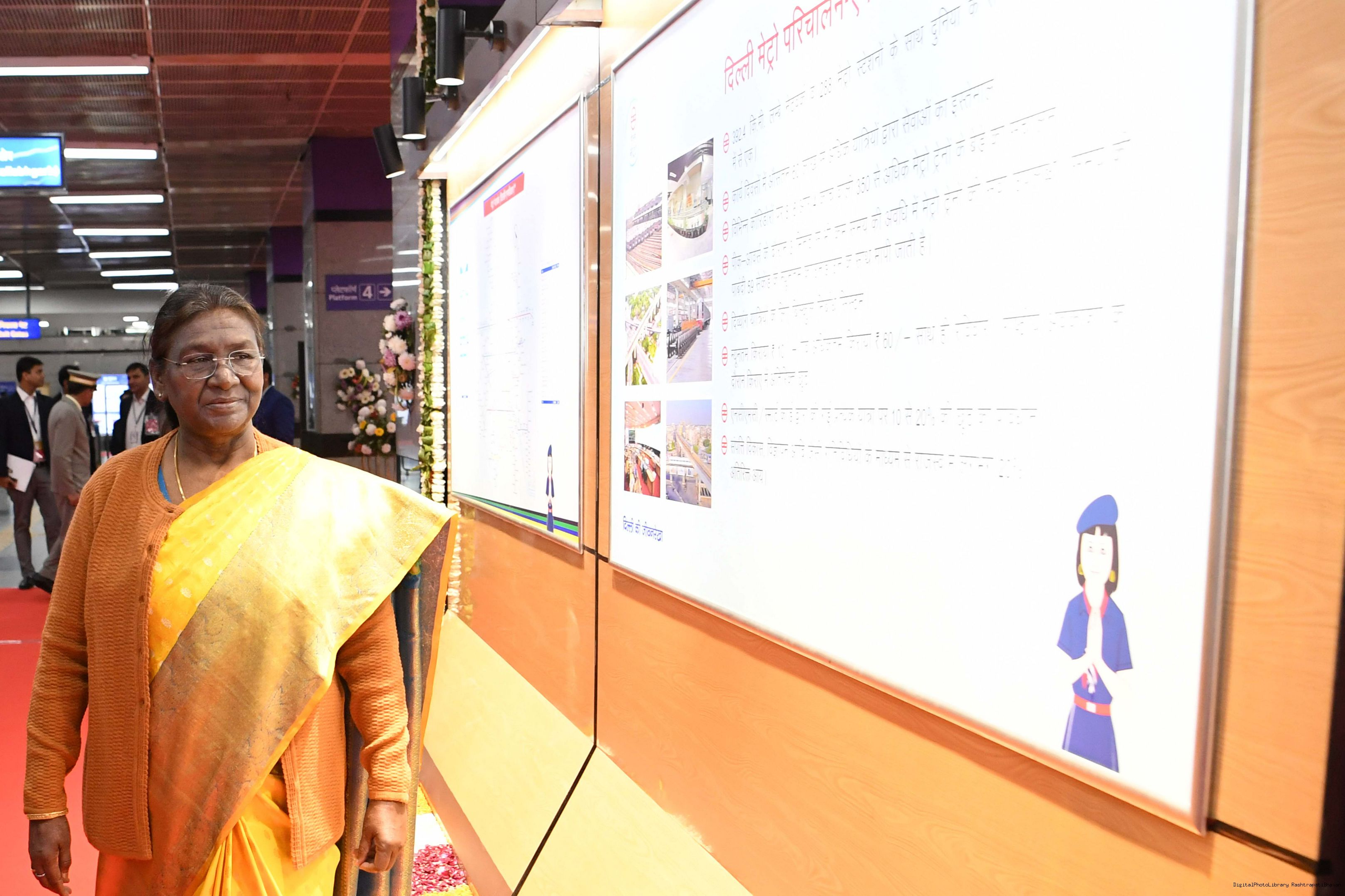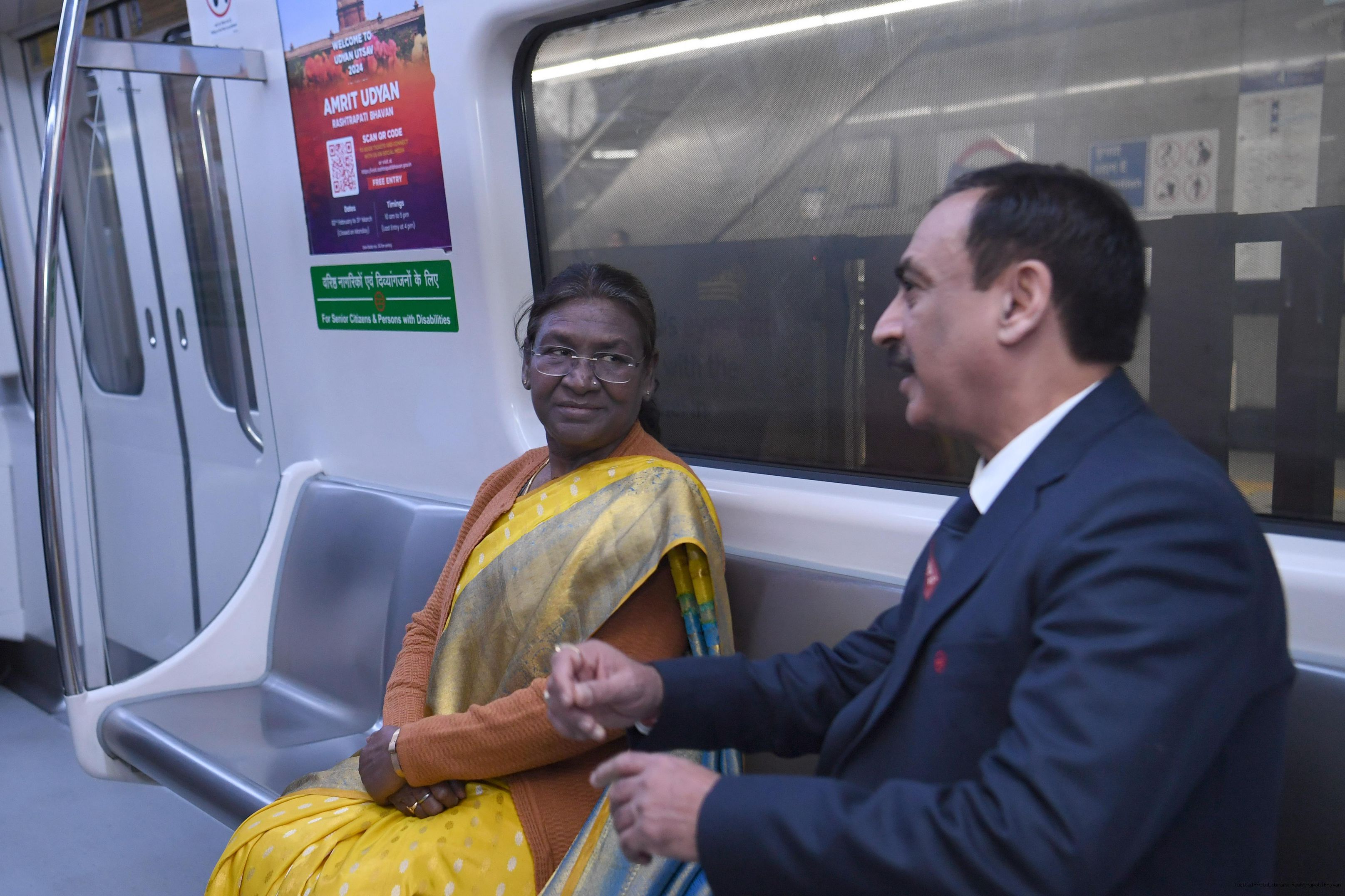 | Caption: | The President Smt. Droupadi Murmu travelled in Delhi Metro and interacted with school children during the ride flagged off shuttle bus service between Central Secretariat Metro Station and Amrit Udyan for visitors coming to Amrit Udyan at New Delhi on February 7, 2024. |