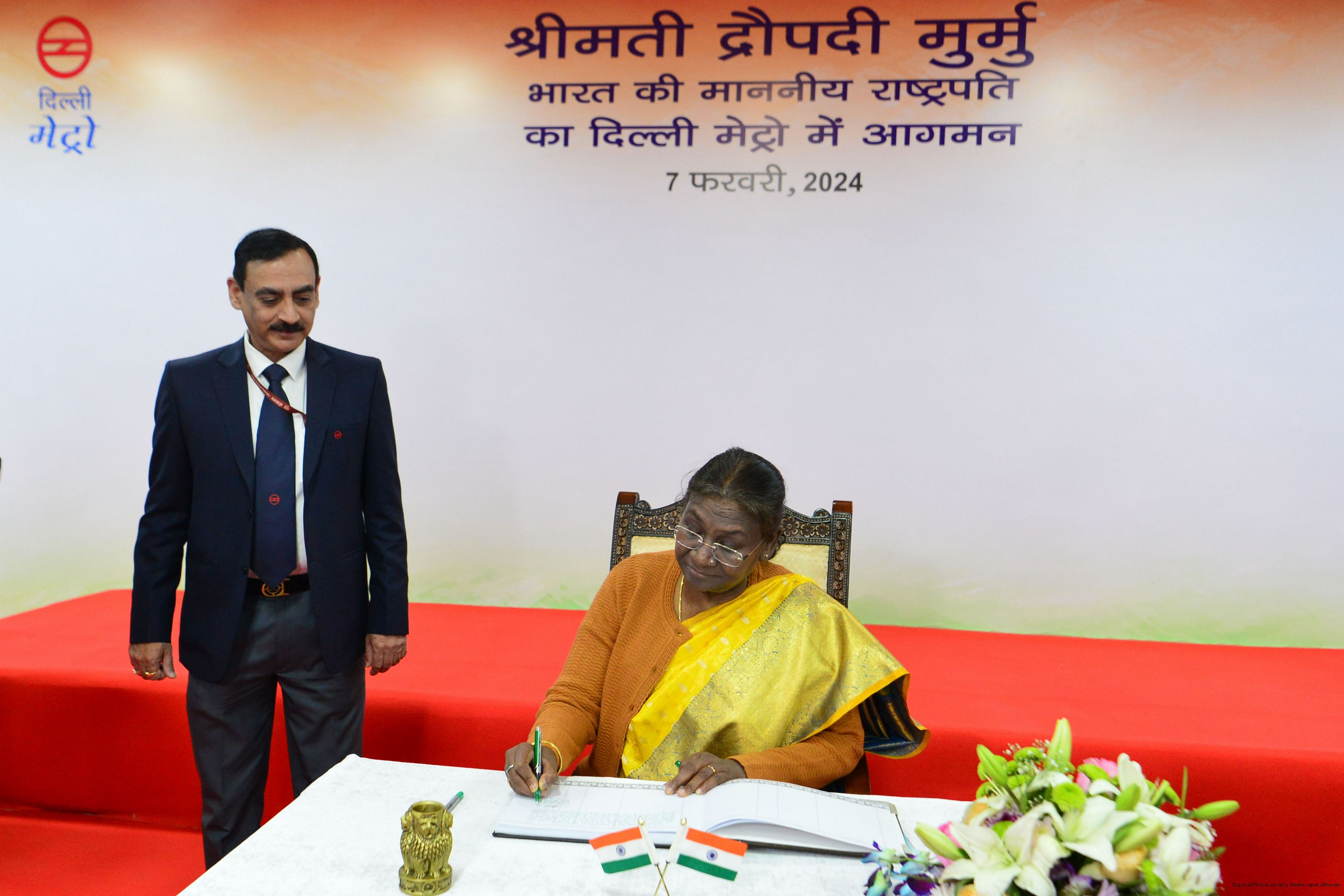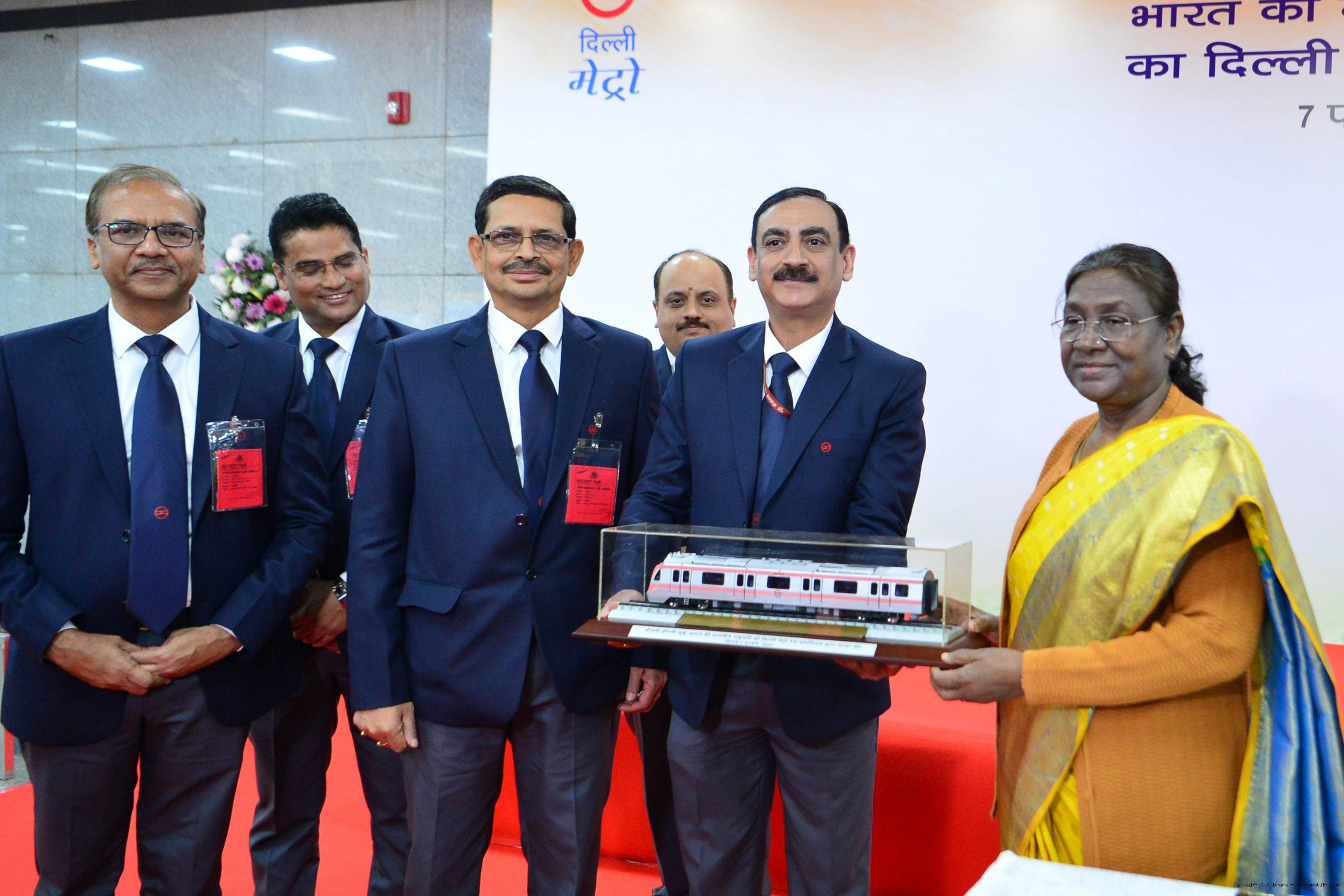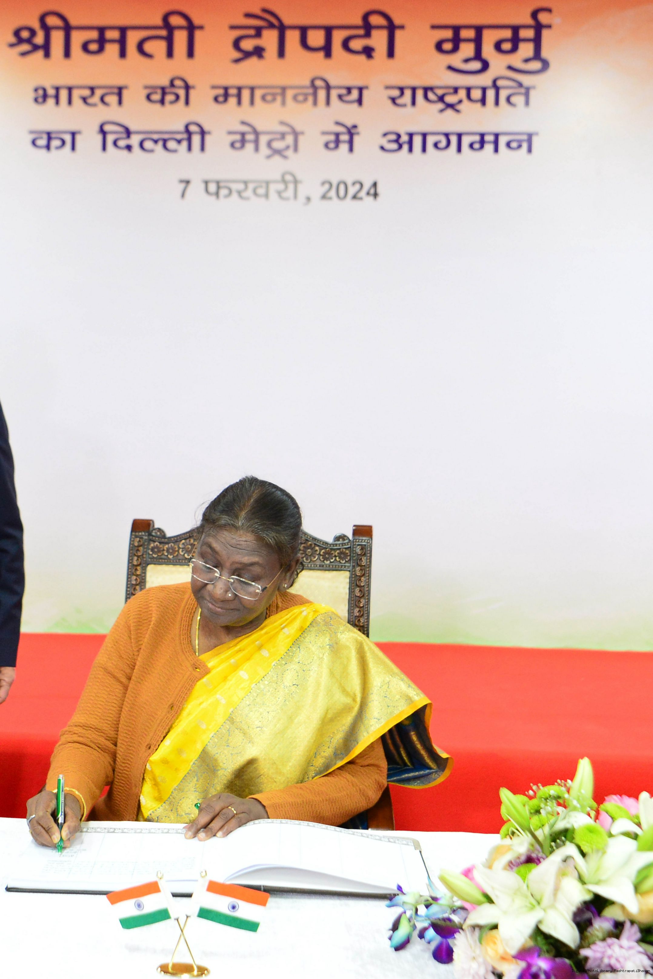 | Caption: | The President Smt. Droupadi Murmu travelled in Delhi Metro and interacted with school children during the ride flagged off shuttle bus service between Central Secretariat Metro Station and Amrit Udyan for visitors coming to Amrit Udyan at New Delhi on February 7, 2024. |
