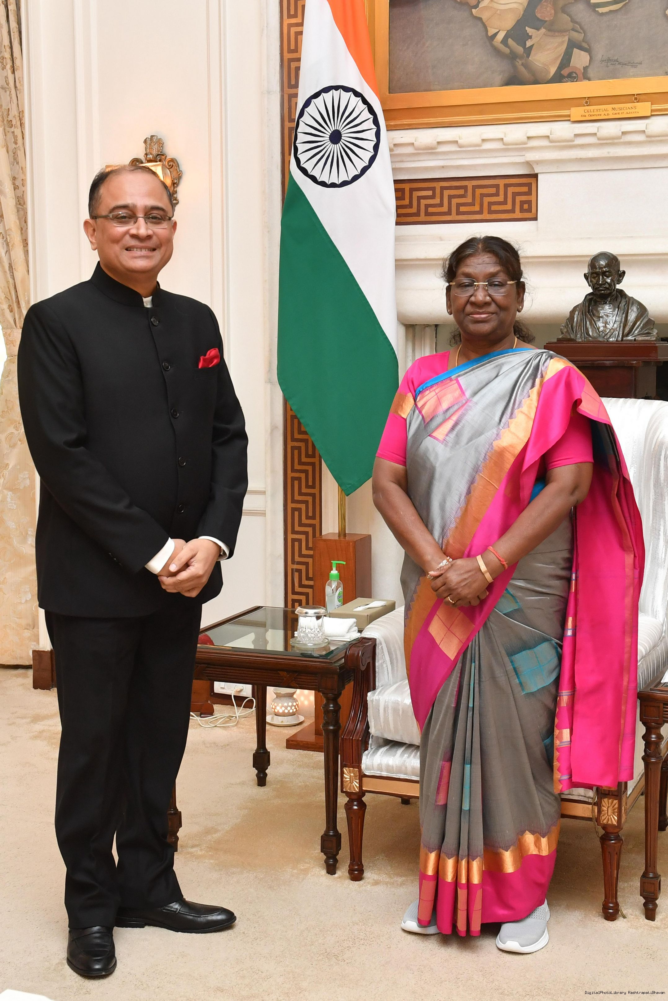 | Caption: | The Ambassador-designate of India to Republic of Indonesia, Shri Sandeep Chakravorty meeting with the President of India, Smt. Droupadi Murmu at Rashtrapati Bhavan on August 09, 2023. |