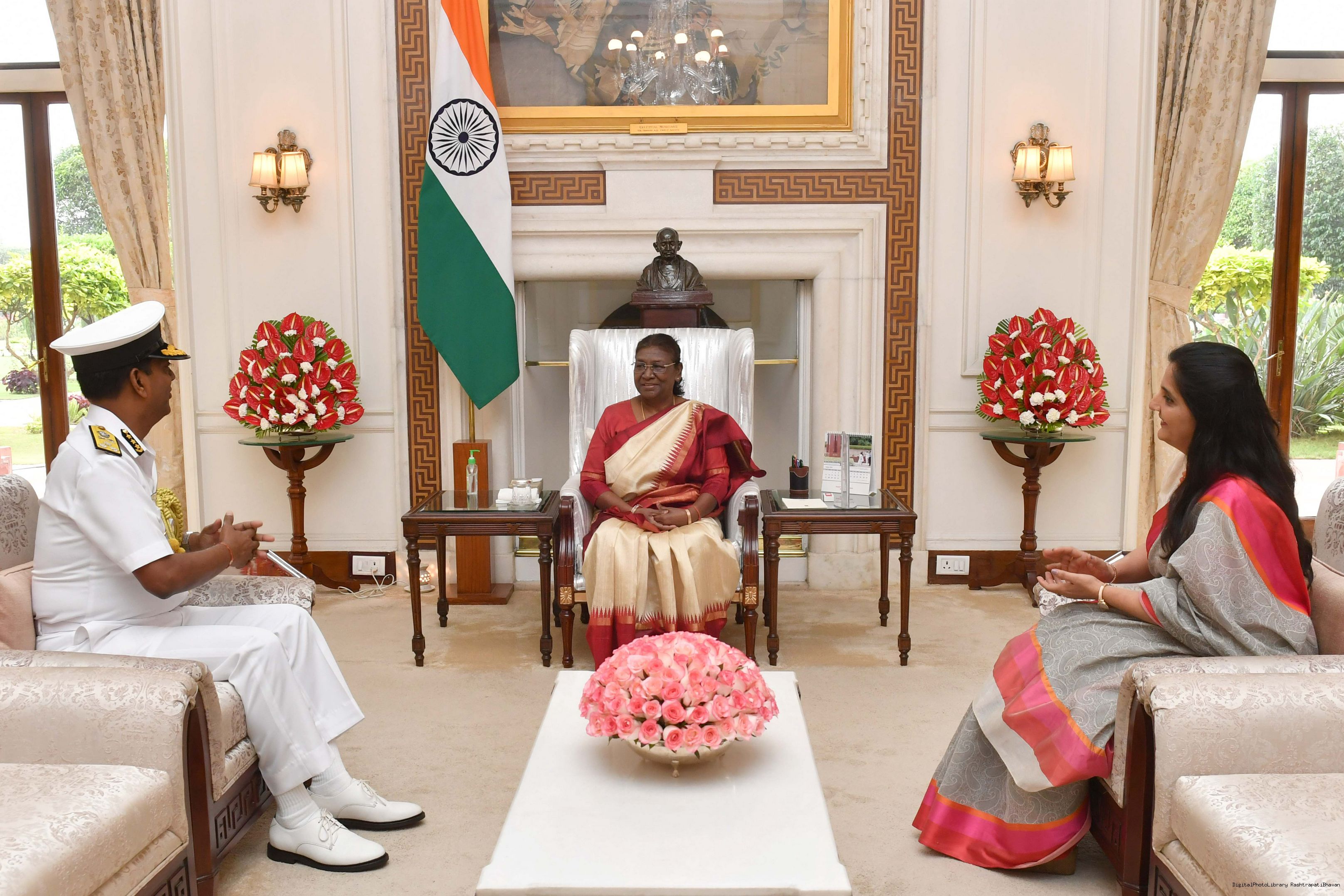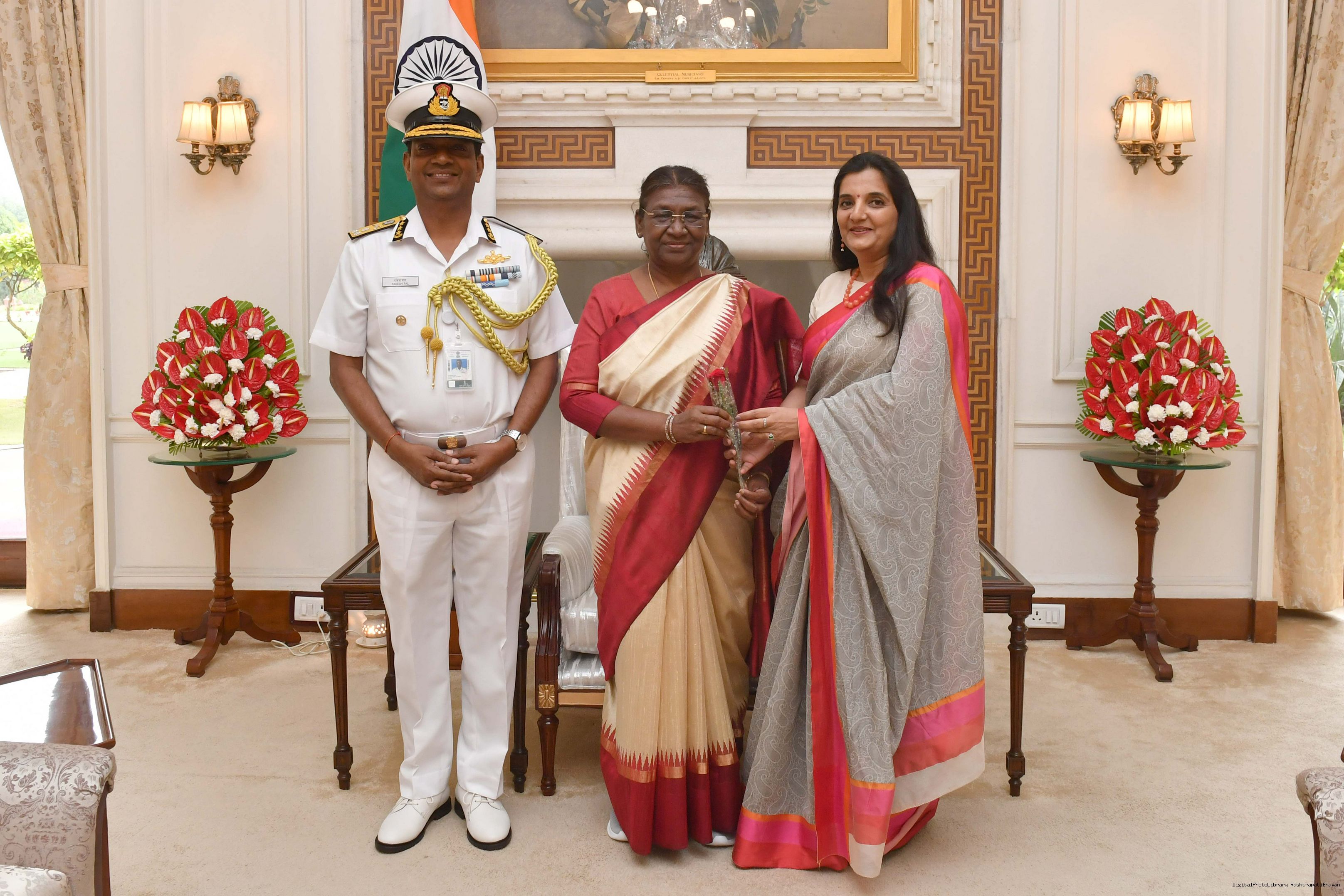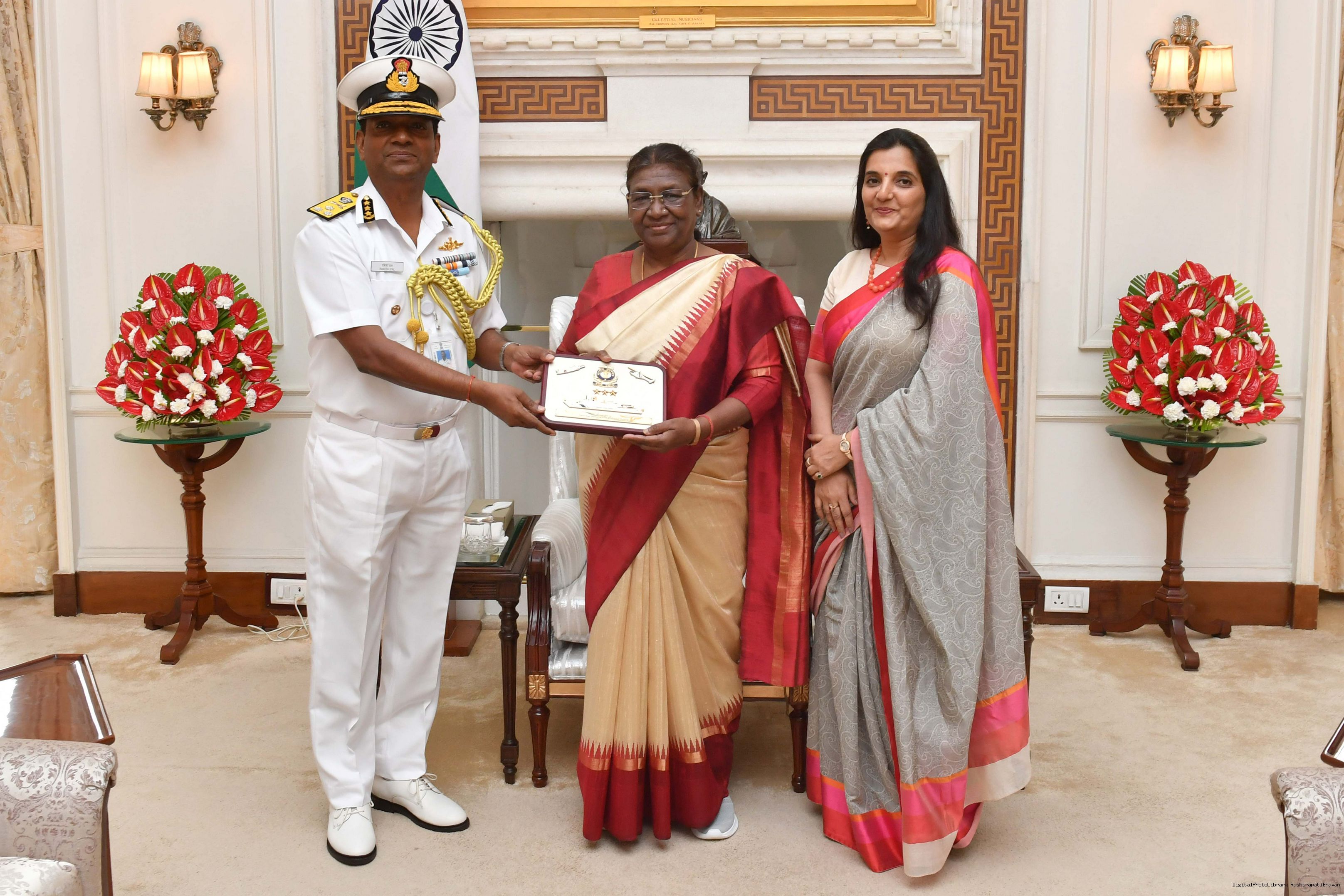 | Caption: | The Director General Rakesh Pal, PTM, TM DG, Indian Coast Guard along with his wife Smt. Dipa Pal meeting with the President of India, Smt. Droupadi Murmu at Rashtrapati Bhavan on August 09, 2023. |