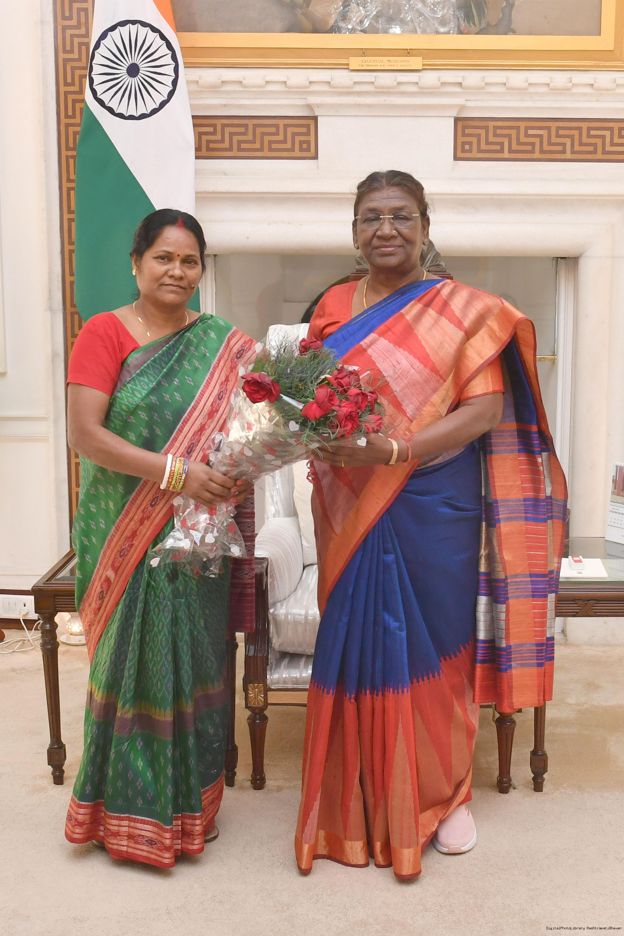| Caption: | Smt. Anjana Mohanta from Rairangpur, Mayurbhanj, Odisha meeting with the President of India, Smt. Droupadi Murmu at Rashtrapati Bhavan on August 10, 2023. |