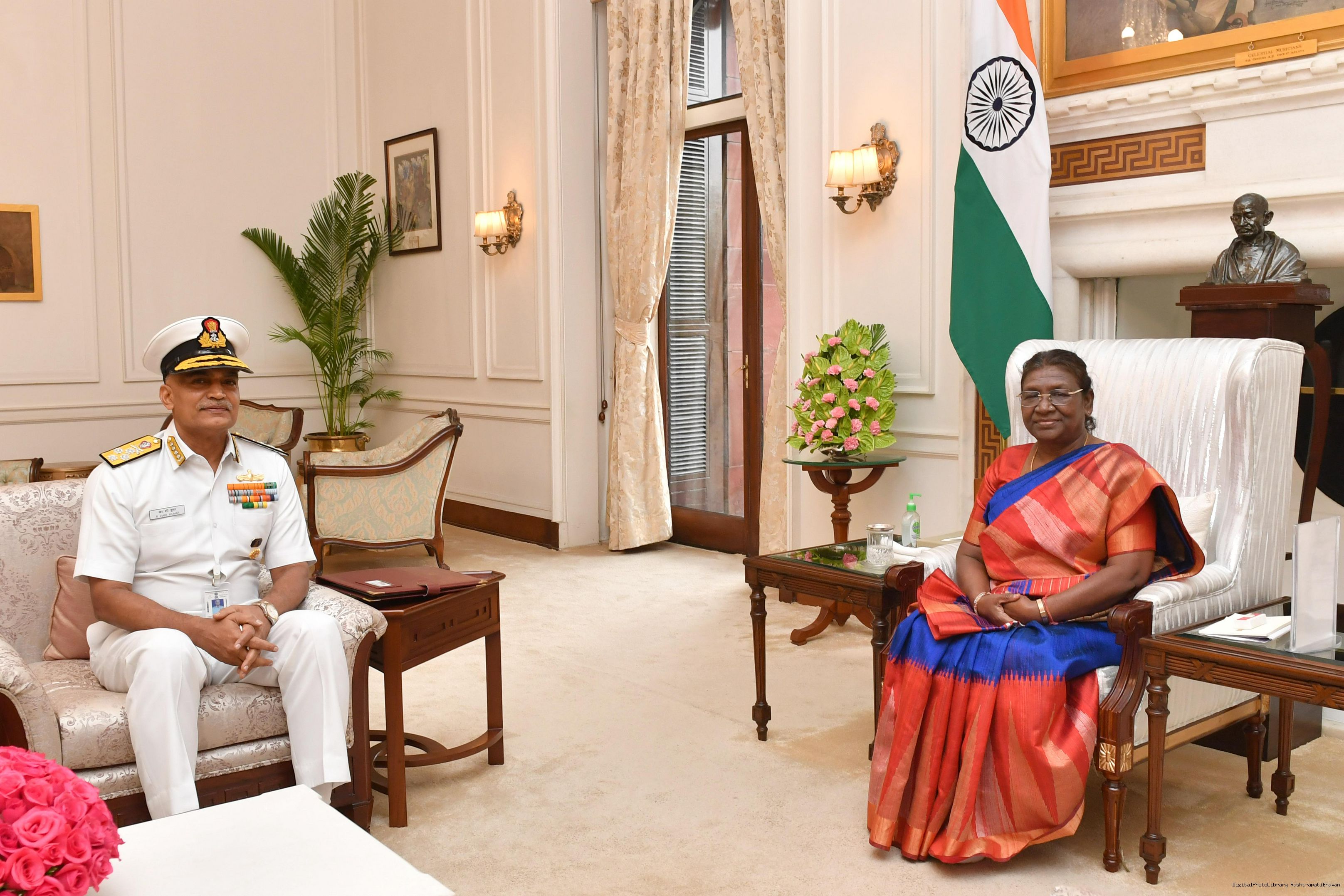 | Caption: | Admiral R. Hari Kumar, PVSM, AVSM, VSM, ADC, Chief of the Naval Staff meeting with the President of India, Smt. Droupadi Murmu at Rashtrapati Bhavan on August 10, 2023. |