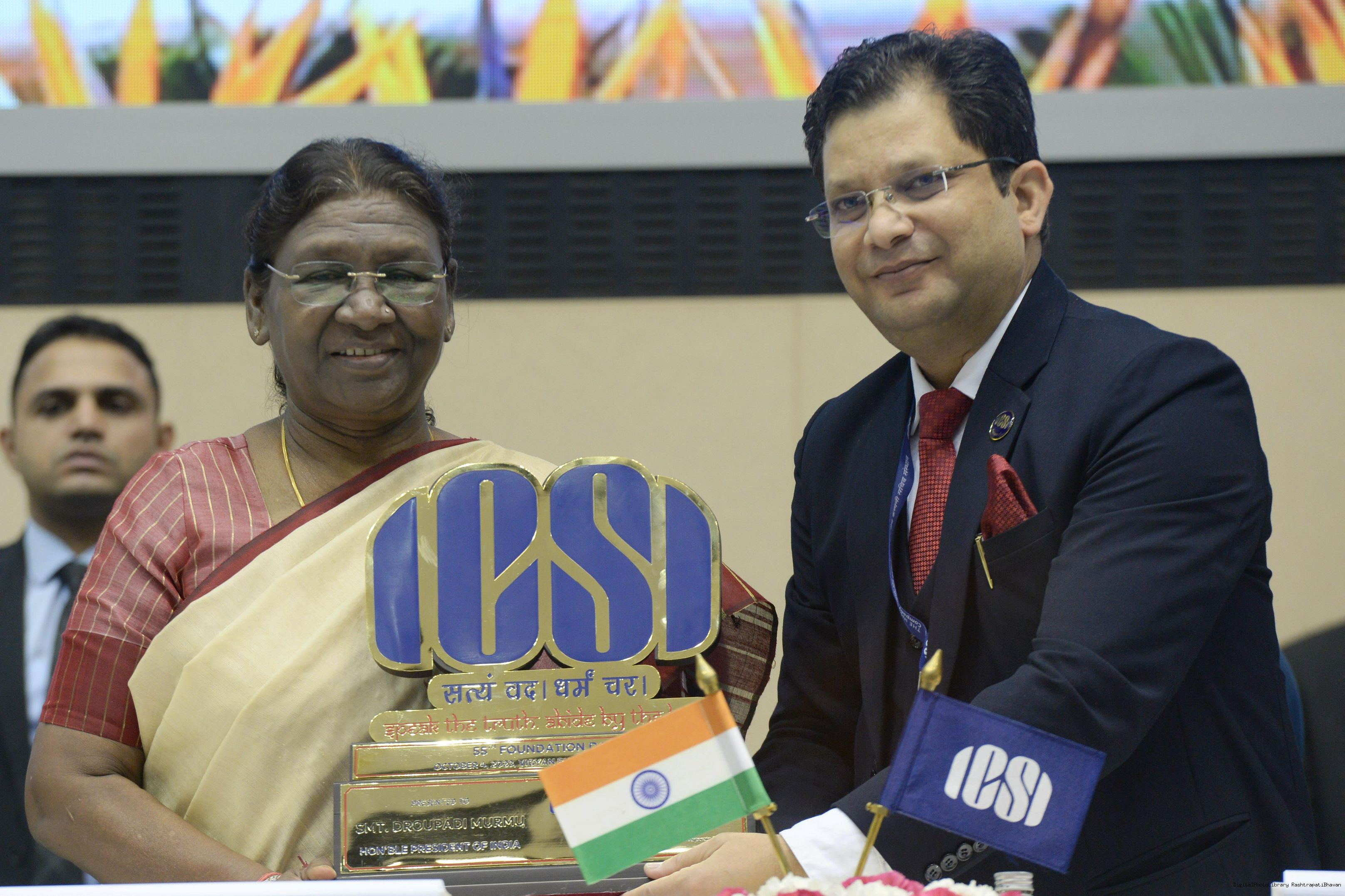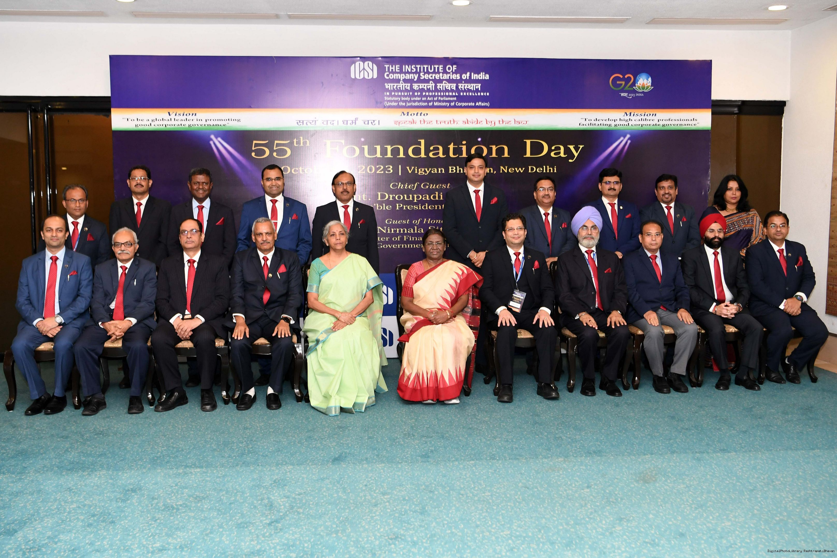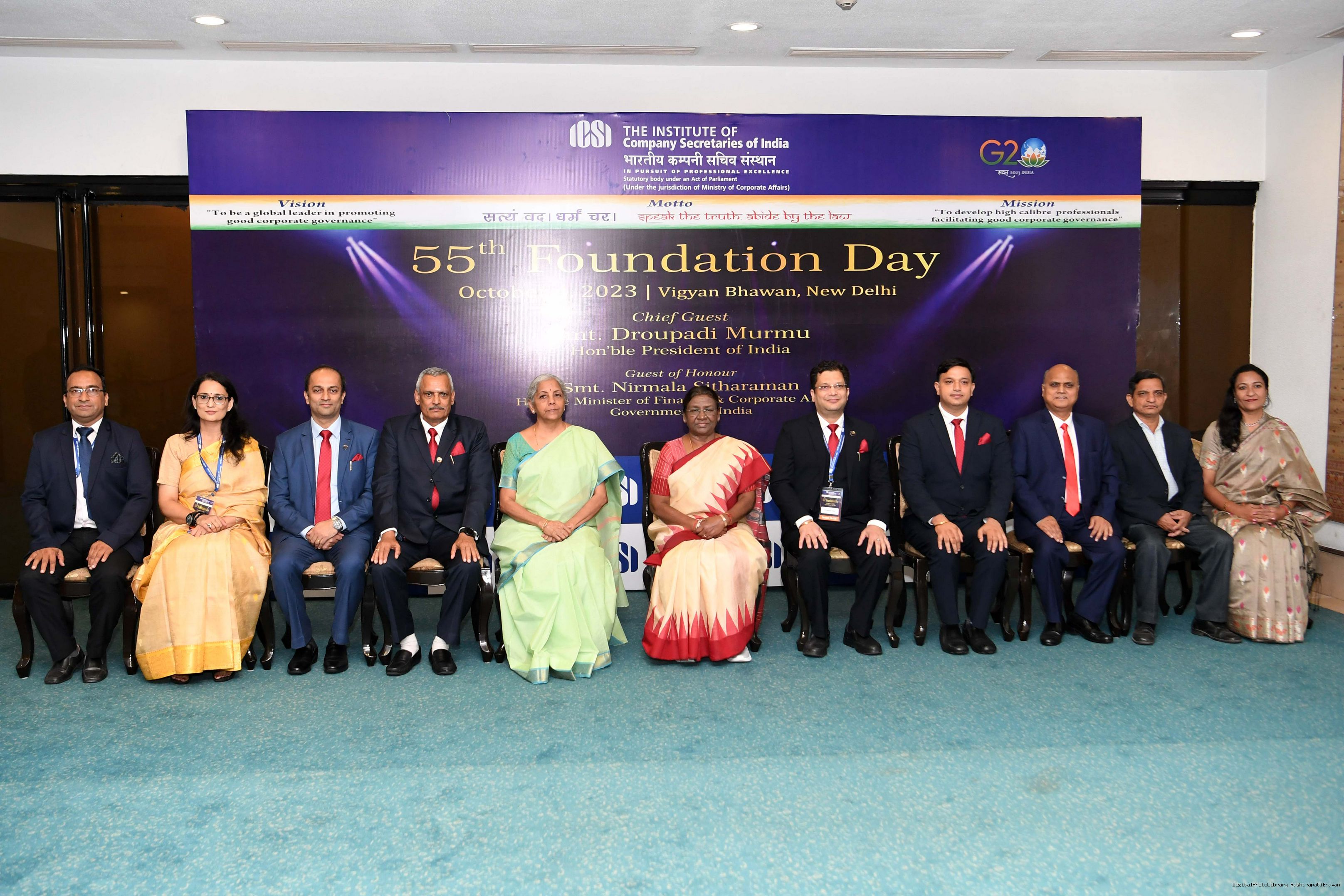 | Caption: | The President of India, Smt Droupadi Murmu graced the 55th foundation day celebrations of the Institute of Company Secretaries of India (ICSI) at Vigyan Bhavan in New Delhi on October 04, 2023. |