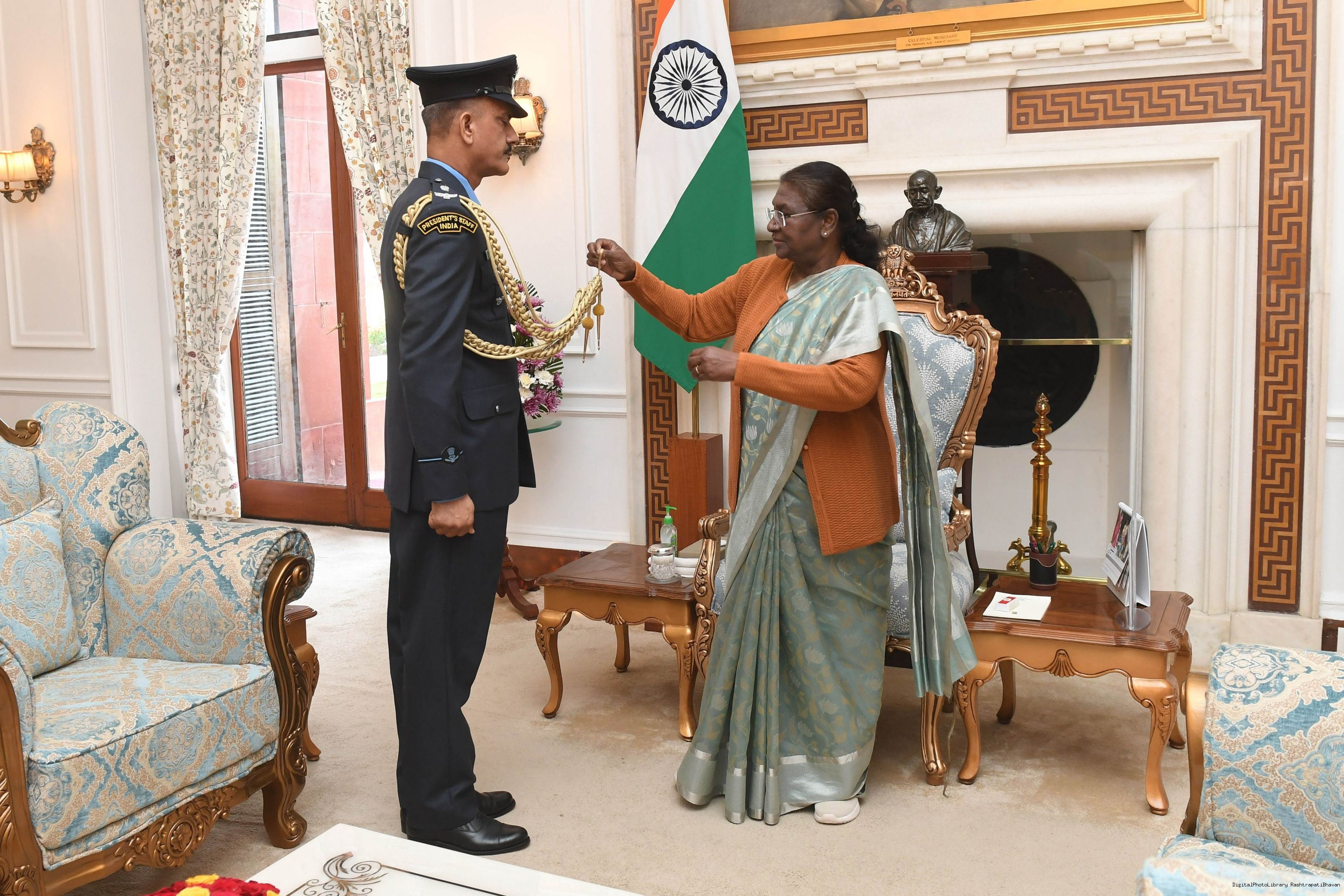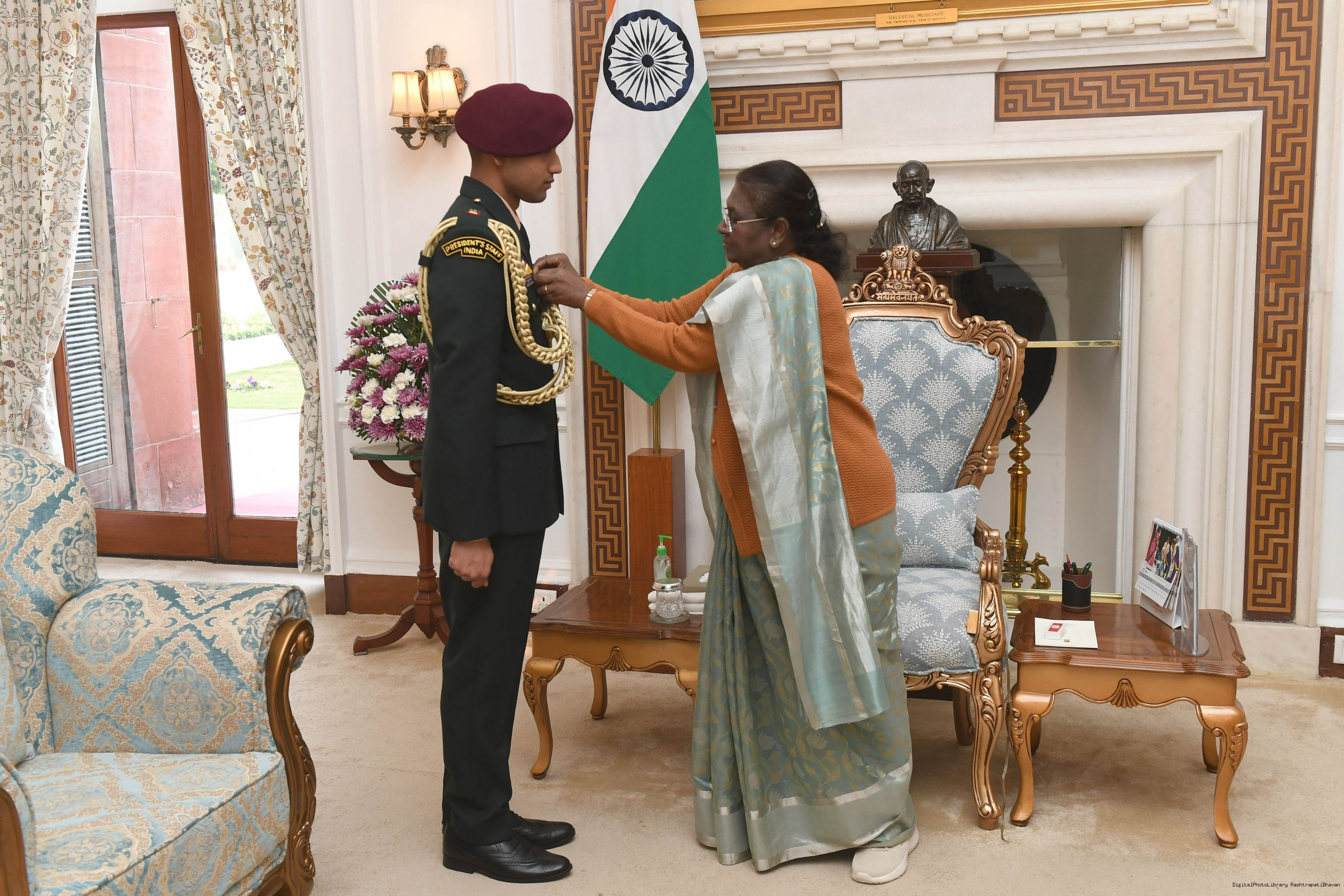| Caption: | Captain Siddharth Sharma ADC and MWO RK Jangir JCO ADC meeting with the President of India, Smt Droupadi Murmu at Rashtrapati Bhavan on February 11, 2024 |