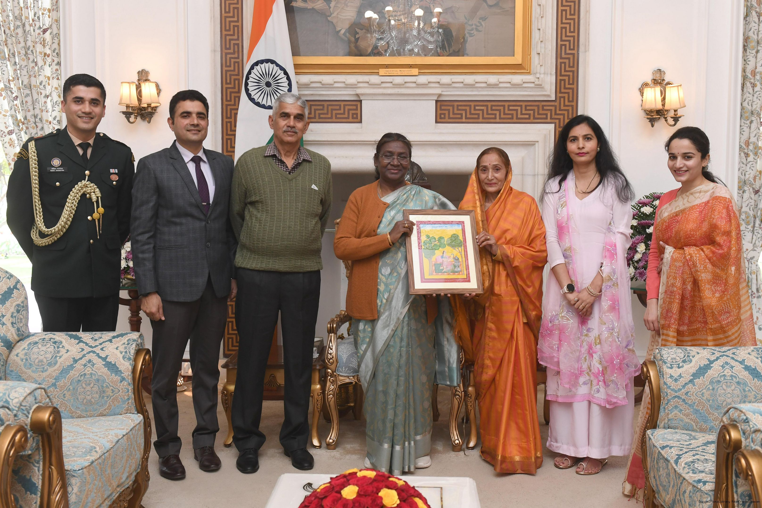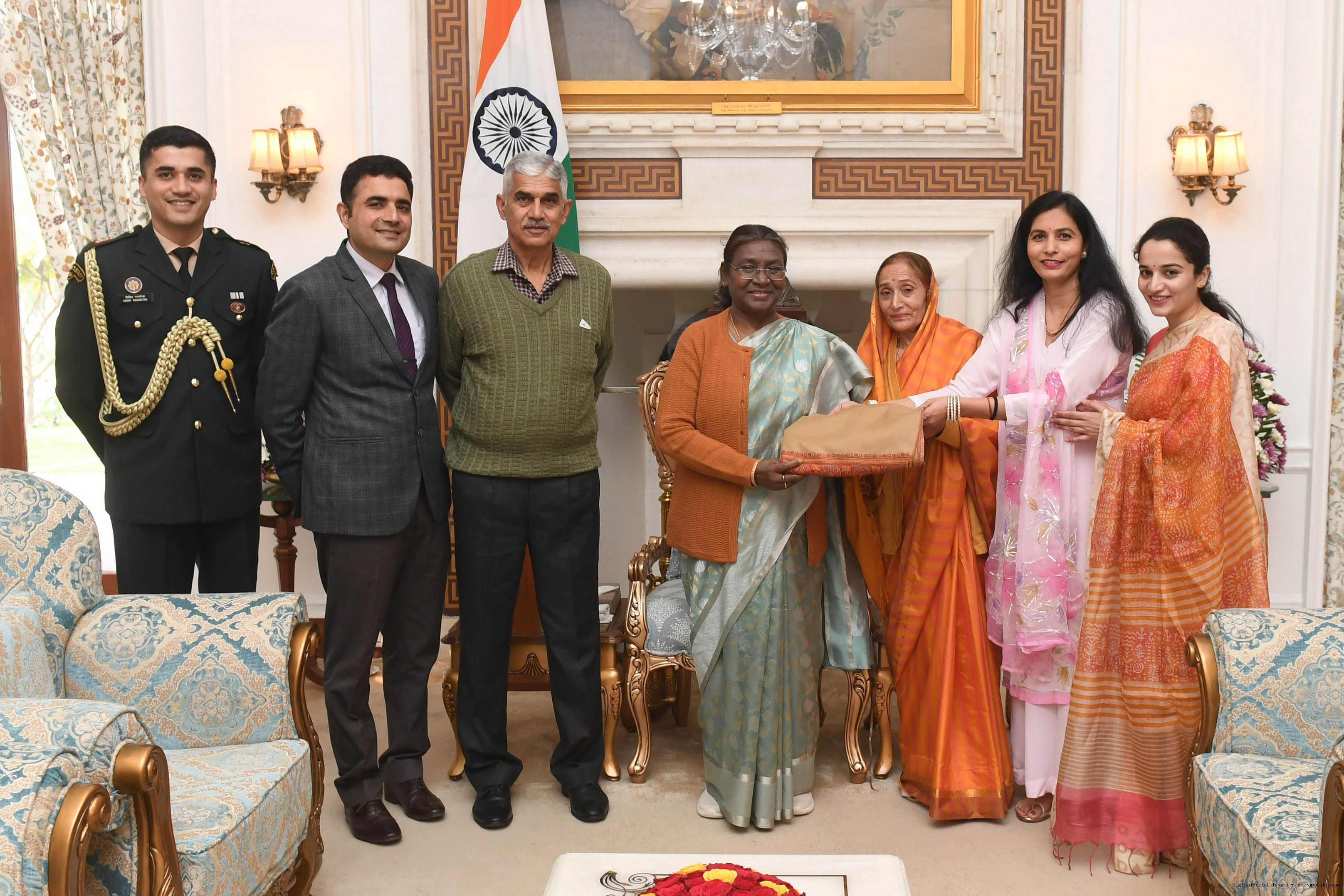 | Caption: | Major Rohit Rasgotra Along with Family meeting with the President of India, Smt Droupadi Murmu at Rashtrapati Bhavan on February 11, 2024 |