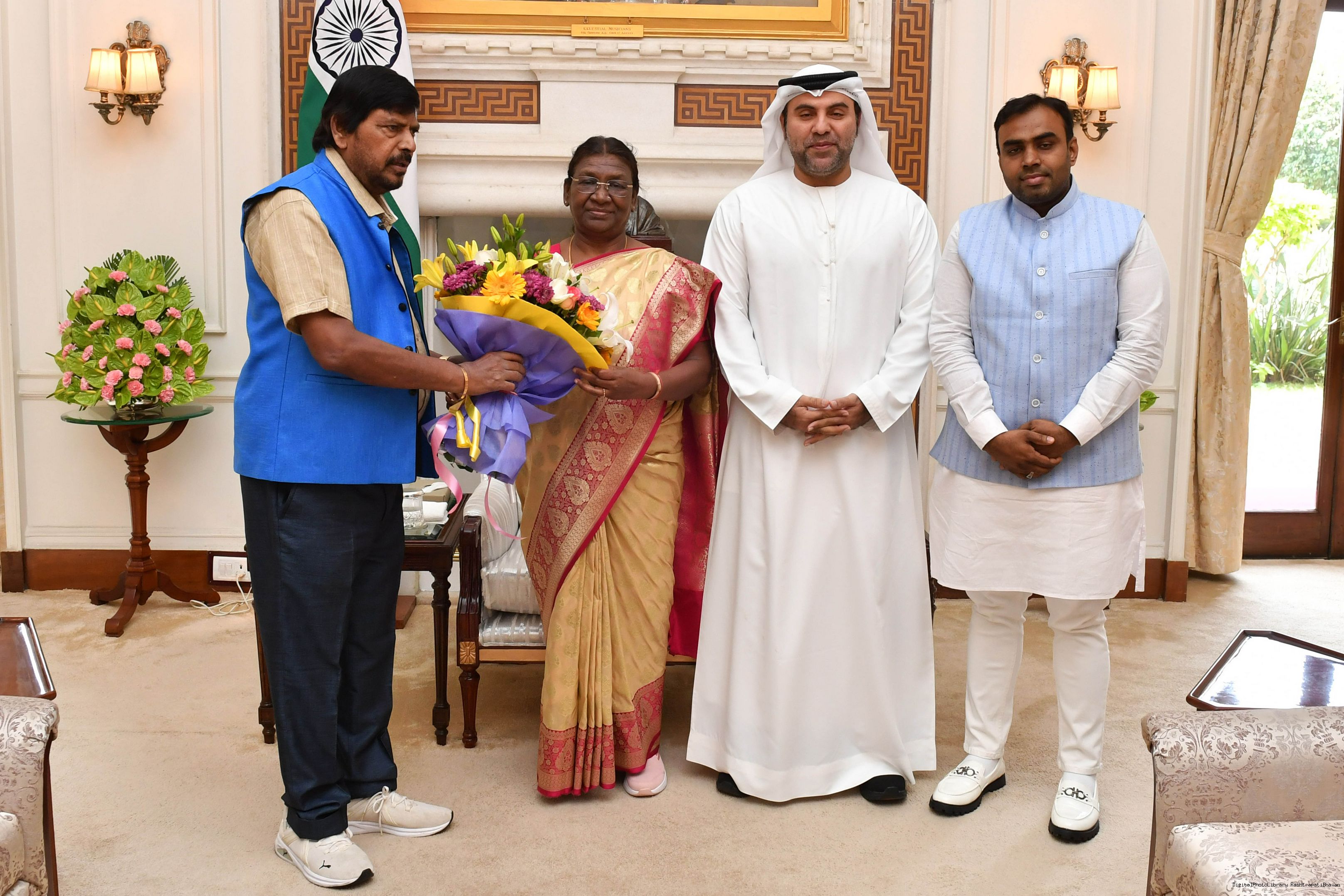 | Caption: | The Union Minister of Social Justice and Empowerment, Shri Ramdas Athawale along with Shri Bu Abdullah and Dr. Thousif Pasha calling on the President of India, Smt. Droupadi Murmu at Rashtrapati Bhavan on July 11, 2023. |