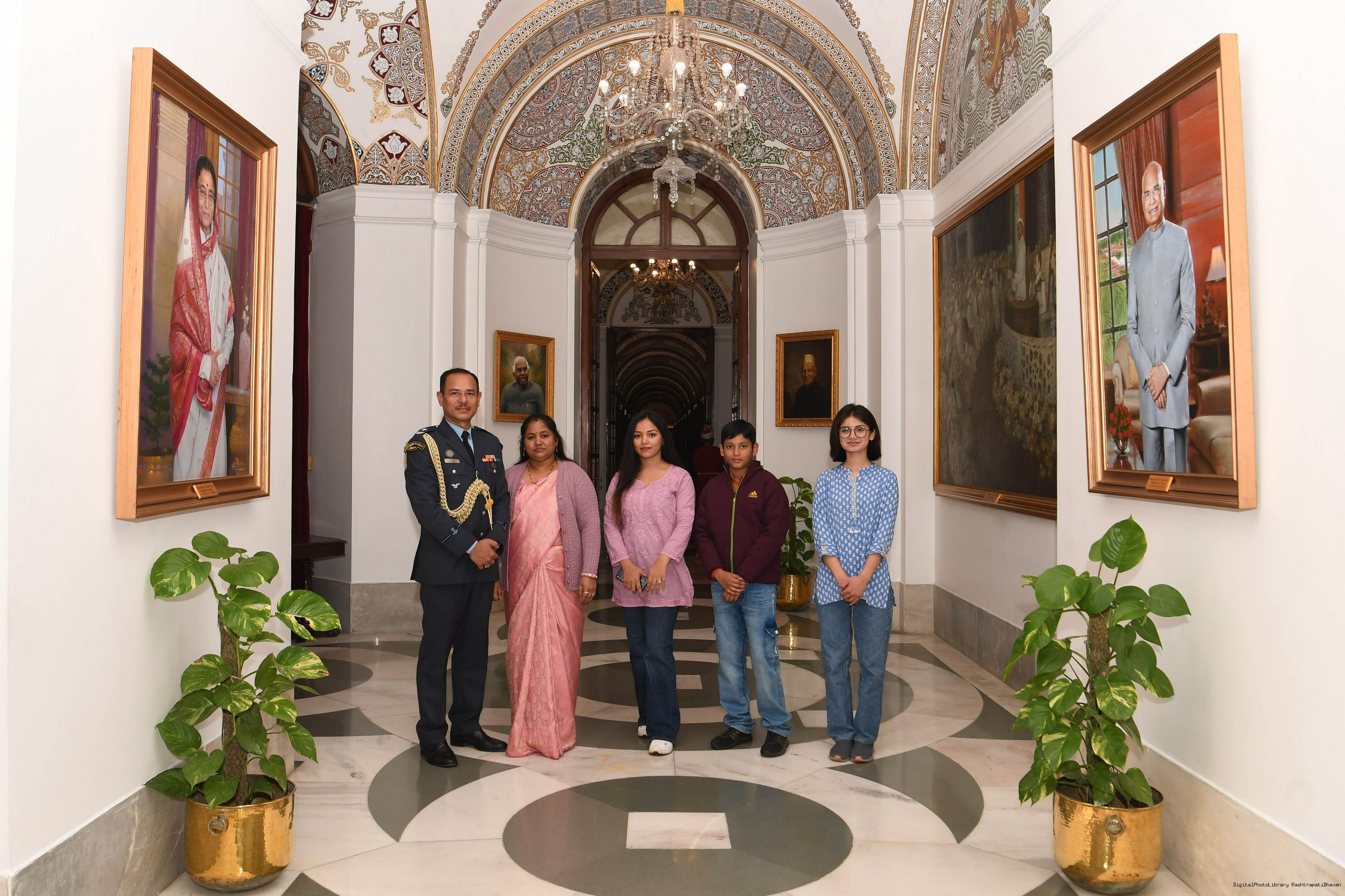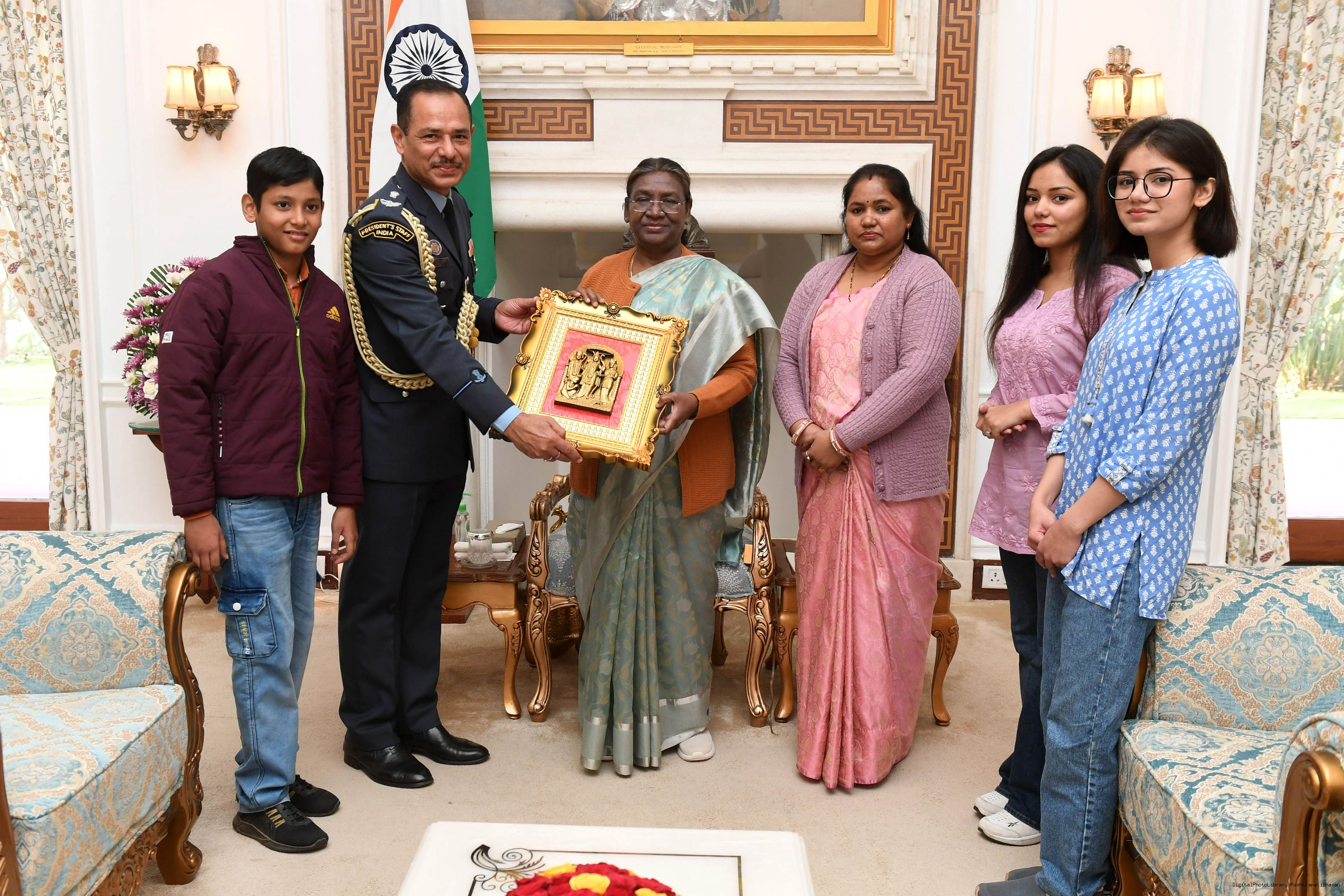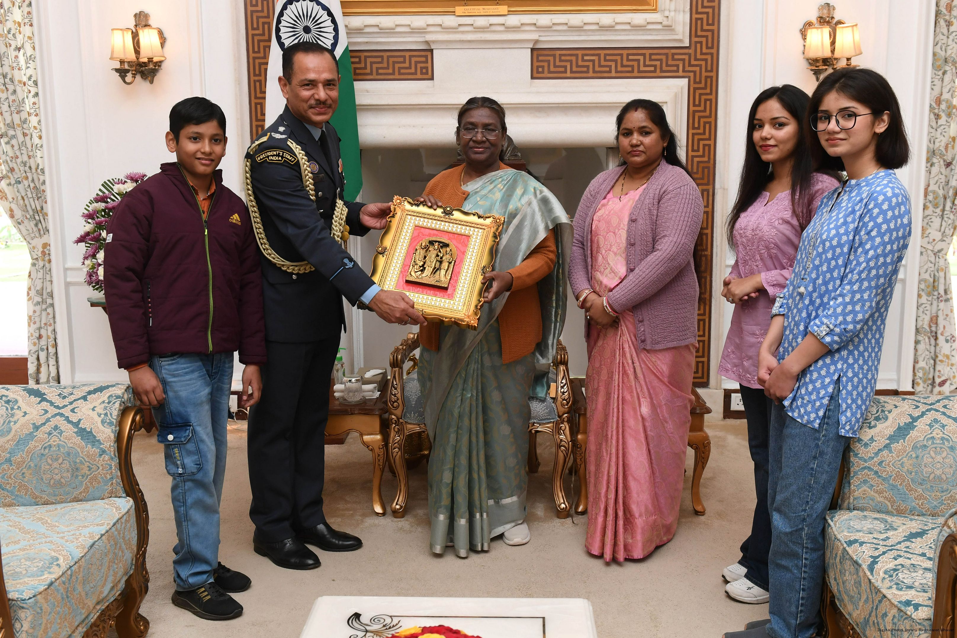 | Caption: | MWO Bhupendra singh JCO ADC along with Family members meeting with the President of India, Smt Droupadi Murmu at Rashtrapati Bhavan on February 11, 2024 |
