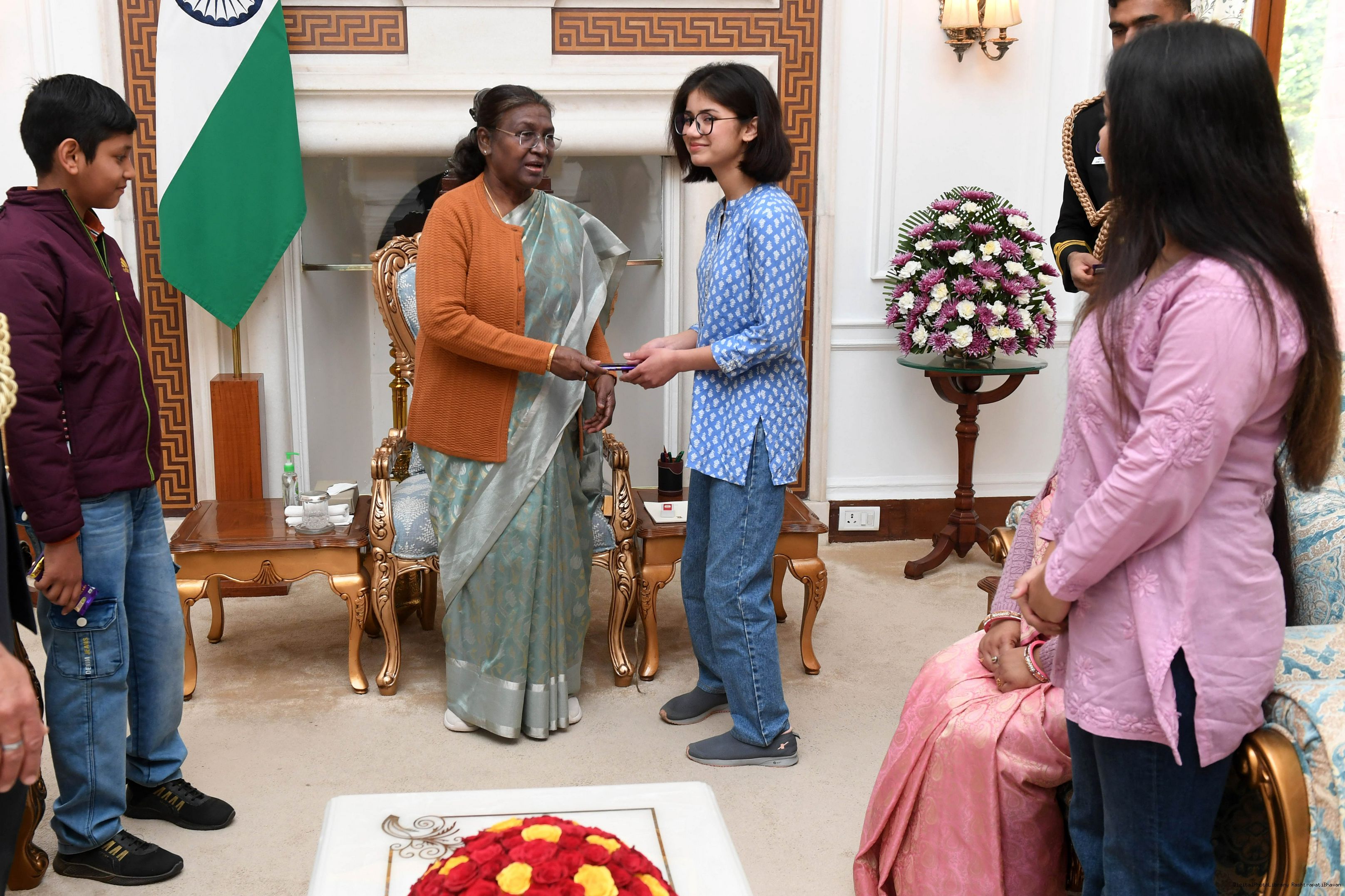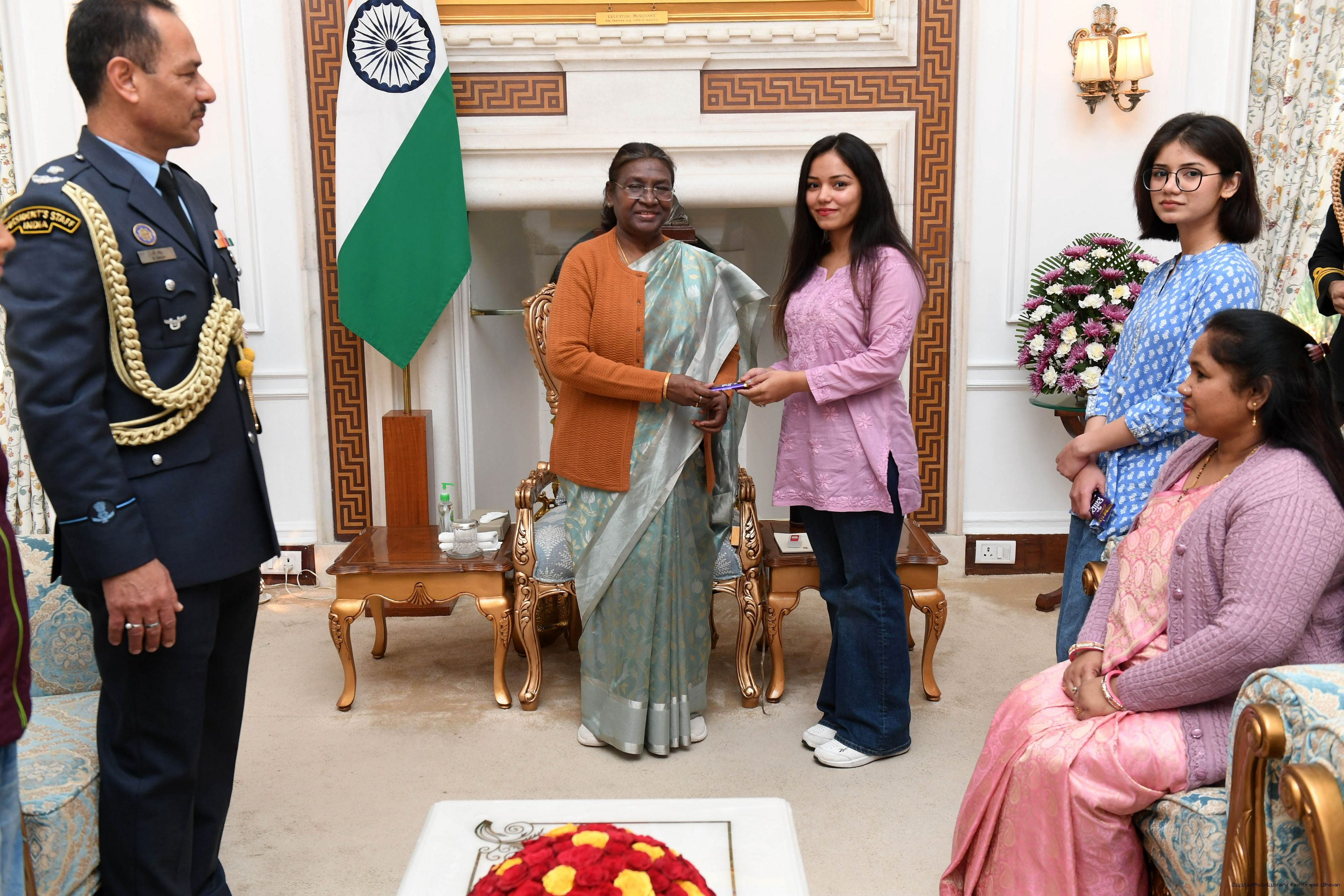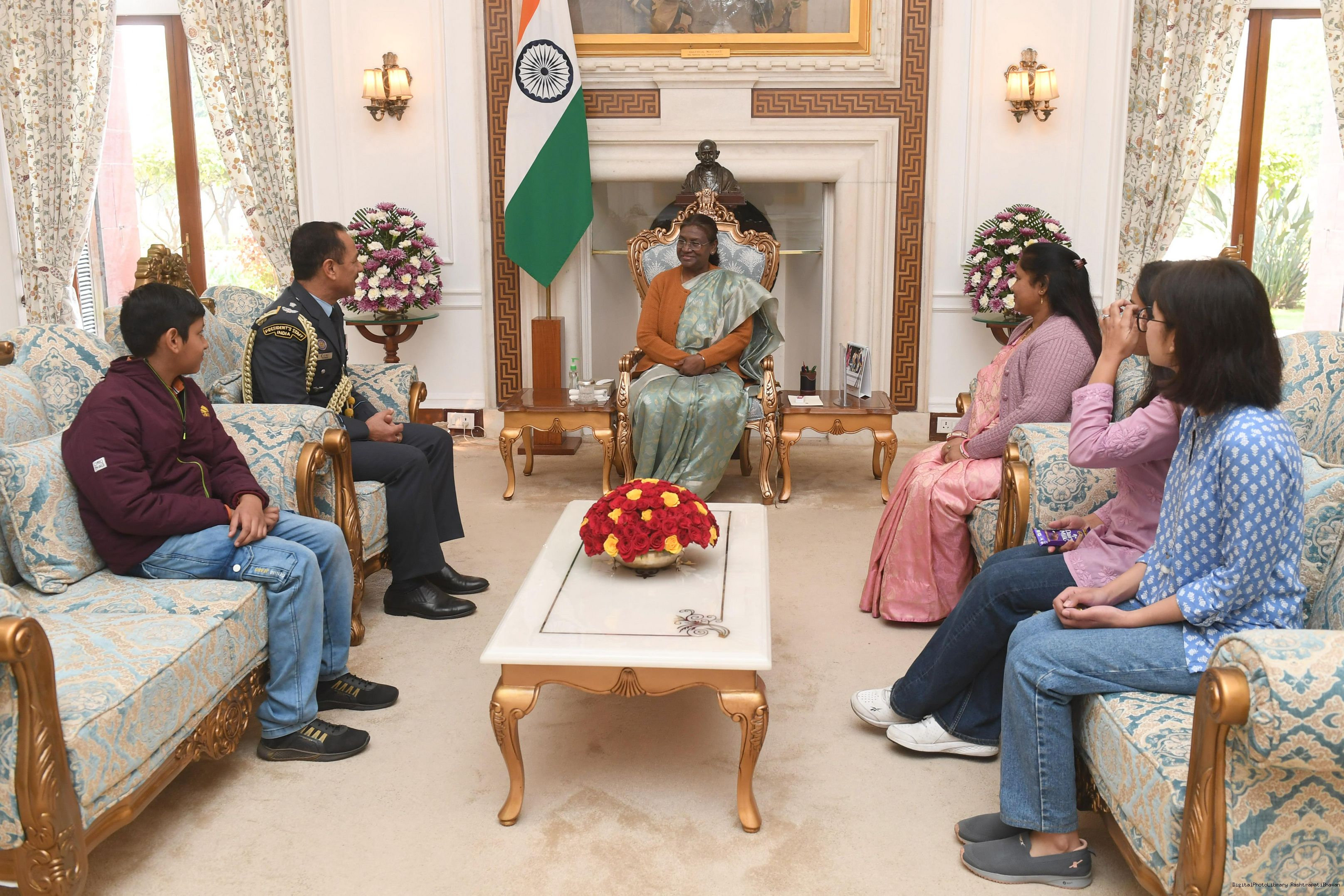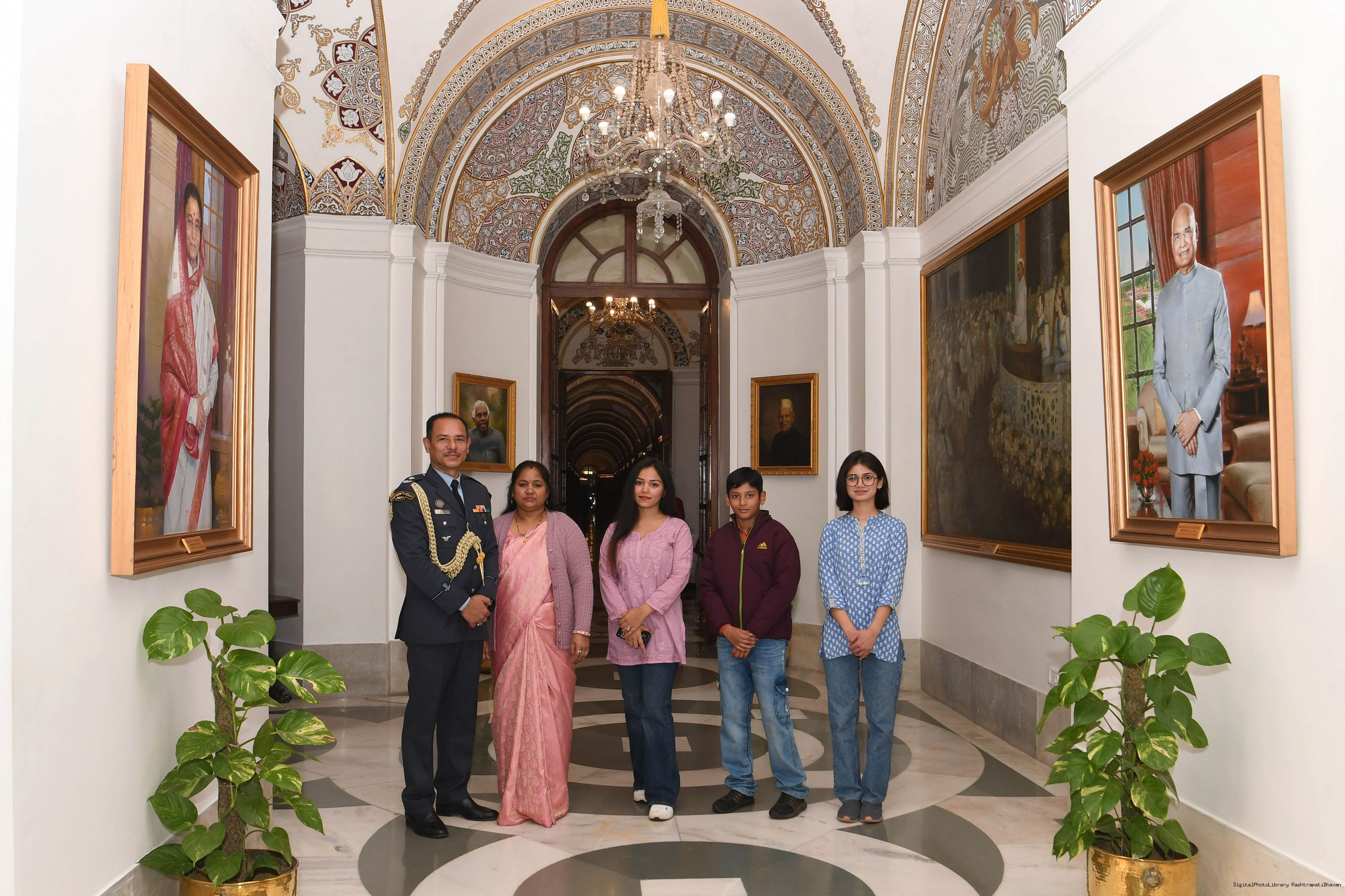 | Caption: | MWO Bhupendra singh JCO ADC along with Family members meeting with the President of India, Smt Droupadi Murmu at Rashtrapati Bhavan on February 11, 2024 |