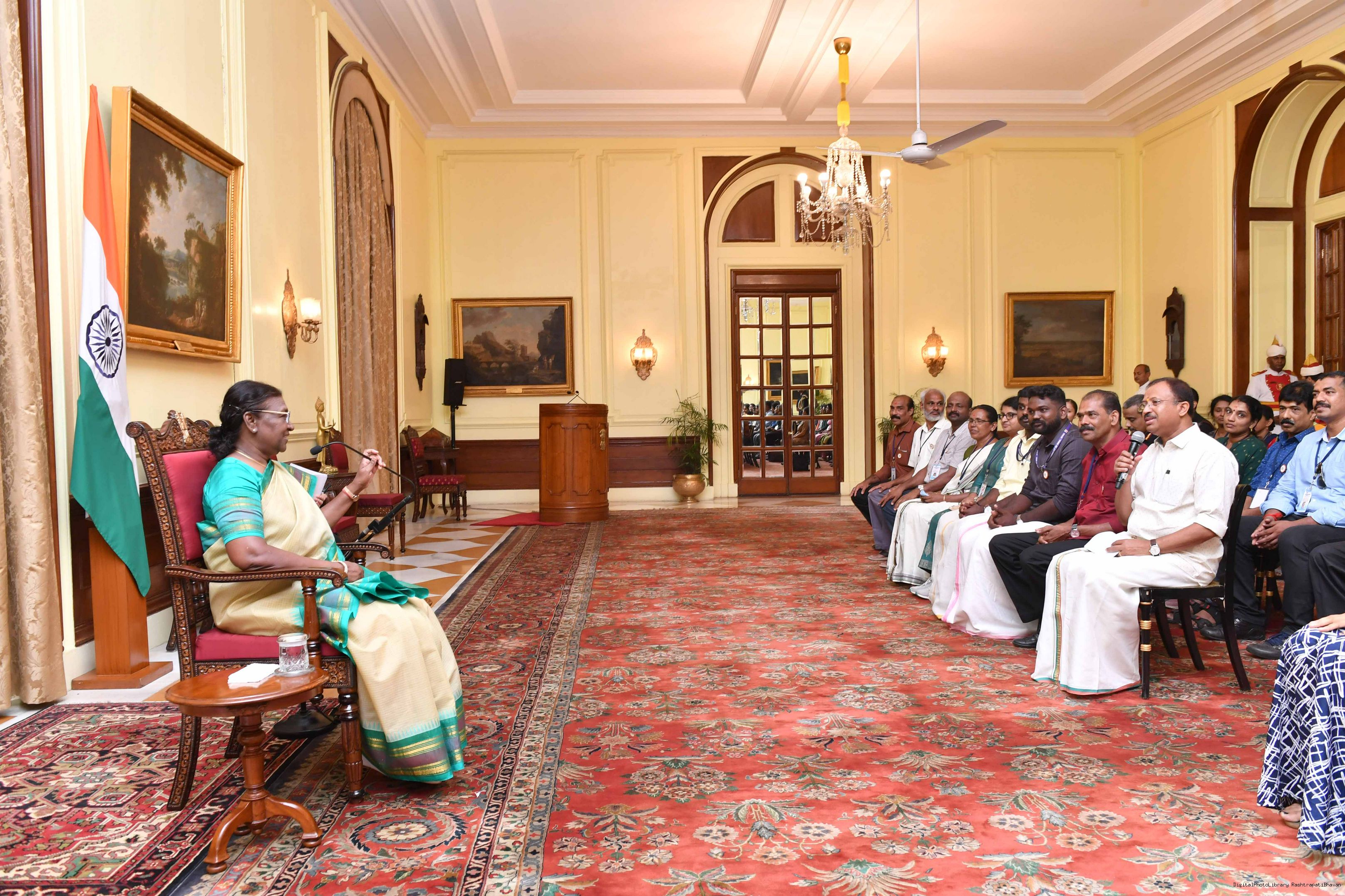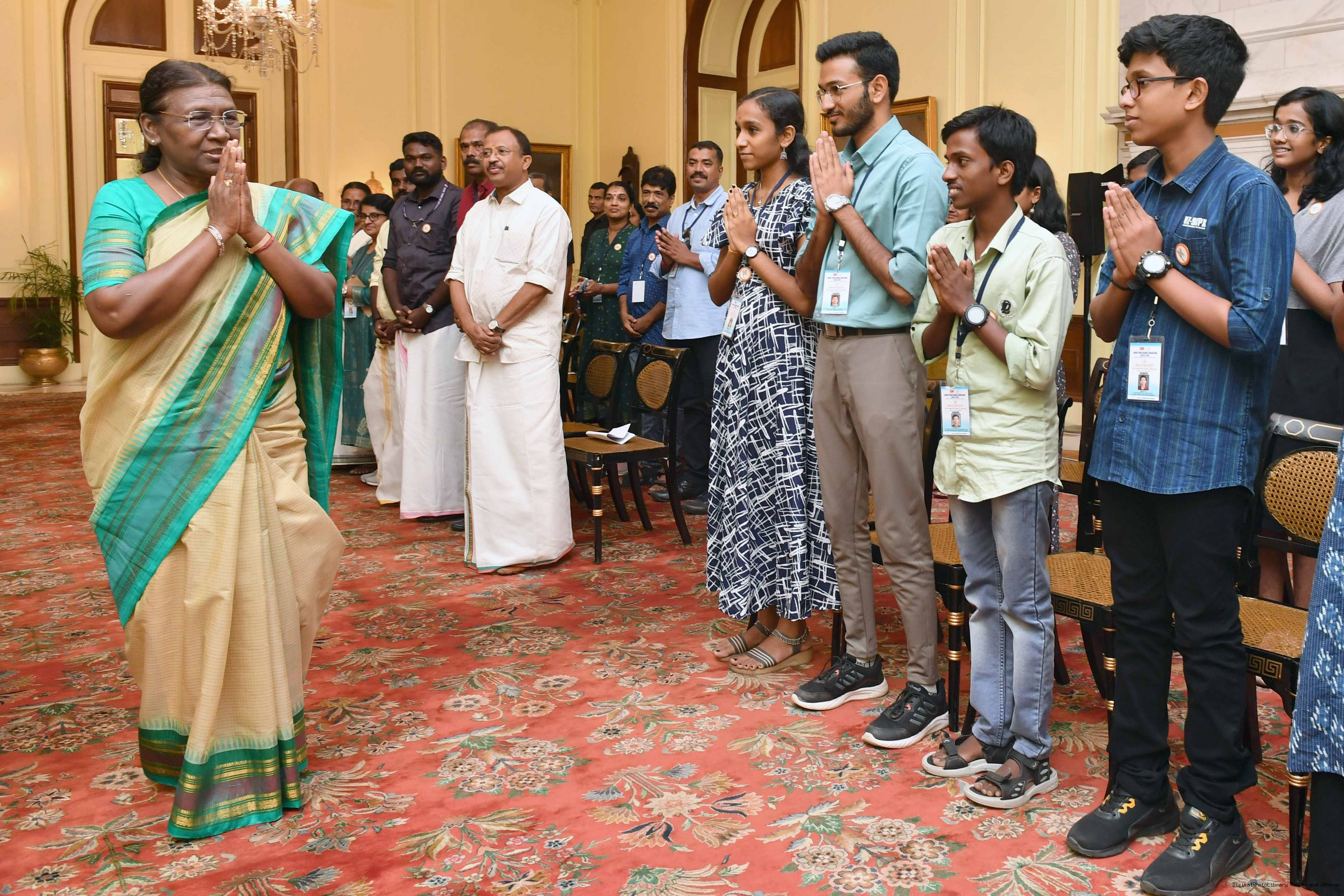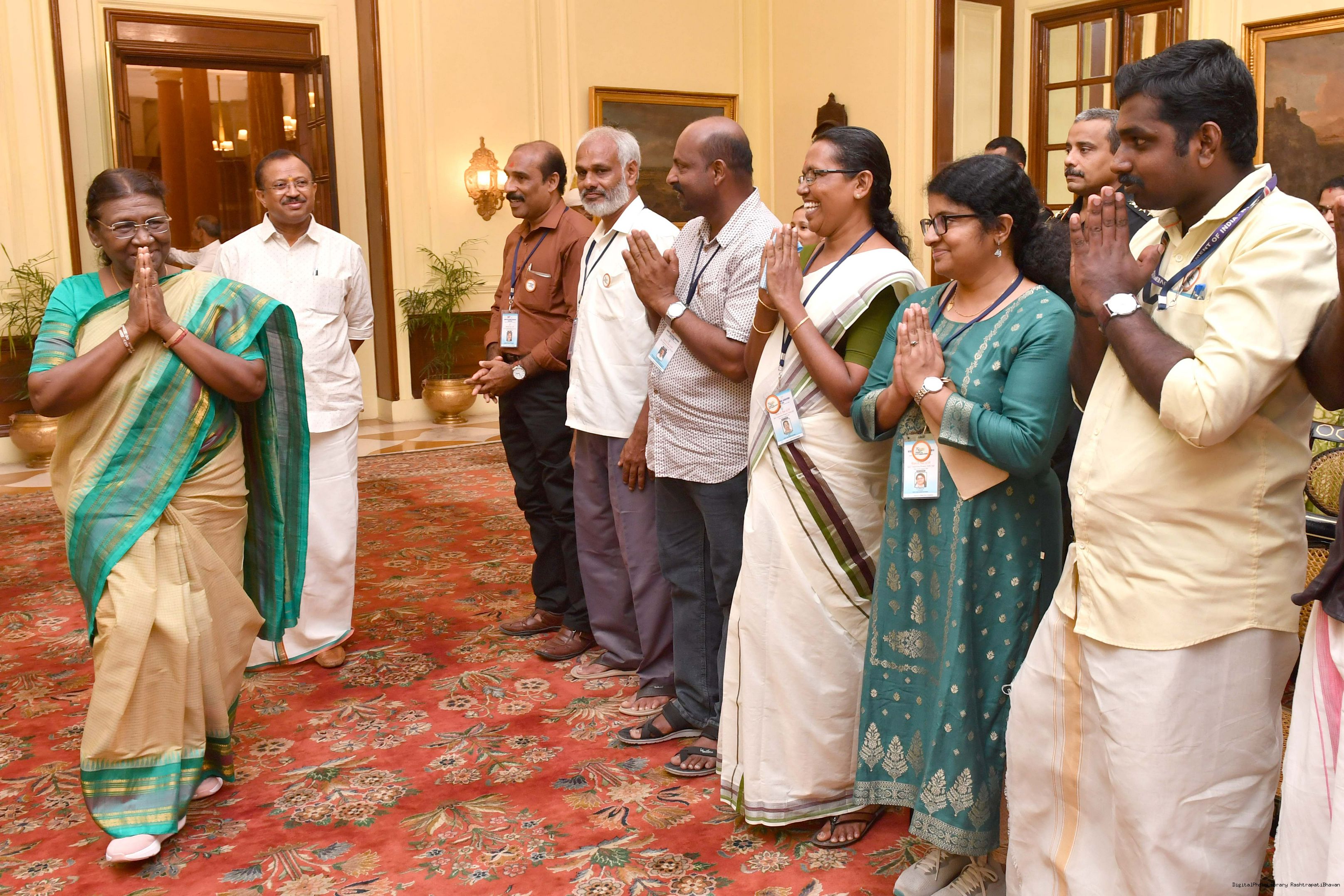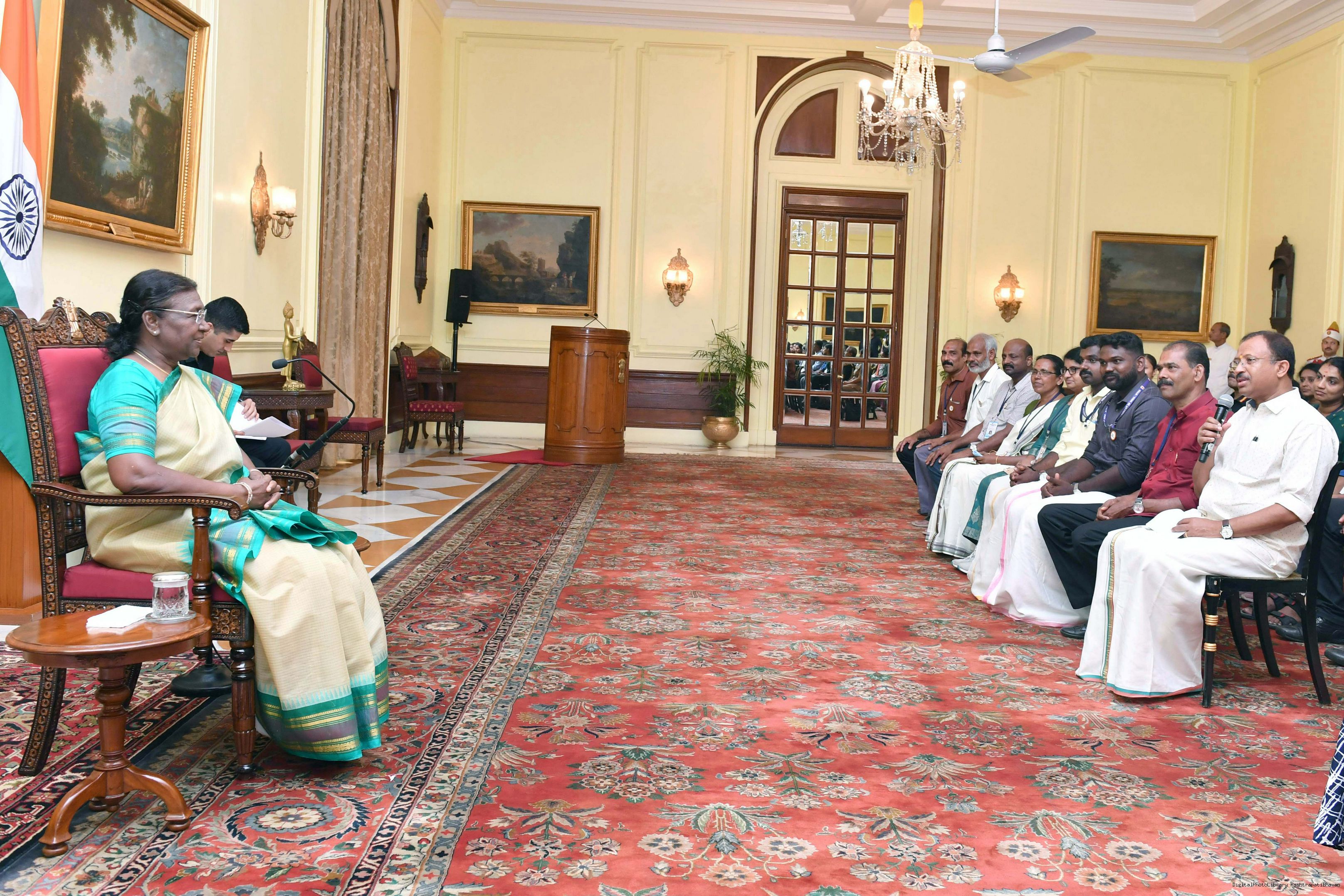 | Caption: | MoS for External Affairs MoS for Parliamentary Affairs, Shri V Muraleedharan along with others called on the President of India, Smt. Droupadi Murmu at Rashtrapati Bhavan on August 14, 2023. |