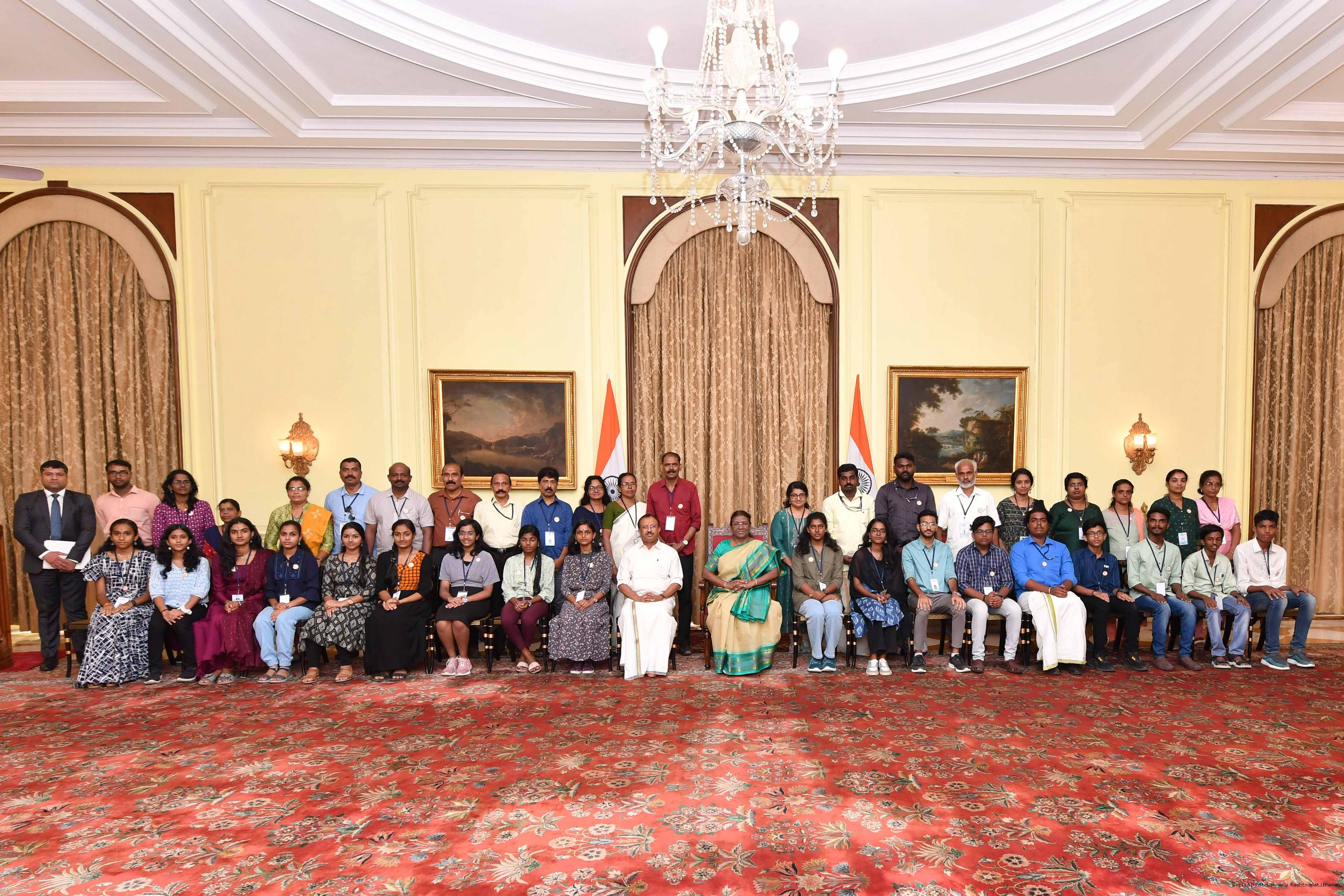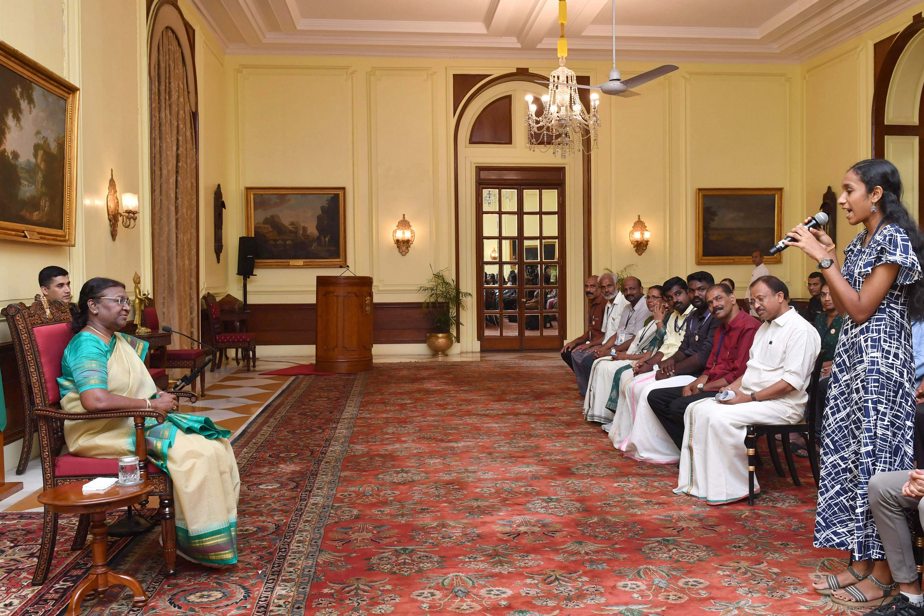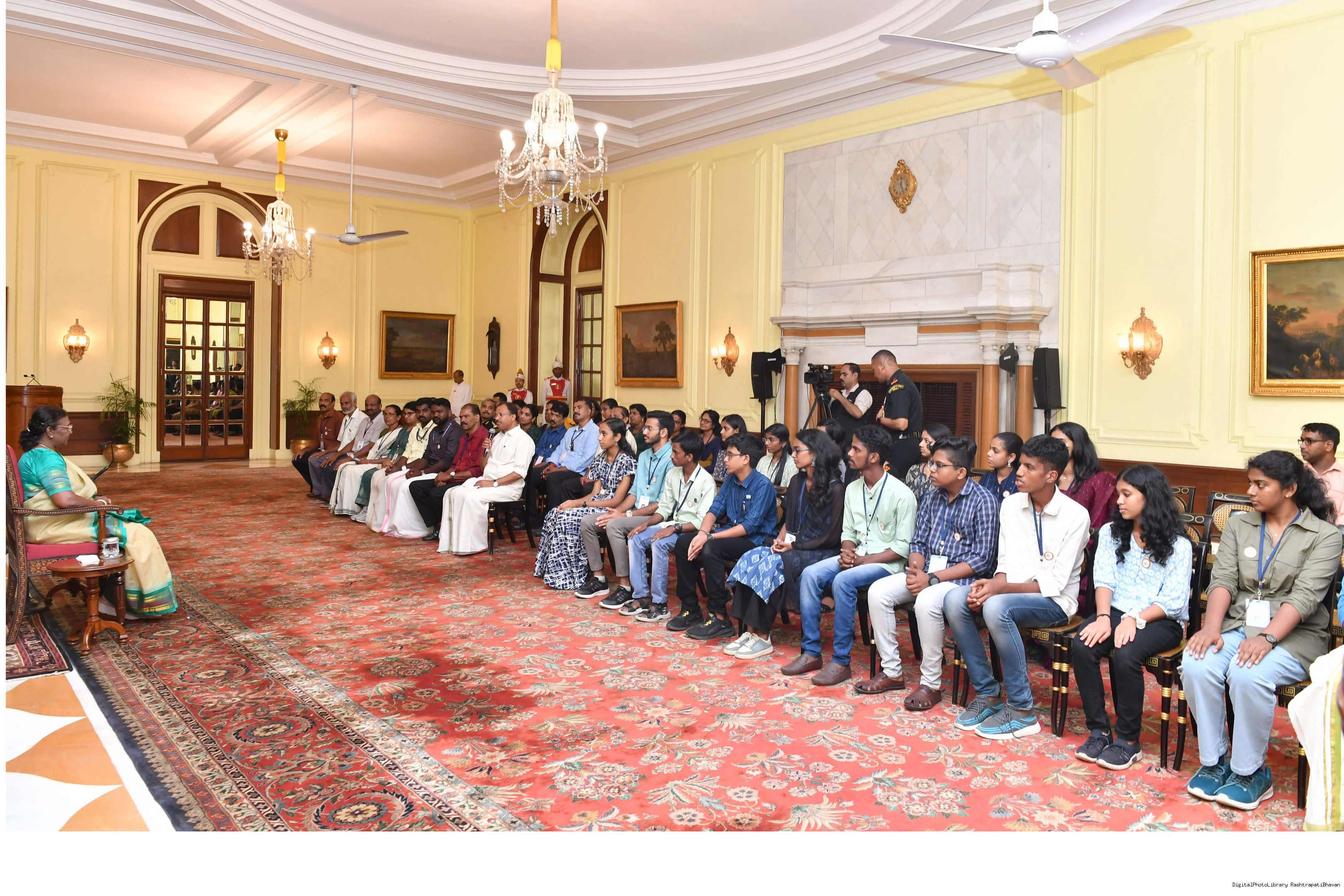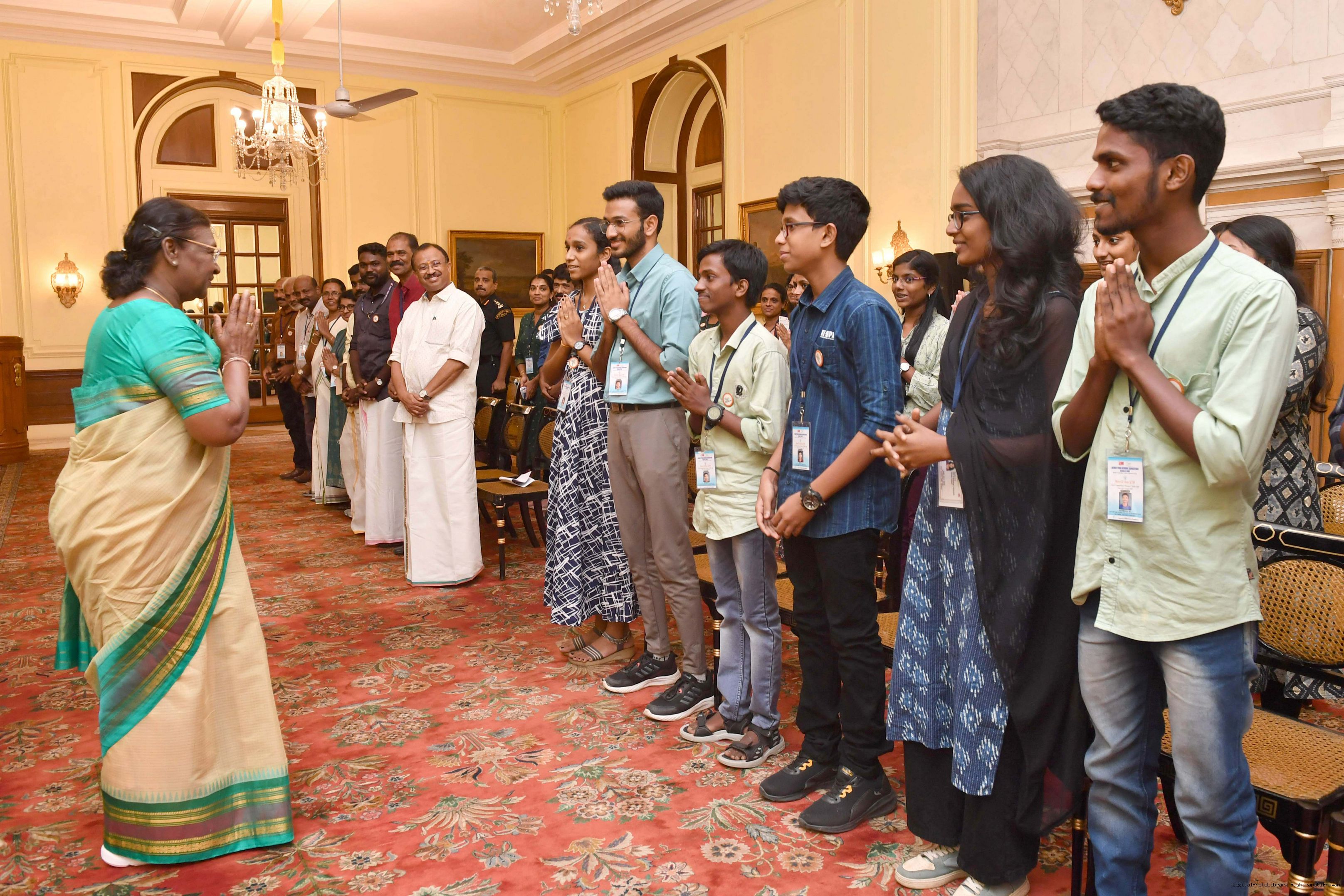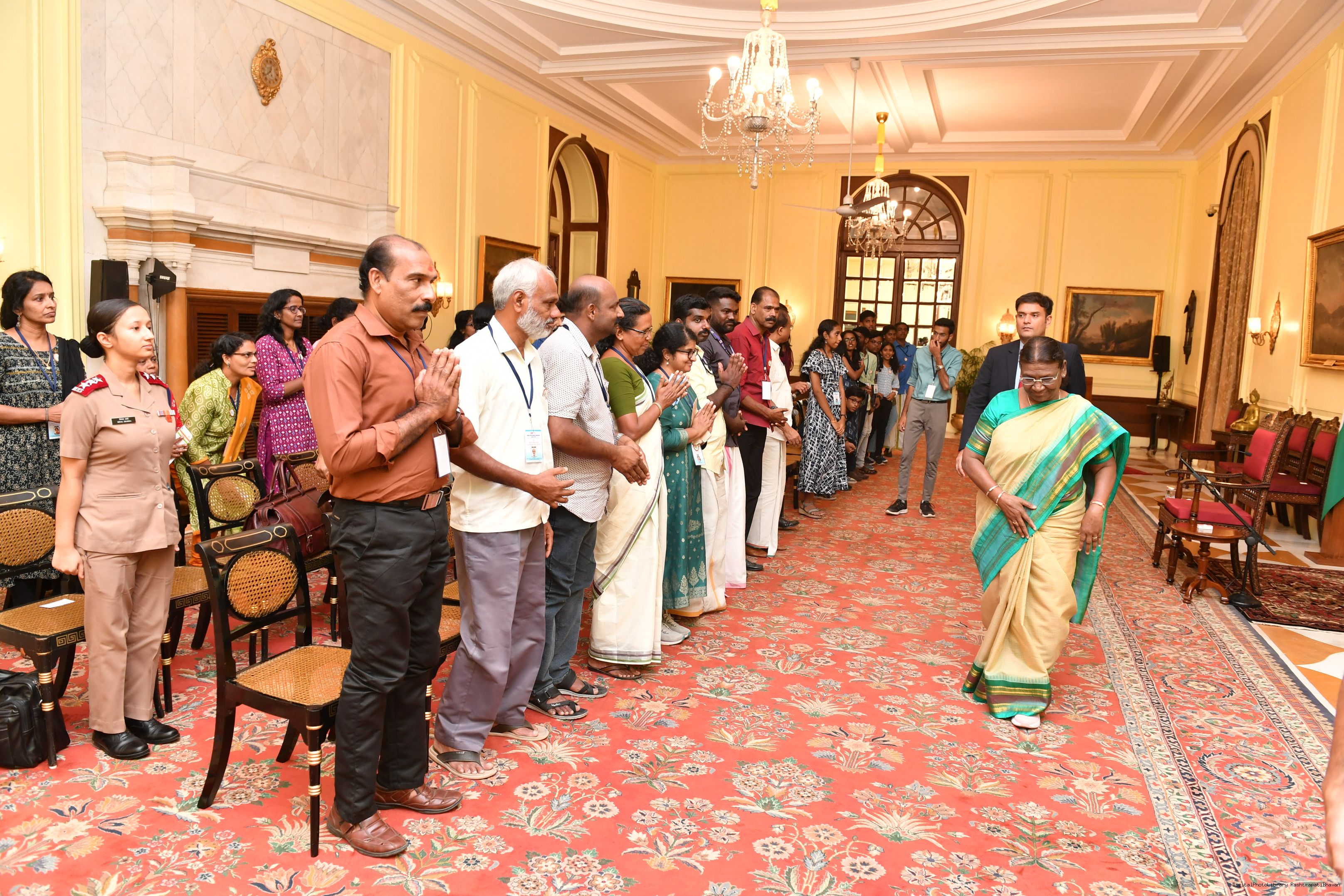 | Caption: | MoS for External Affairs MoS for Parliamentary Affairs, Shri V Muraleedharan along with others called on the President of India, Smt. Droupadi Murmu at Rashtrapati Bhavan on August 14, 2023. |