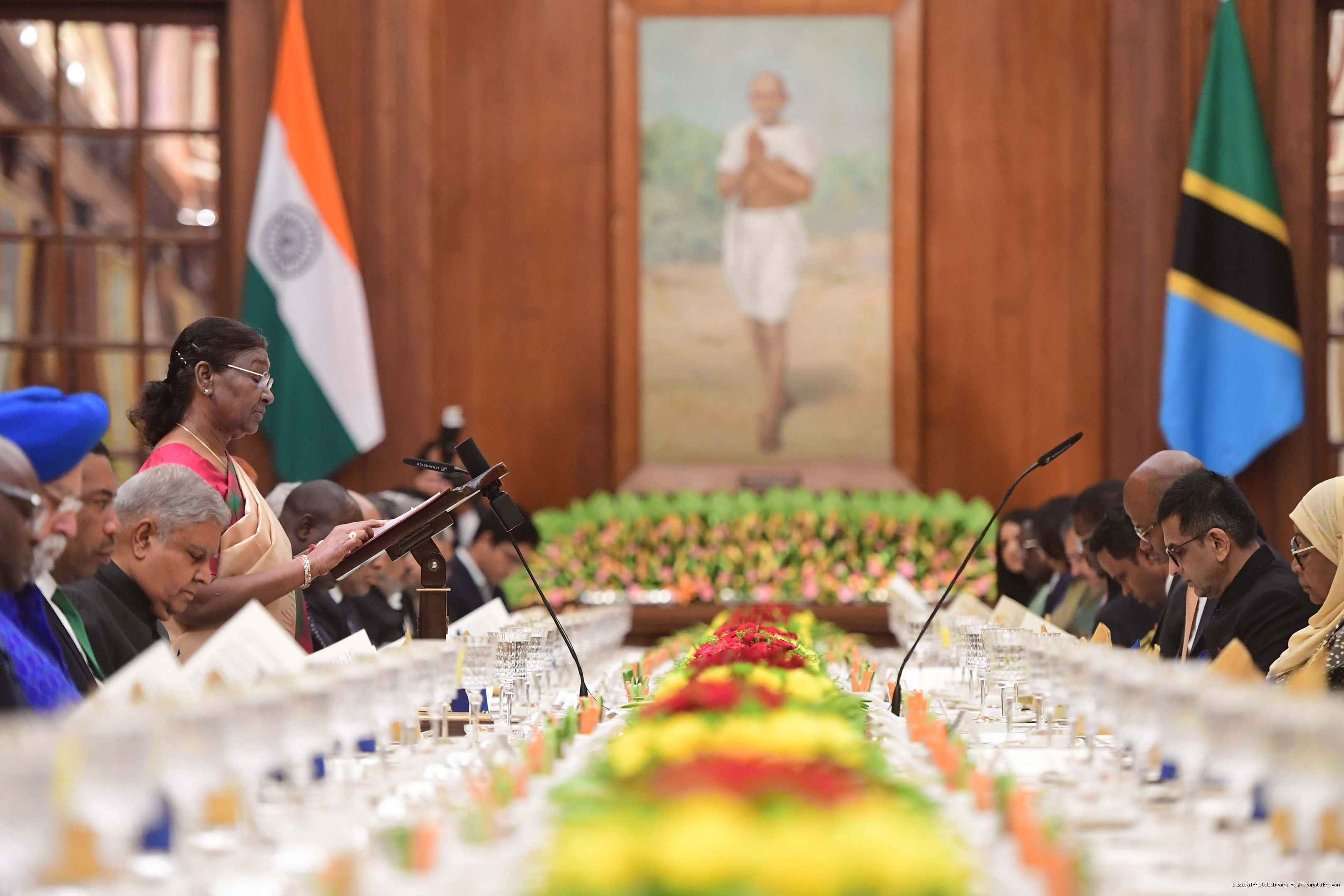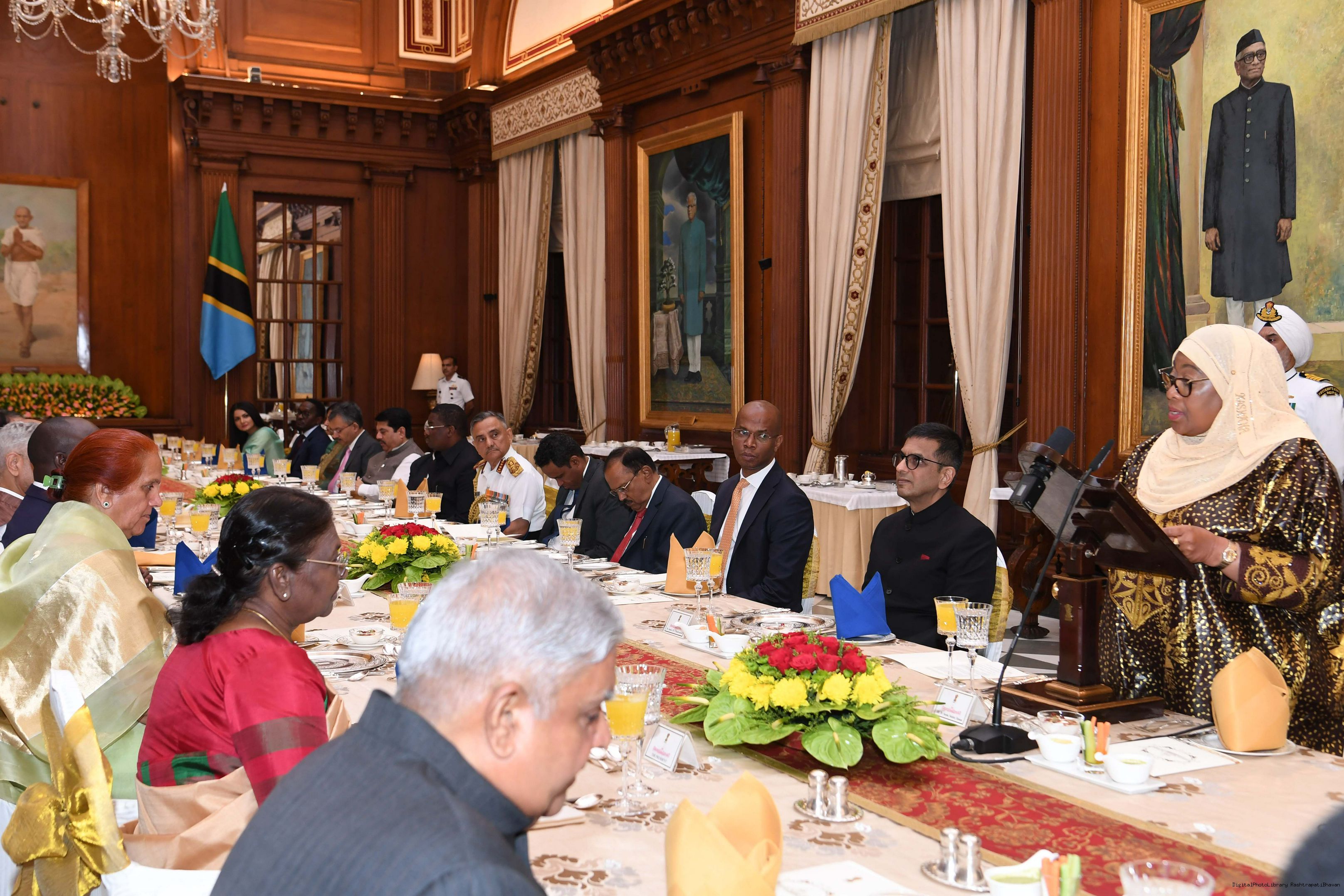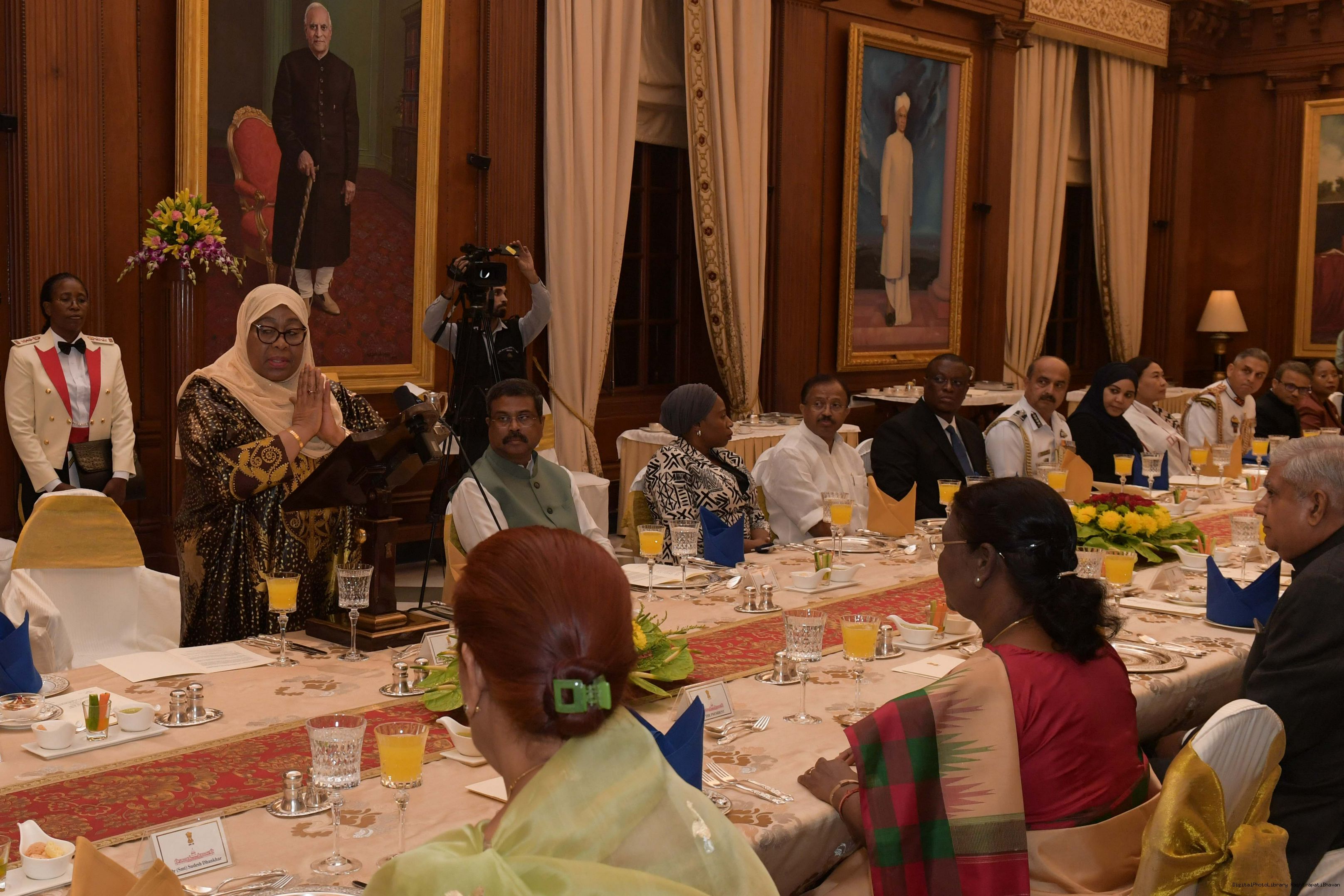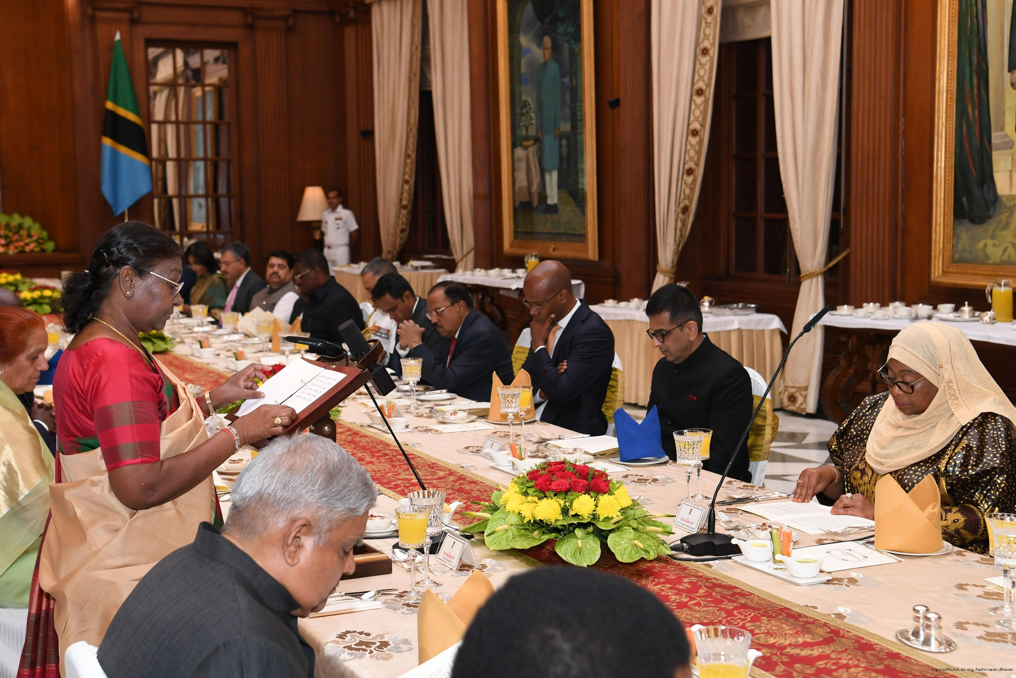 | Caption: | The President of India, Smt. Droupadi Murmu hosting a Banquet in honour H.E. Dr Samia Suluhu Hassan, the President of the United Republic of Tanzania at Rashtrapati Bhavan on October 09, 2023. |