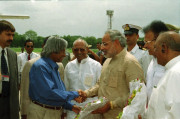 | Caption: | The President of India, Dr A P J Abdul Kalam being welcomed by the Governor of Gujarat, Shri Sunder Singh Bhandari and Chief Minister of Gujarat, Shri Narendra Modi at Ahmedabad Airport in Gujarat on Aug 12, 2002 |