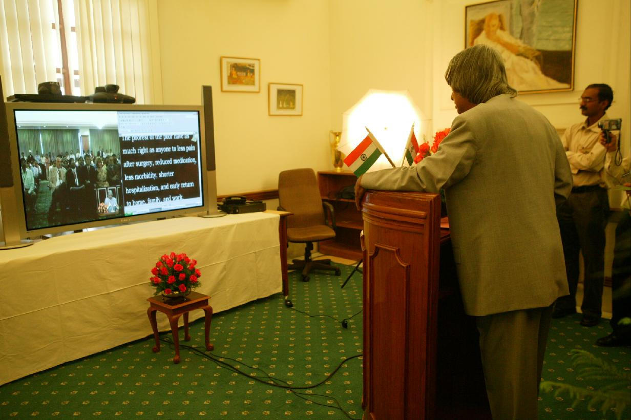 | Caption: | The President of India, Dr A P J Abdul Kalam participating in the Sixth Annual Convention of South Asian Society for Atherosclerosis and Thrombosis (through Video Conferencing) at the IT Room of Rashtrapati Bhavan in New Delhi on Oct 30, 2004 |
