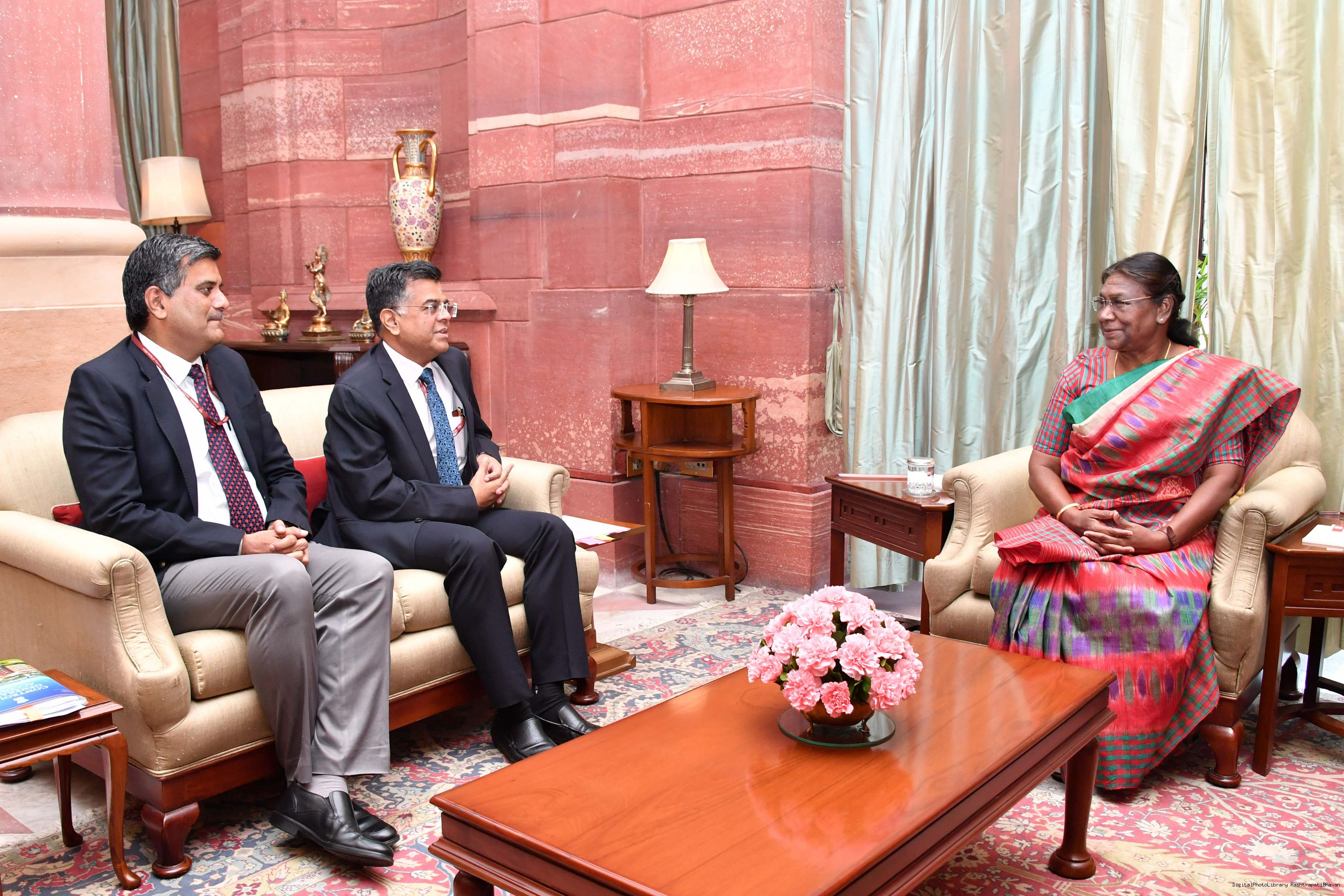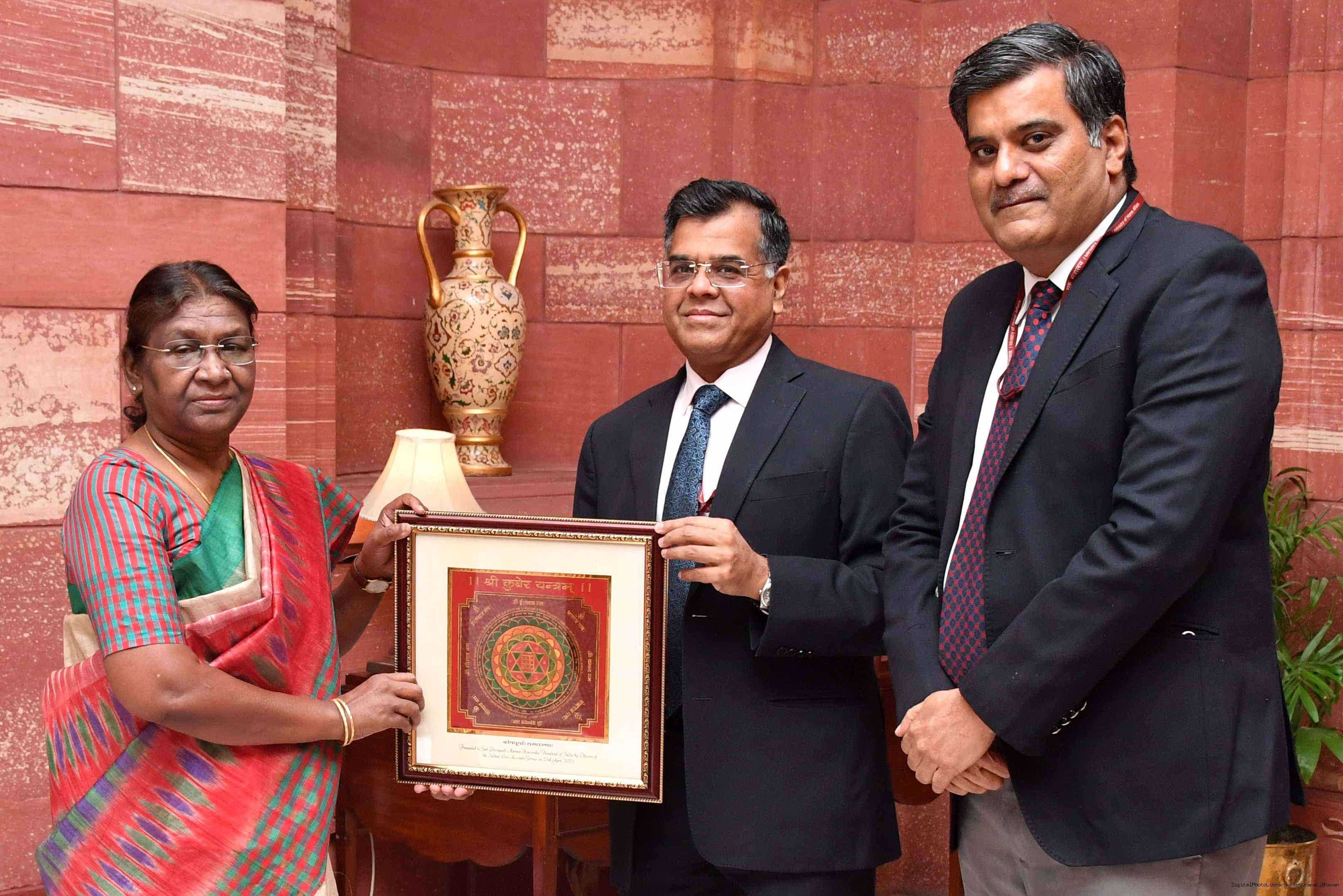 | Caption: | Shri T.V. Somanathan, Finance Secretary, Shri Shyam S. Dubey, Controller General of Accounts (CGA) along with Secretary to the President and Military Secretary to the President meeting with the President of India Smt. Droupadi Murmu at Rashtrapati Bhavan on April 25, 2023. |