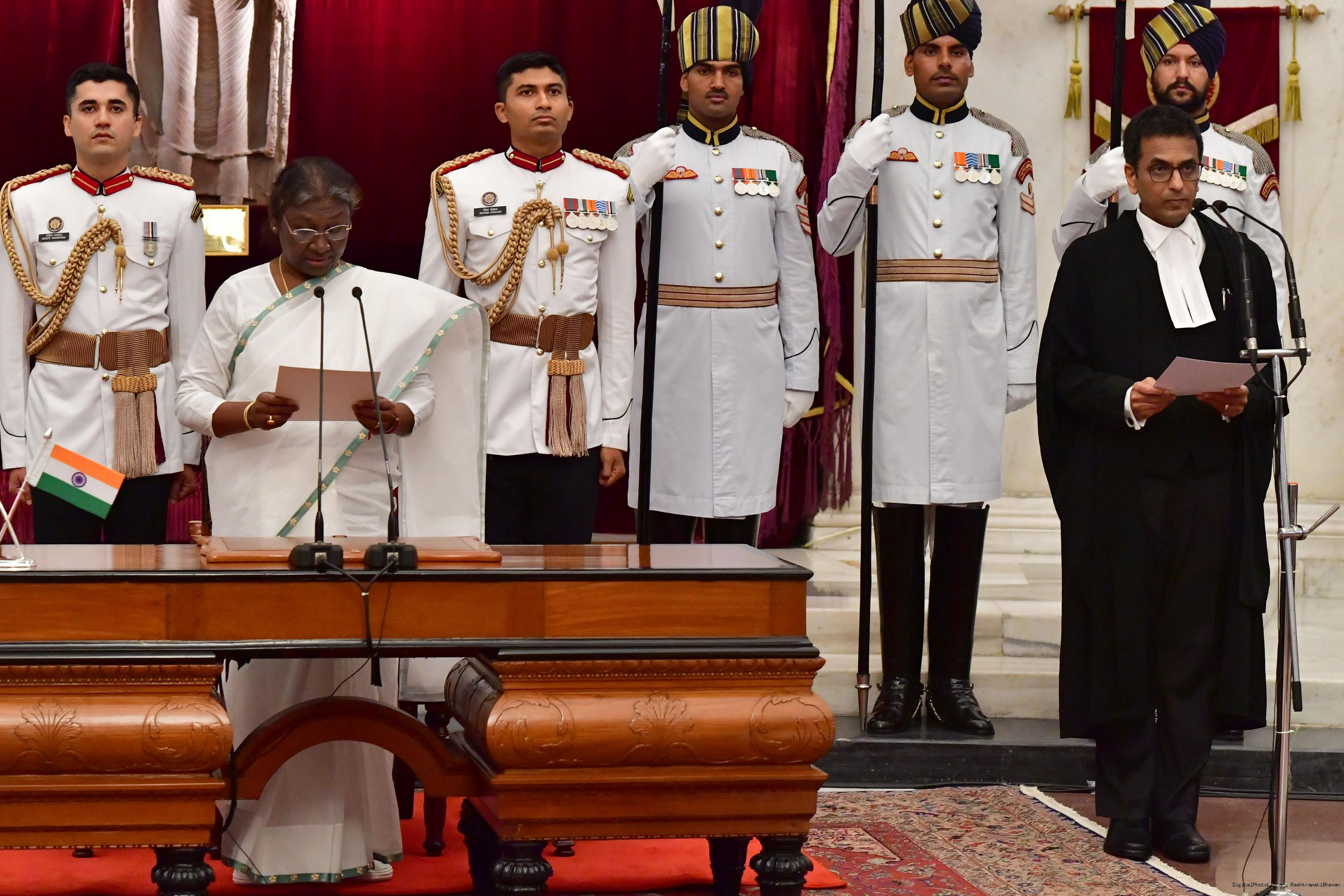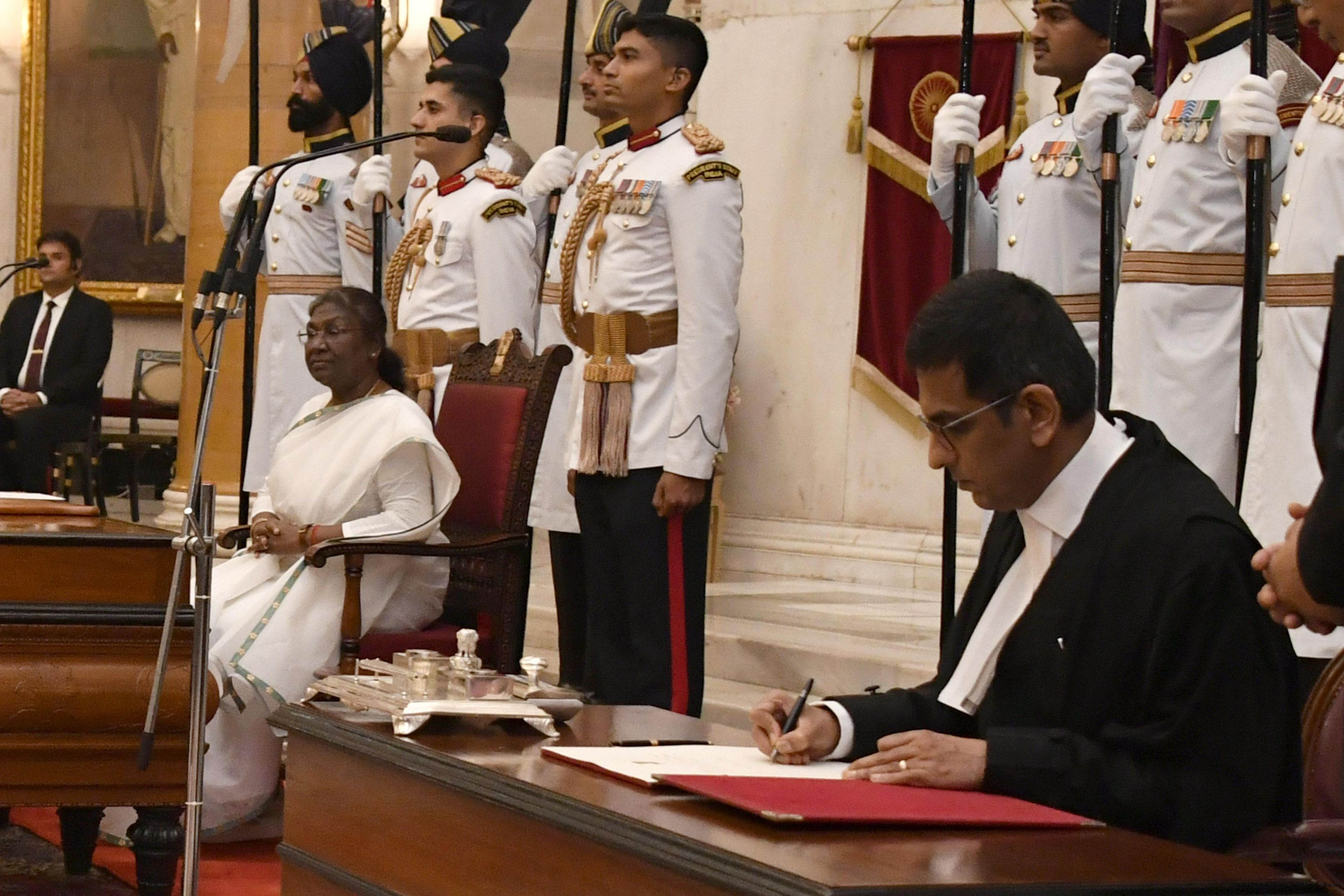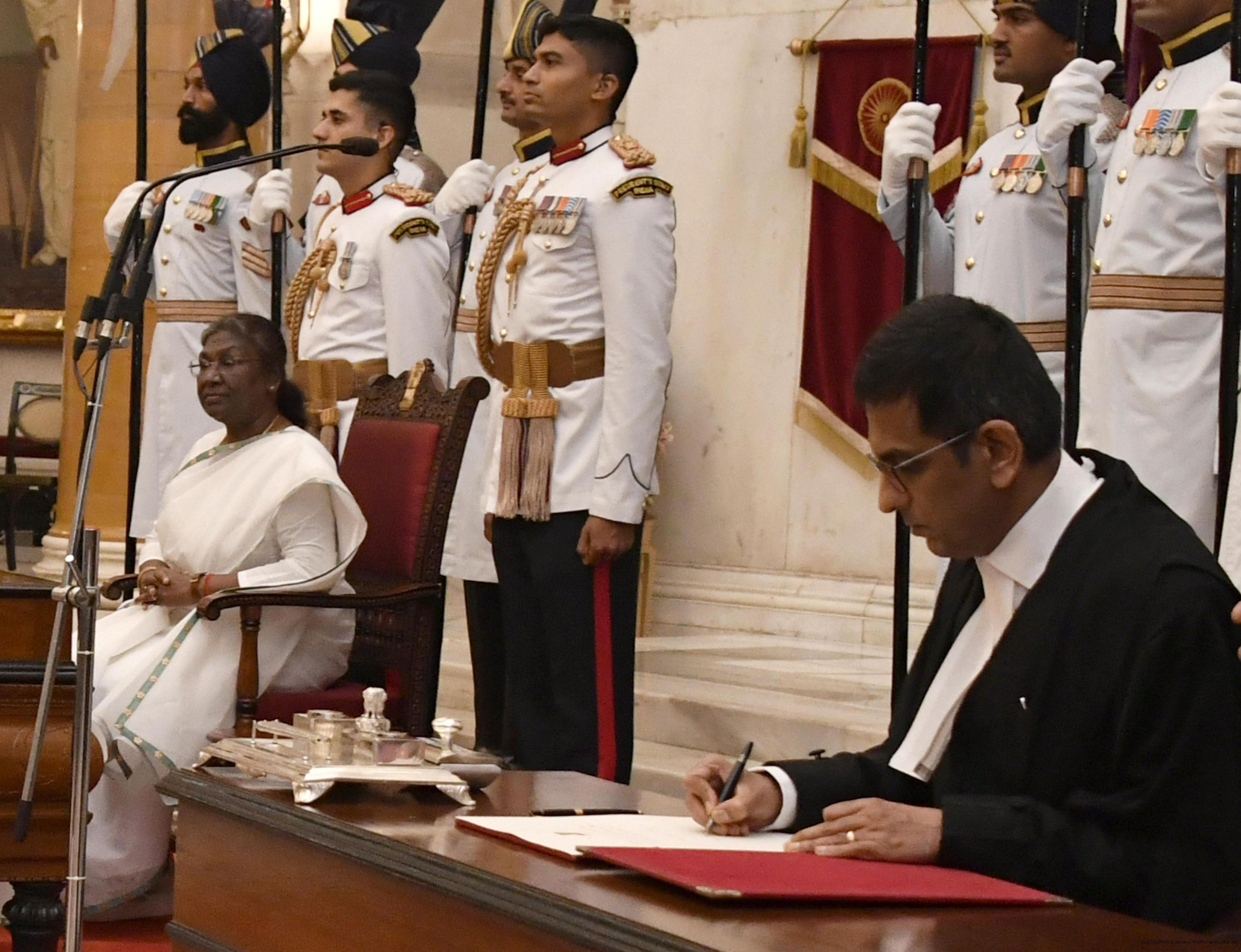 | Caption: | The President of India, Smt. Droupadi Murmu administered the oath of office to Dr. Justice Dhananjaya Yashwant Chandrachud as the Chief Justice of the Supreme Court of India, at a Swearing-in-Ceremony, in Rashtrapati Bhavan on November 09, 2022. |
