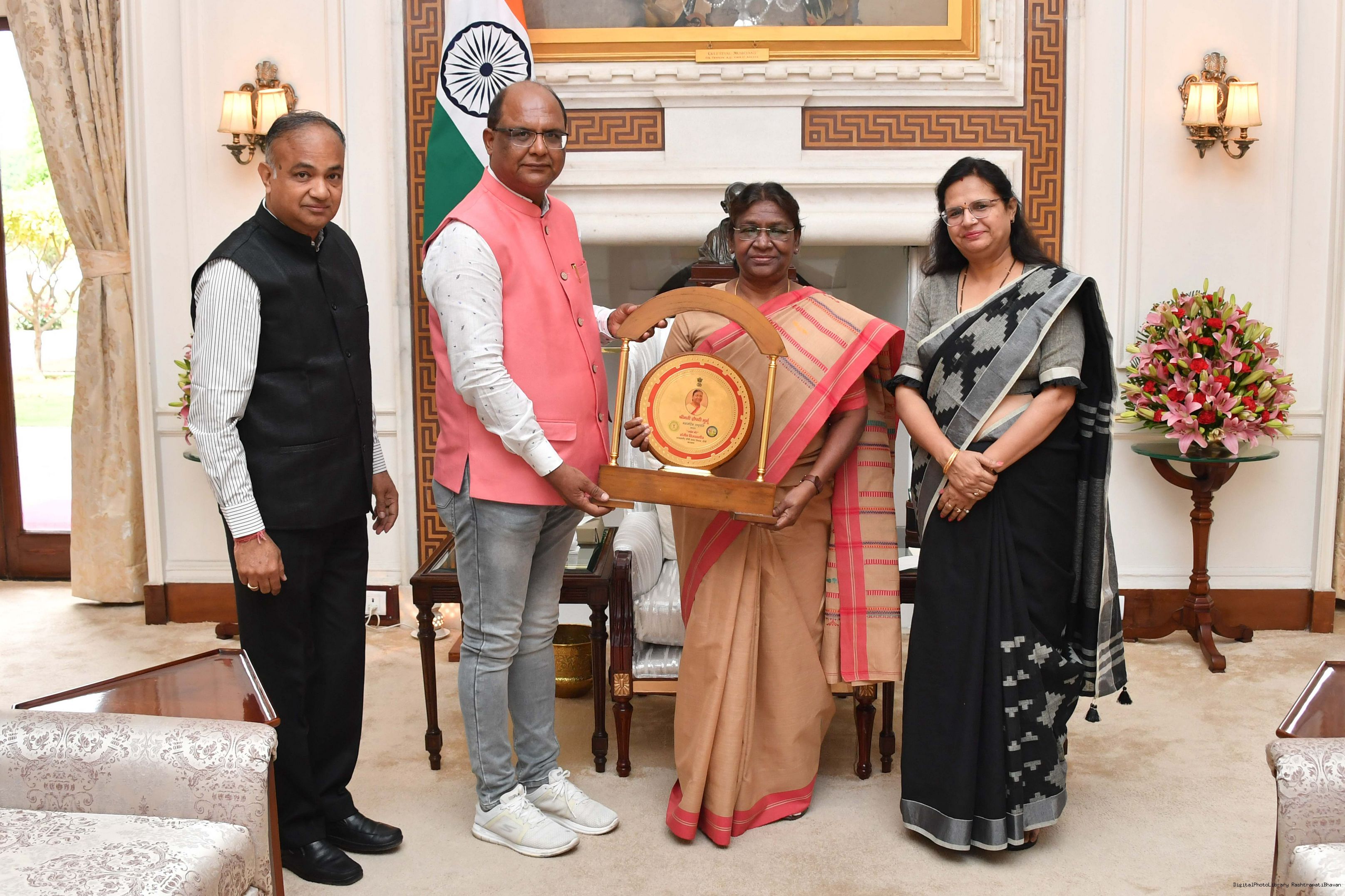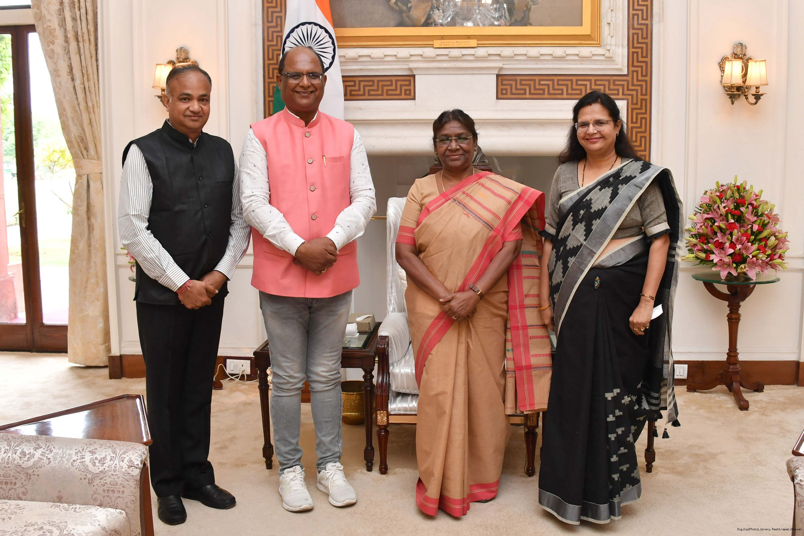 | Caption: | Shri Sanjeev Vijayvargiya, Dy Mayor, Ranchi Municipal Corporation, Ranchi along with his sister Smt. Mamta Chaudhary her husband Shri Santosh Chaudhary meeting with the President of India, Smt. Droupadi Murmu at Rashtrapati Bhavan on April 26, 2023 |