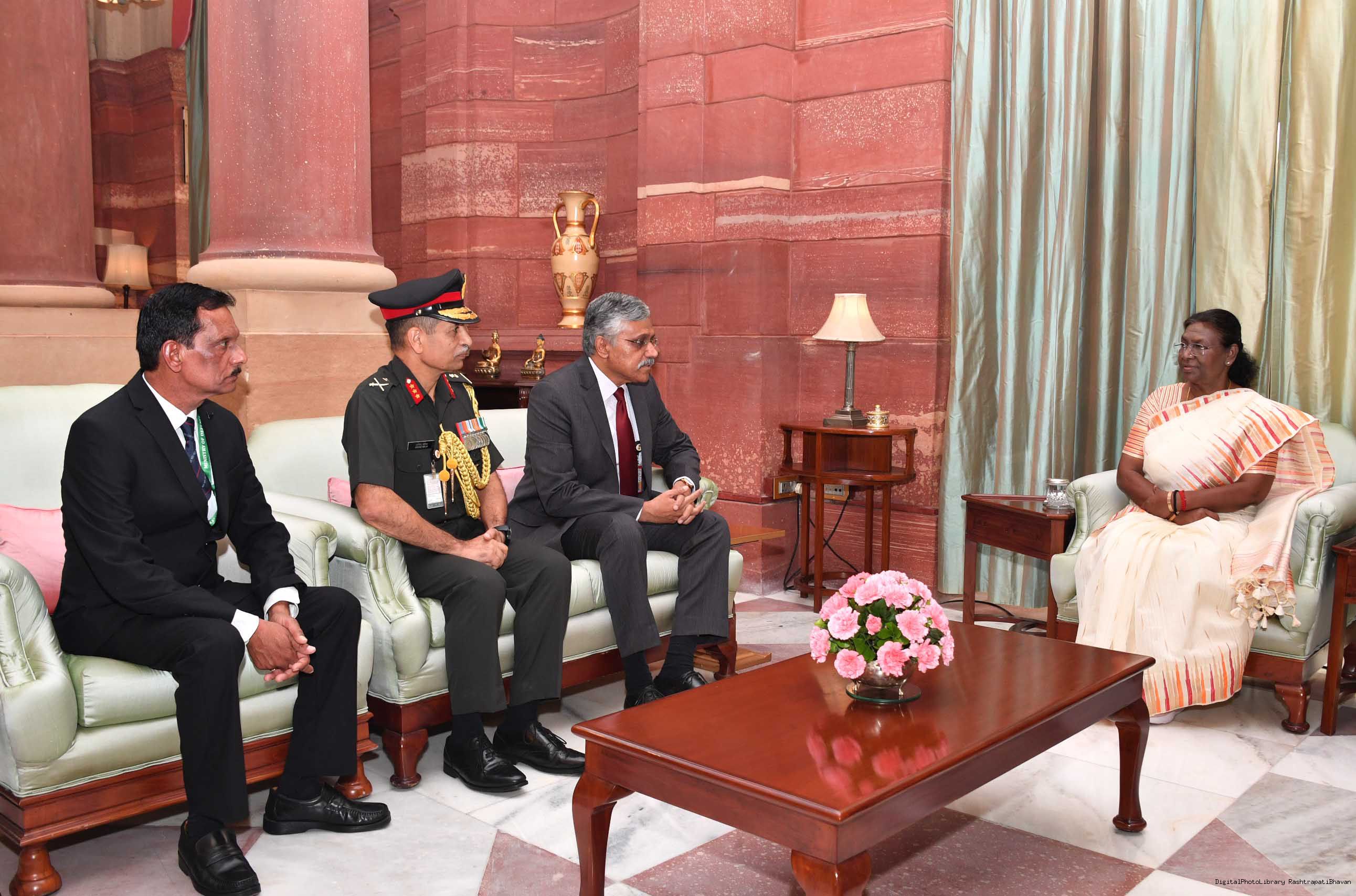 | Caption: | Shri Giridhar Aramane, Defence Secretary, Lt. Gen Arvind Walia, E-in-C and Shri L.C. Meena, DG (Pers) along with others meeting with the President of India Smt. Droupadi Murmu at Rashtrapati Bhavan on November 3, 2023. |