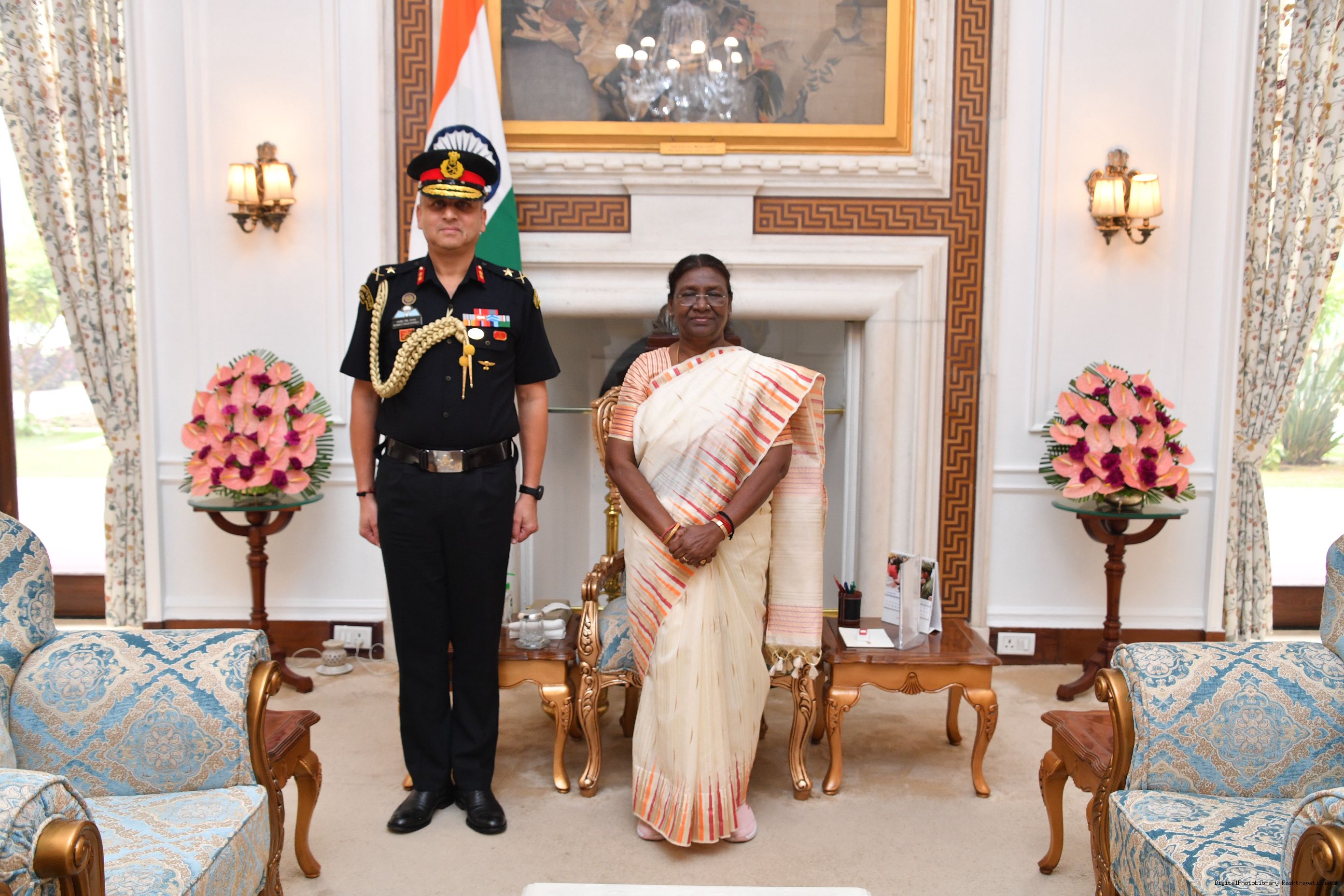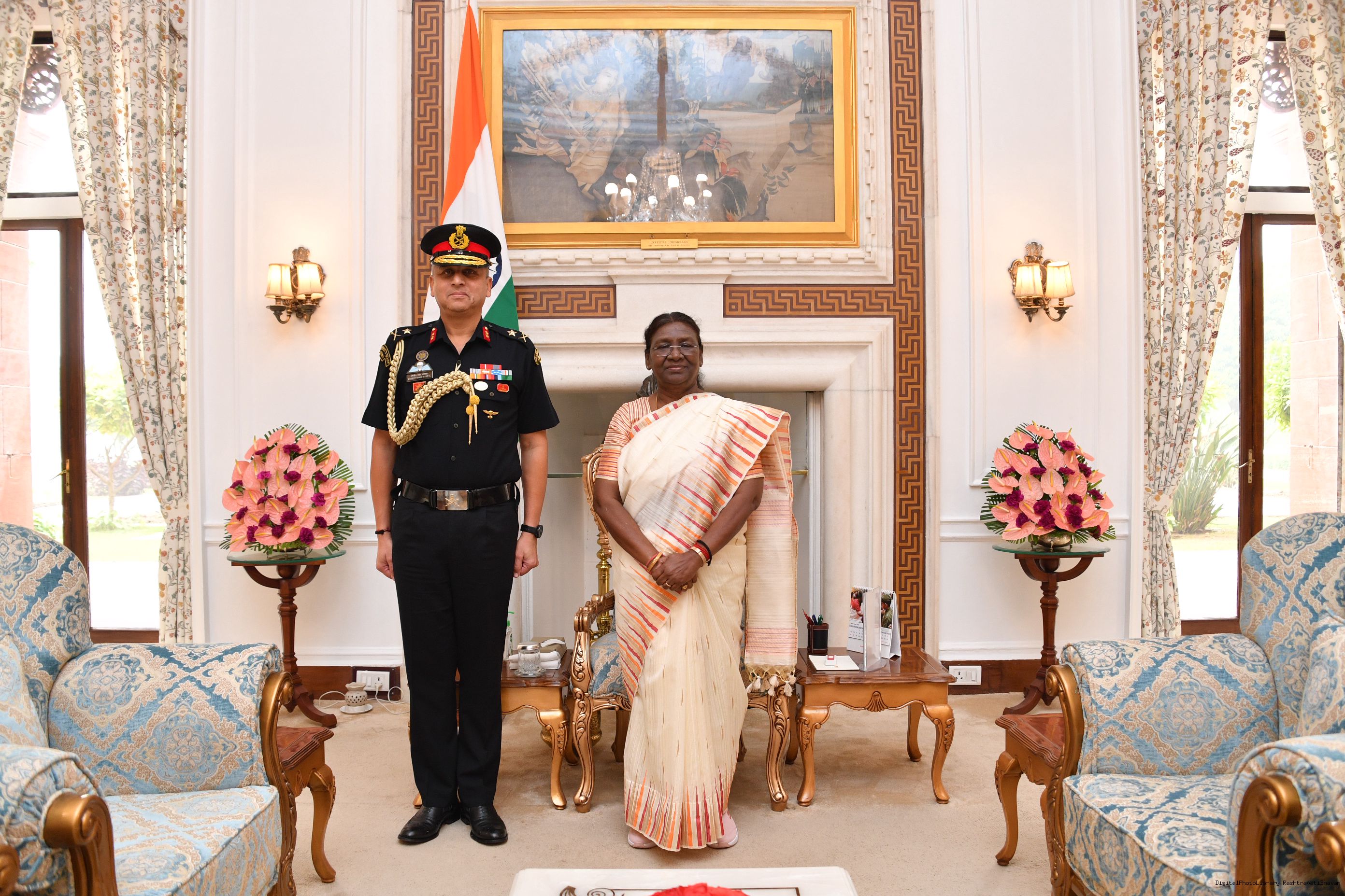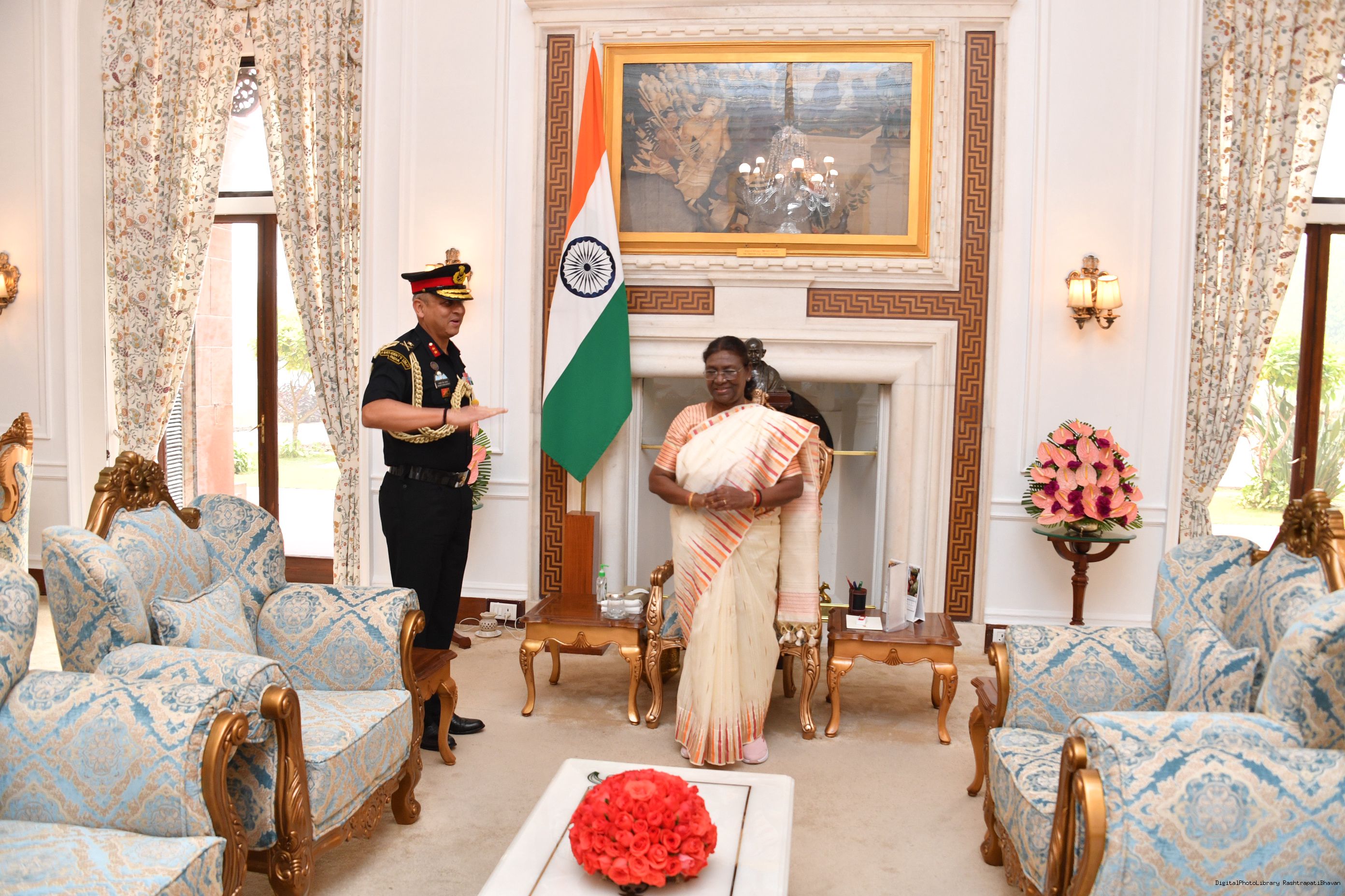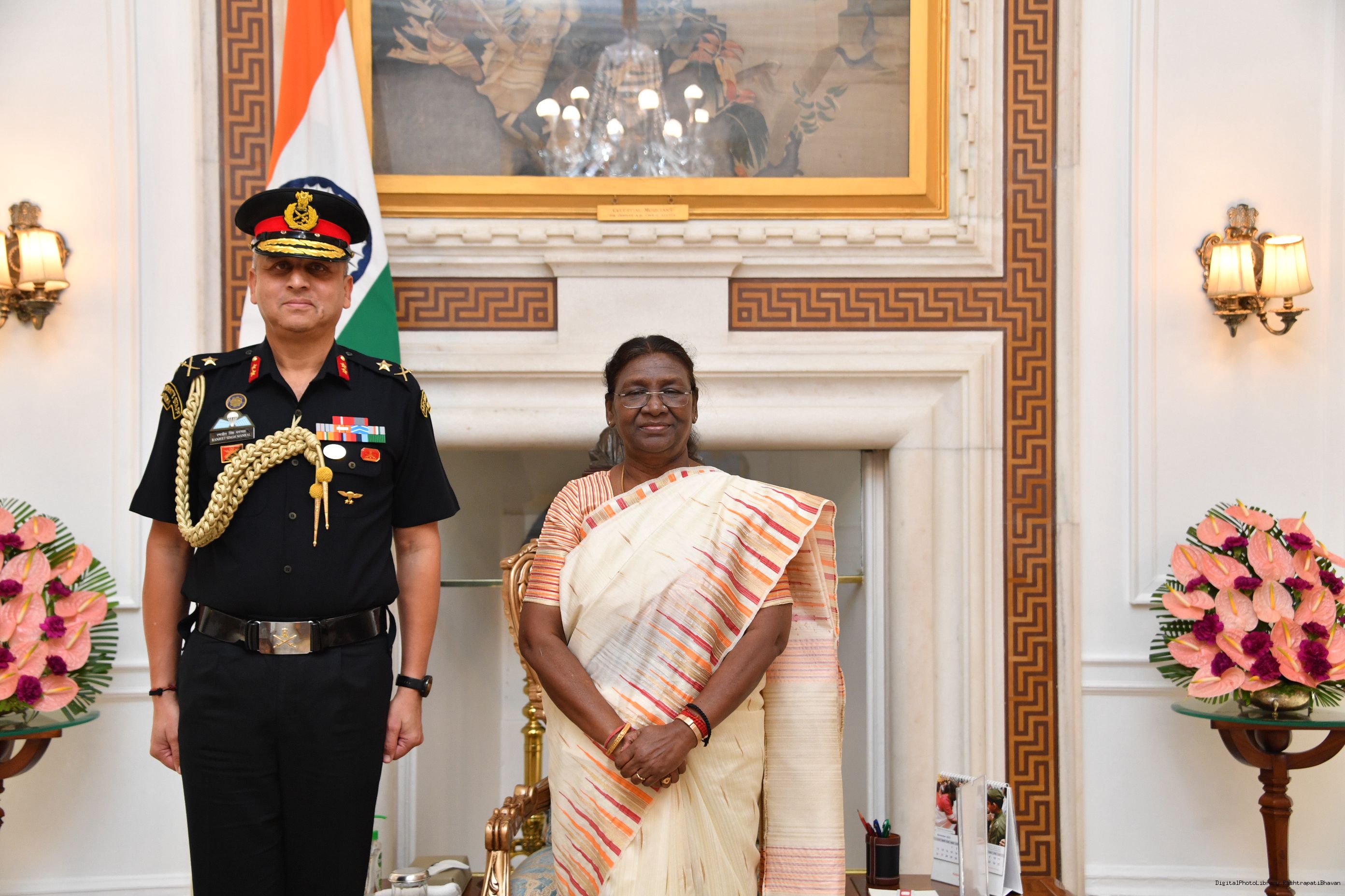 | Caption: | Maj Gen Ranjeet Singh Manral, SM, Military Secretary to the President and Capt Ravneet Singh Randhawa, CPH [Award of Presidential Service Badga (PSB)] meeting with the President of India, Smt. Droupadi Murmu at Rashtrapati Bhavan on November 3, 2023. |