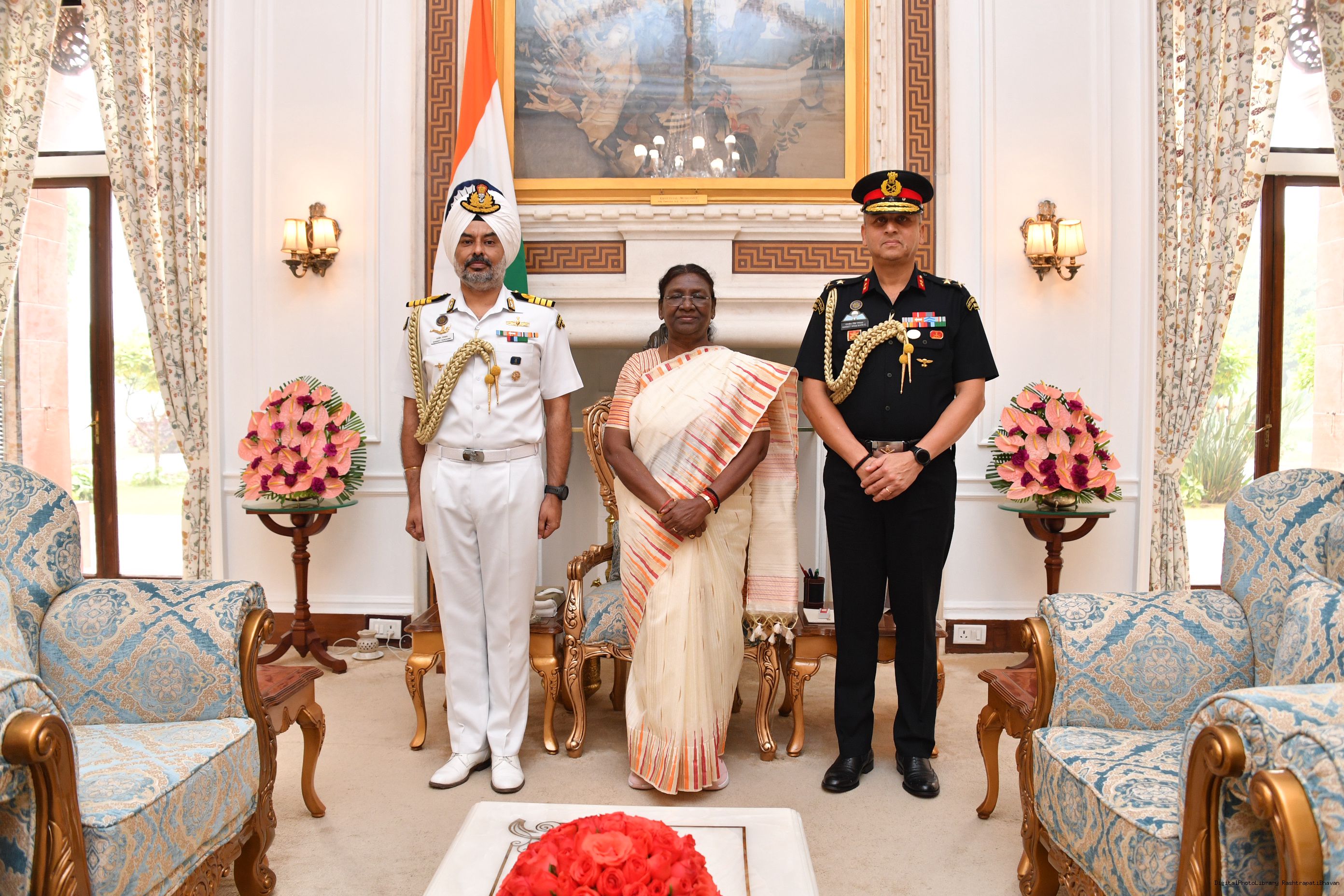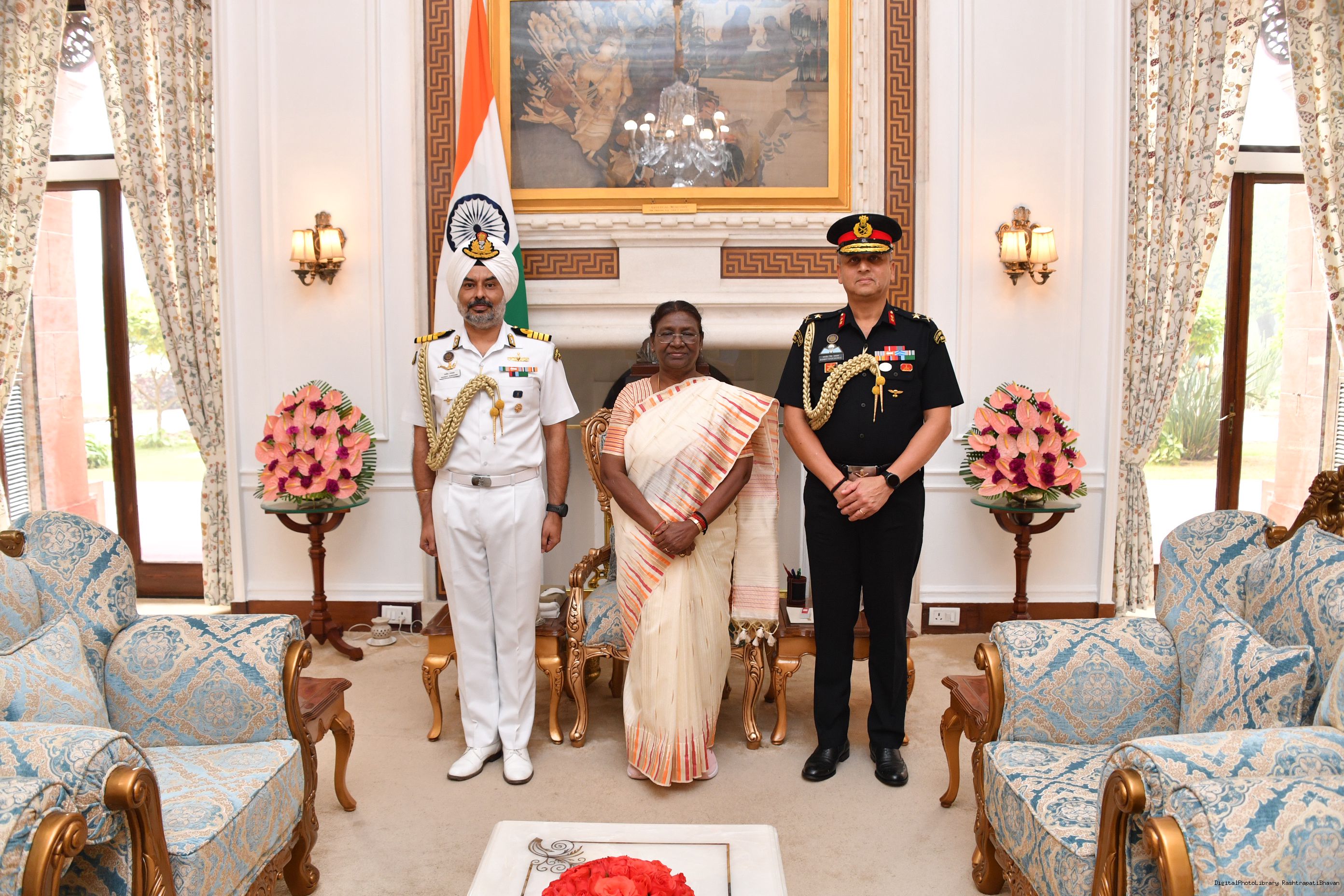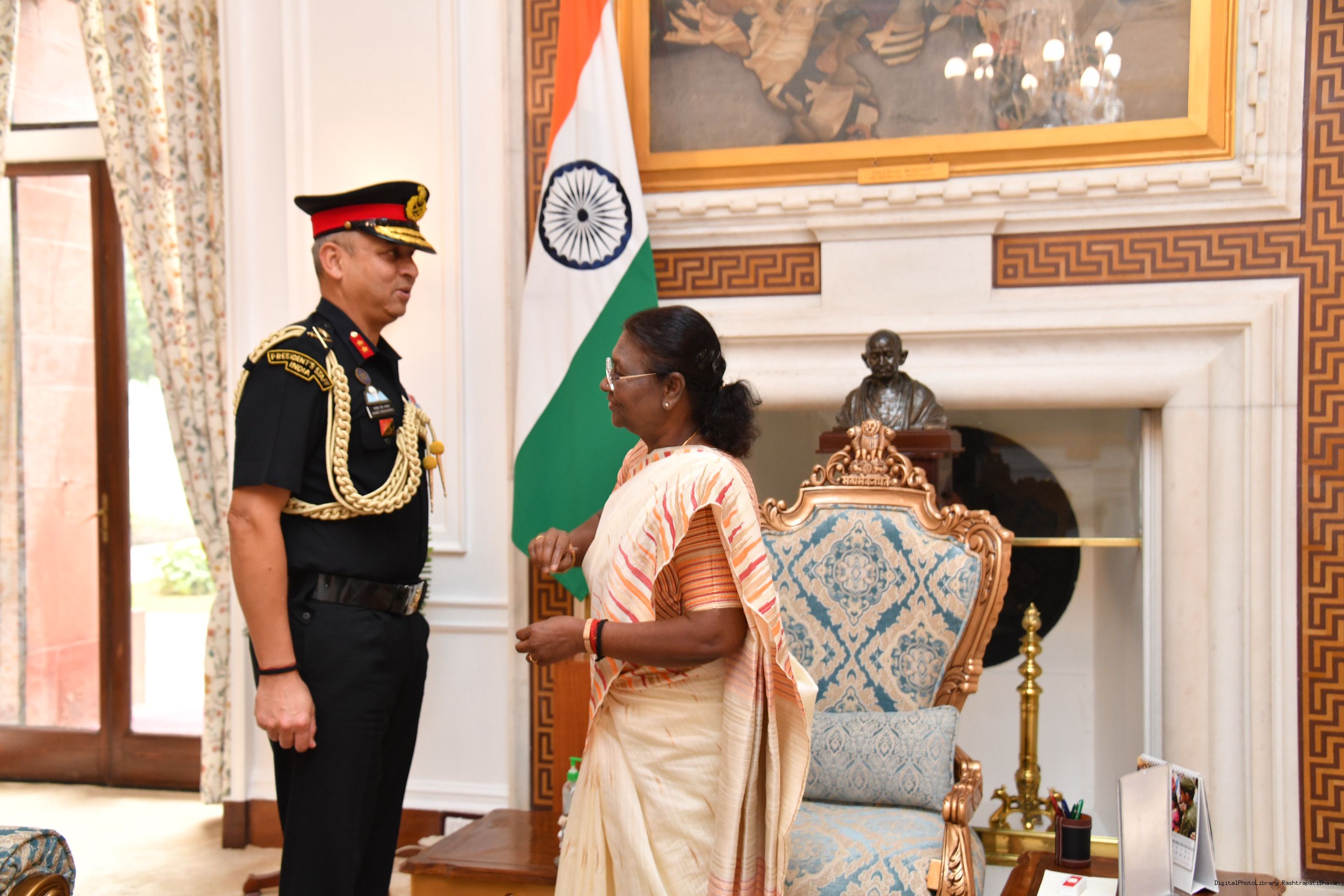 | Caption: | Maj Gen Ranjeet Singh Manral, SM, Military Secretary to the President and Capt Ravneet Singh Randhawa, CPH [Award of Presidential Service Badga (PSB)] meeting with the President of India, Smt. Droupadi Murmu at Rashtrapati Bhavan on November 3, 2023. |