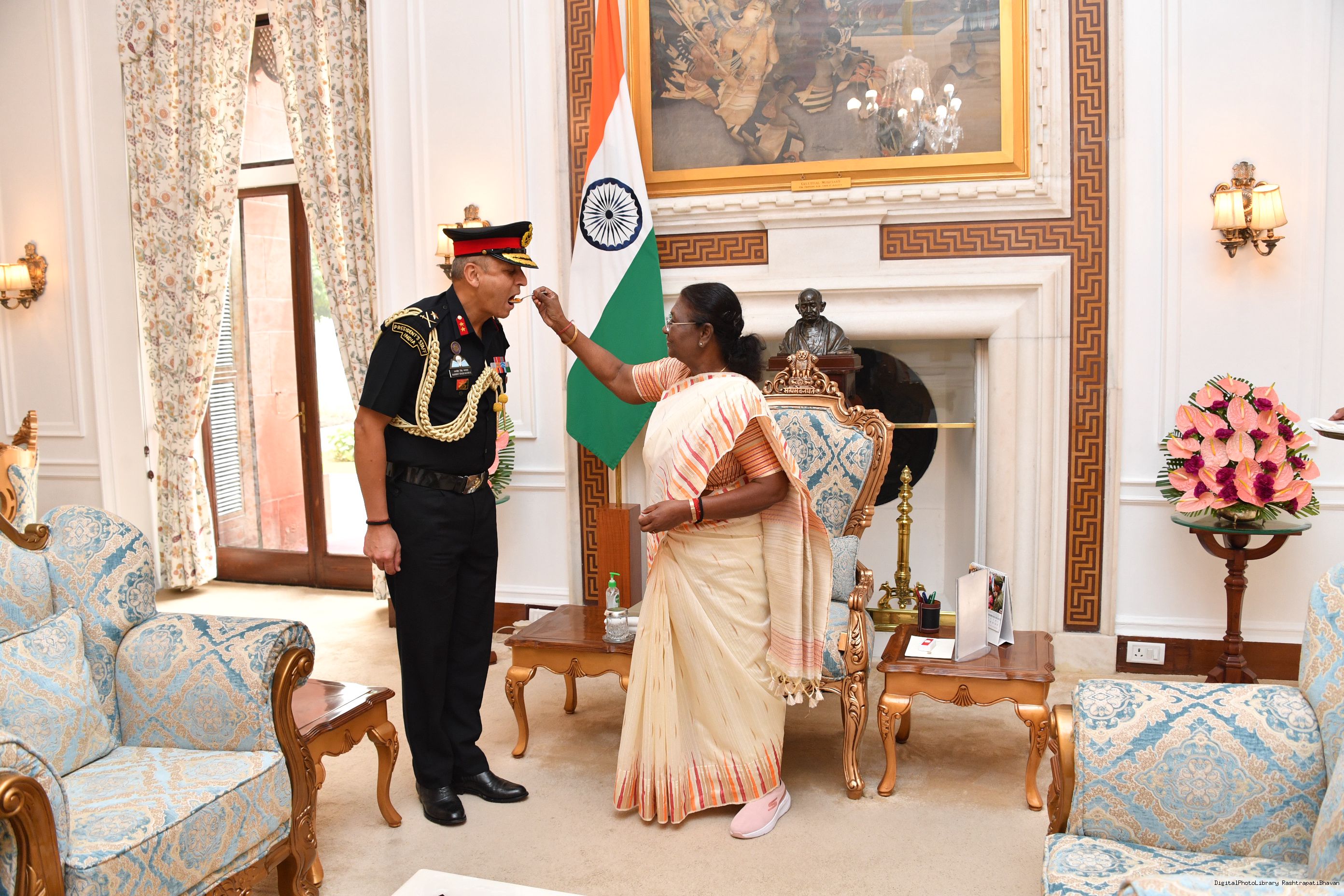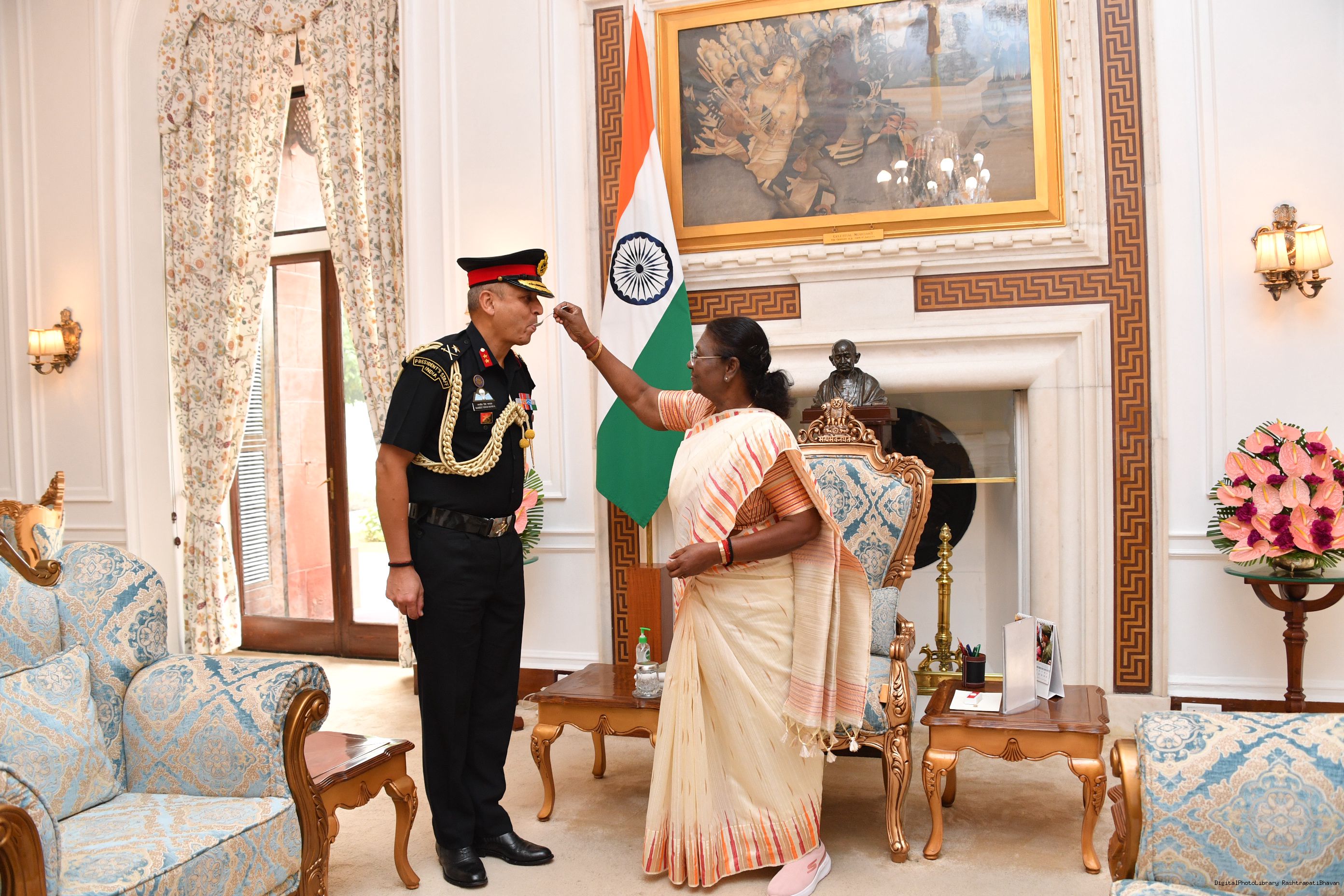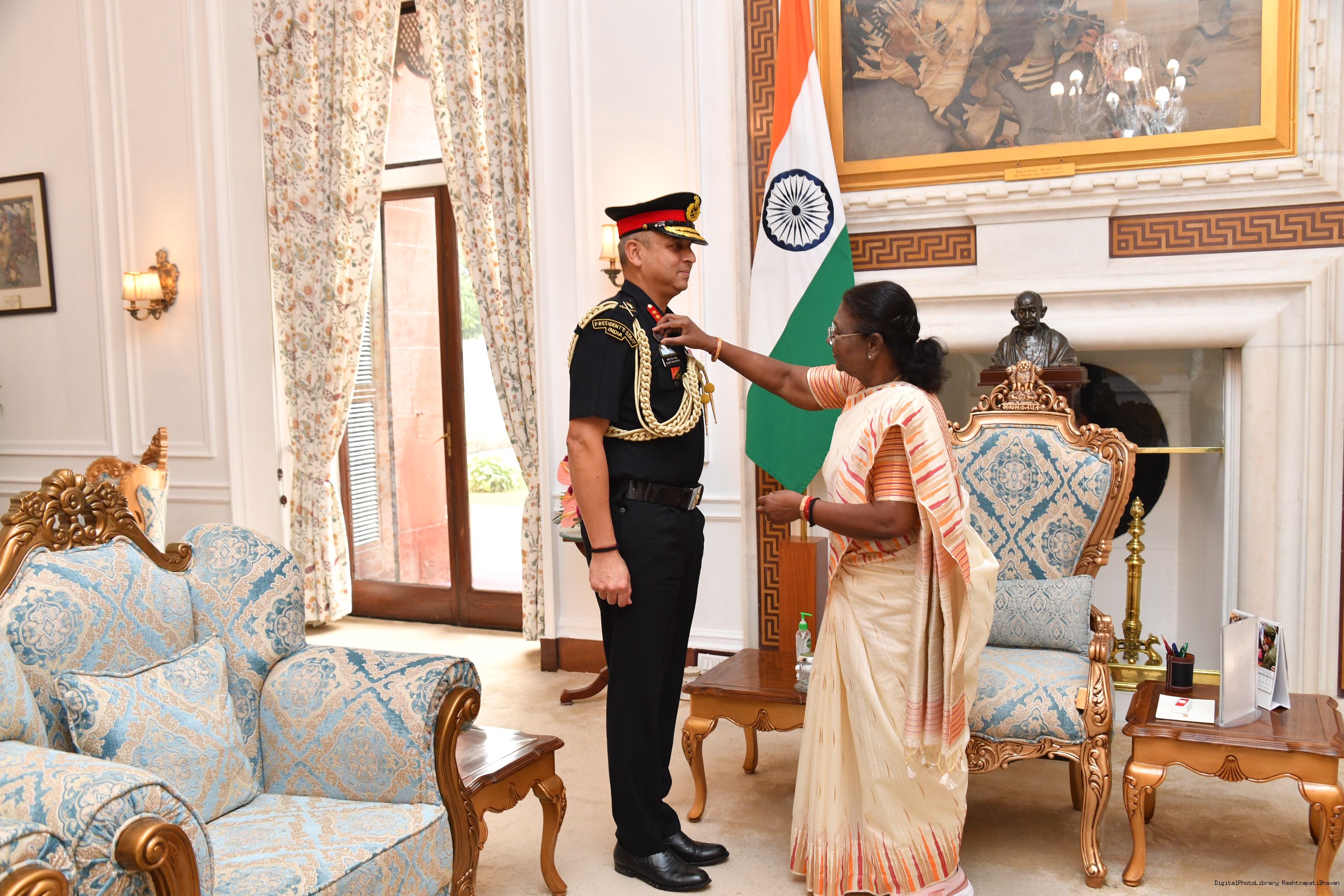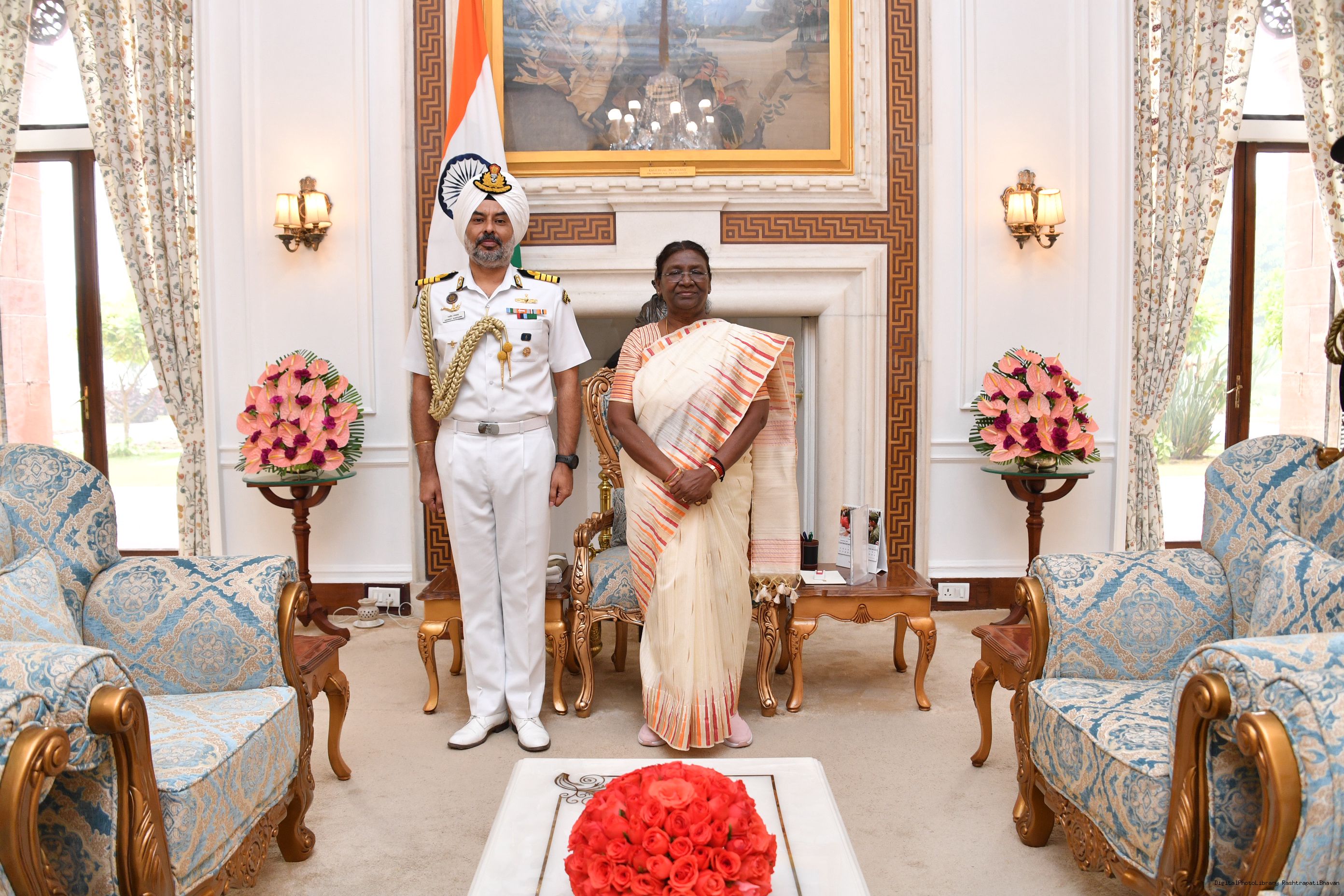 | Caption: | Maj Gen Ranjeet Singh Manral, SM, Military Secretary to the President and Capt Ravneet Singh Randhawa, CPH [Award of Presidential Service Badga (PSB)] meeting with the President of India, Smt. Droupadi Murmu at Rashtrapati Bhavan on November 3, 2023. |