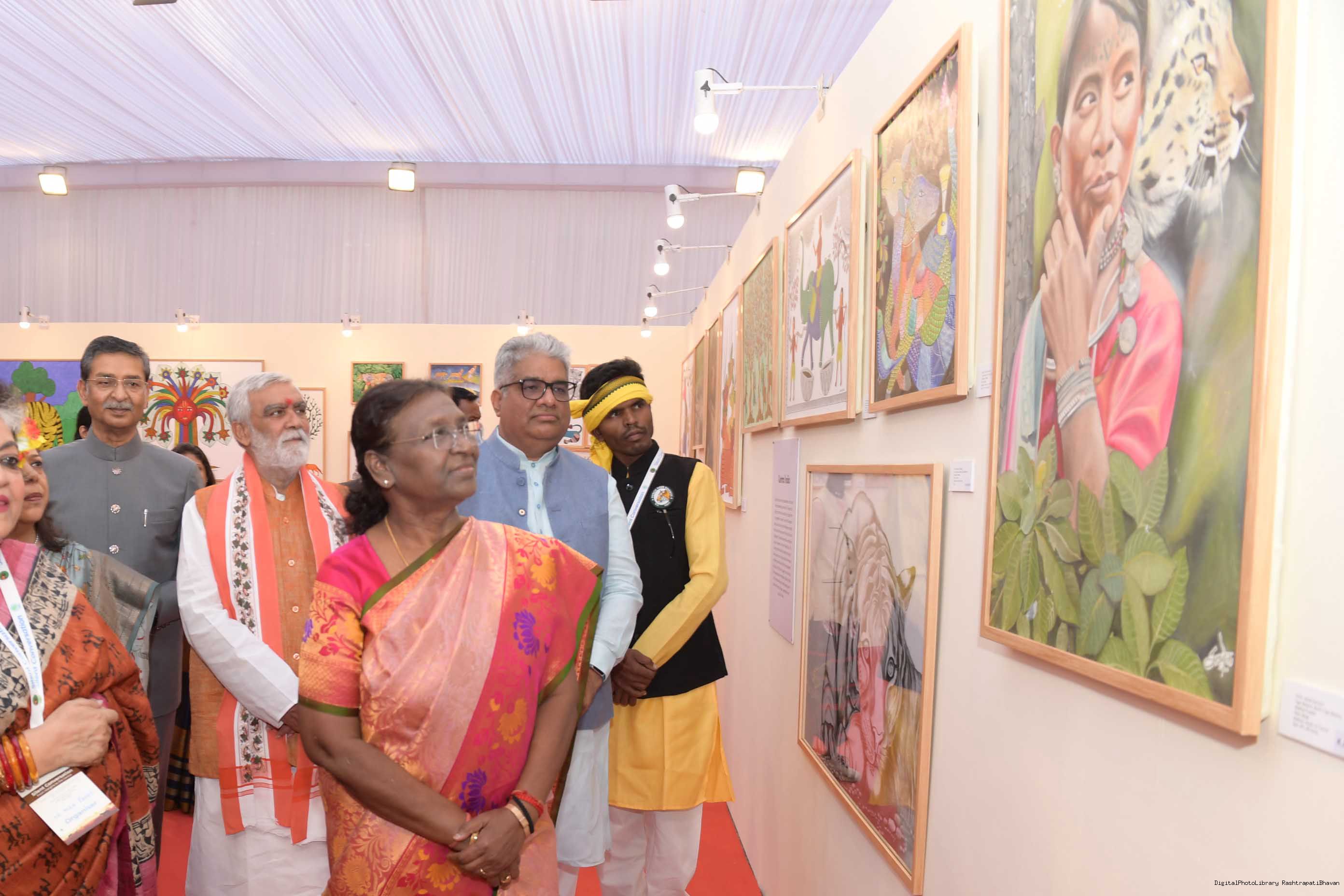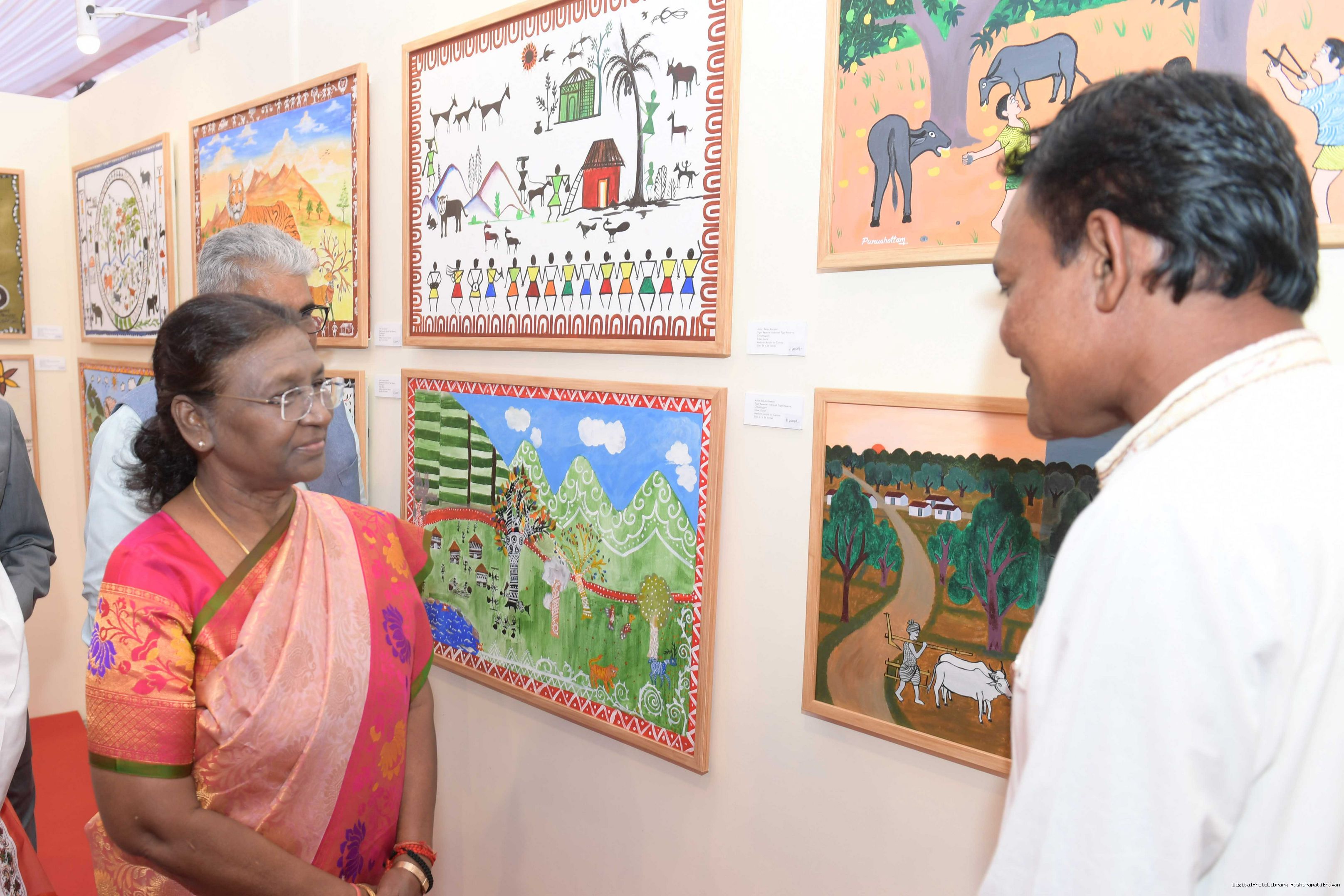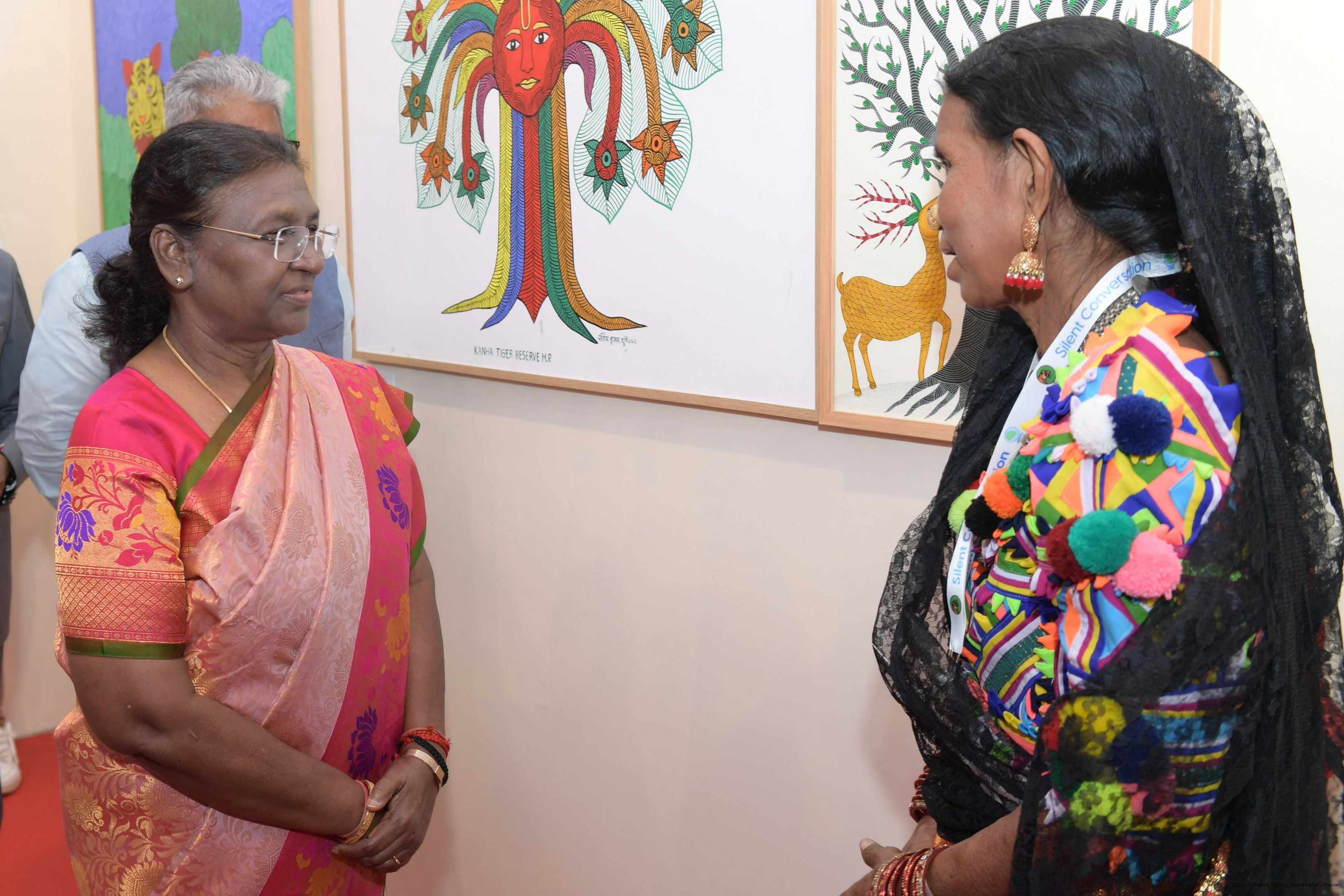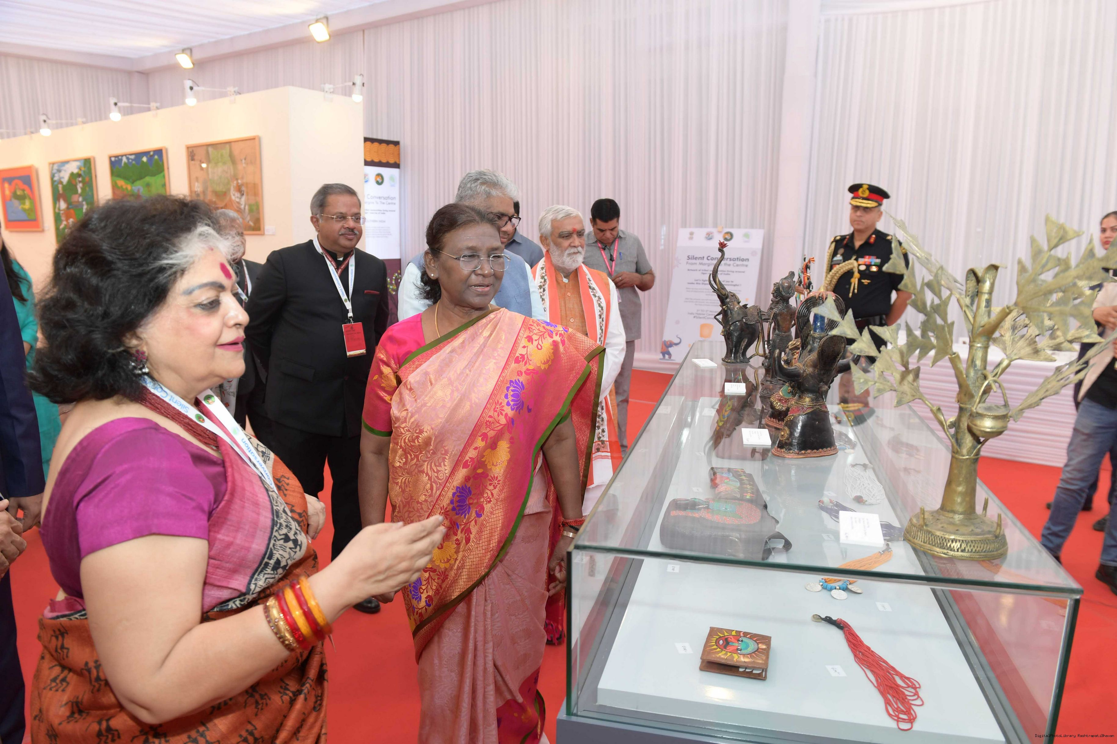 | Caption: | The President of India, Smt Droupadi Murmu inaugurated an art exhibition titled, “Silent Conversation: From Margins to the Centre” in New Delhi on November 3, 2023. |