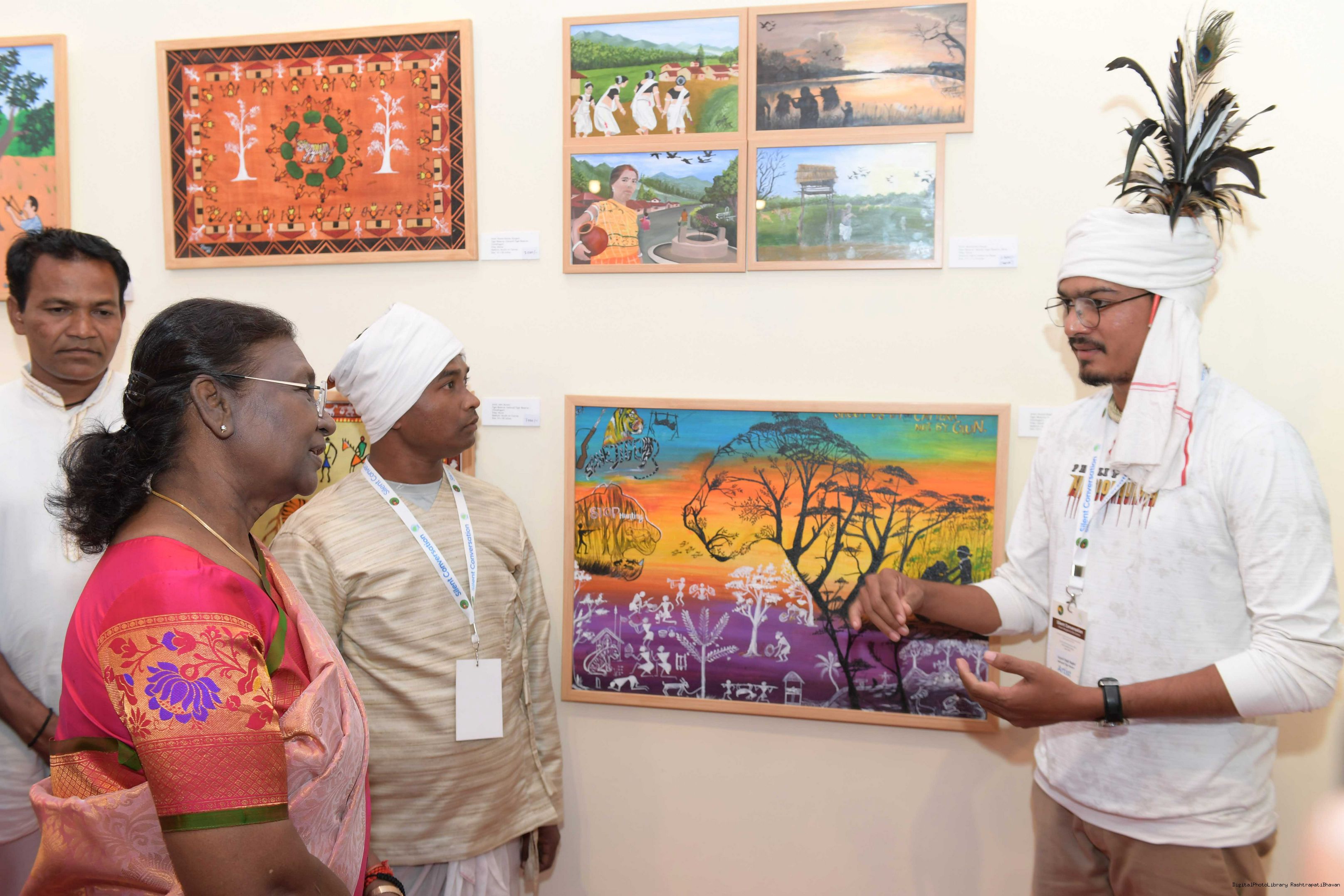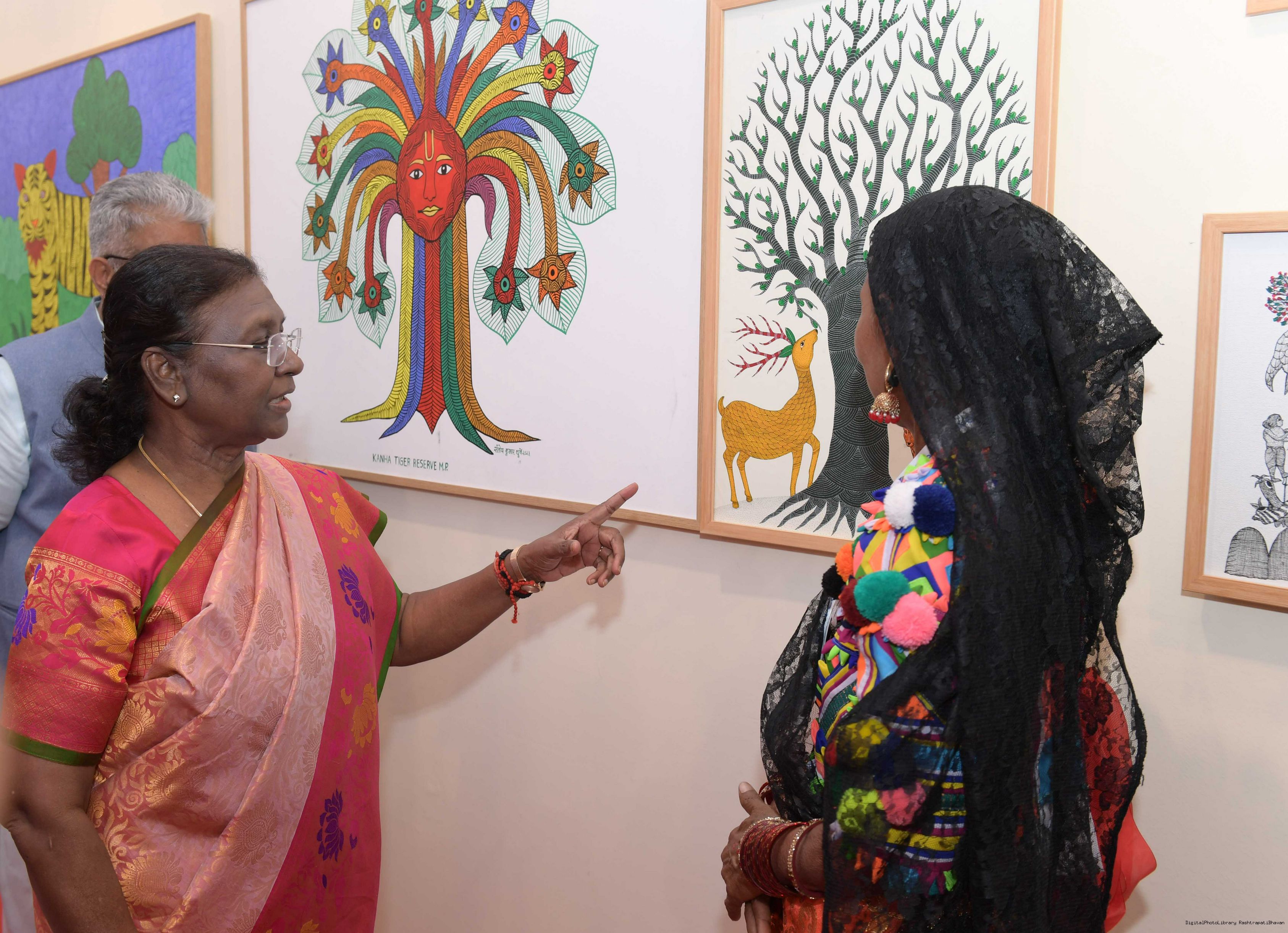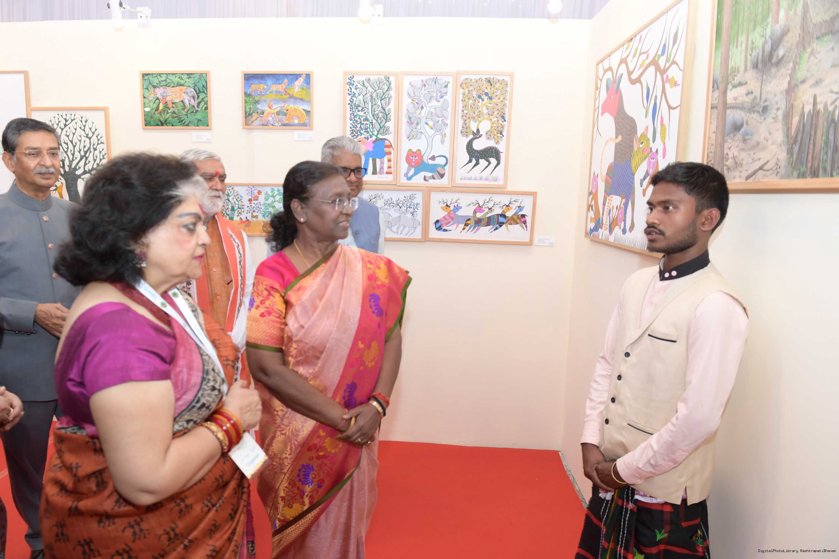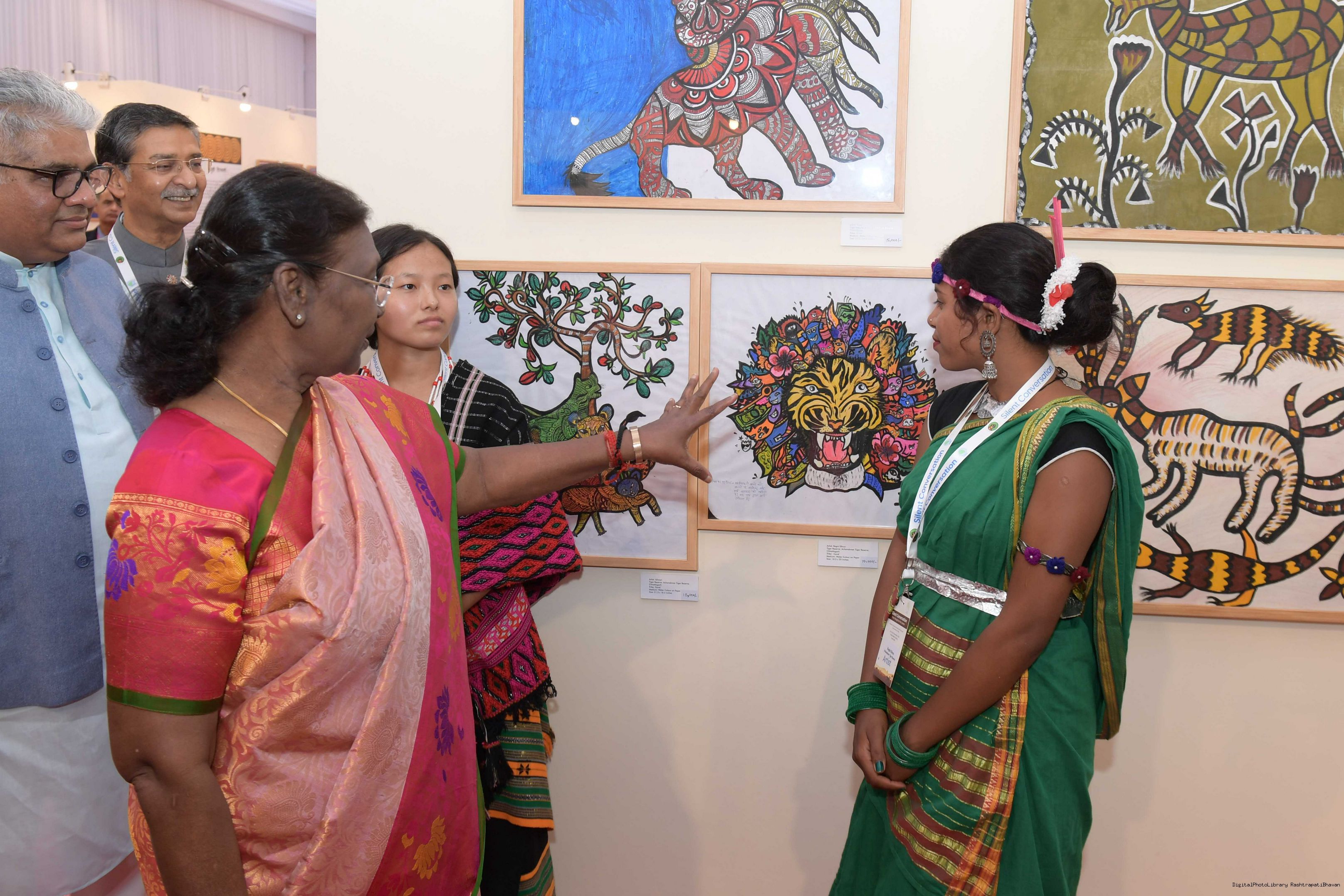 | Caption: | The President of India, Smt Droupadi Murmu inaugurated an art exhibition titled, “Silent Conversation: From Margins to the Centre” in New Delhi on November 3, 2023. |