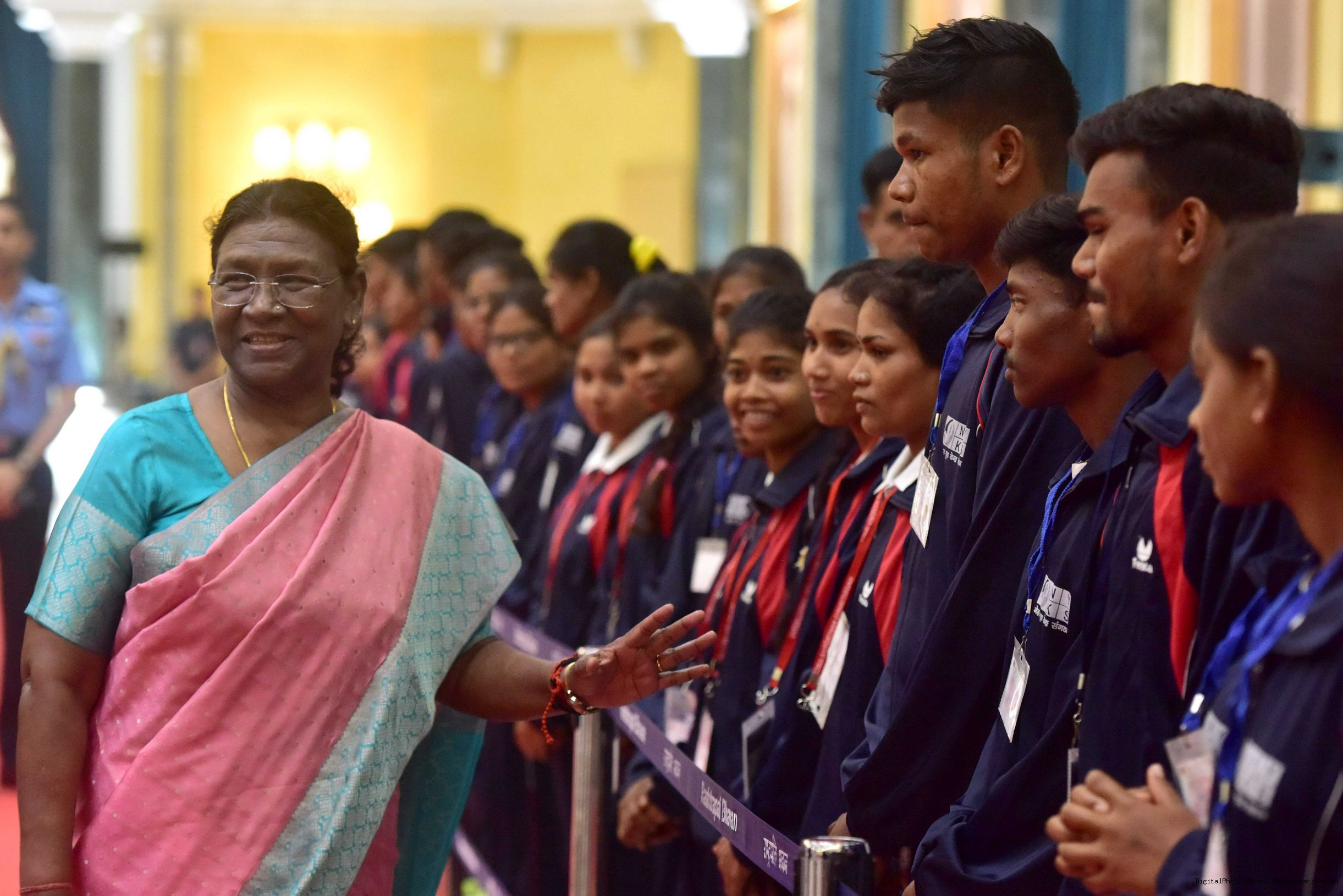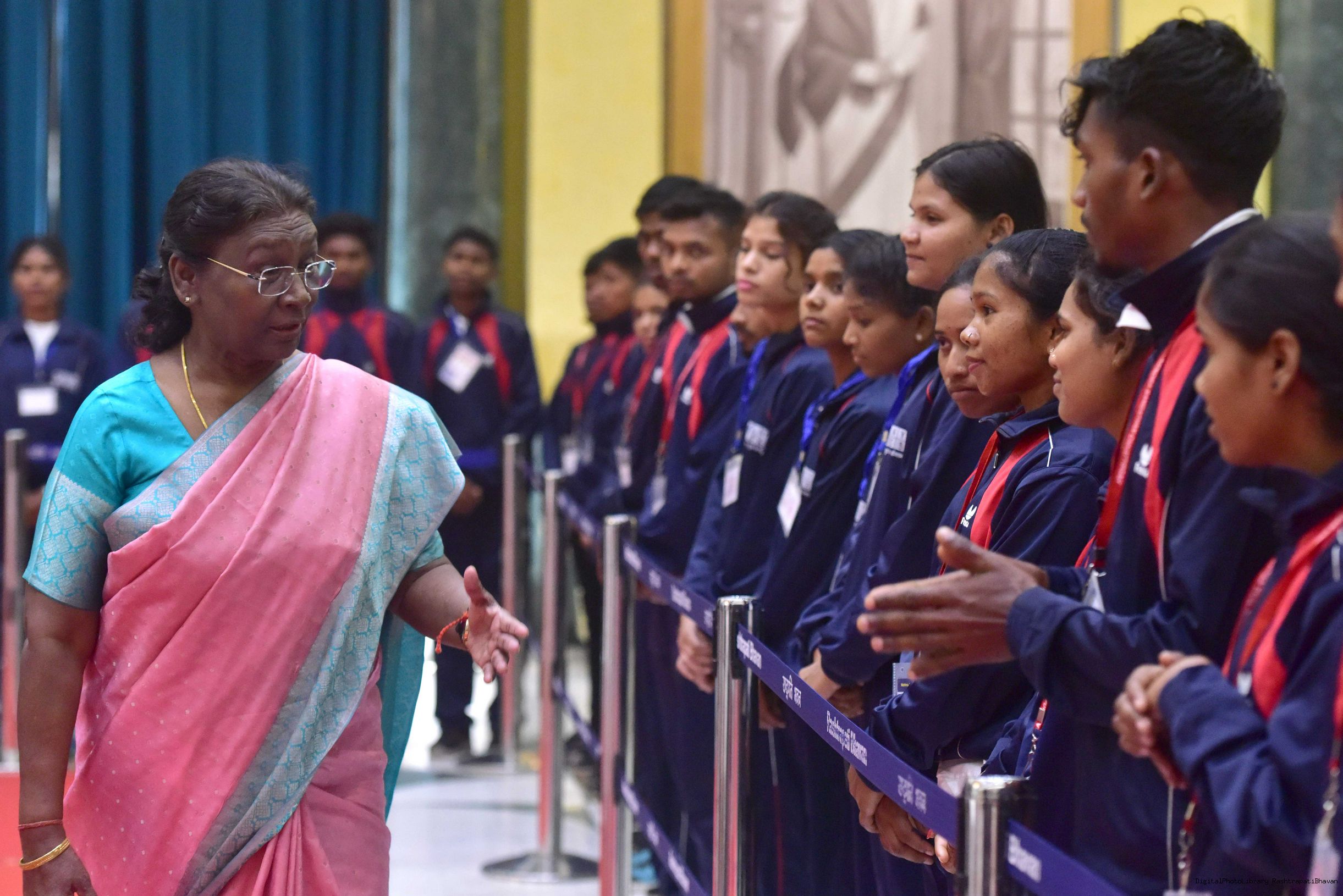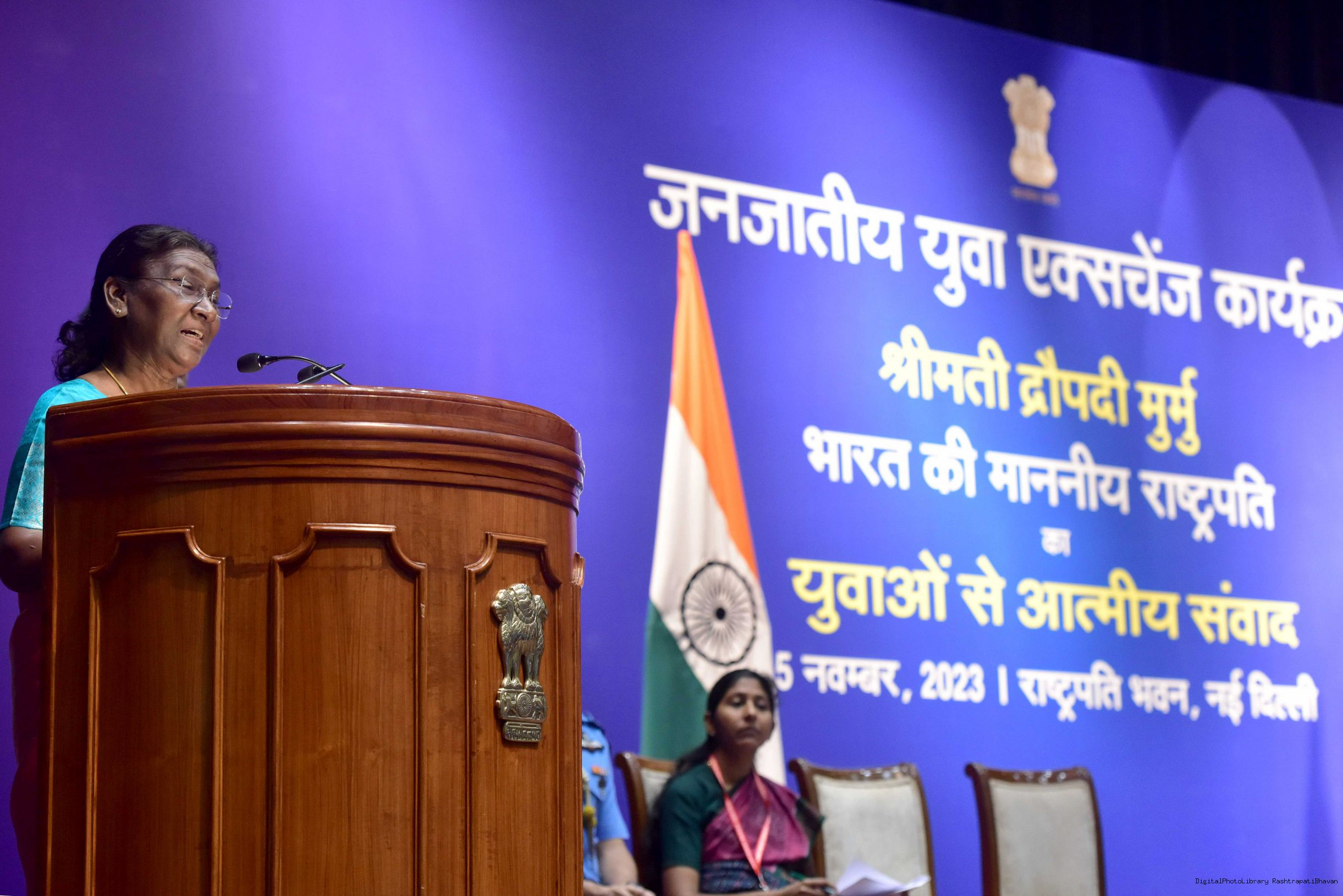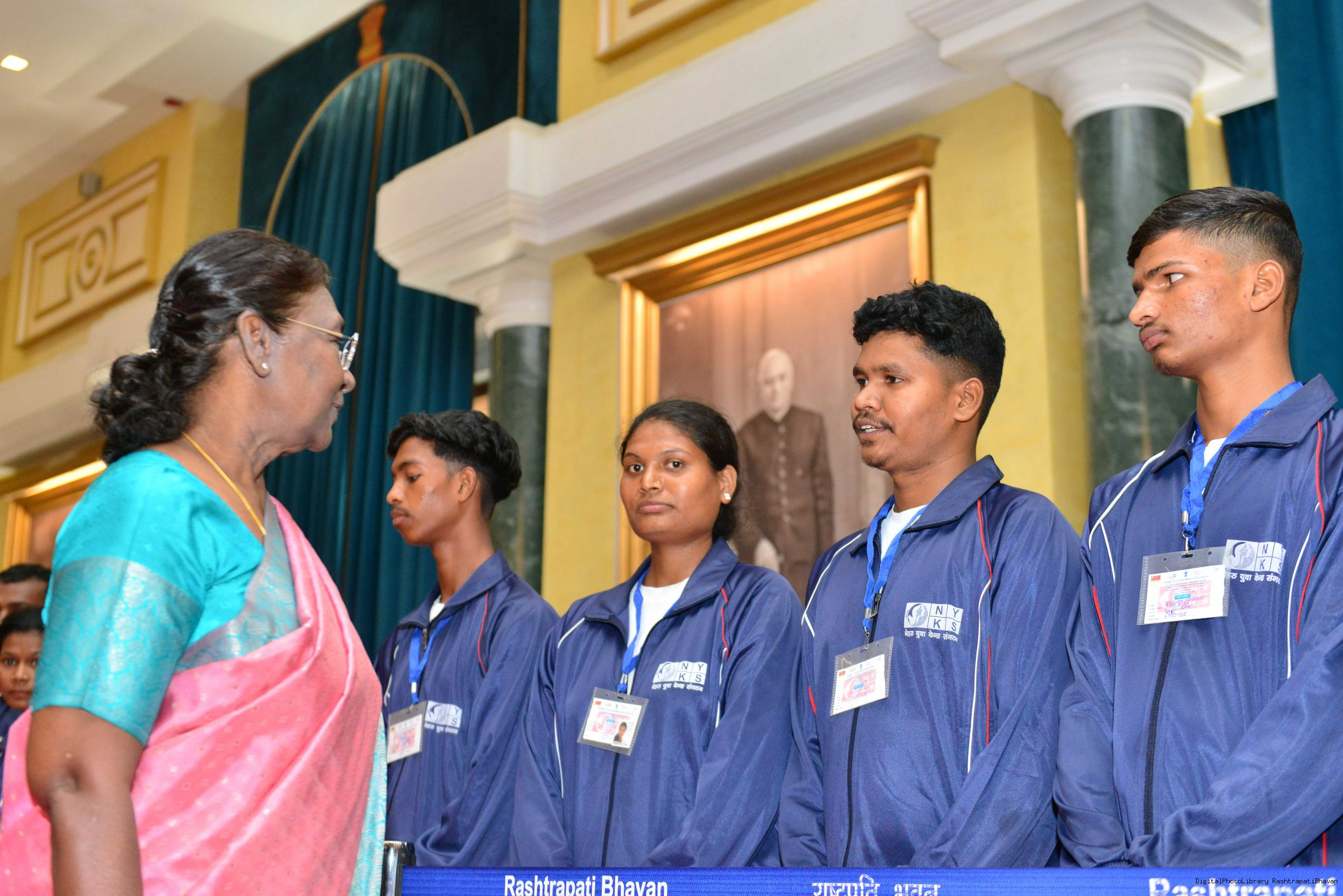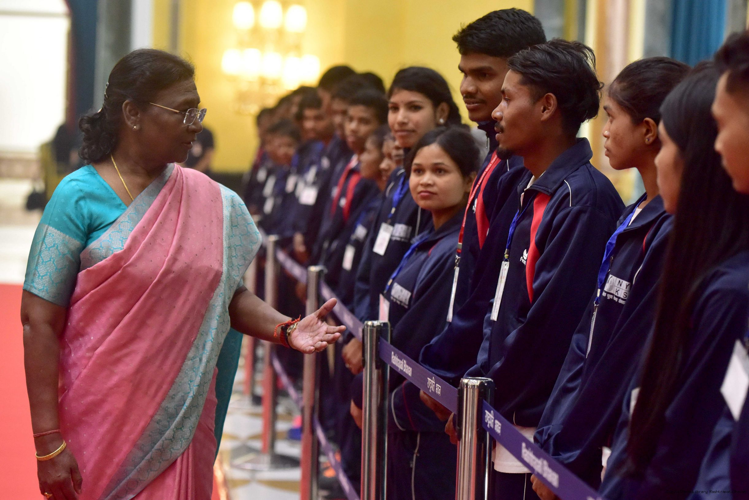 | Caption: | The President of India Smt. Droupadi Murmu meeting and interact with 200 Tribal Youth others meeting with at Rashtrapati Bhavan on November 5, 2023. |
