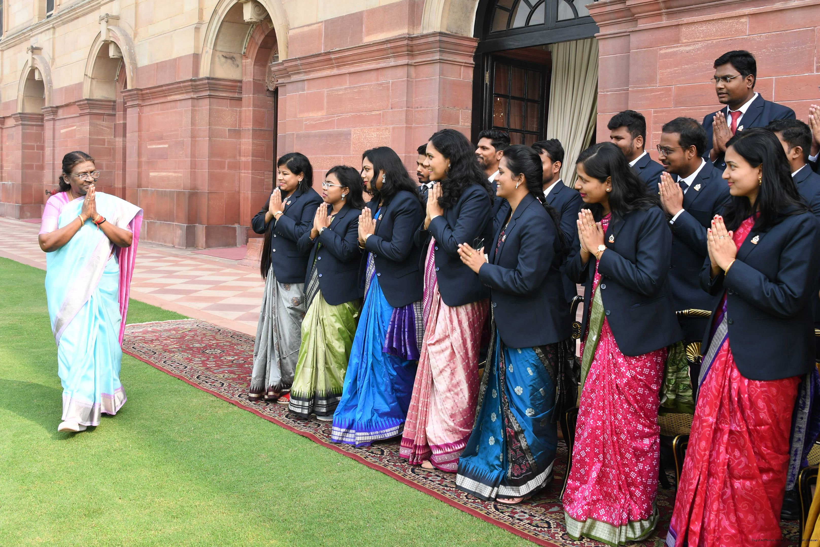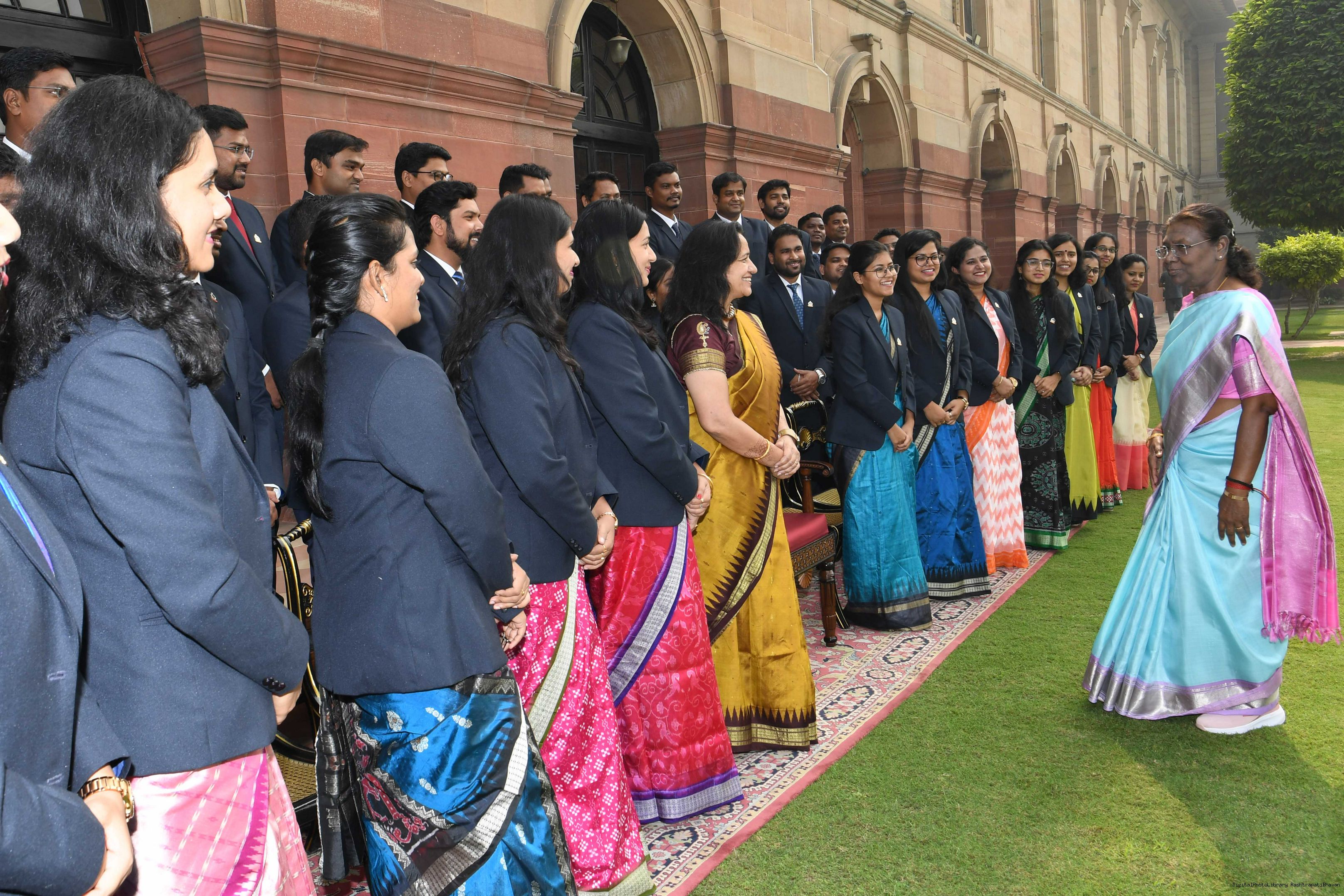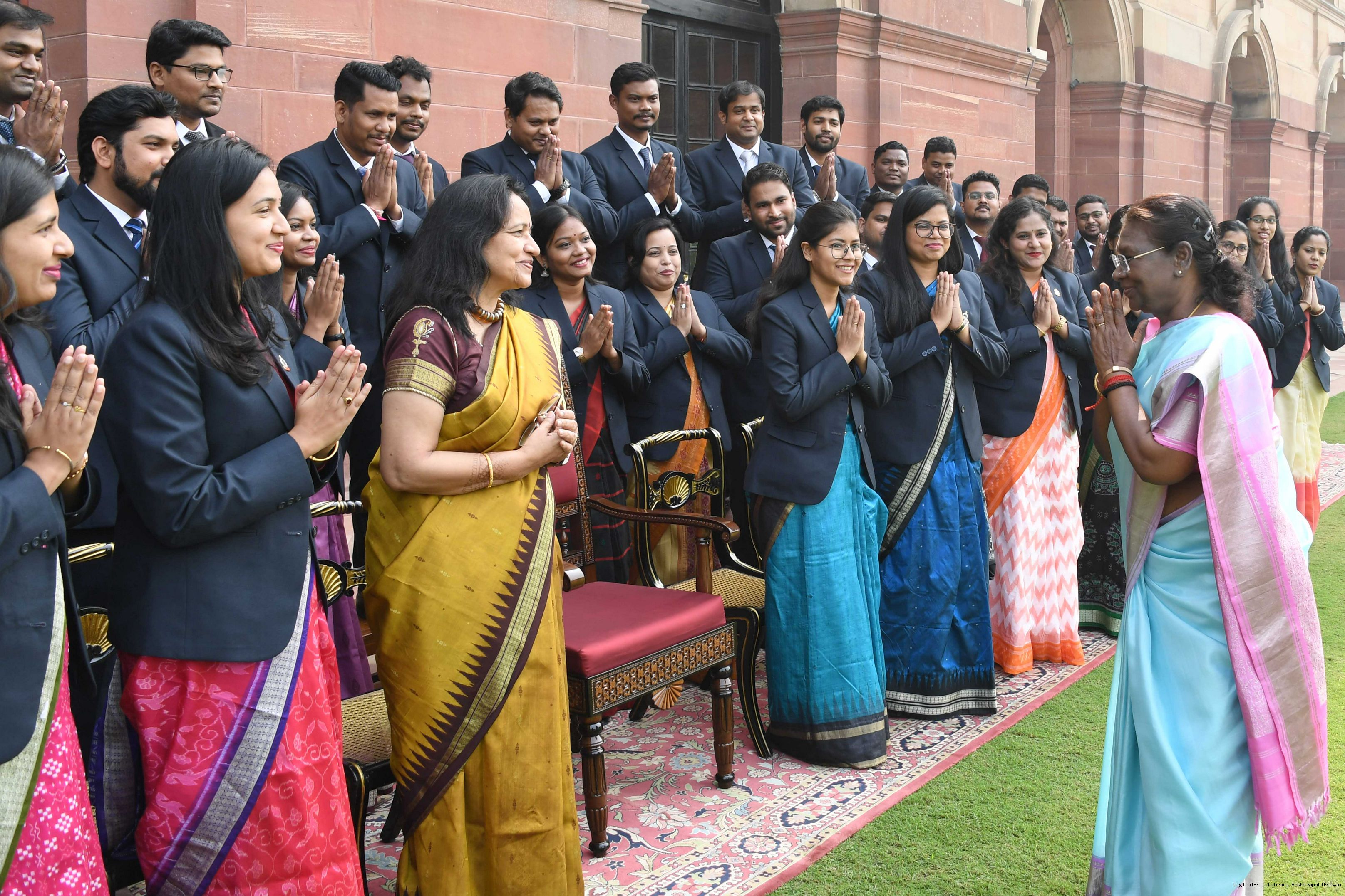 | Caption: | The President of India Smt. Droupadi Murmu posing a Group Photograph with a group of 46 persons comprising Dr. Namrata Agarwal, Professor, Arun Jaitley National Institute of Financial Management, Faridabad along with others at Rashtrapati Bhavan on November 6, 2023. |