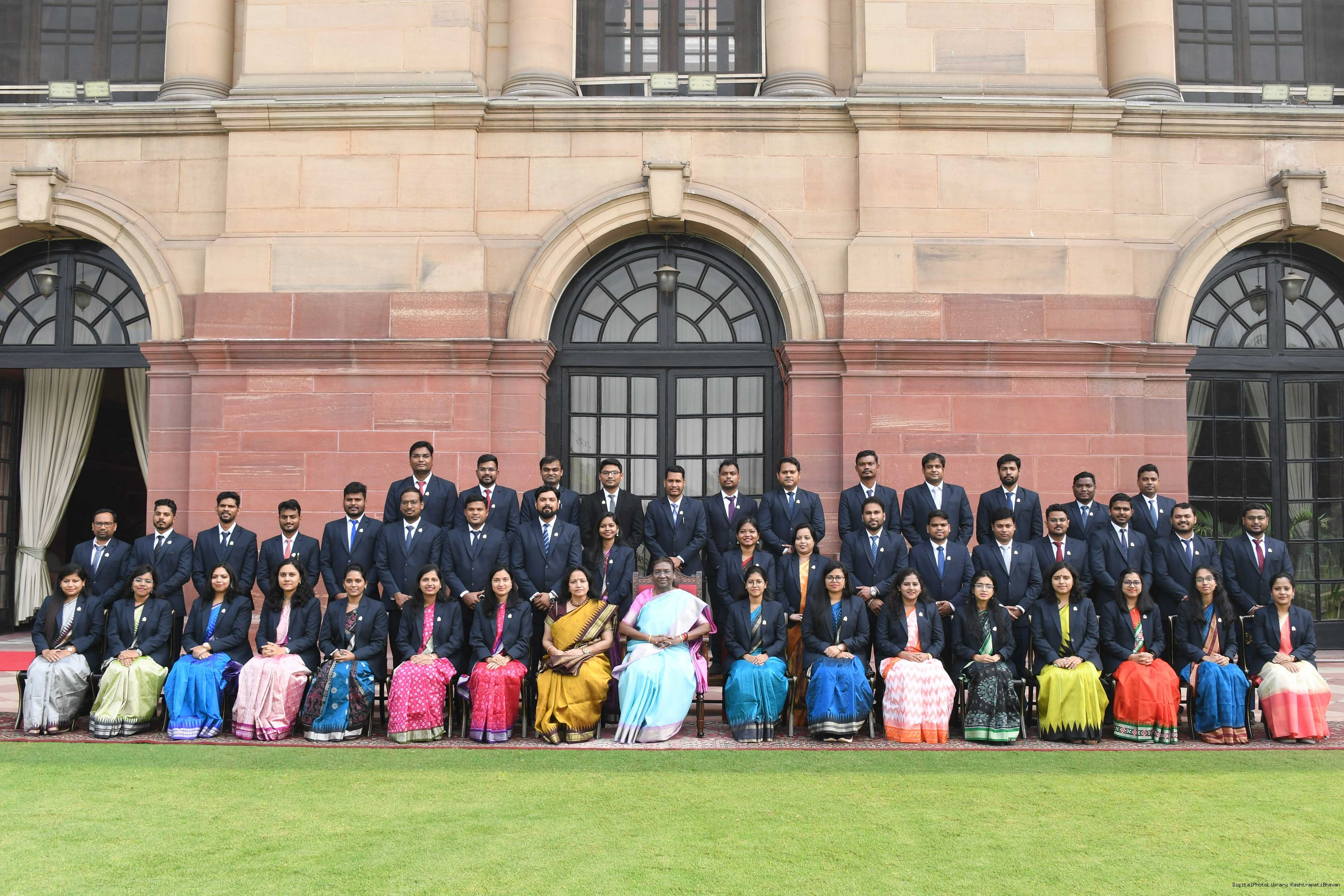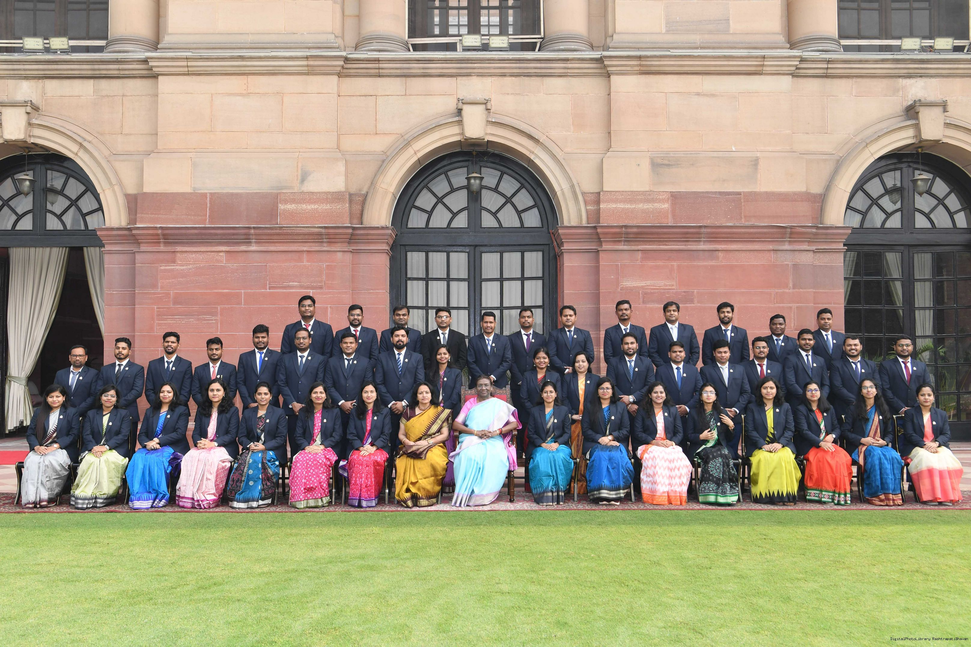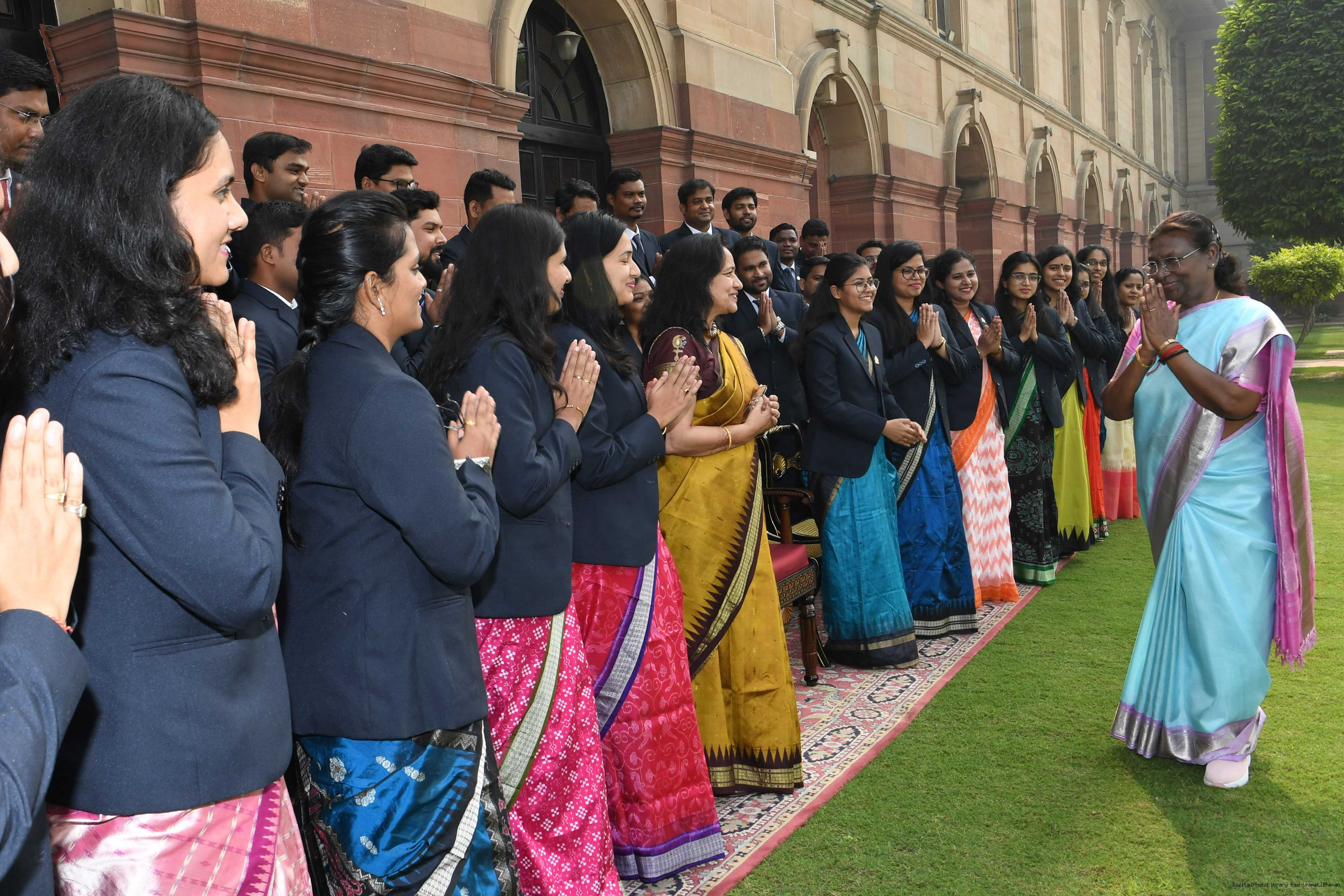 | Caption: | The President of India Smt. Droupadi Murmu posing a Group Photograph with a group of 46 persons comprising Dr. Namrata Agarwal, Professor, Arun Jaitley National Institute of Financial Management, Faridabad along with others at Rashtrapati Bhavan on November 6, 2023. |