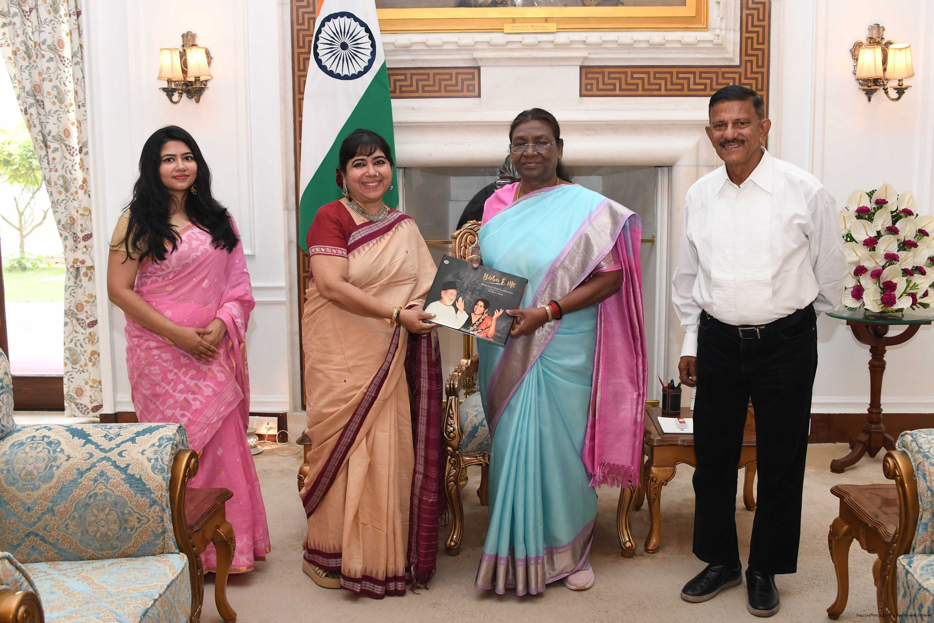 | Caption: | Dr. Soma Ghosh, Padma Shri Awardee Vocalist-Benaras Gharana along with others meeting with the President of India, Smt. Droupadi Murmu at Rashtrapati Bhavan on November 6, 2023. |