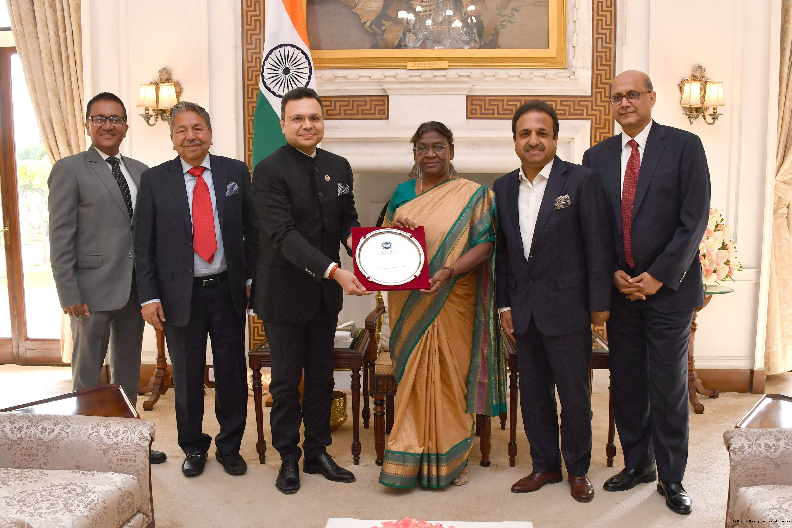 | Caption: | Shri Saket Dalmia, President along with others from PHD Chamber of Commerce and Industry meeting with the President of India, Smt. Droupadi Murmu at Rashtrapati Bhavan on May 22, 2023 |