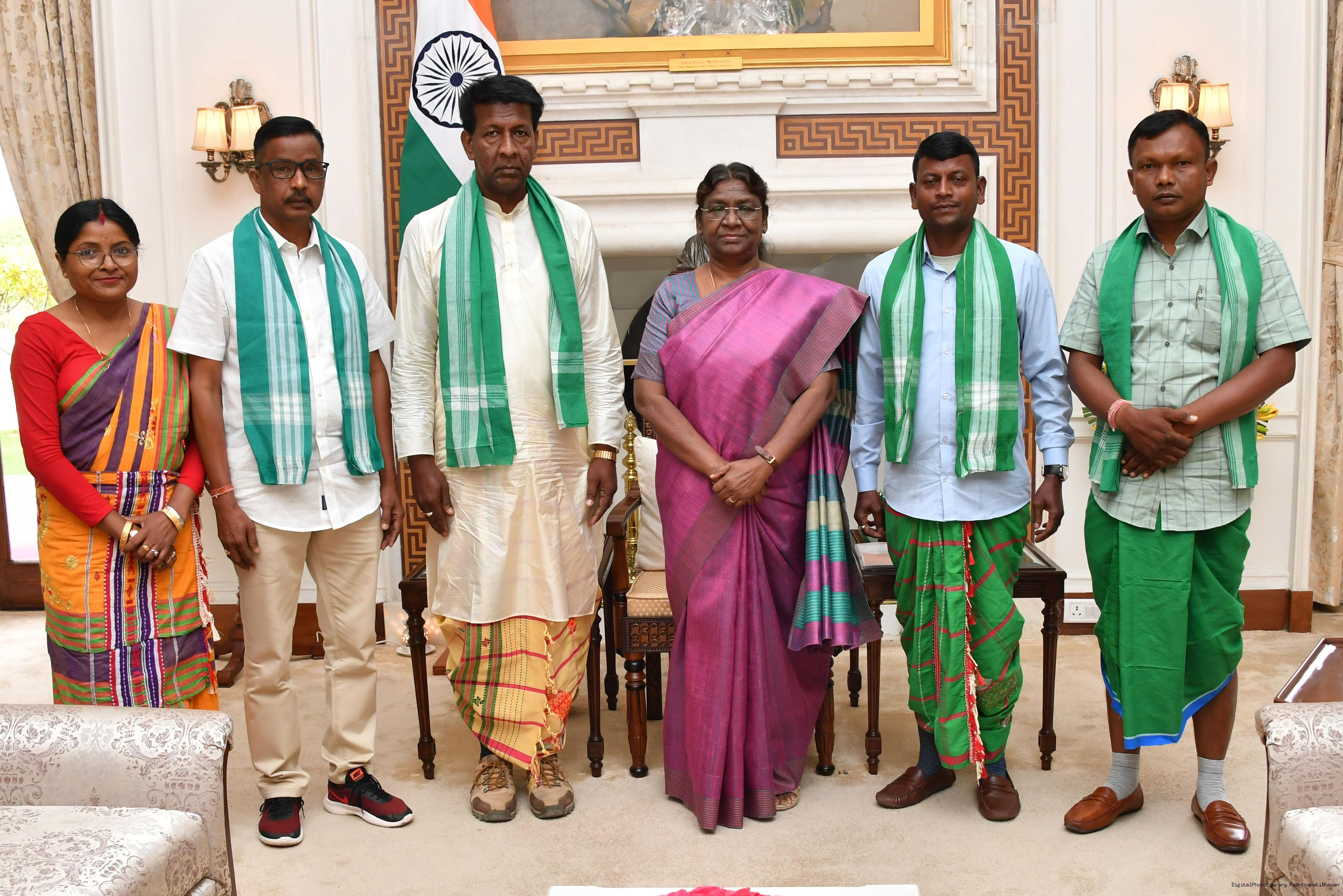 | Caption: | Shri Debajit Majhi, President along with others from All Assam Santal Development Association, Teok Central Library meeting with the President of India, Smt. Droupadi Murmu at Rashtrapati Bhavan on May 23, 2023 |