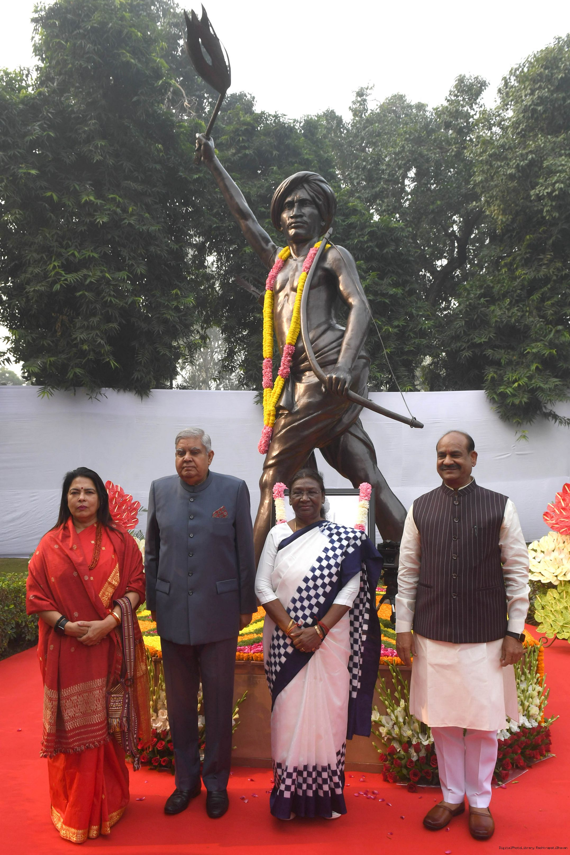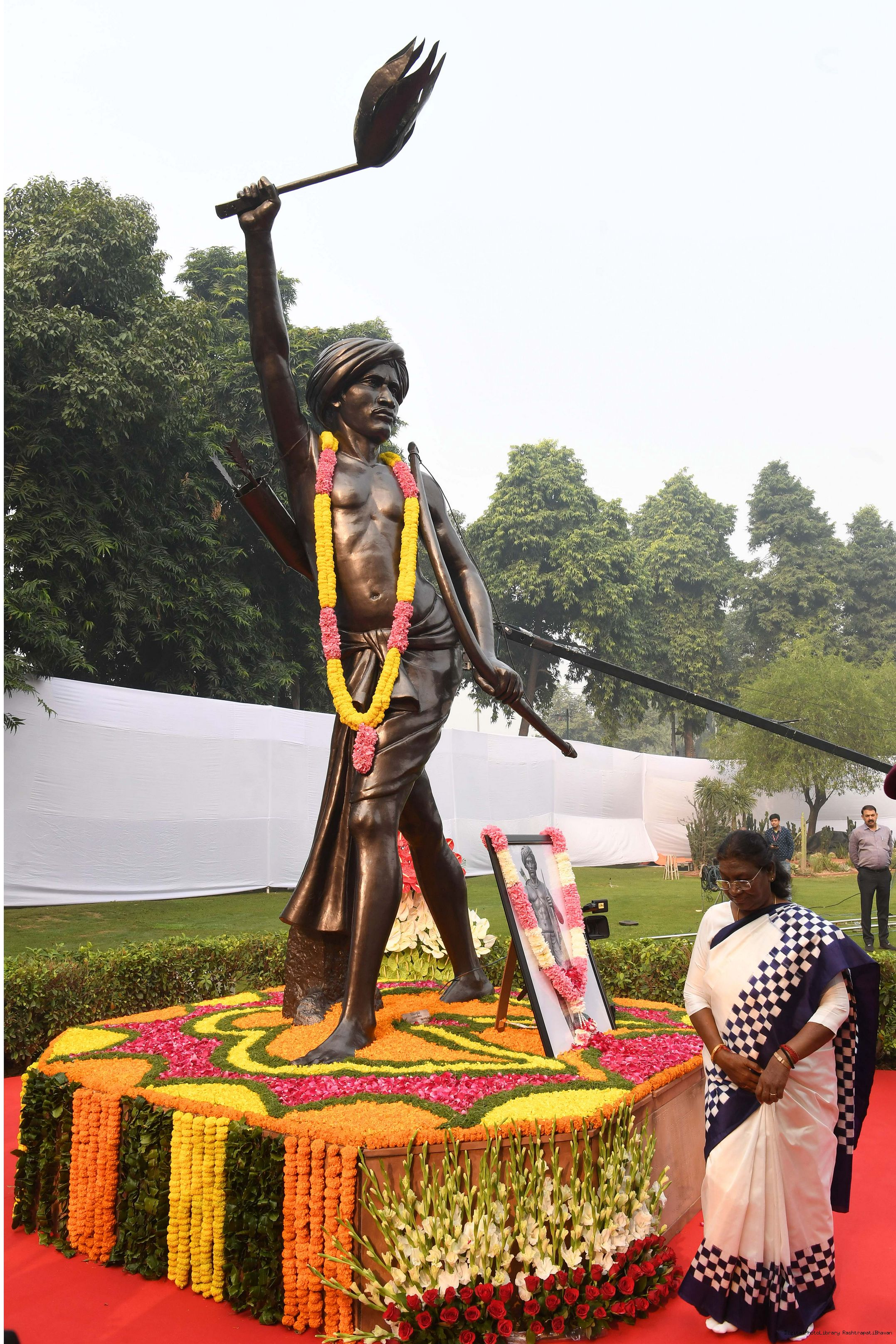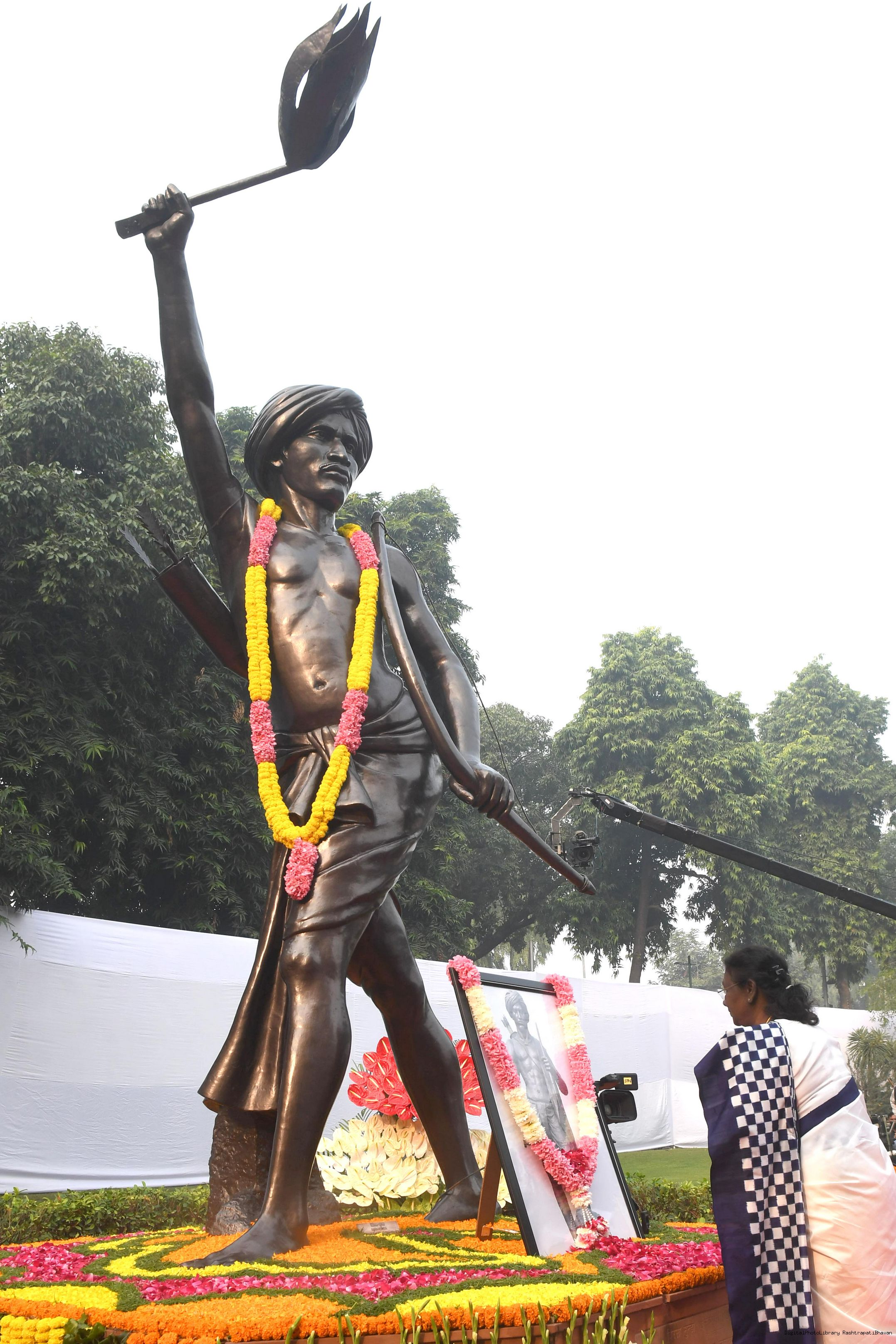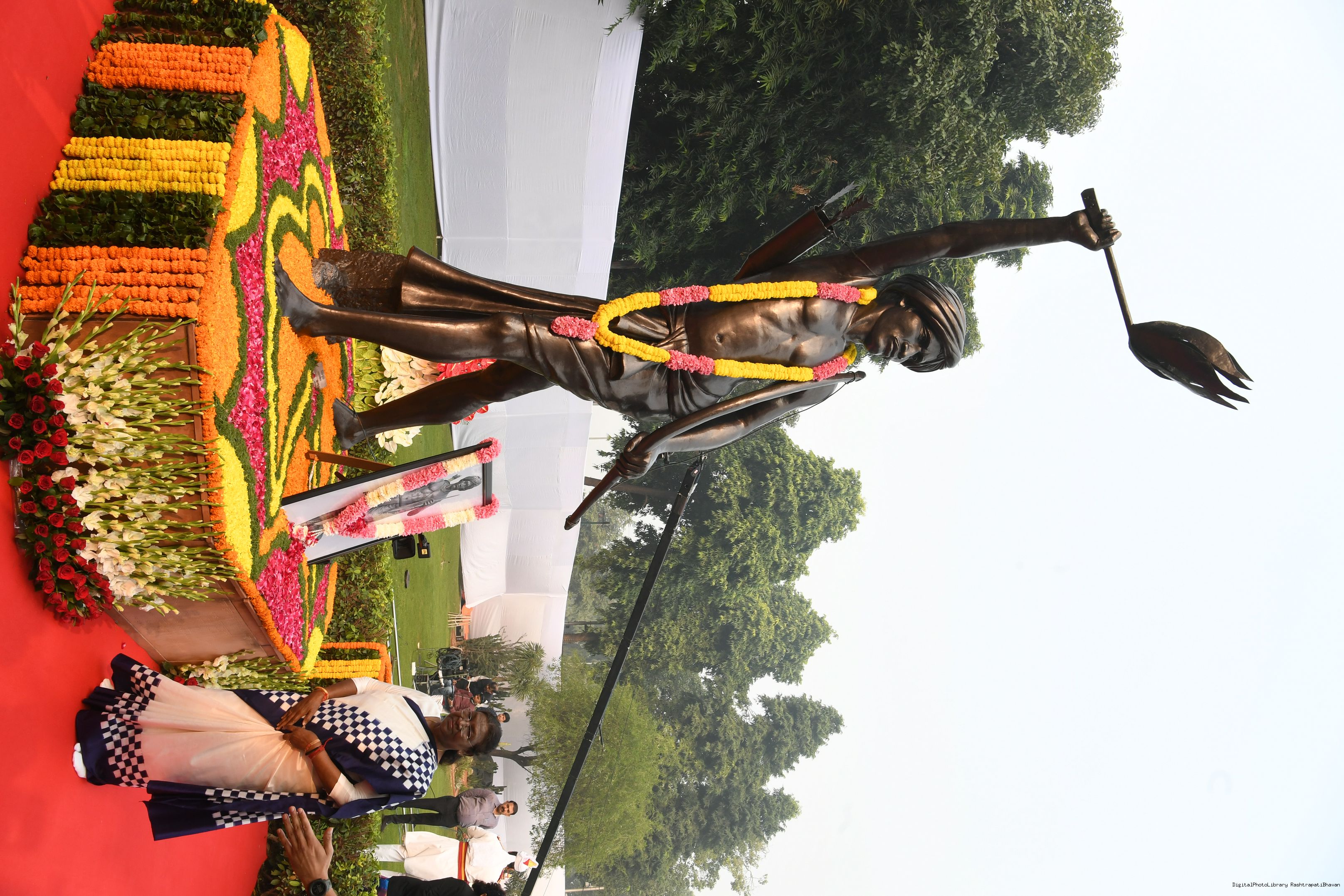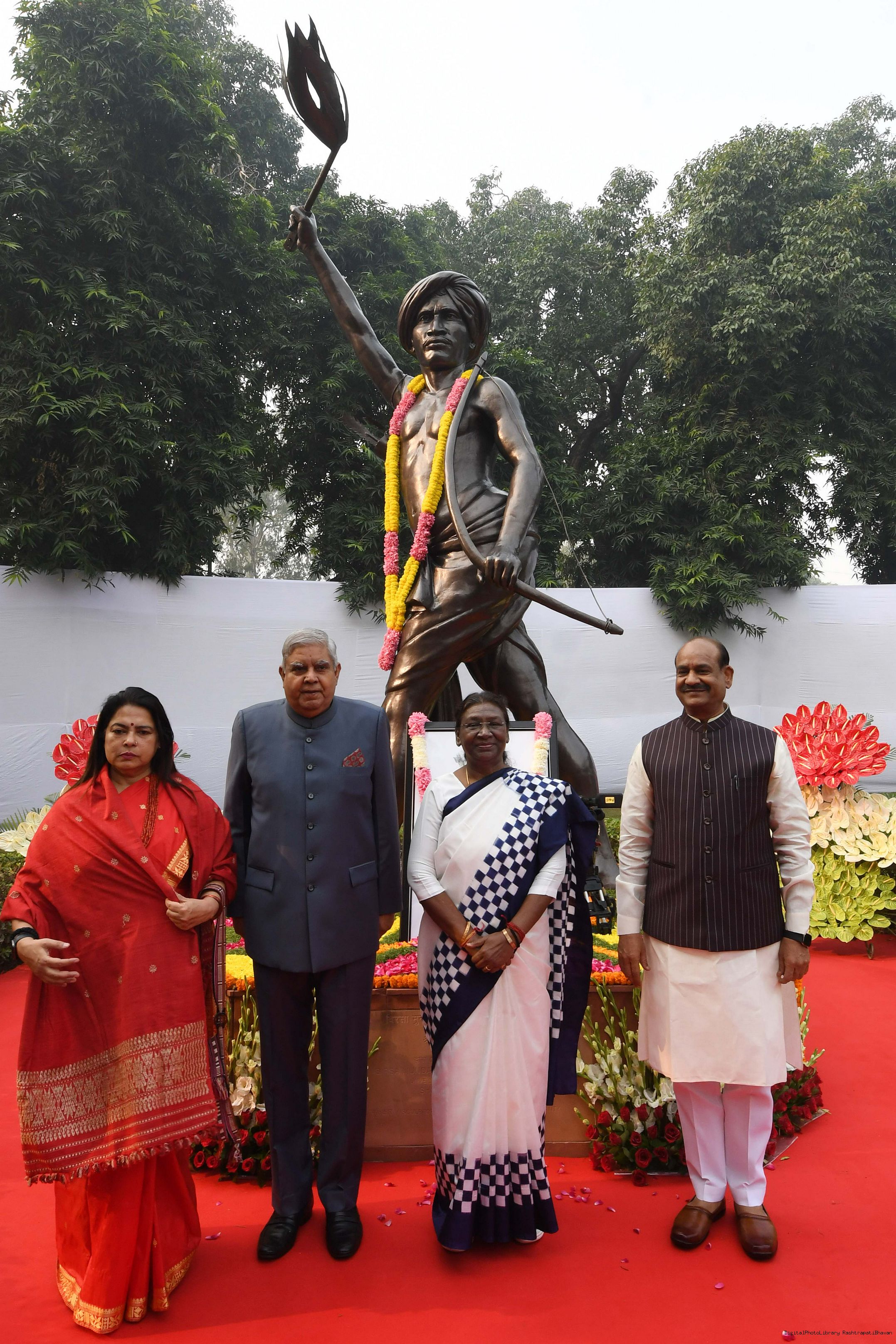 | Caption: | The President of India Smt. Droupadi Murmu Paying Floral Tributes at the Statue of Bhagwan Birsa Munda on the Occasion of his Birth Anniversary which is Celebrated as Janjatiya Gaurav Divas at Parliament House, New Delhi on November 15, 2023. |