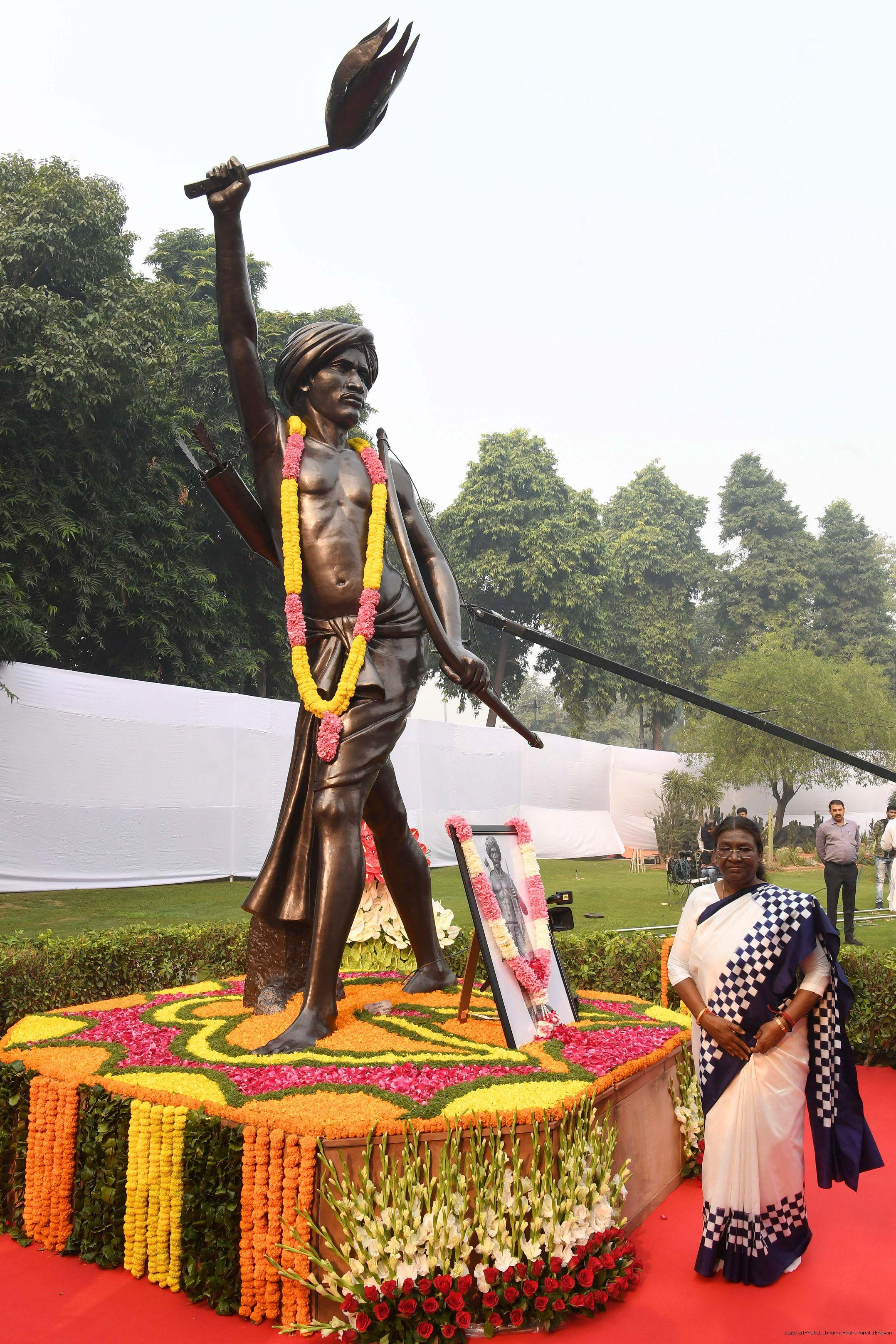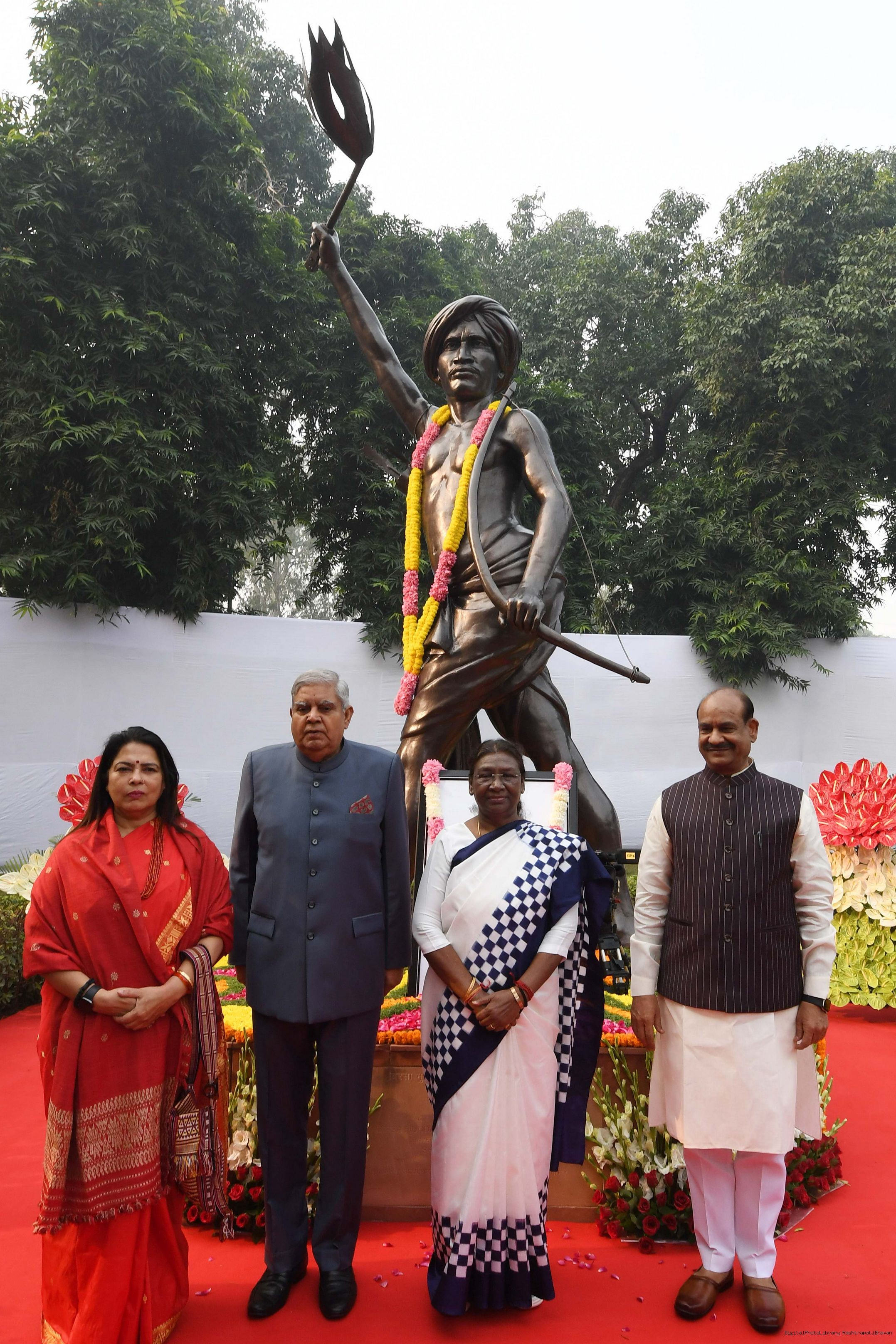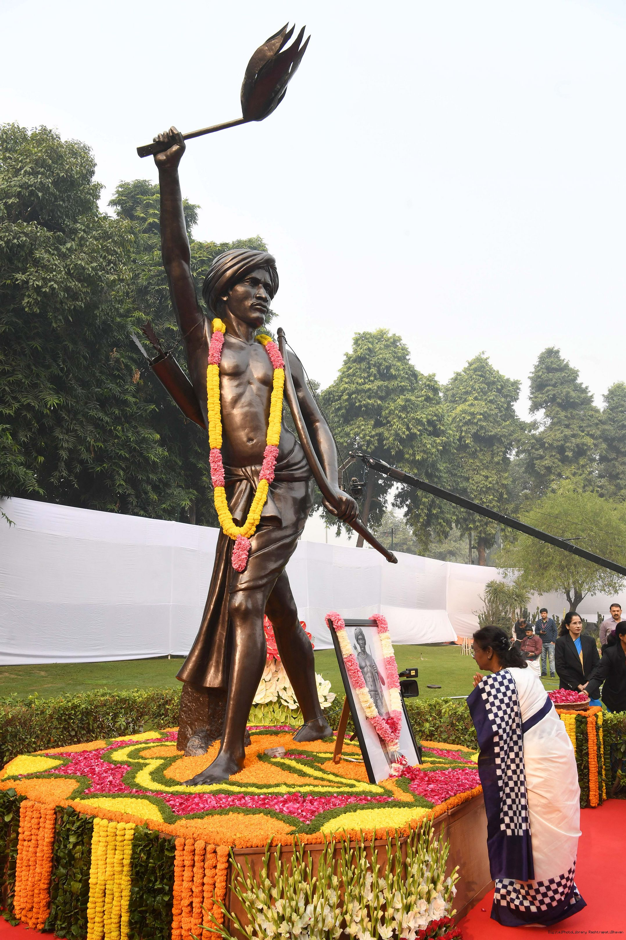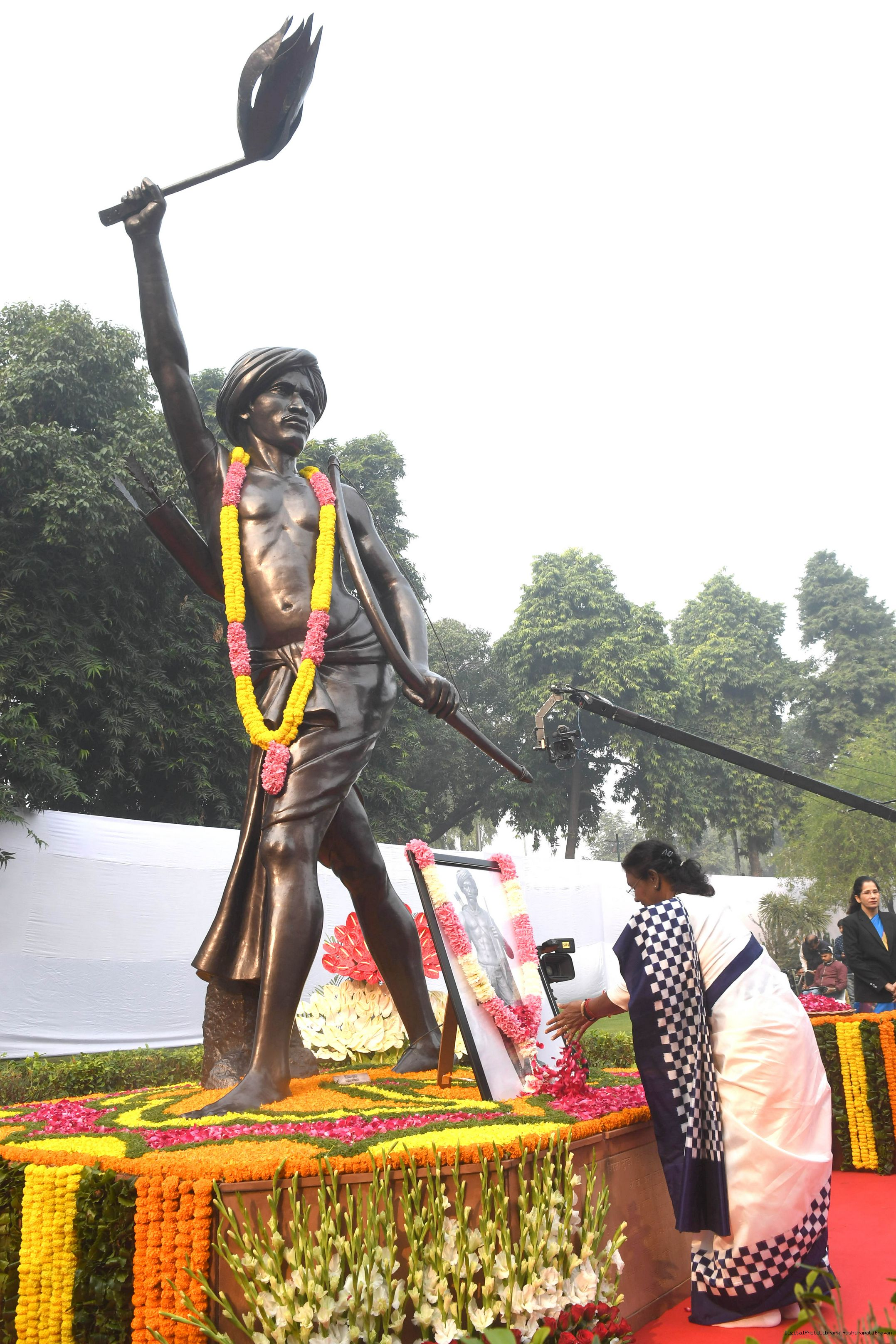 | Caption: | The President of India Smt. Droupadi Murmu Paying Floral Tributes at the Statue of Bhagwan Birsa Munda on the Occasion of his Birth Anniversary which is Celebrated as Janjatiya Gaurav Divas at Parliament House, New Delhi on November 15, 2023. |