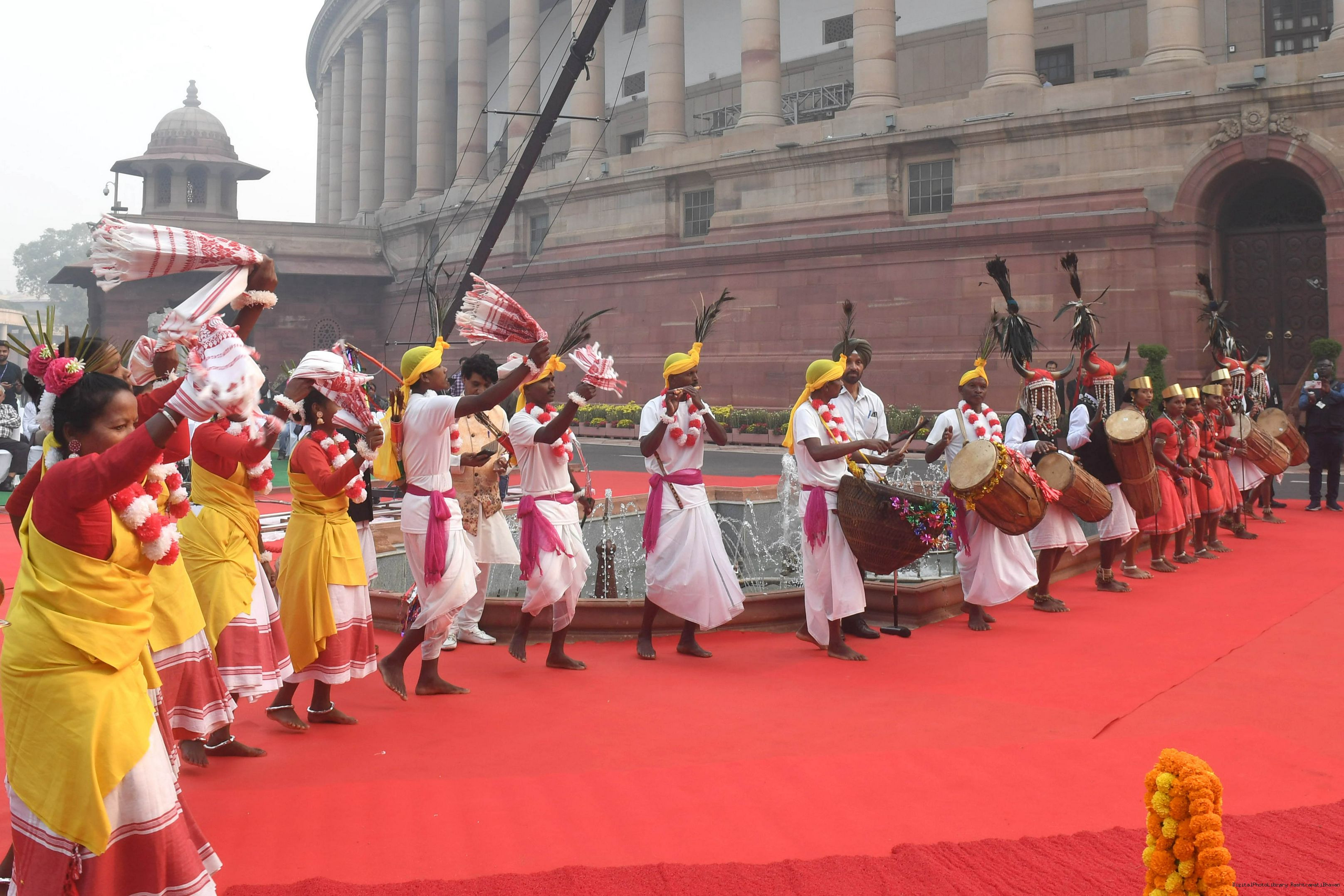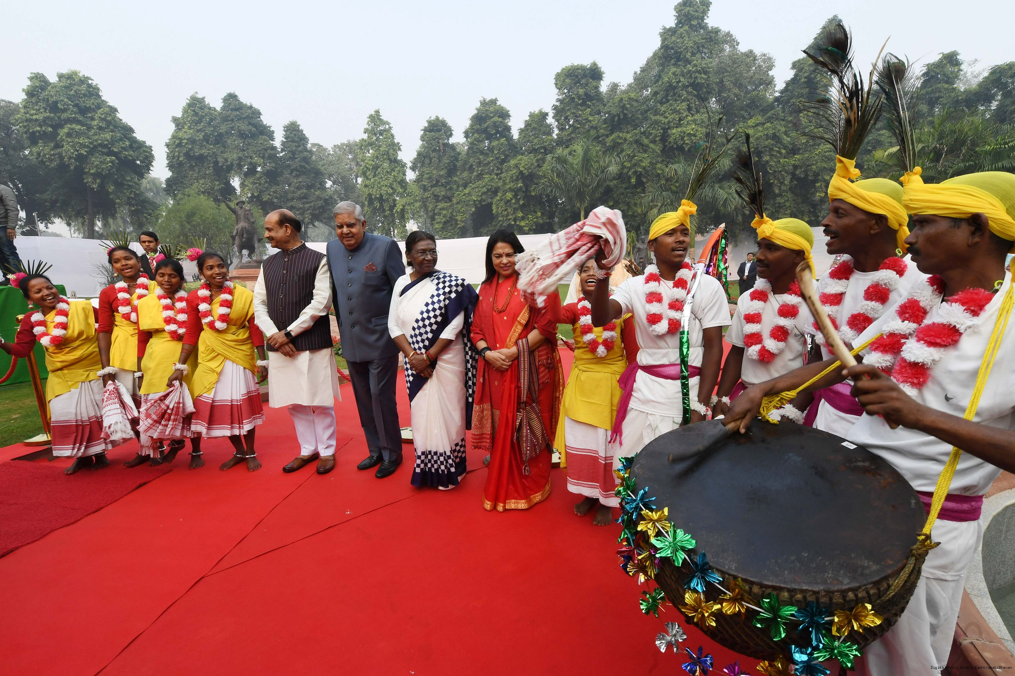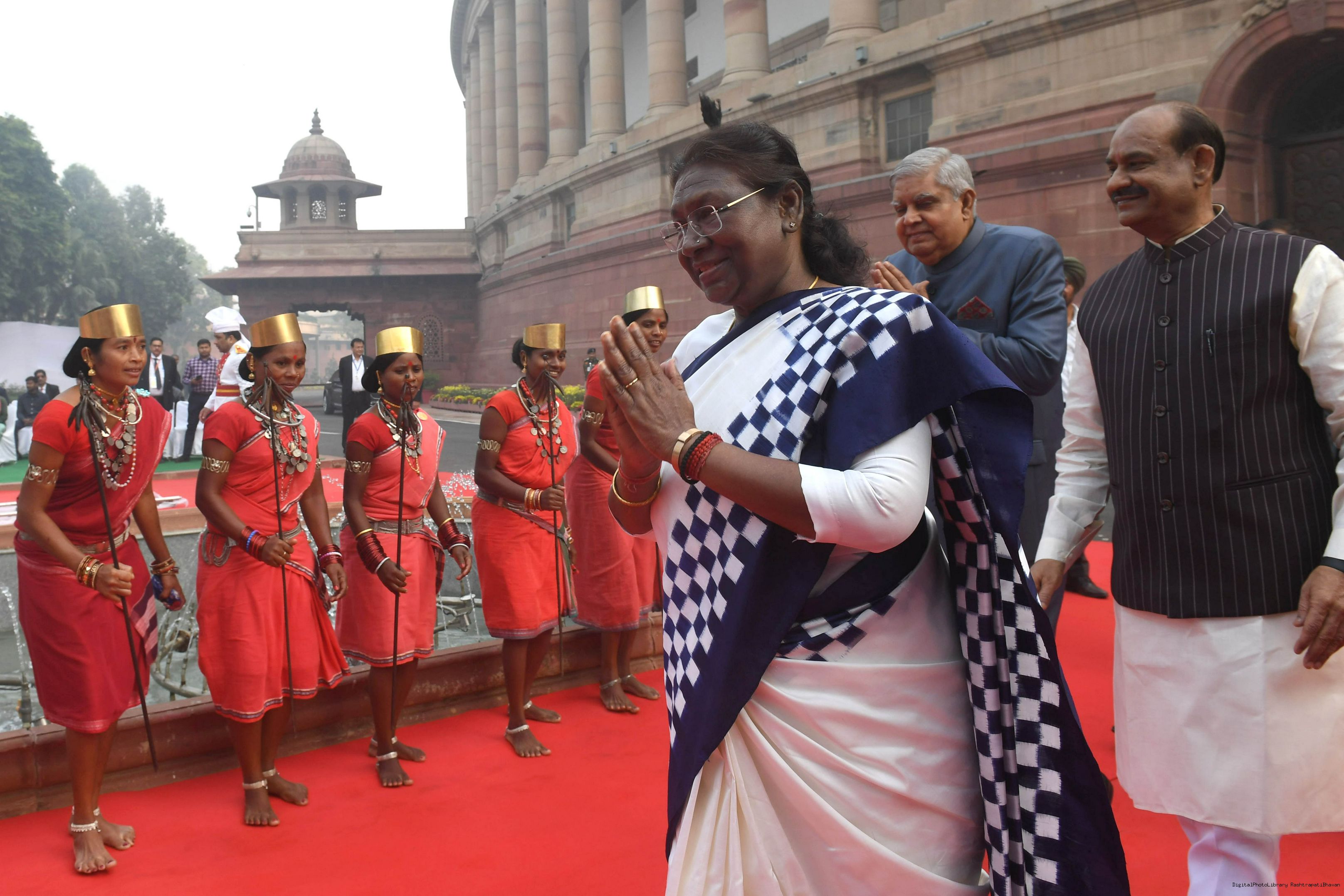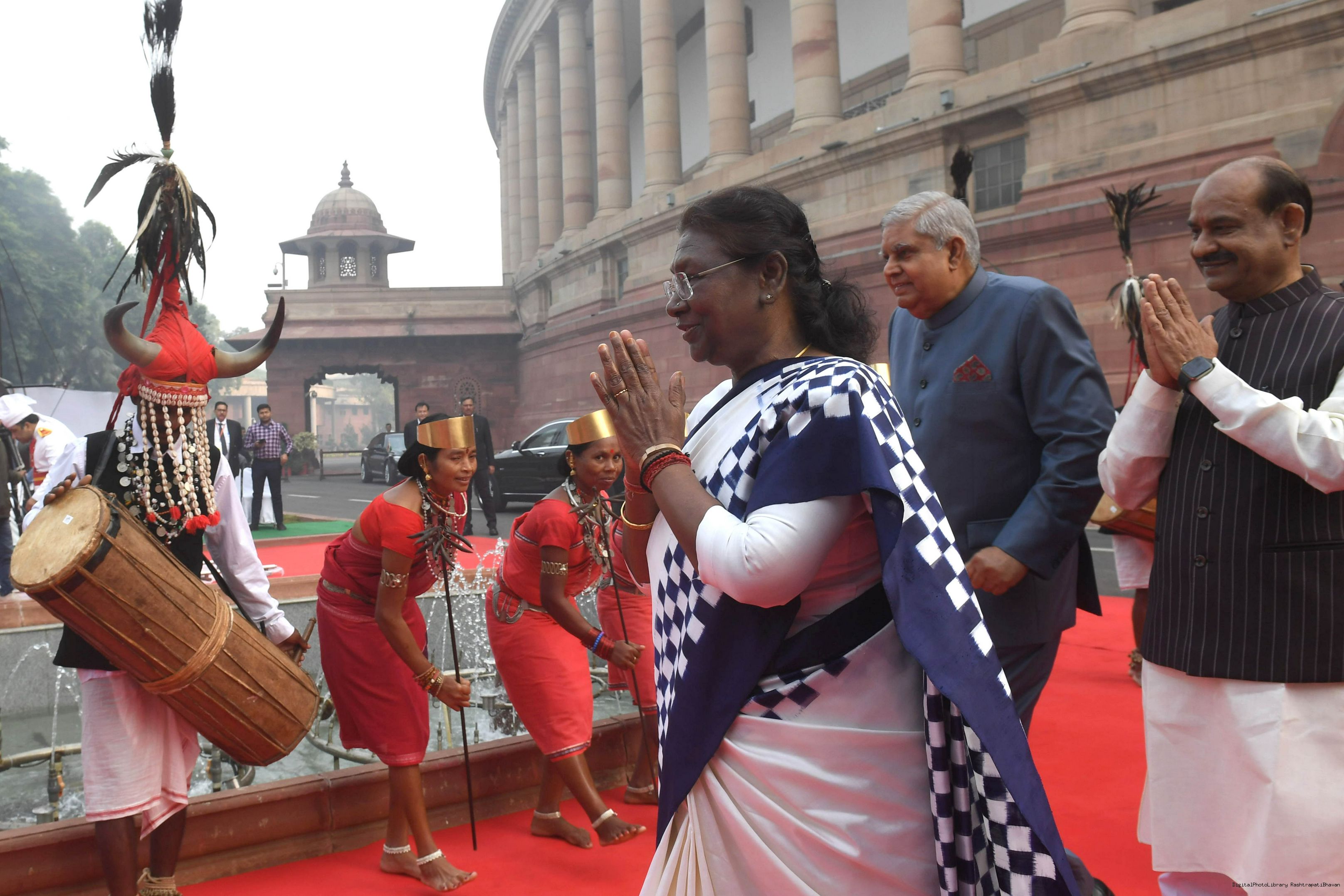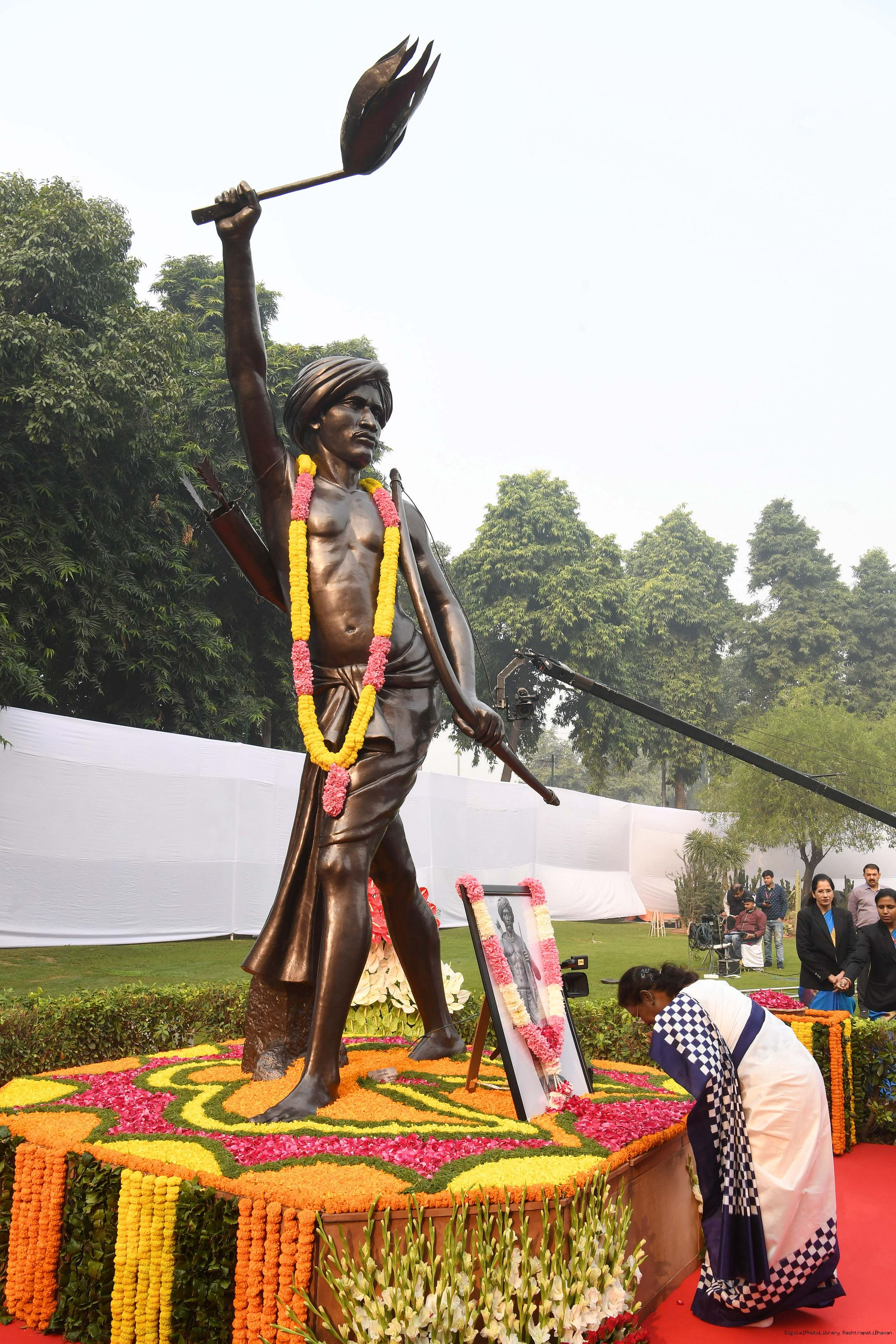 | Caption: | The President of India Smt. Droupadi Murmu Paying Floral Tributes at the Statue of Bhagwan Birsa Munda on the Occasion of his Birth Anniversary which is Celebrated as Janjatiya Gaurav Divas at Parliament House, New Delhi on November 15, 2023. |