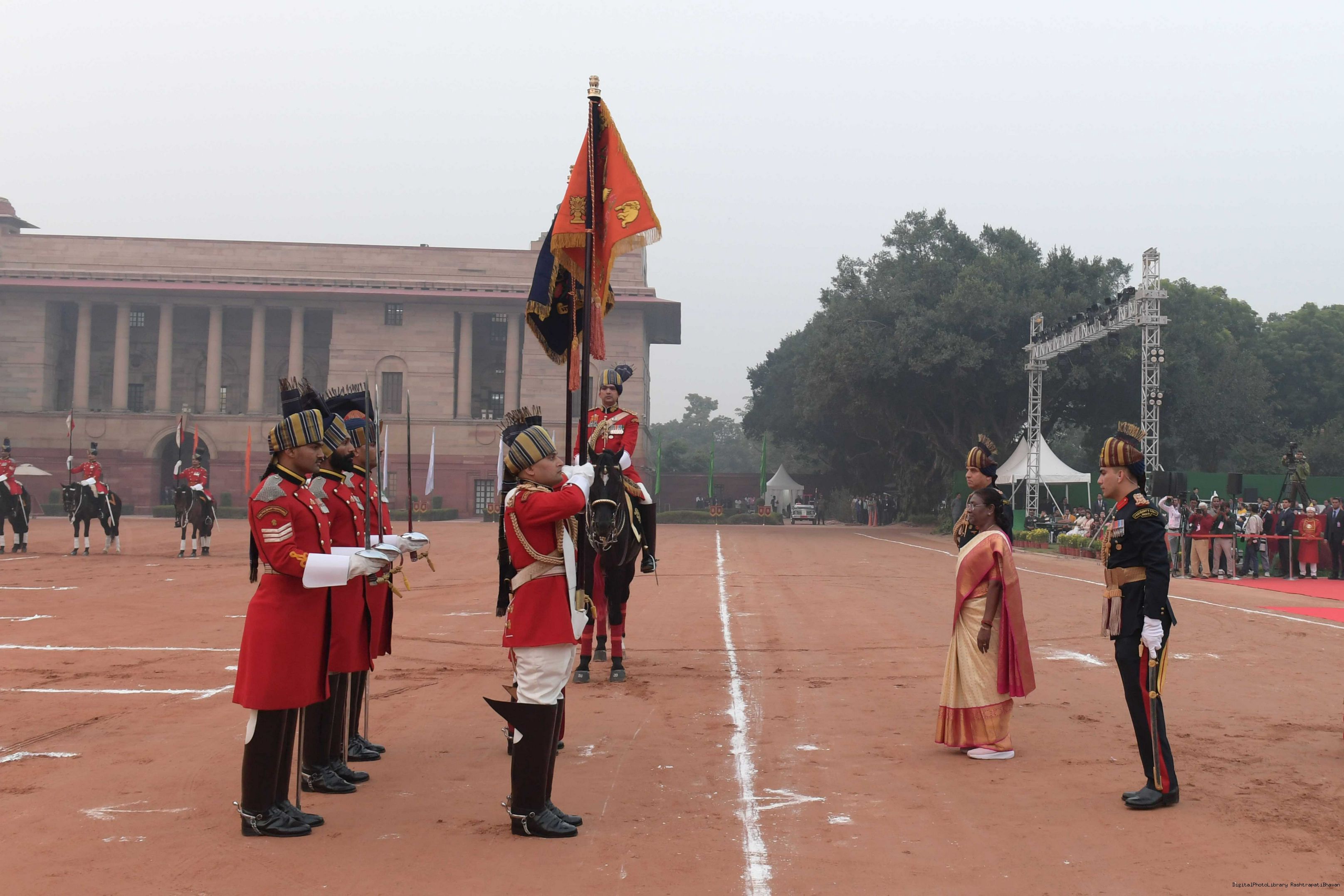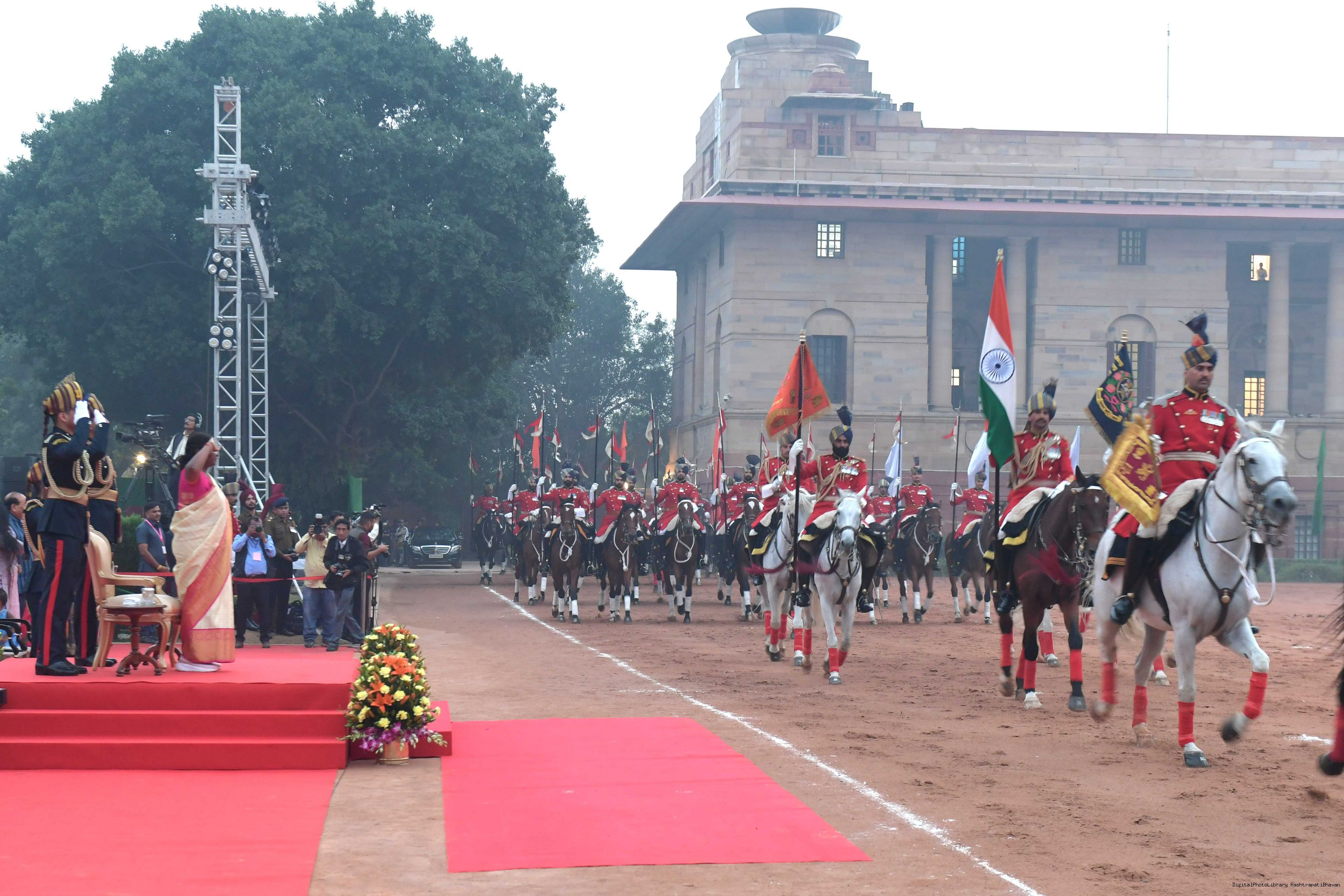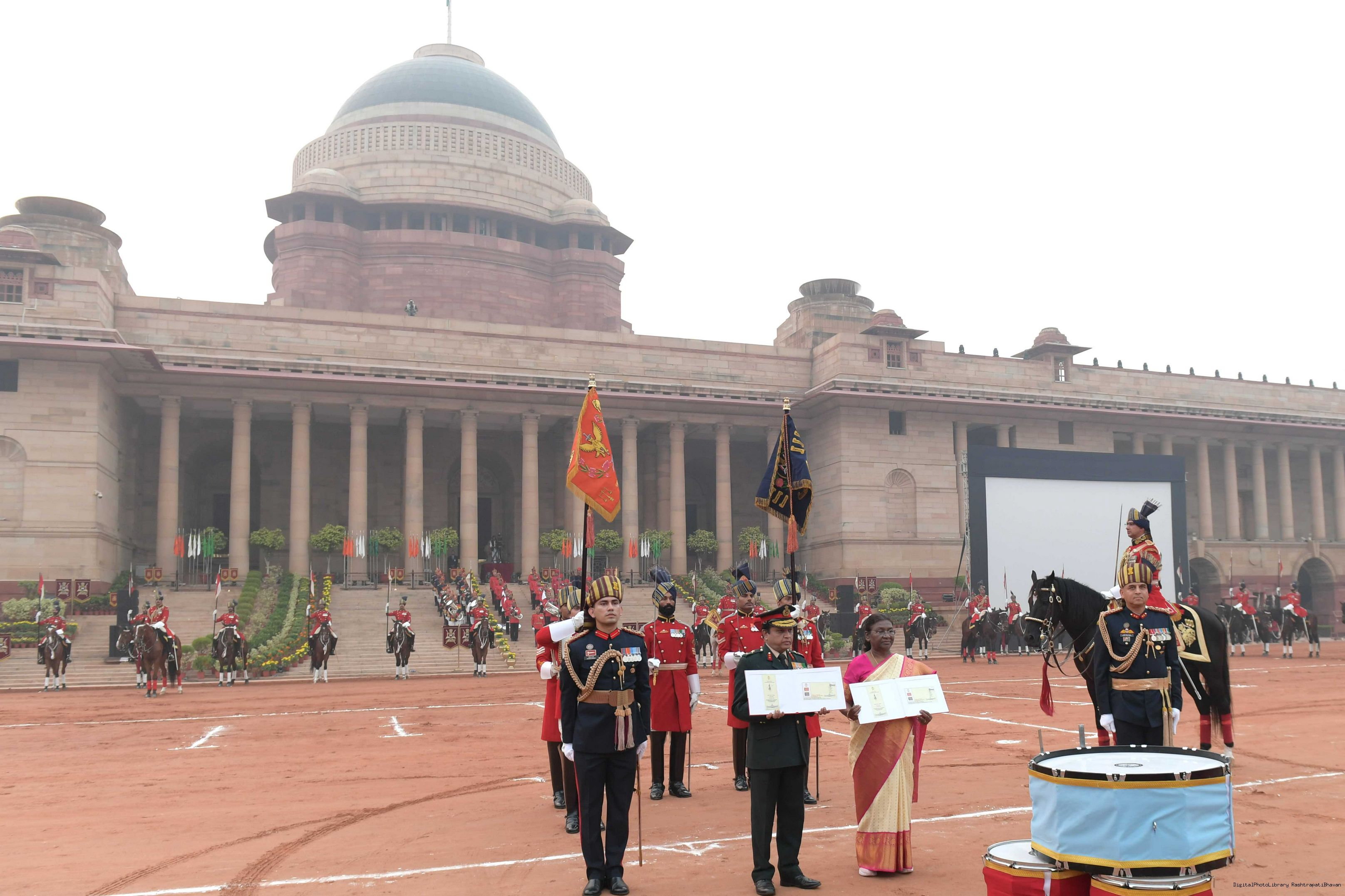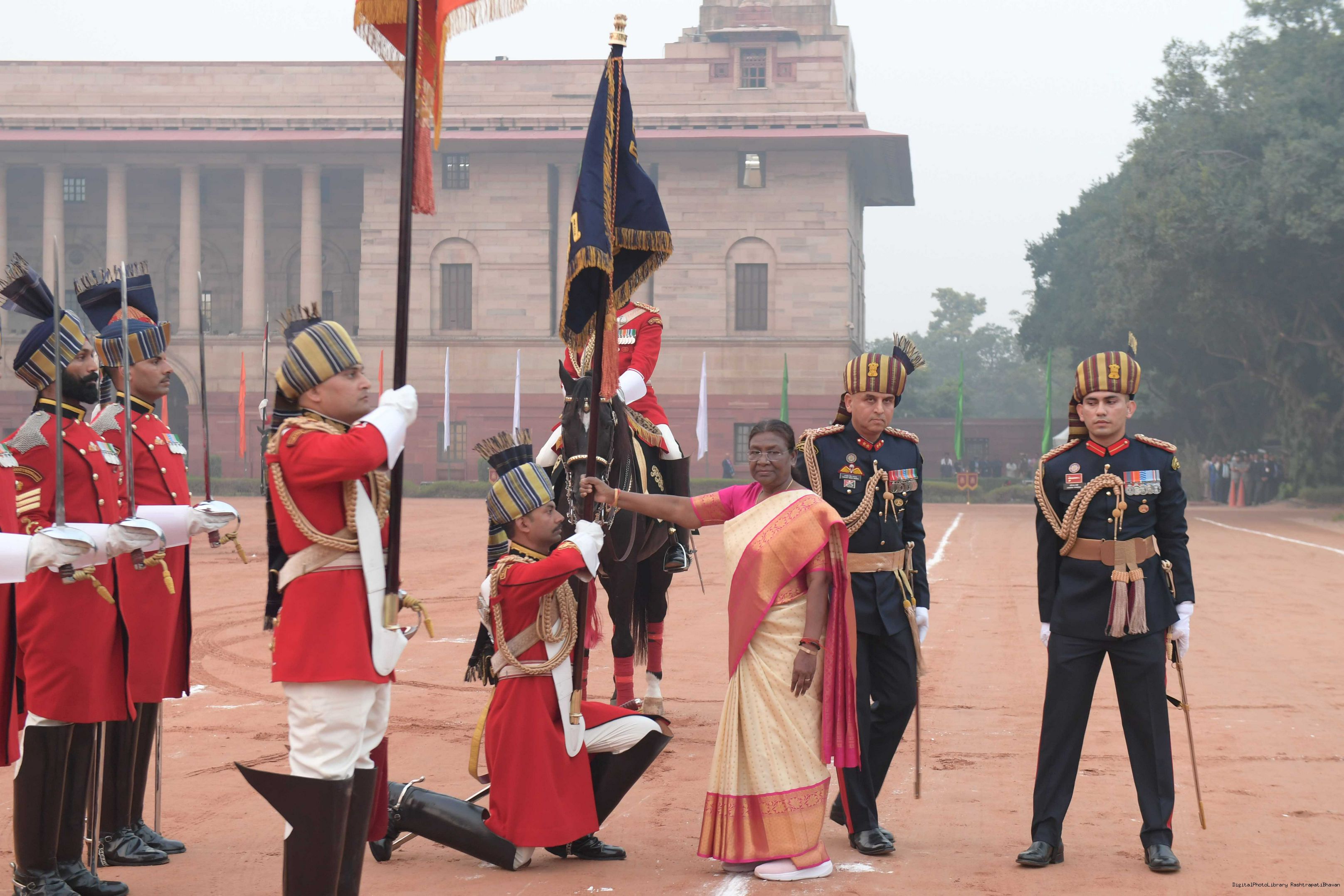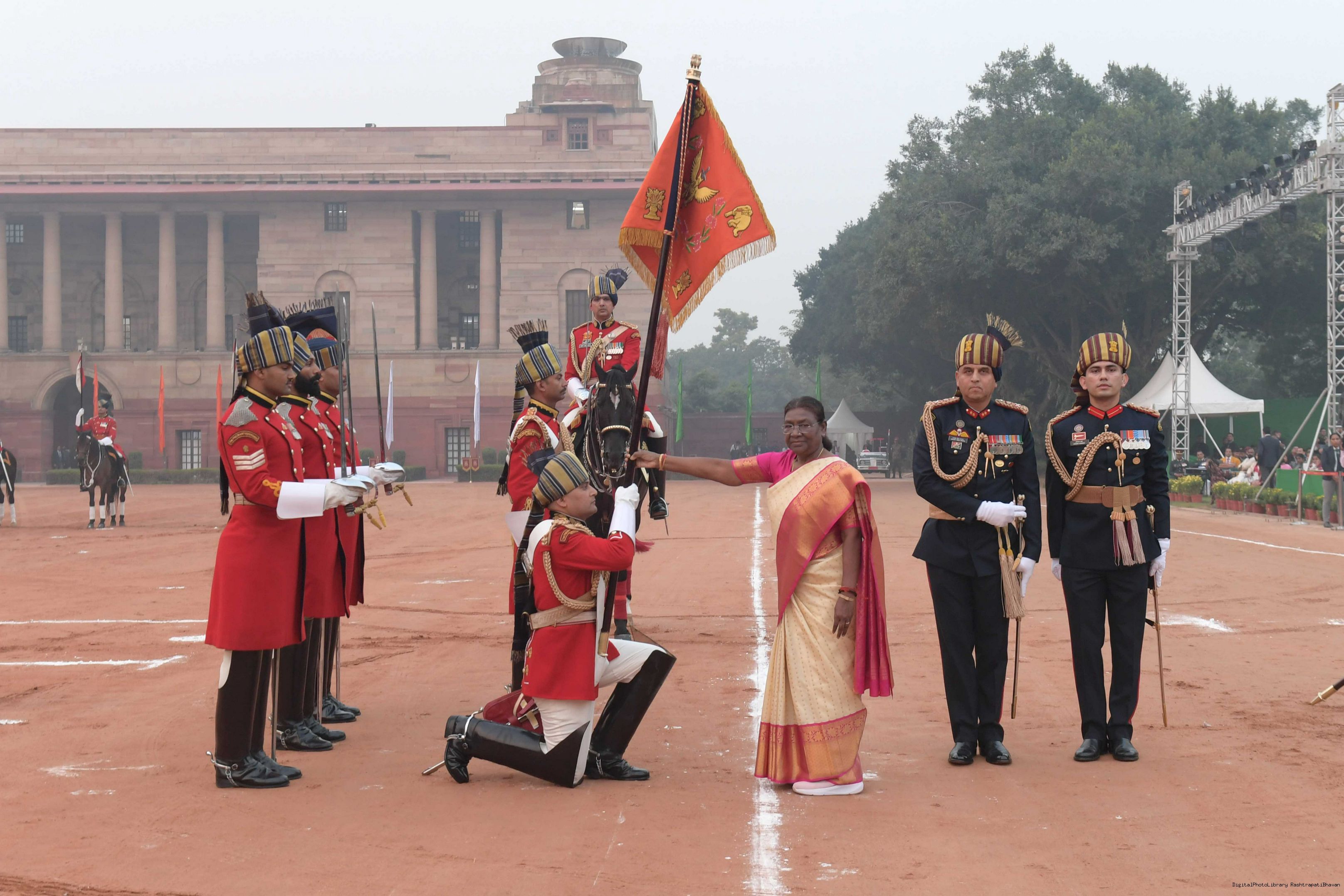 | Caption: | The President of India, Smt Droupadi Murmu presented a new Standard of Bodyguard and renewed Regimental Standard to the President’s Bodyguard (PBG) at a ceremony held at Rashtrapati Bhavan on November 16, 2023. |