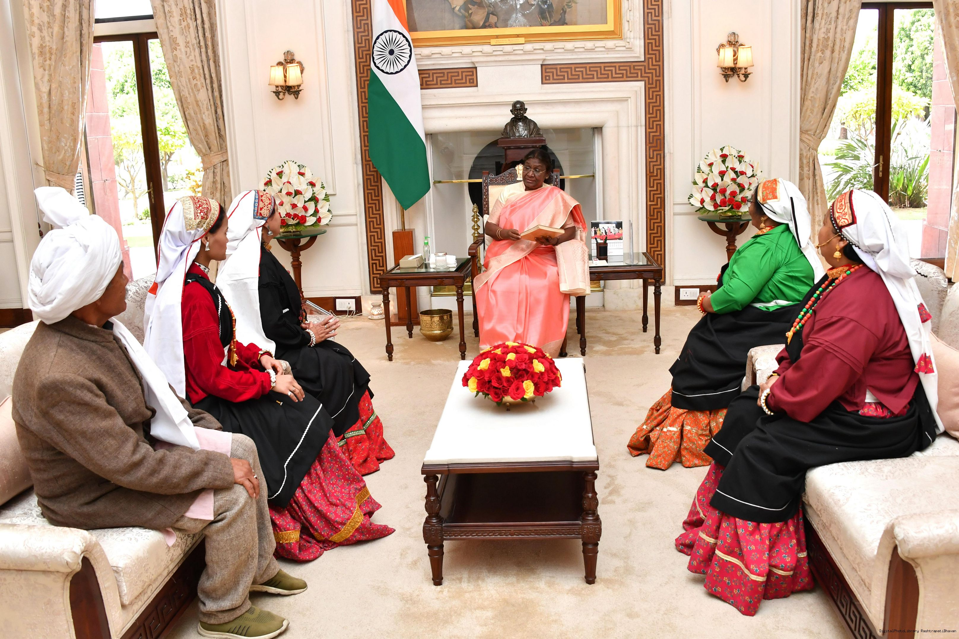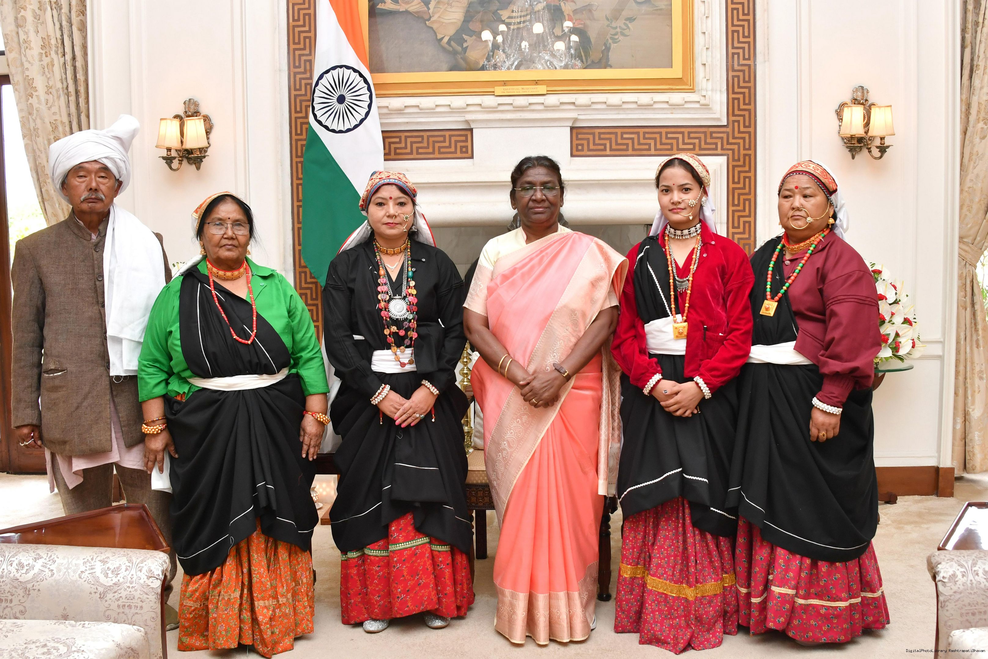 | Caption: | Ms. Puja Jungpangi, Chairperson, Johar Samajik Sanskritik Samiti, Bageshwar, Uttarakhand along with Others meeting with the President of India Smt. Droupadi Murmu at Rashtrapati Bhavan on May 31, 2023. |