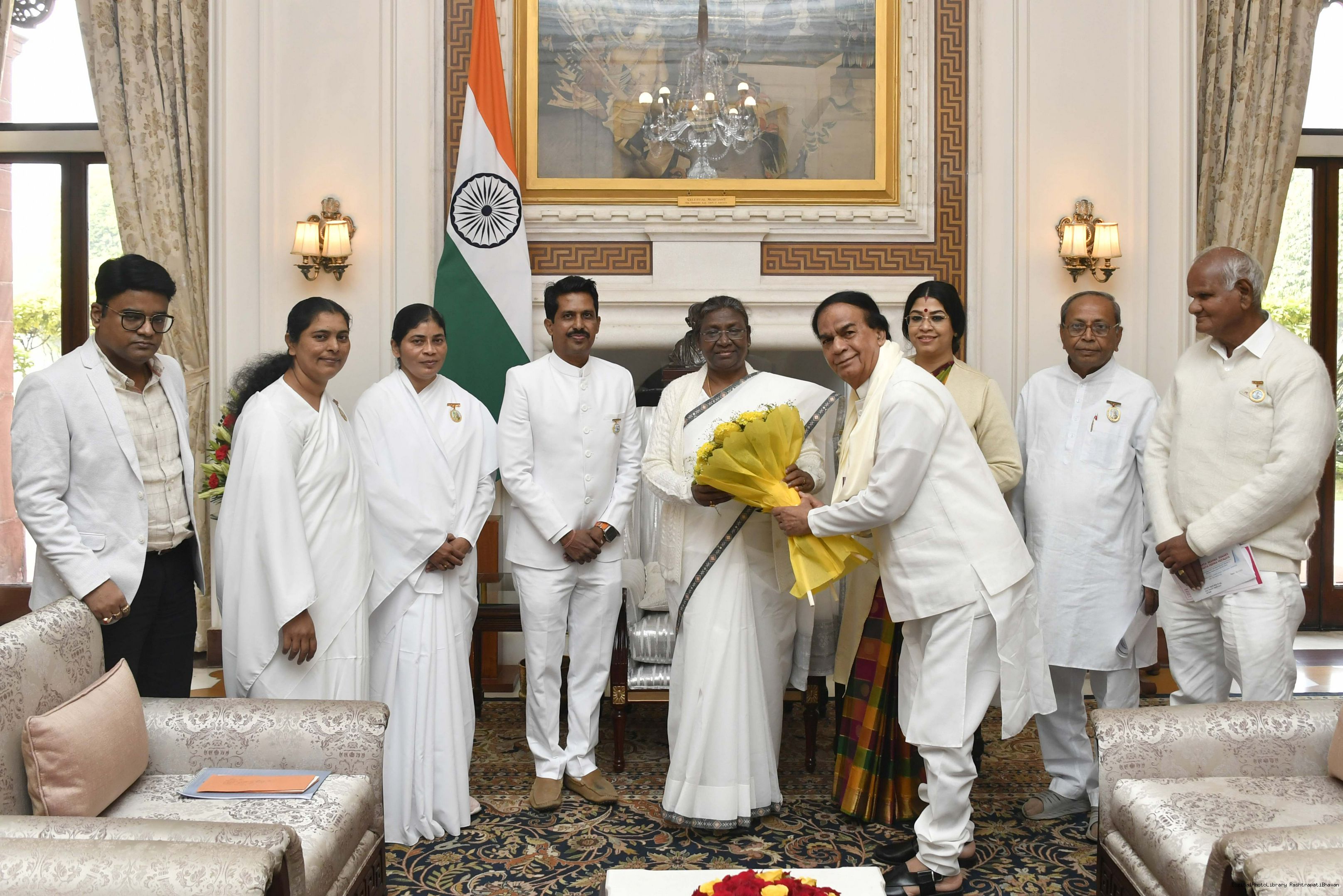 | Caption: | BK Nathmal, Director, National Art Gallery Brahma Kumaris, Odisha along with others meeting with the President of India, Smt. Droupadi Murmu, at Rashtrapati Bhavan on Dec 02, 2022. |